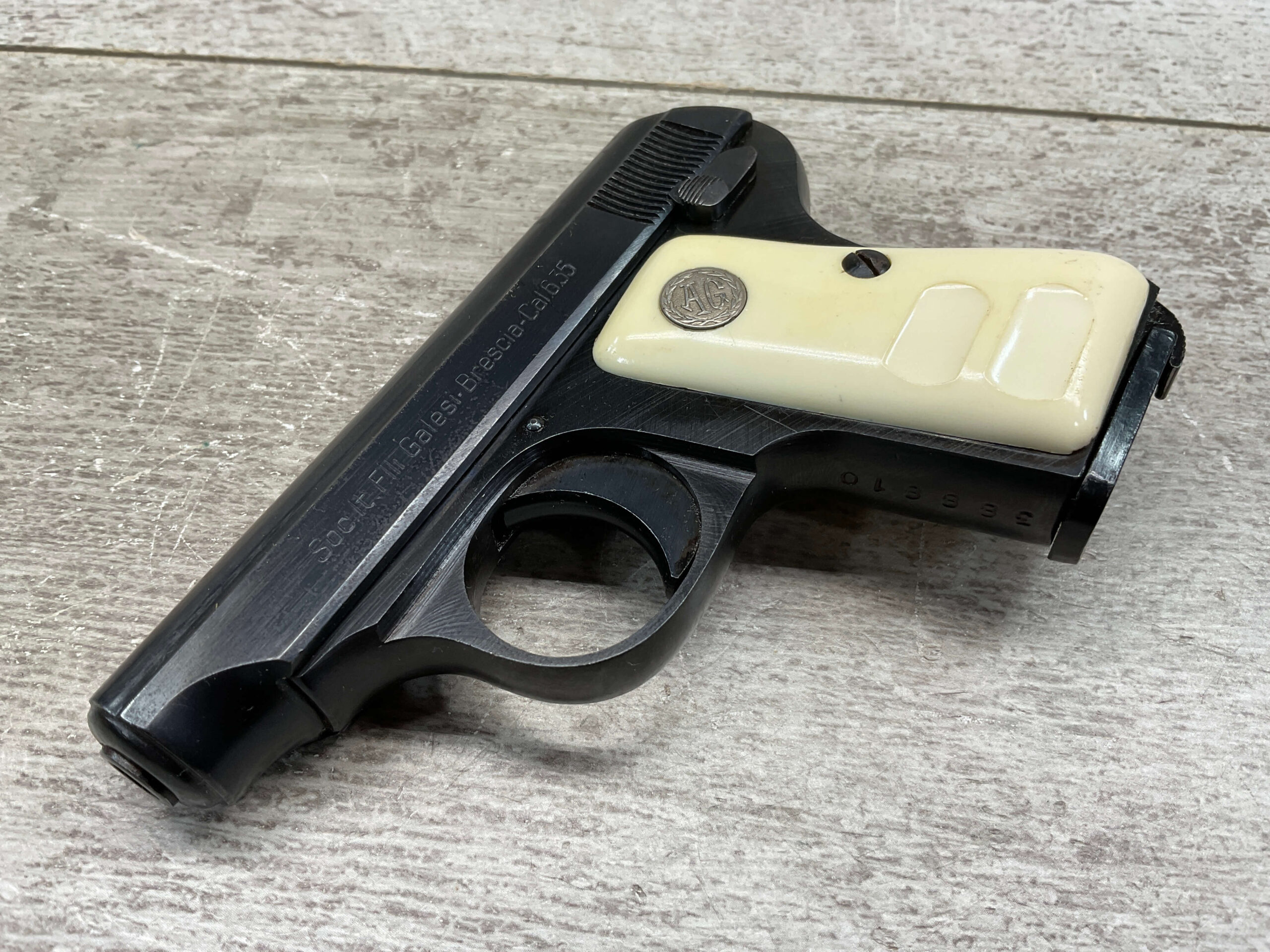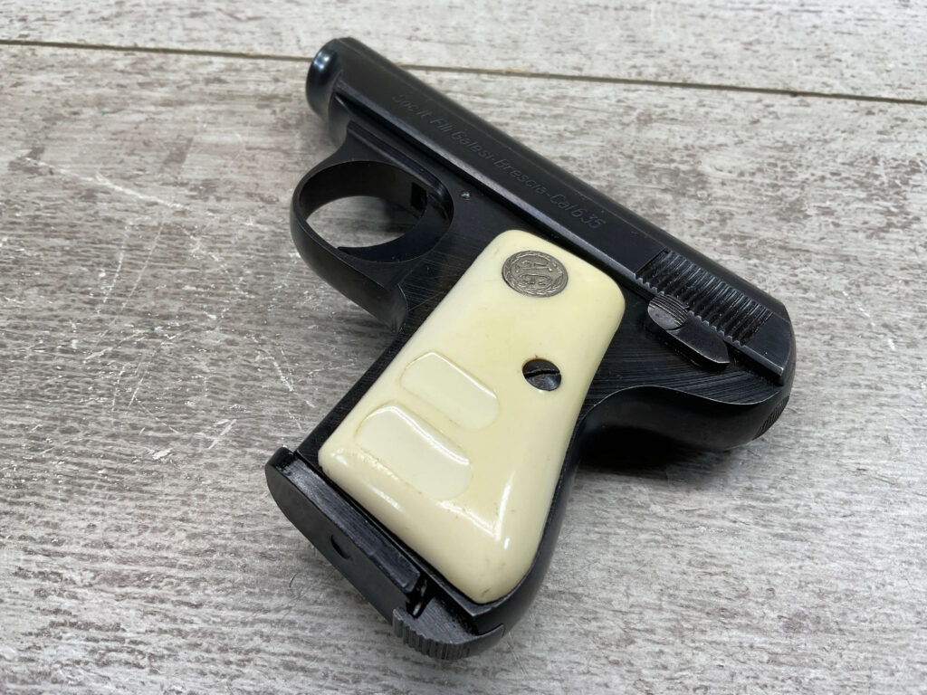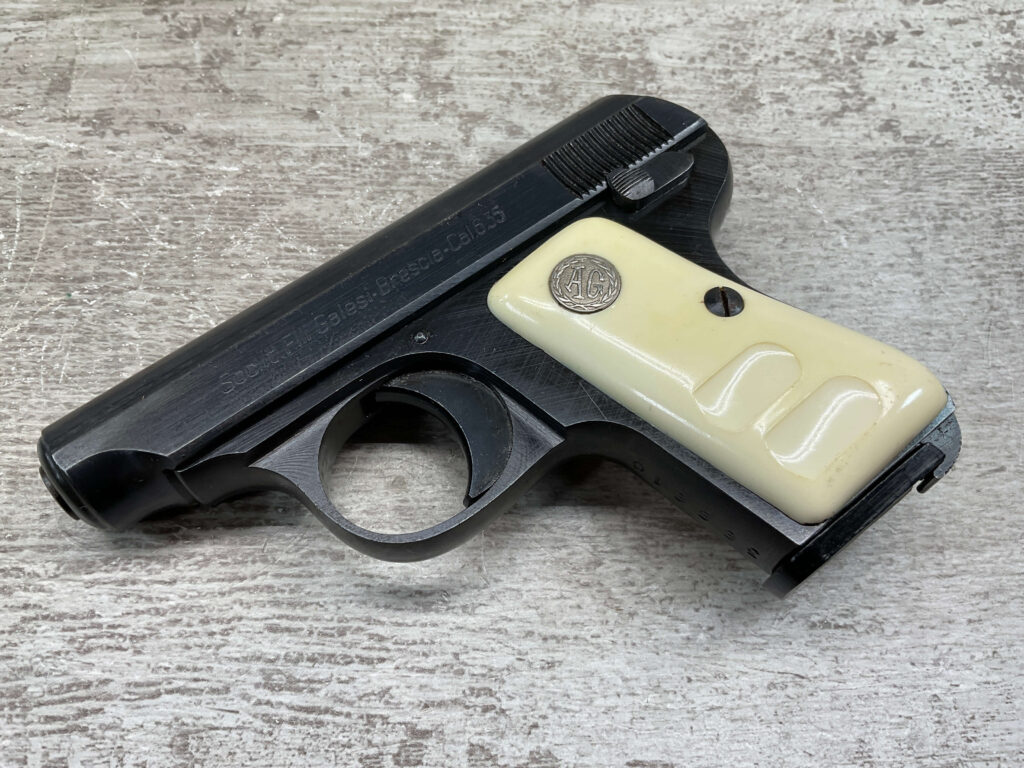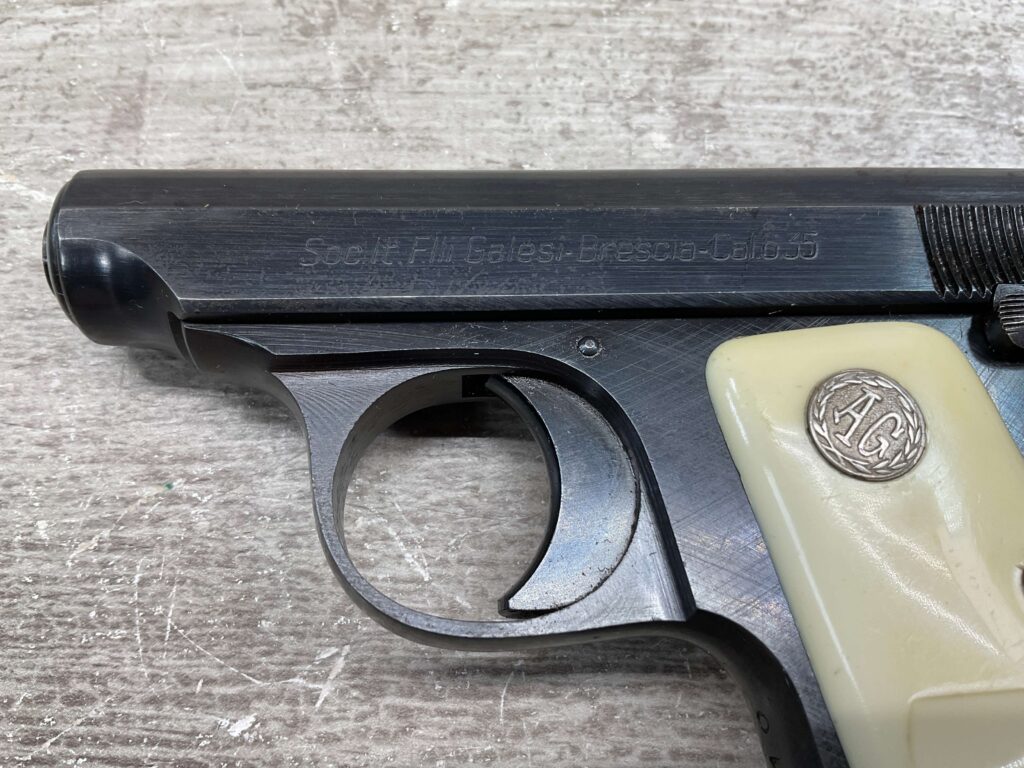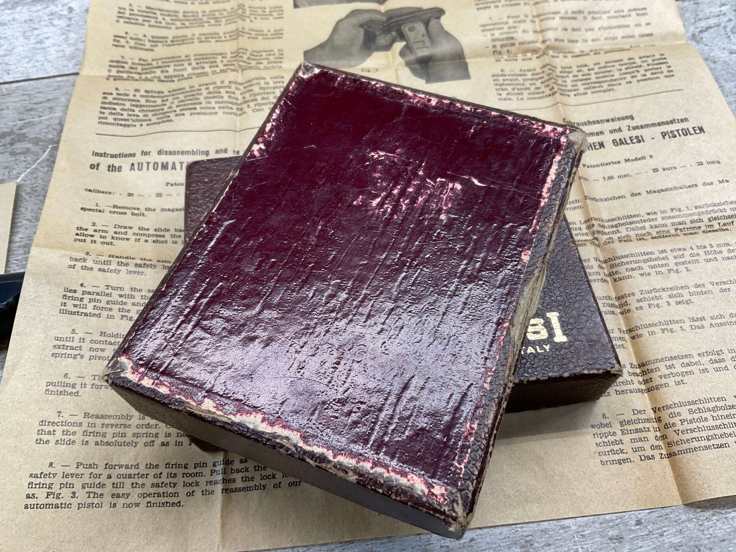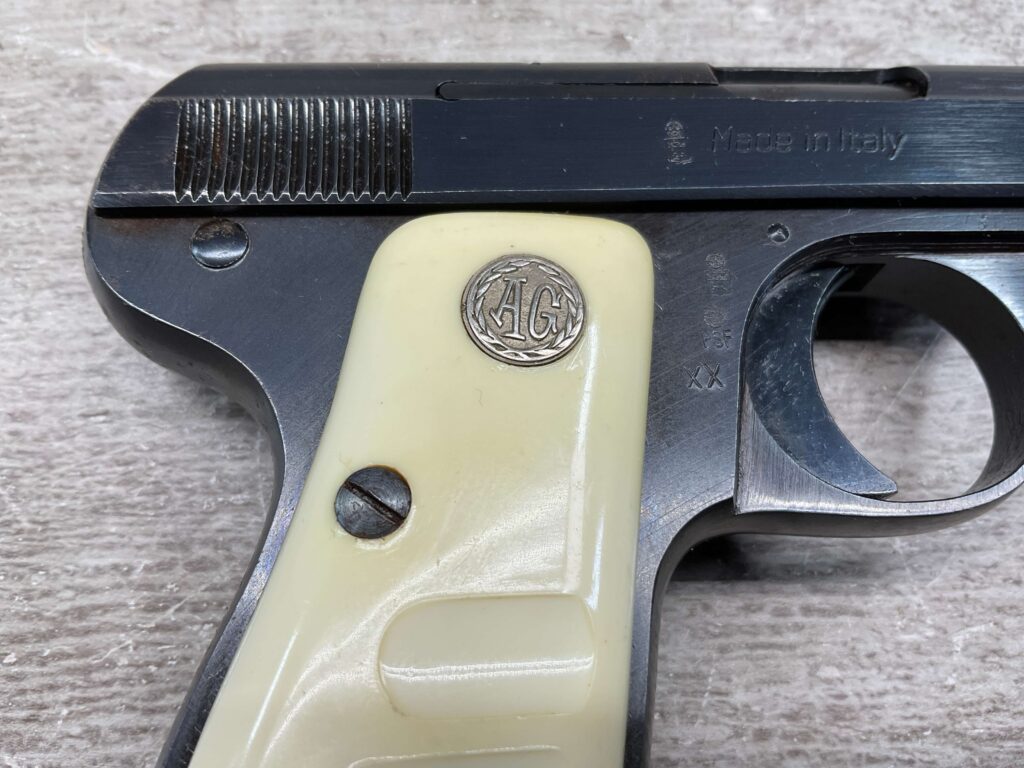 GALESI-BRESCIA 6.35MM SEMI AUTO PISTOL IN BOX, 1959 MFR #388810, 2″ BARREL, EXC BRIGHT BORE & RIFLING, ORIGINAL BOX / CLEANING TOOL & PAPERWORK INCLUDED, VG-EXC ORIGINAL BLUE (LIGHT SPECKLING IN AREAS), EXC SMOOTH PLASTIC GRIPS, 6 ROUND MAGAZINE, 90%+ OVERALL