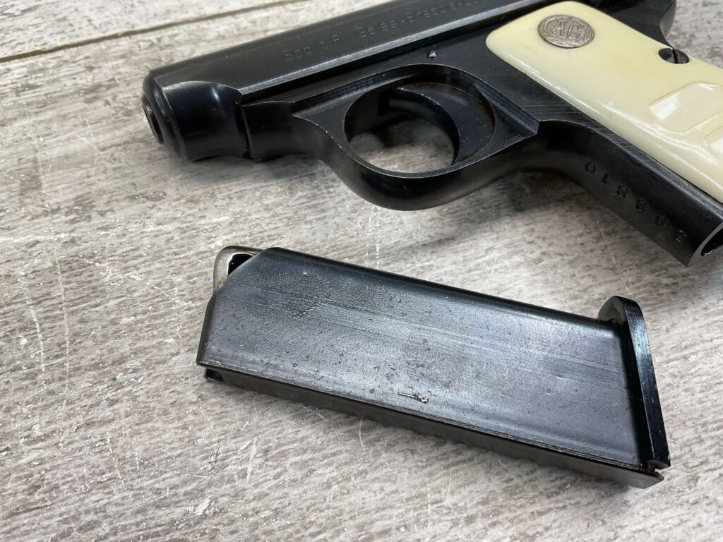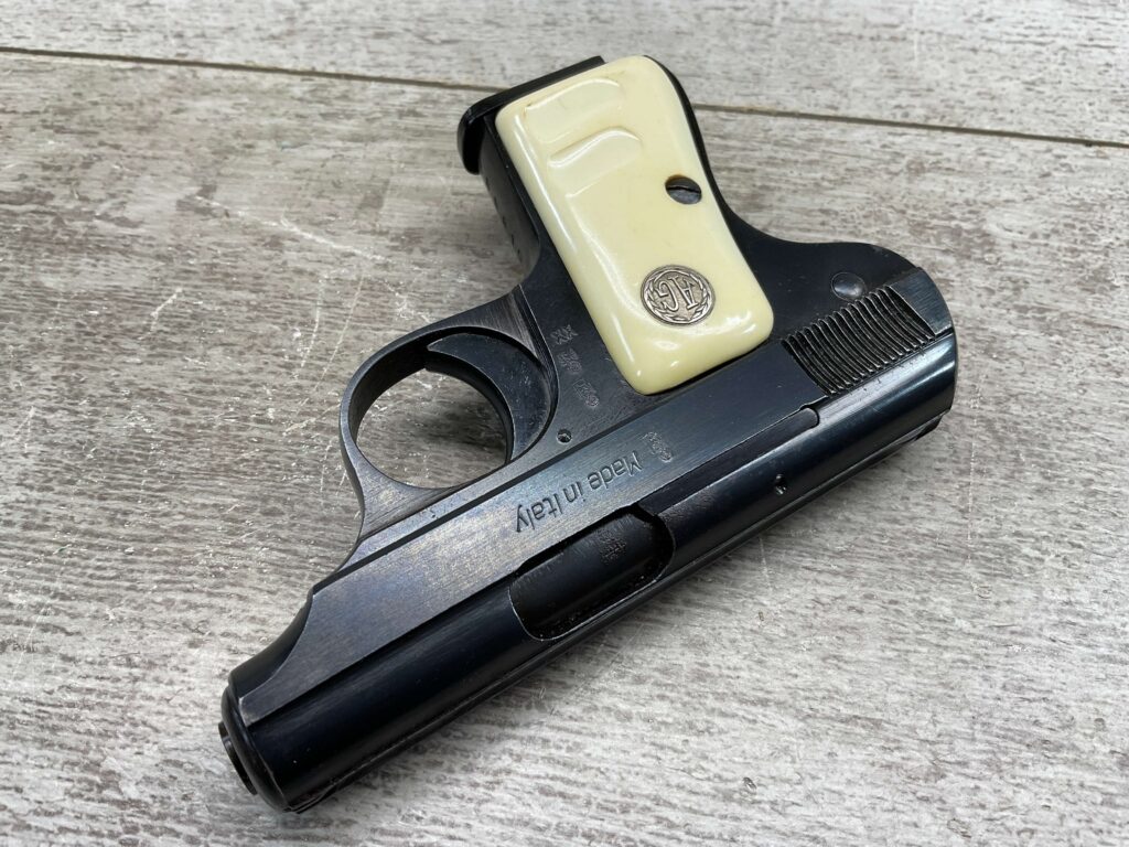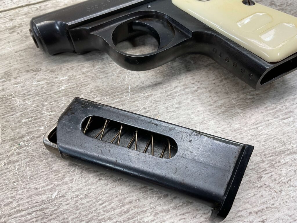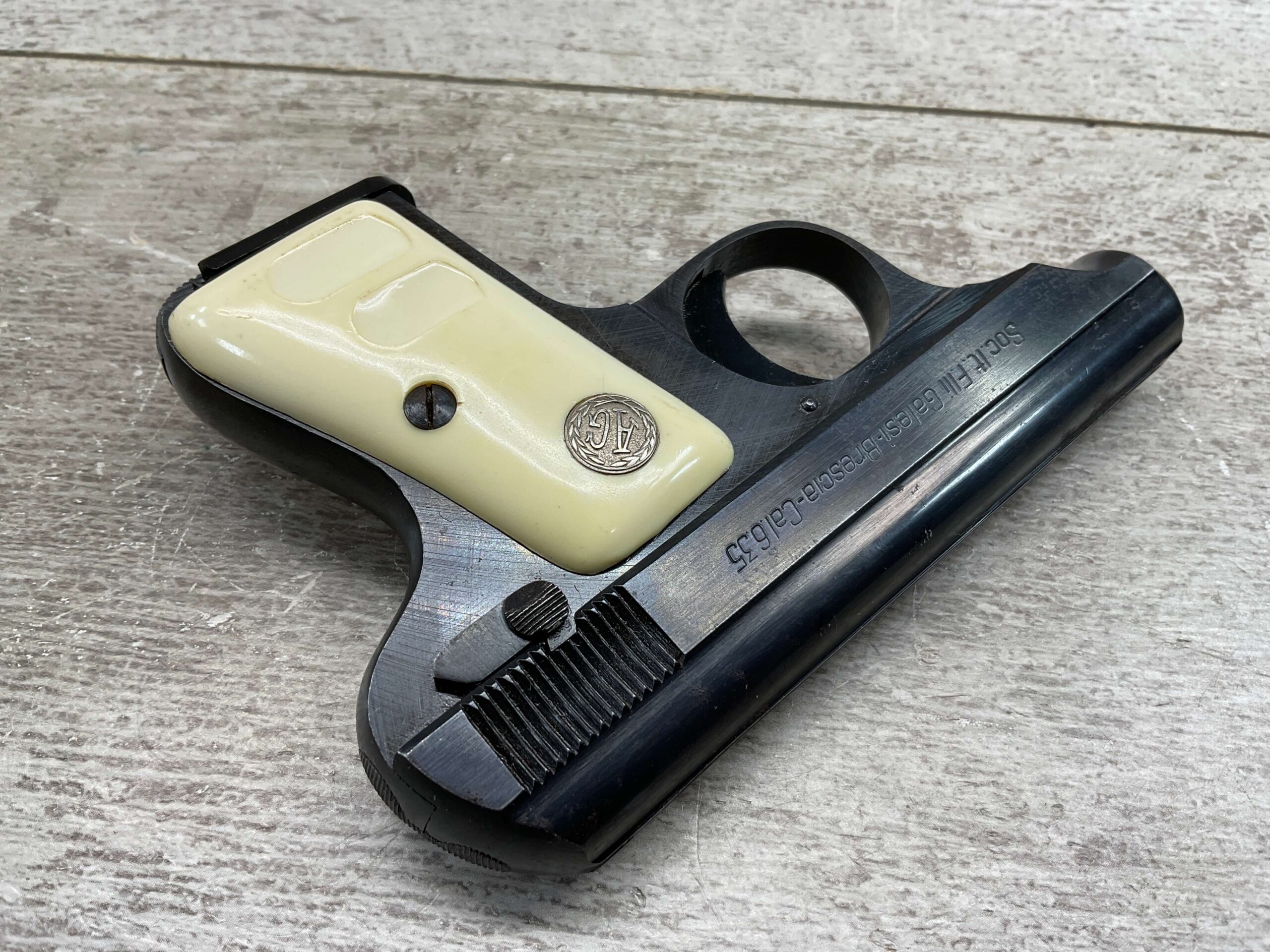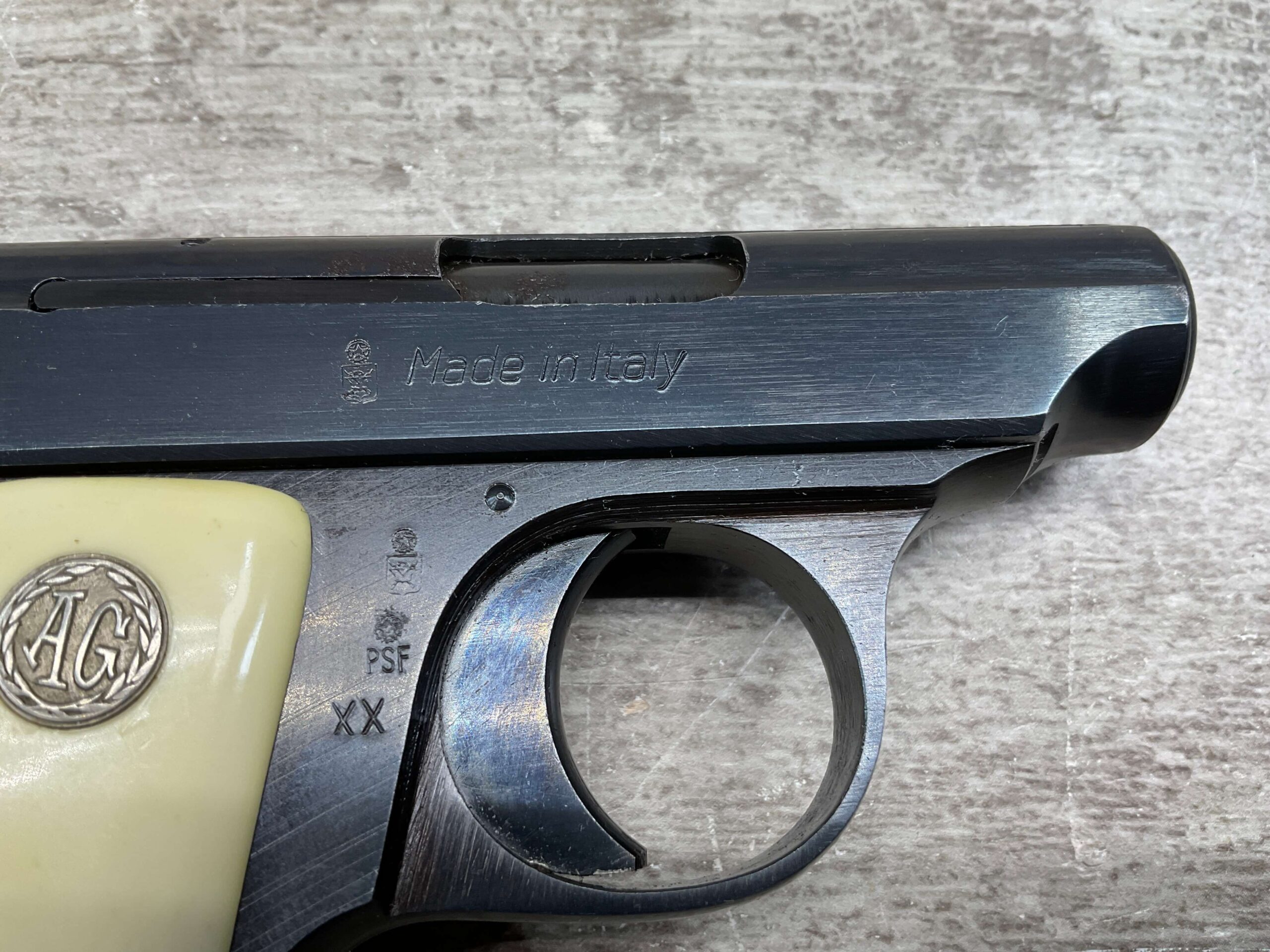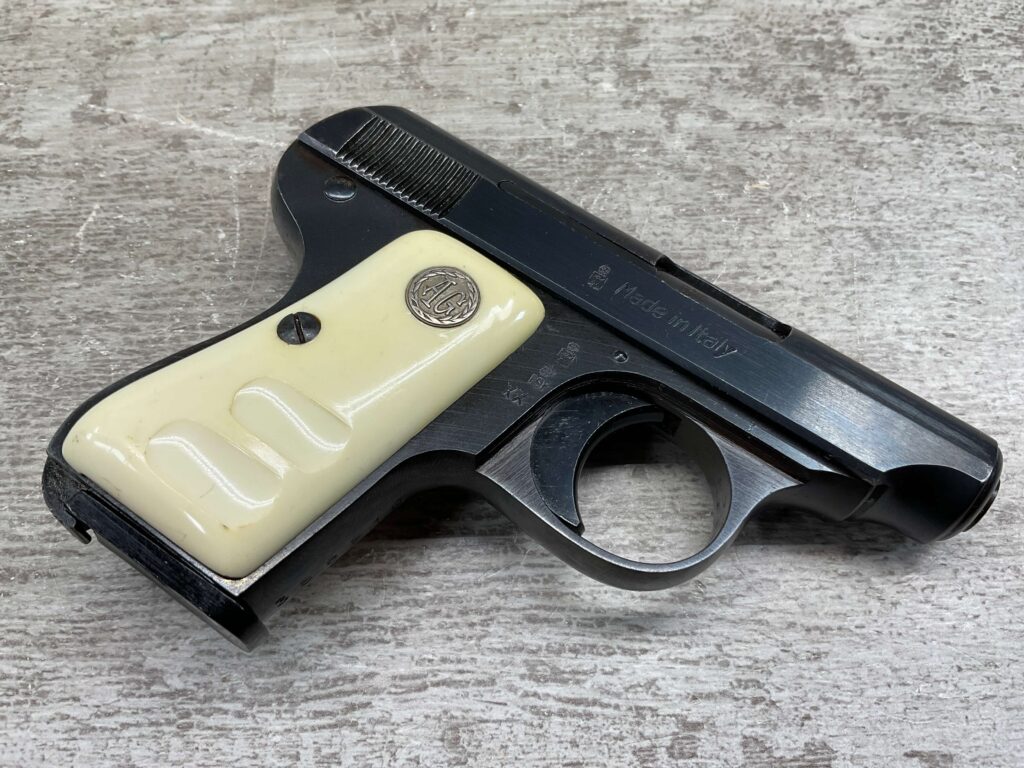 GALESI-BRESCIA 6.35MM SEMI AUTO PISTOL IN BOX, 1959 MFR #388810, 2″ BARREL, EXC BRIGHT BORE & RIFLING, ORIGINAL BOX / CLEANING TOOL & PAPERWORK INCLUDED, VG-EXC ORIGINAL BLUE (LIGHT SPECKLING IN AREAS), EXC SMOOTH PLASTIC GRIPS, 6 ROUND MAGAZINE, 90%+ OVERALL