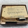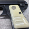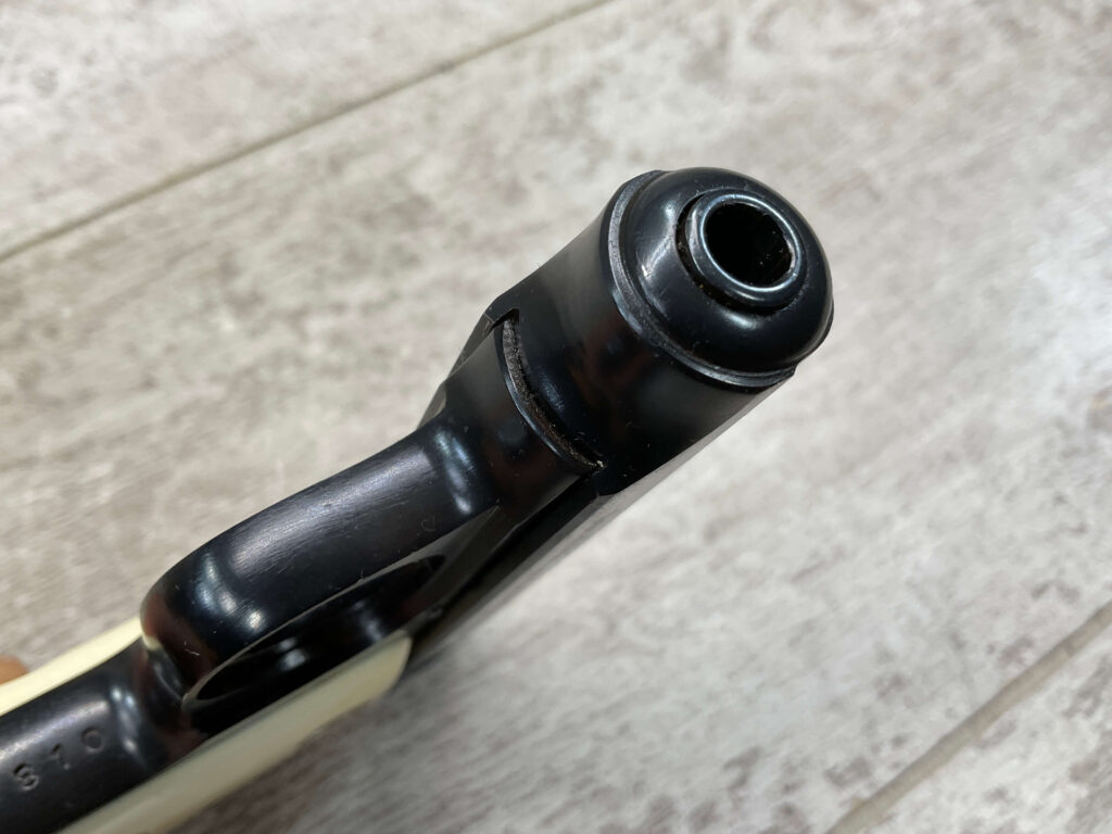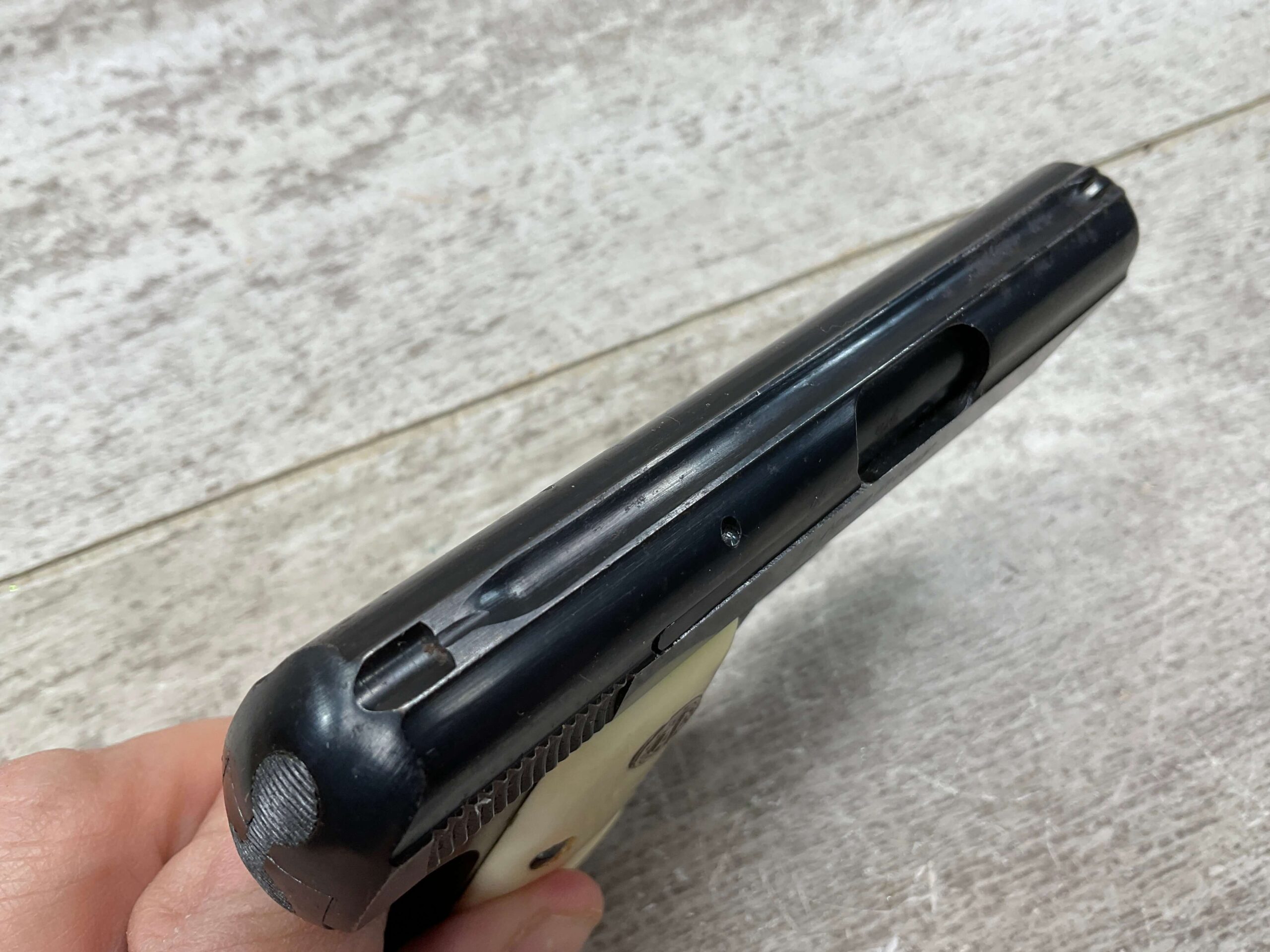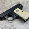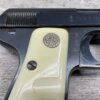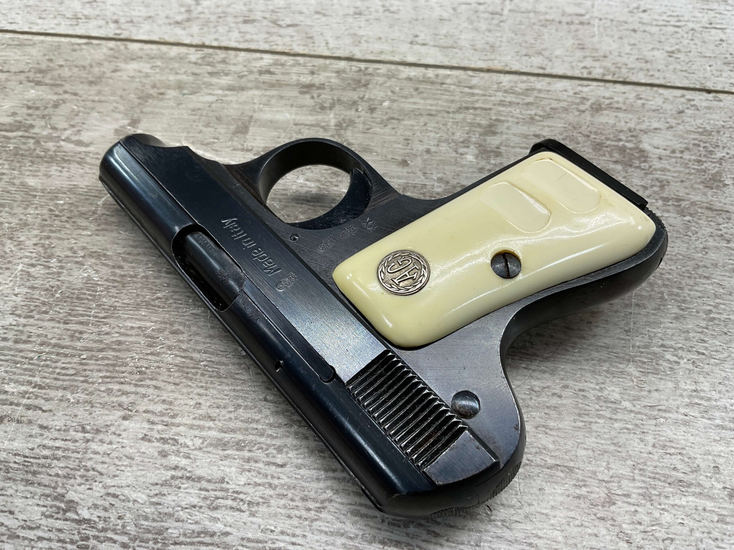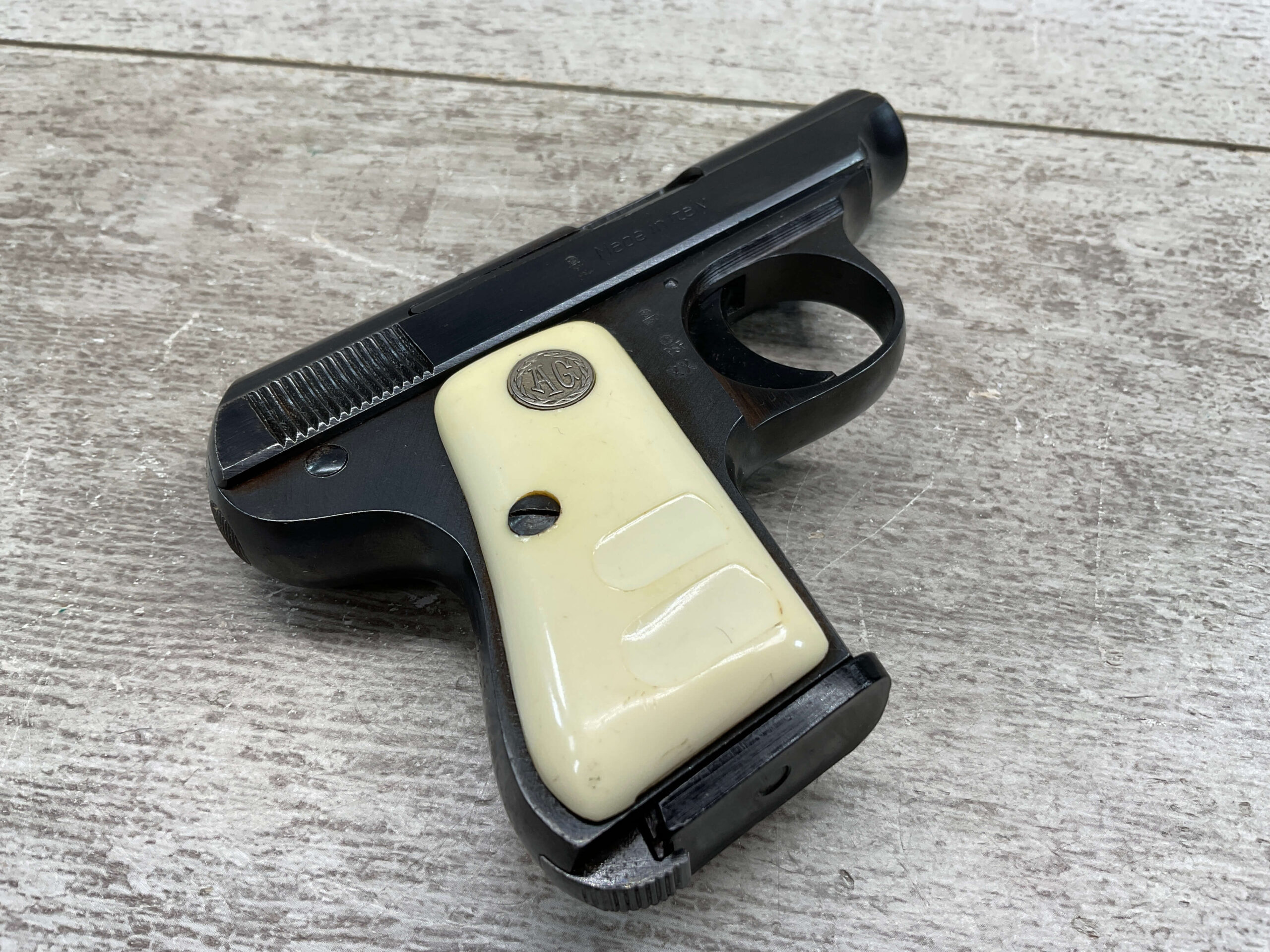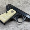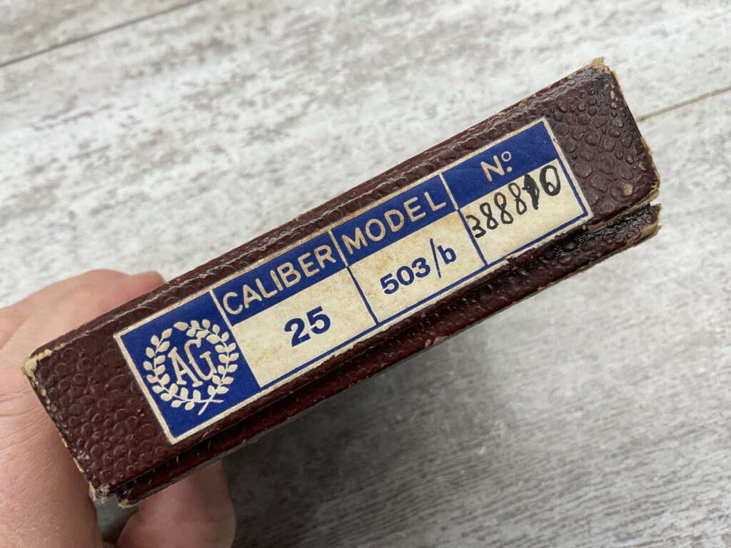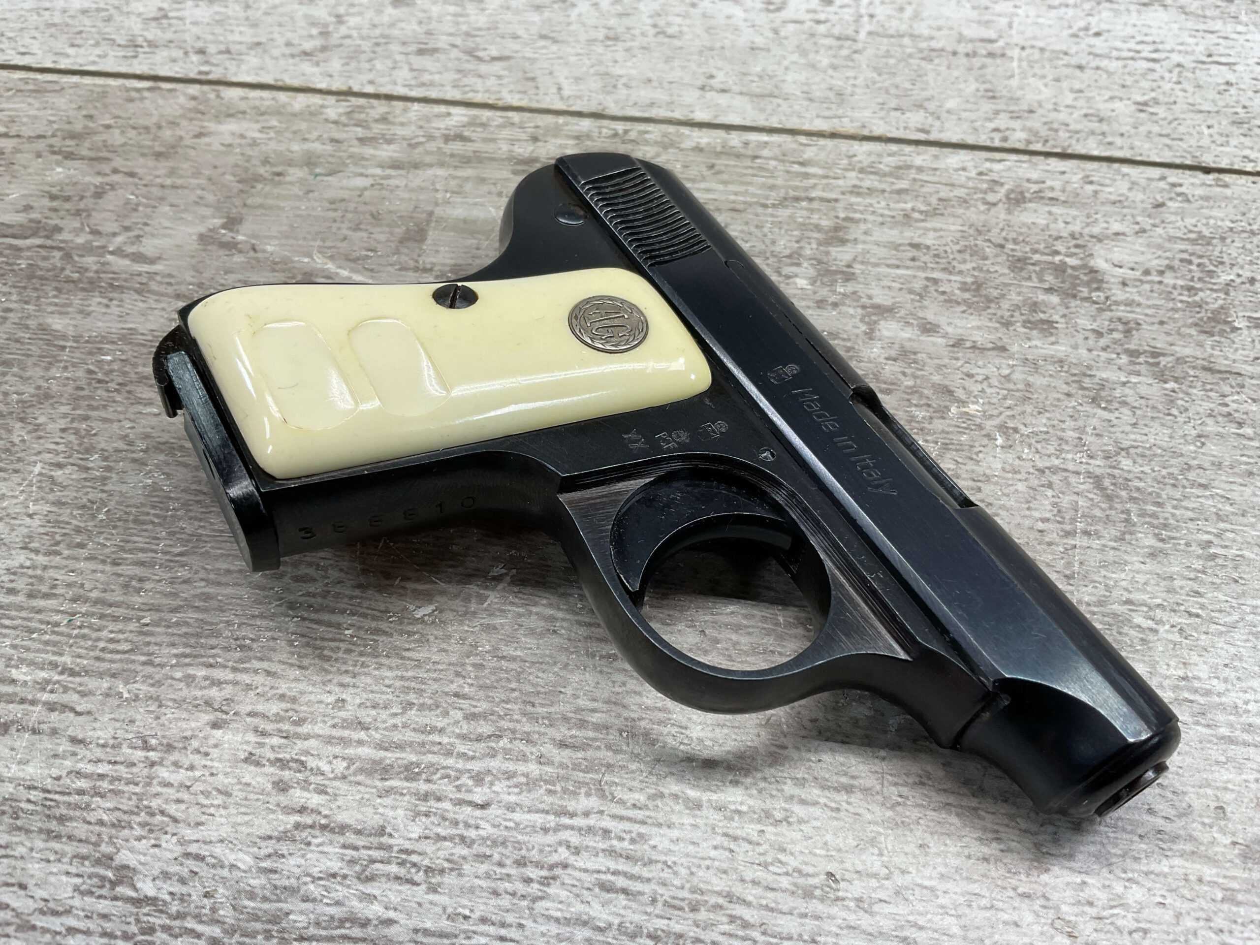 GALESI-BRESCIA 6.35MM SEMI AUTO PISTOL IN BOX, 1959 MFR #388810, 2″ BARREL, EXC BRIGHT BORE & RIFLING, ORIGINAL BOX / CLEANING TOOL & PAPERWORK INCLUDED, VG-EXC ORIGINAL BLUE (LIGHT SPECKLING IN AREAS), EXC SMOOTH PLASTIC GRIPS, 6 ROUND MAGAZINE, 90%+ OVERALL