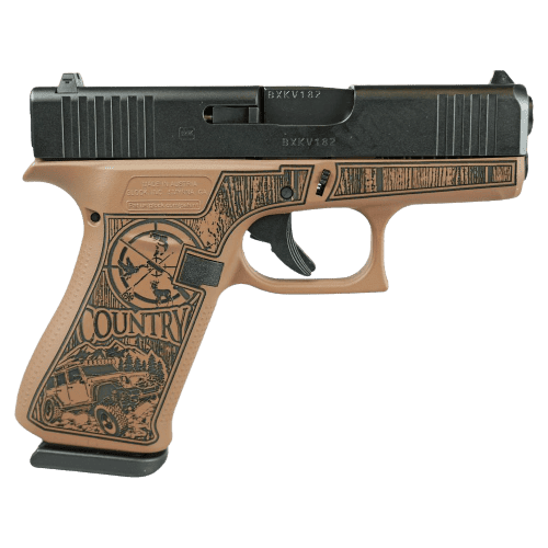 GLOCK G43X 9MM CUSTOM ENGRAVED “COUNTRY BOURBON” CERAKOTE PISTOL, NEW IN BOX & NEVER FIRED, #AKXG285, INCLUDES CASE, (2) 10-ROUND MAGAZINES, AND GUN LOCK, THIS IS A REAL COOL LOOKING FIREARM!!