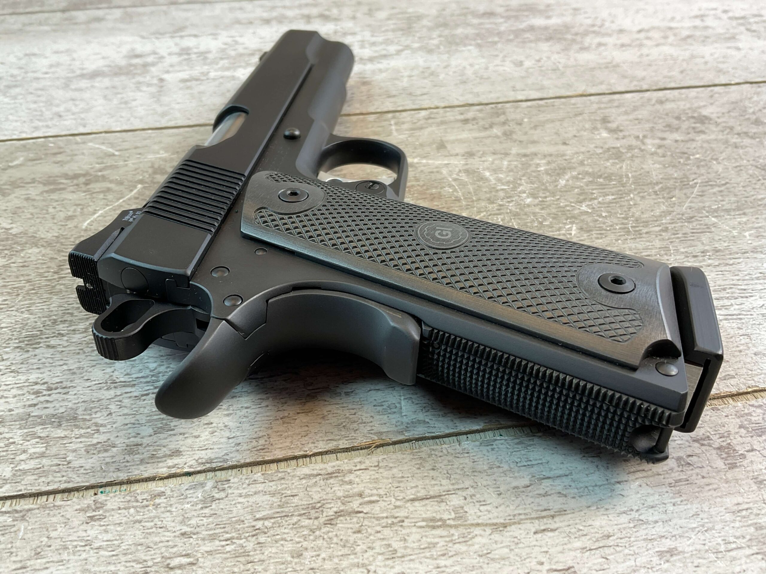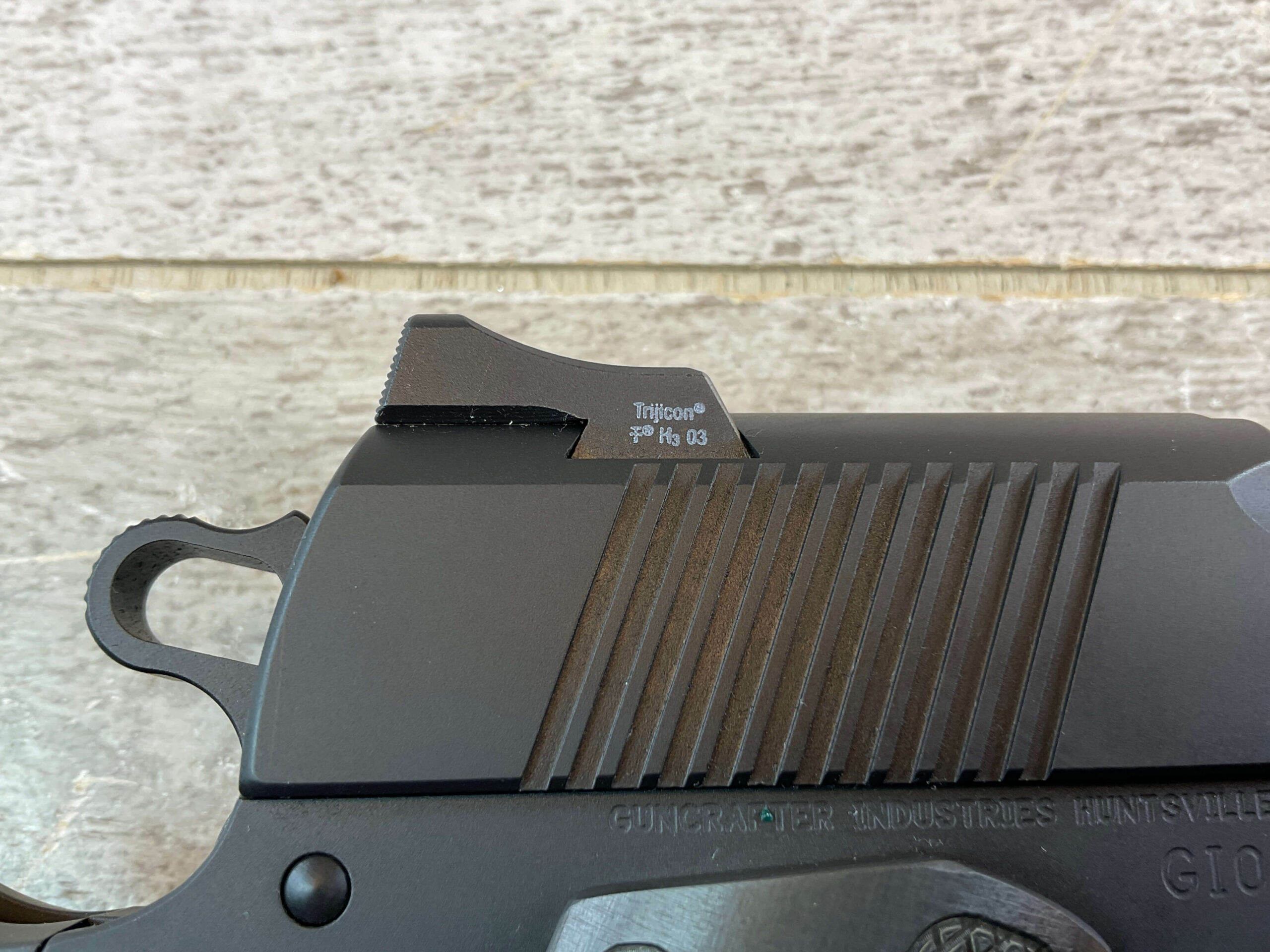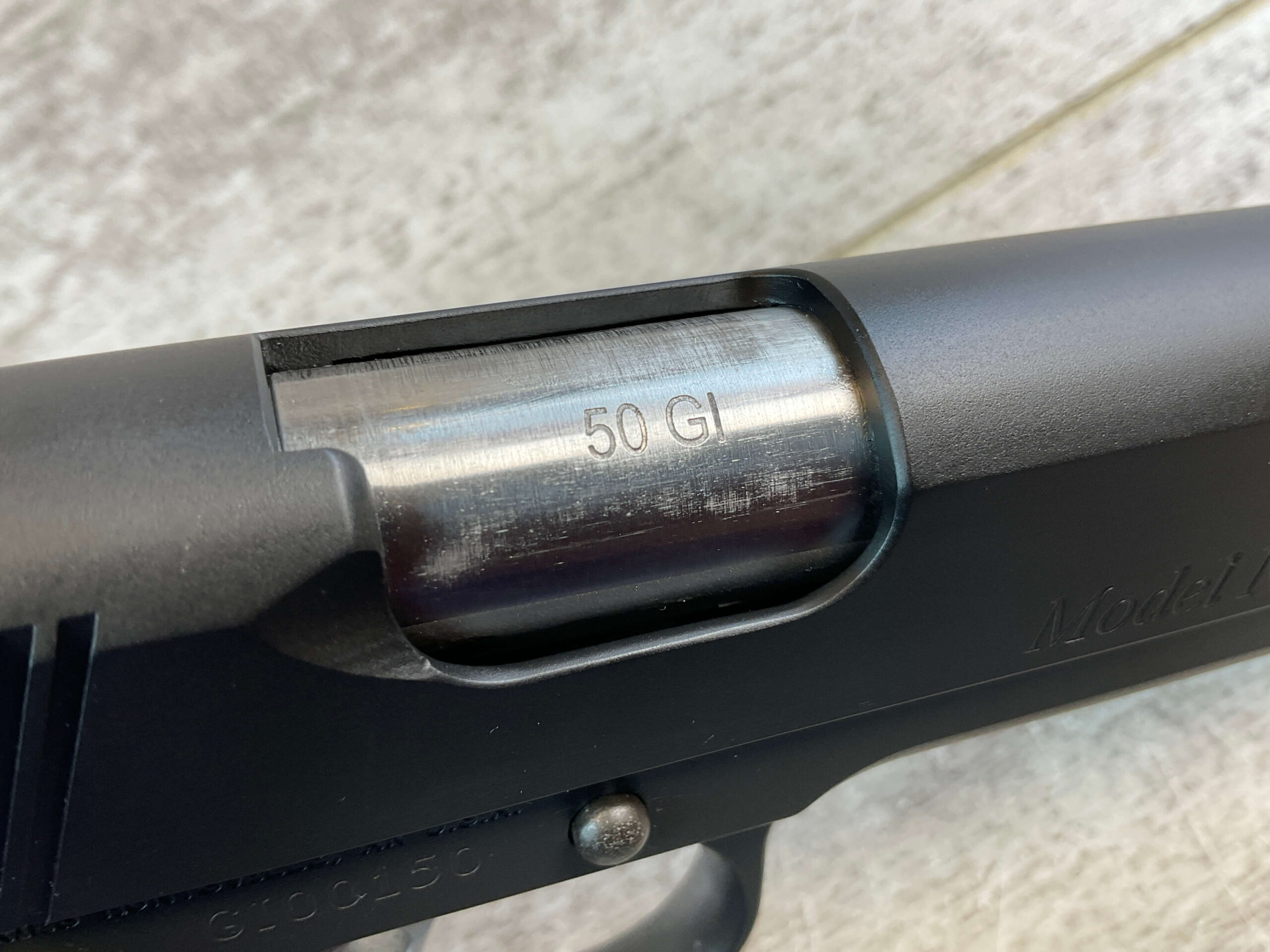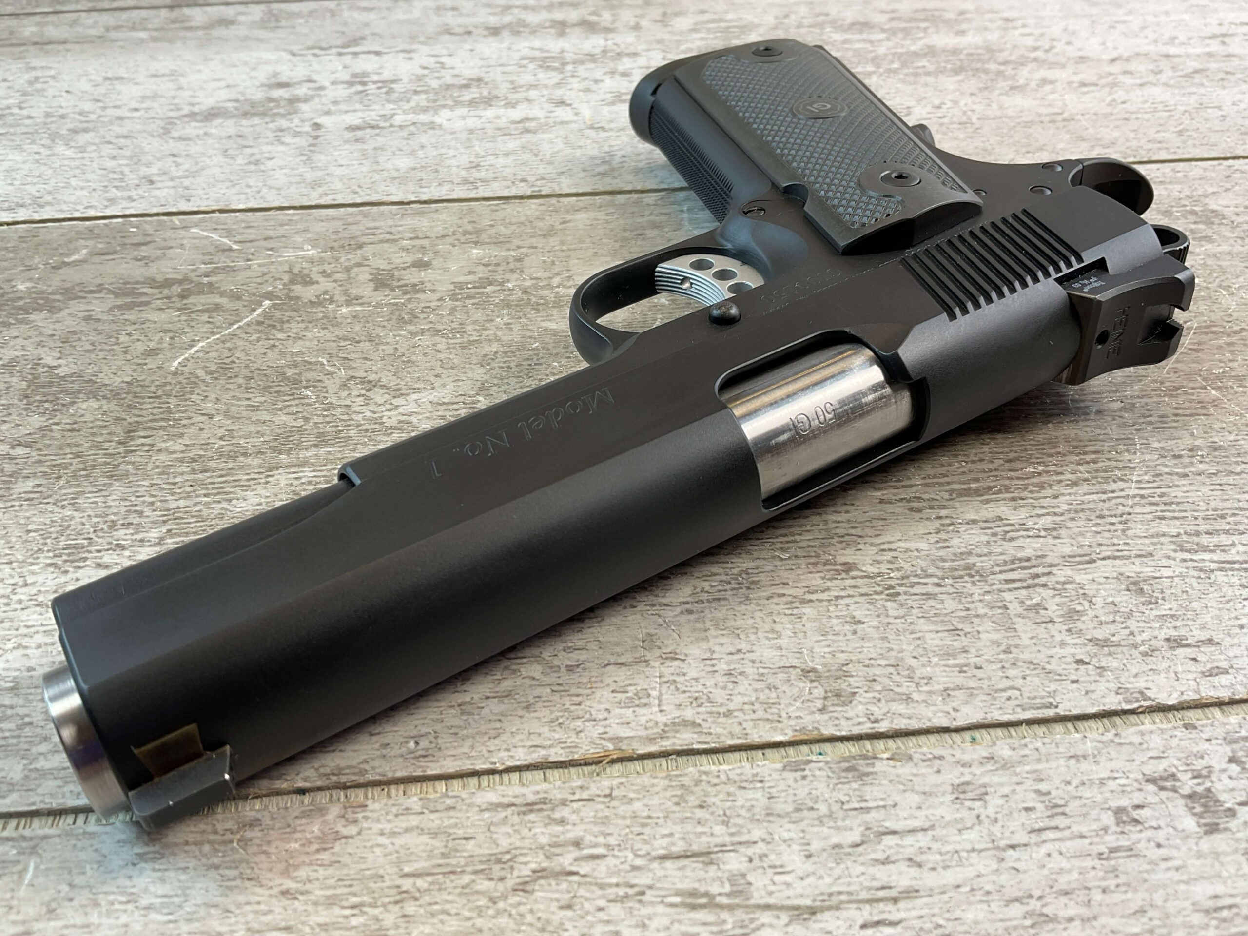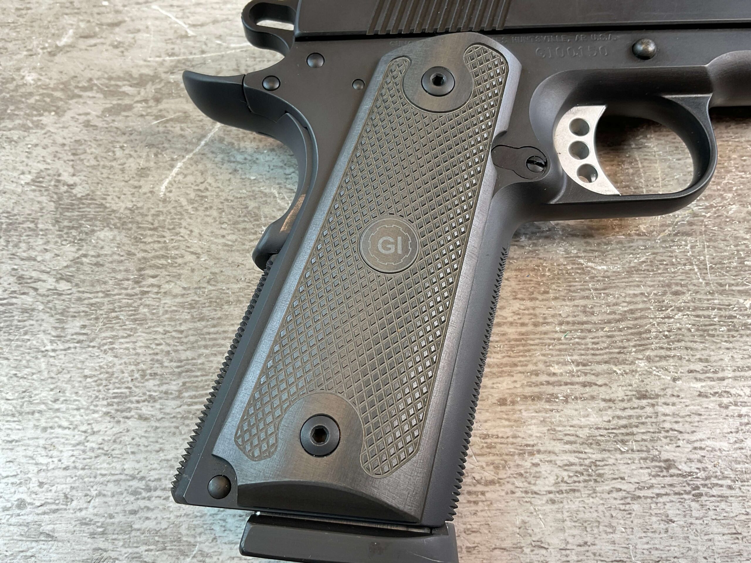 GUNCRAFTER MODEL NO. 1 50GI CUSTOM SEMI AUTO PISTOL, JAMES EARL JONES COLLECTION #GI00150, 5″ BARREL, EXC MIRROR BORE & RIFLING, EXC LIKE NEW FINISH, MATCH TRIGGER & STAINLESS BARREL, FORGED STEEL FRAME & SLIDE, ALUMAGRIPS W/ FULL CHECKERING & “GI” LOGO, 20 LPI CHECKING ON FRONT STRAP, GI HENIE TRITIUM SIGHTS, VERY NICE, CONDITION AS SHOWN IN PICTURES, FROM THE JAMES EARL JONES “FAVORITES” COLLECTION W/ CERTIFICATE OF AUTHENTICITY.