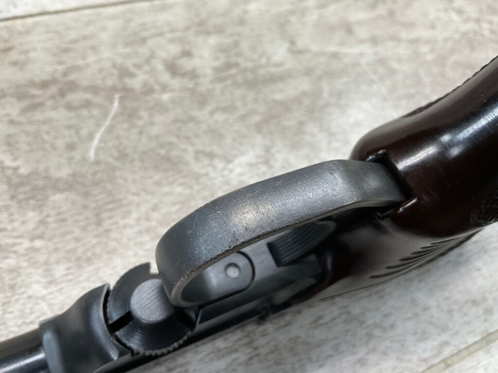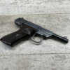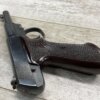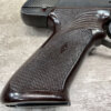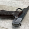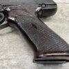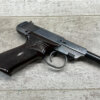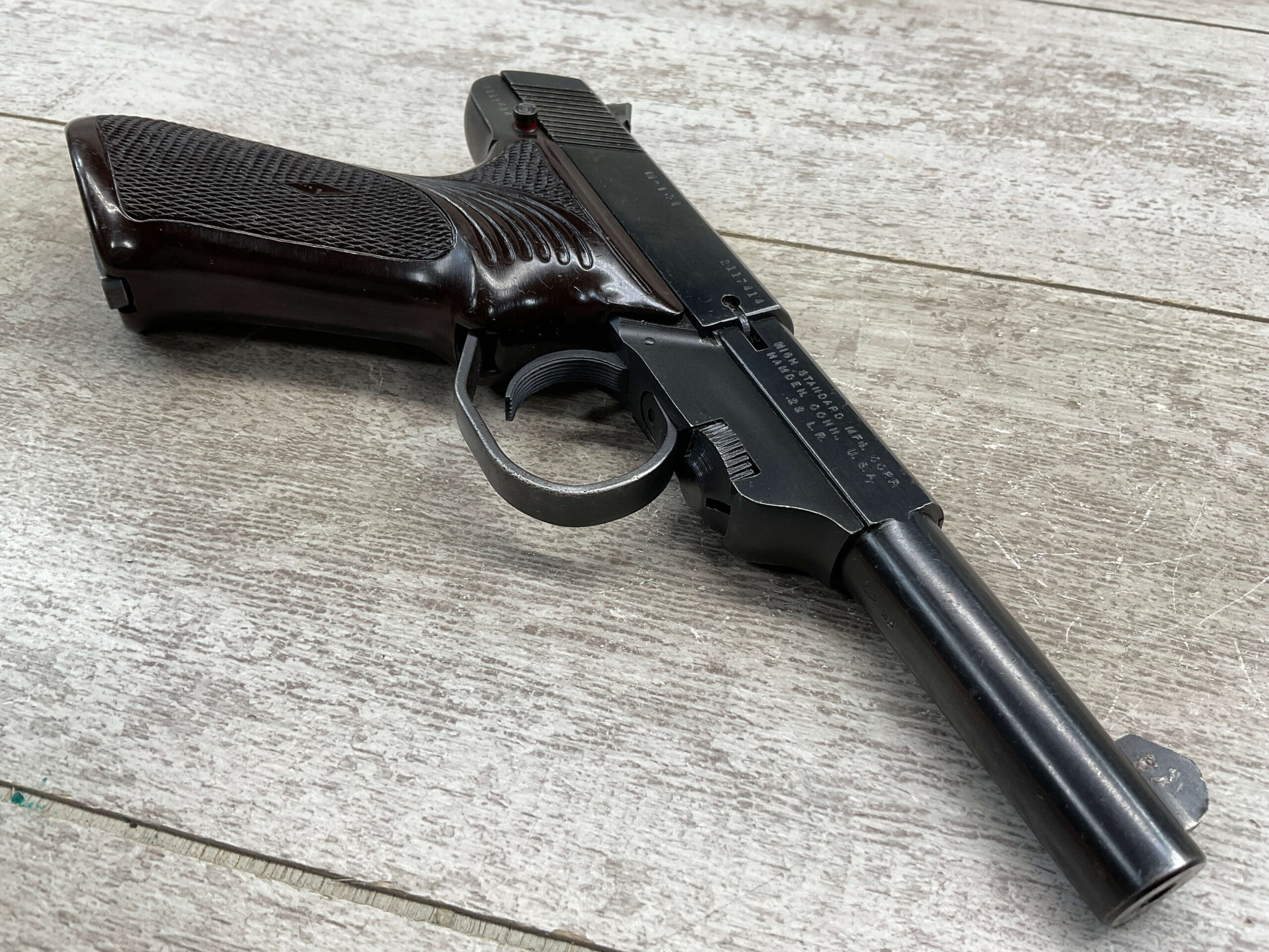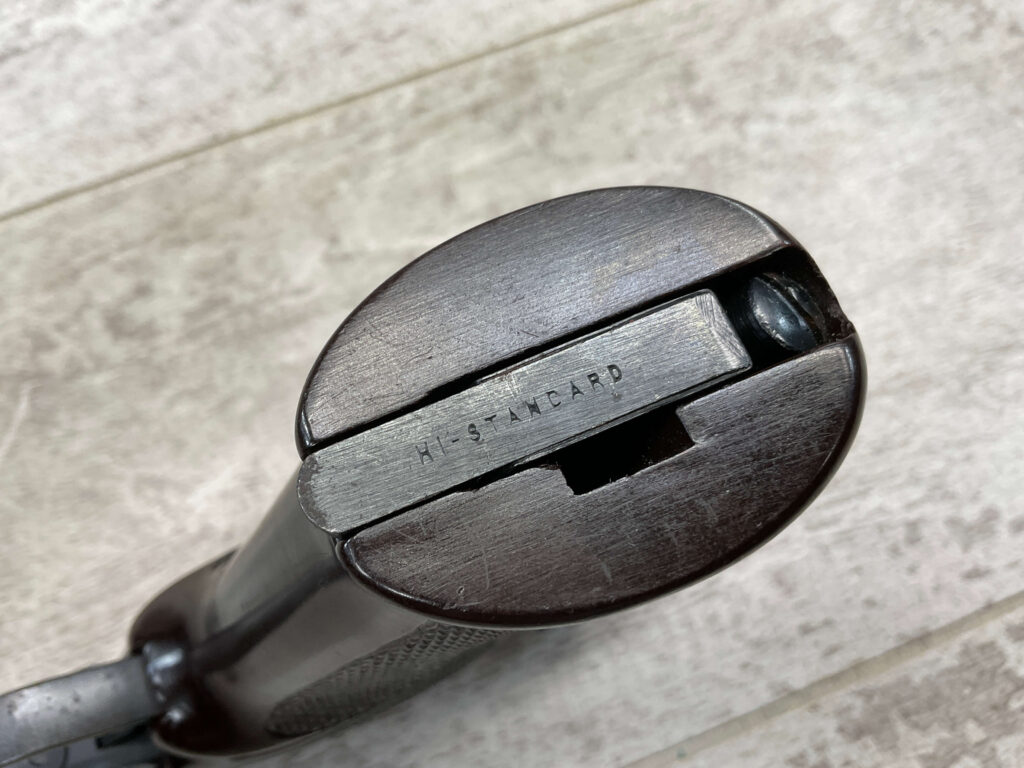 HIGH STANDARD M-101 DURA-MATIC .22LR SEMI AUTO PISTOL, 1969 MFR #2117414, 4 1/2″ BARREL, EXC BRIGHT BORE & RIFLING, GOOD ORIGINAL BLUE W/ HIGH EDGE WEAR & A COUPLE AREAS OF SPECKLING, VG/EXC CHECKERED PLASTIC GRIPS, 1 – 10 ROUND MAGAZINE, VG OVERALL
