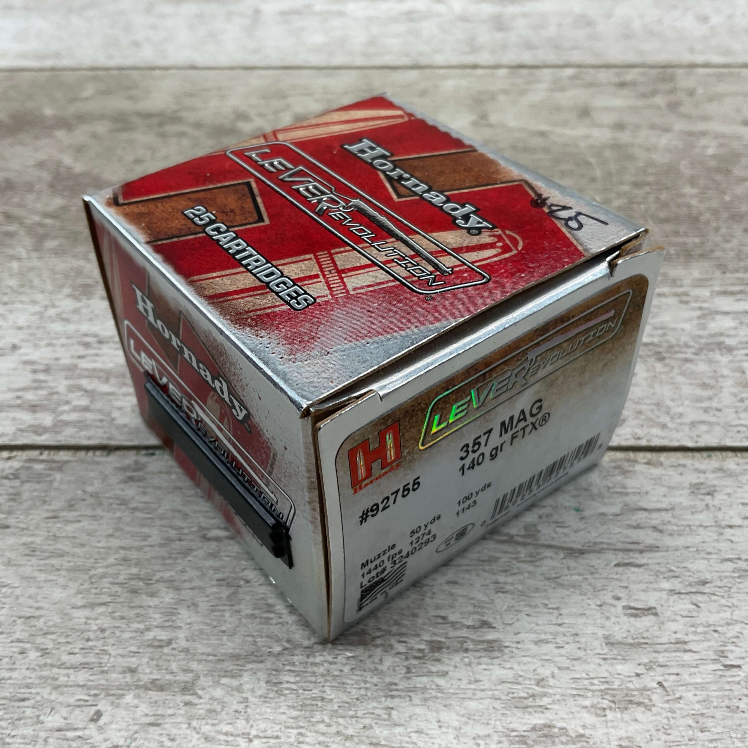 HORNADY 357 MAGNUM MULTIPLE CARTRIDGE TYPE, LEVEREVOLUTION 140GR FXT QTY 18, HORNADY 357 MAGNUM QTY 5, PARTIAL BOX QTY 23