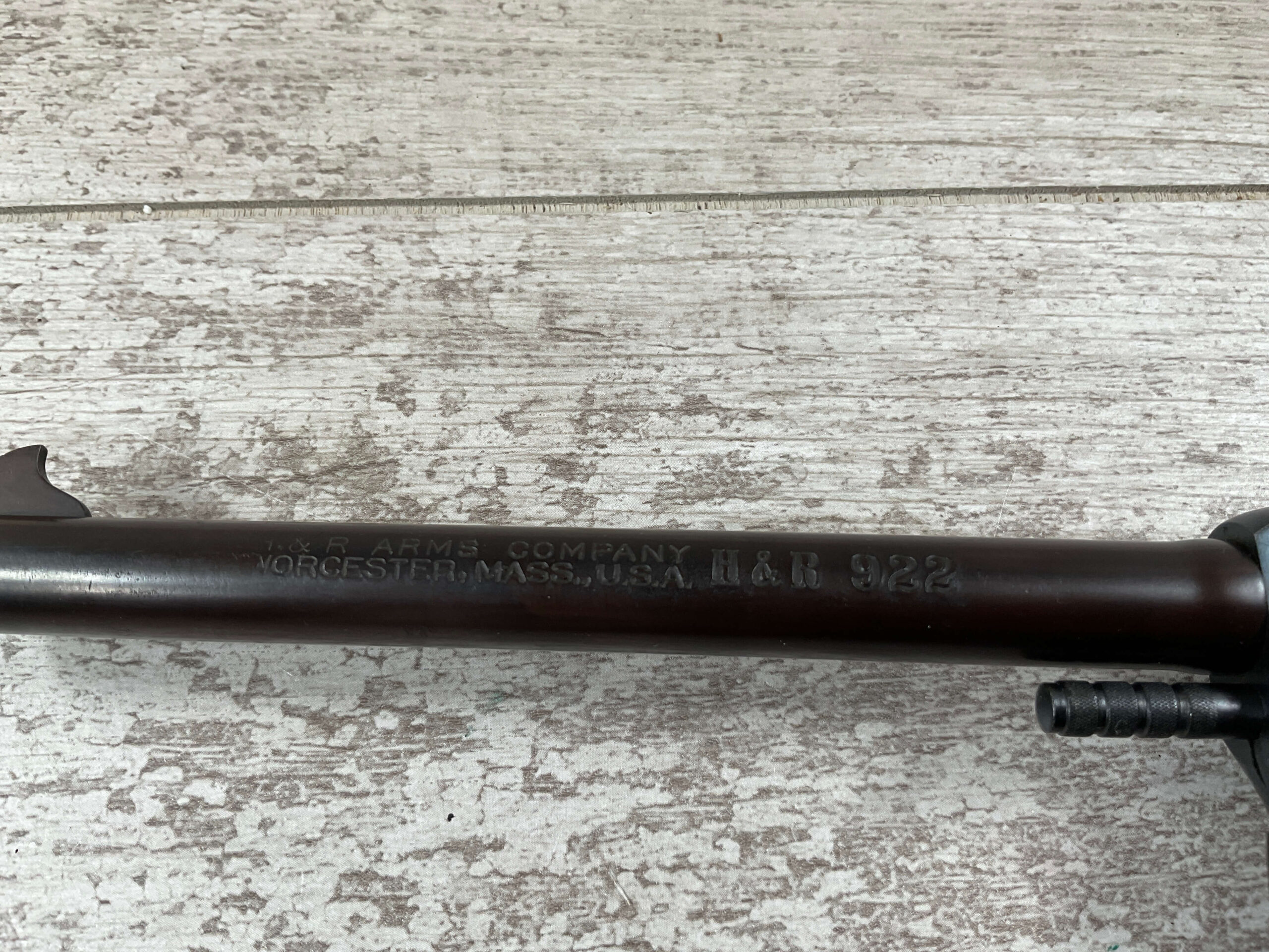 H&R 922 .22LR 9 SHOT REVOLVER 7TH VARIATION #L4993, 1951 MFR, LEFT SIDE OF BARREL IS MARKED “H&R ARMS COMPANY WORCHESTER, MASS. U.S.A. H&R 922″, 6” BARREL, 95+% ORIGINAL BLUE RECEIVER, BARREL IS BEAUTIFUL RUST BLUE, VERY LIGHT HANDLING MARKS/HIGH EDGE WEAR, TIGHT LOCKUP, CRISP TRIGGER, EXC ORIGINAL H&R PLASTIC CHECKERED GRIPS, 95+% OVERALL