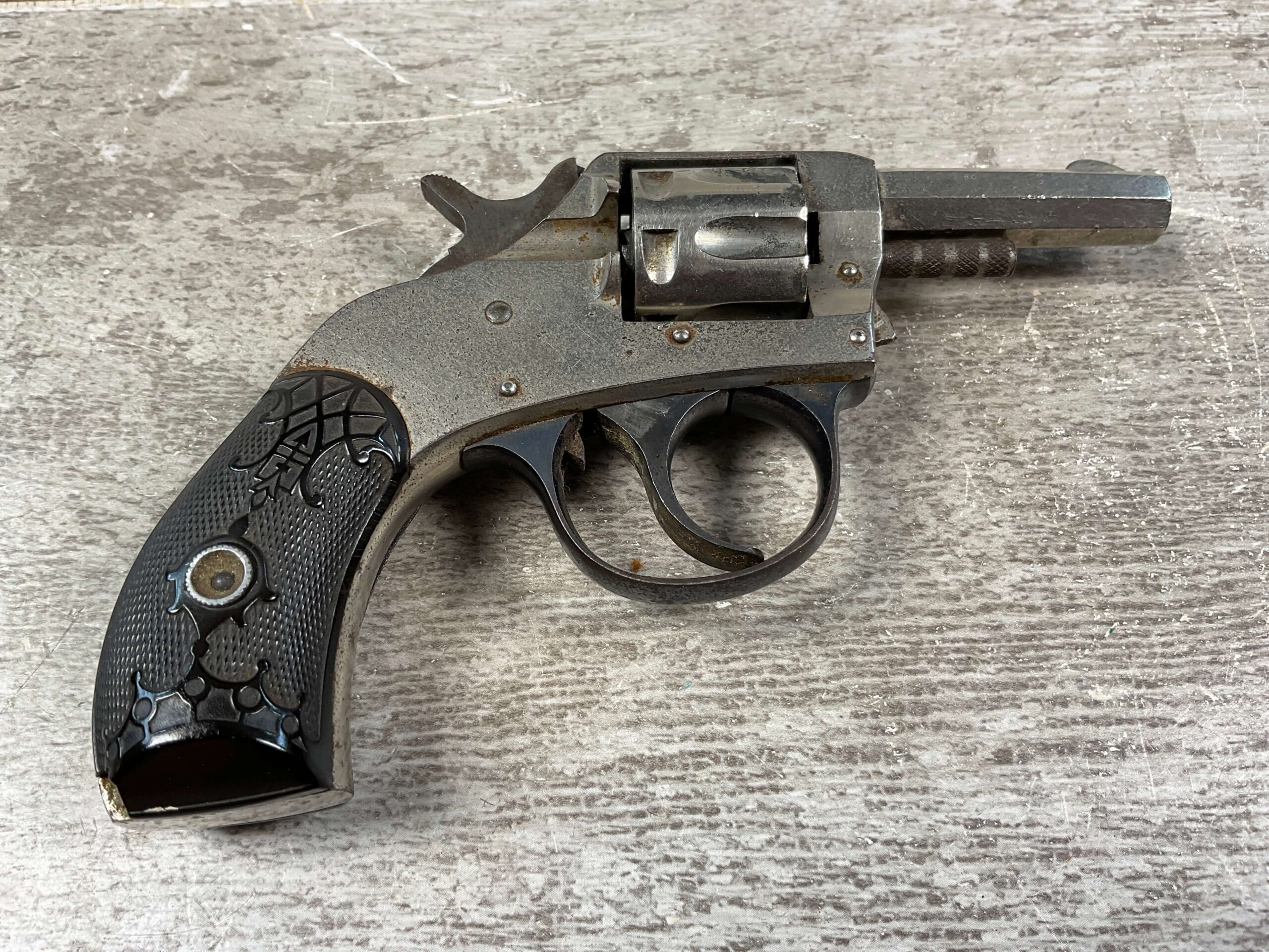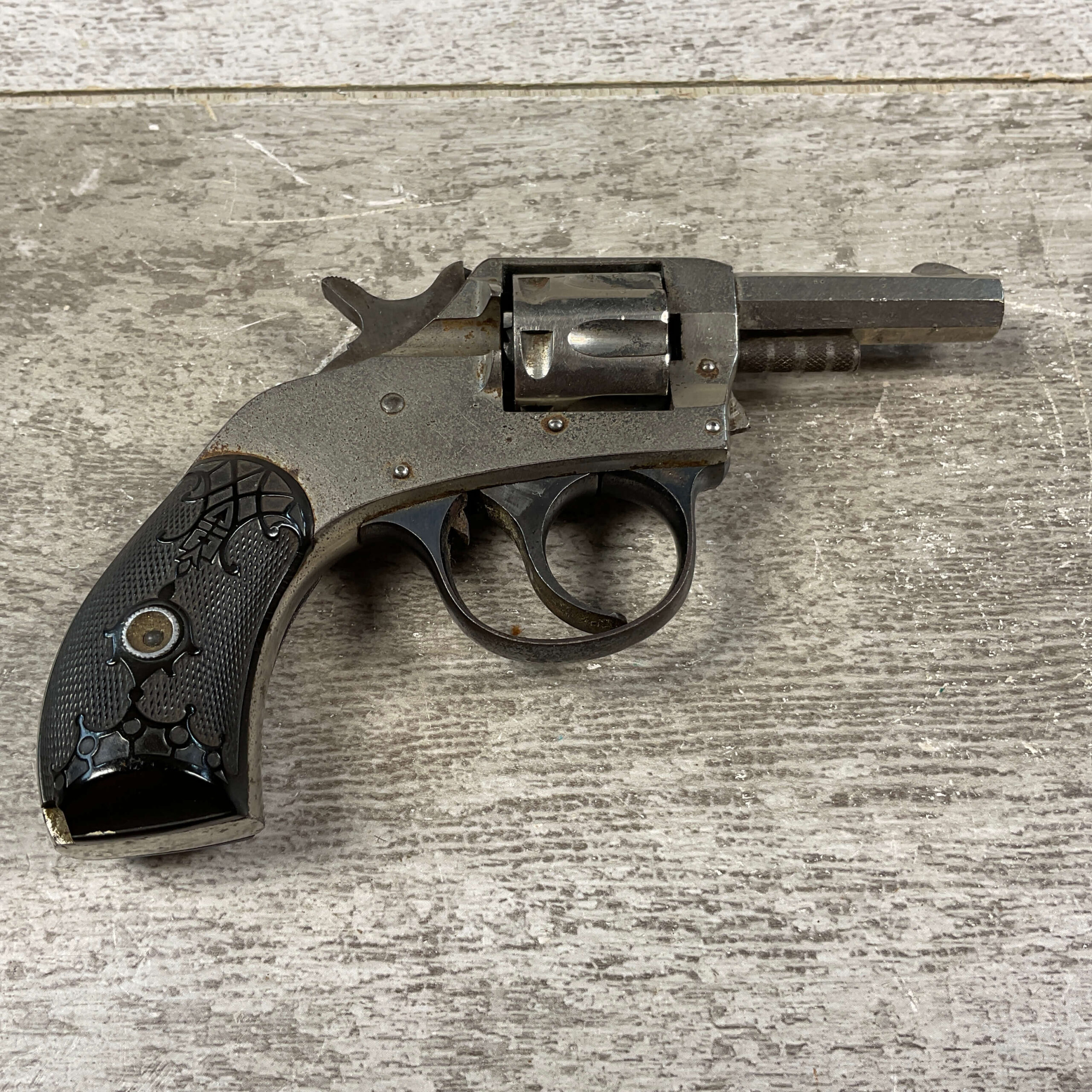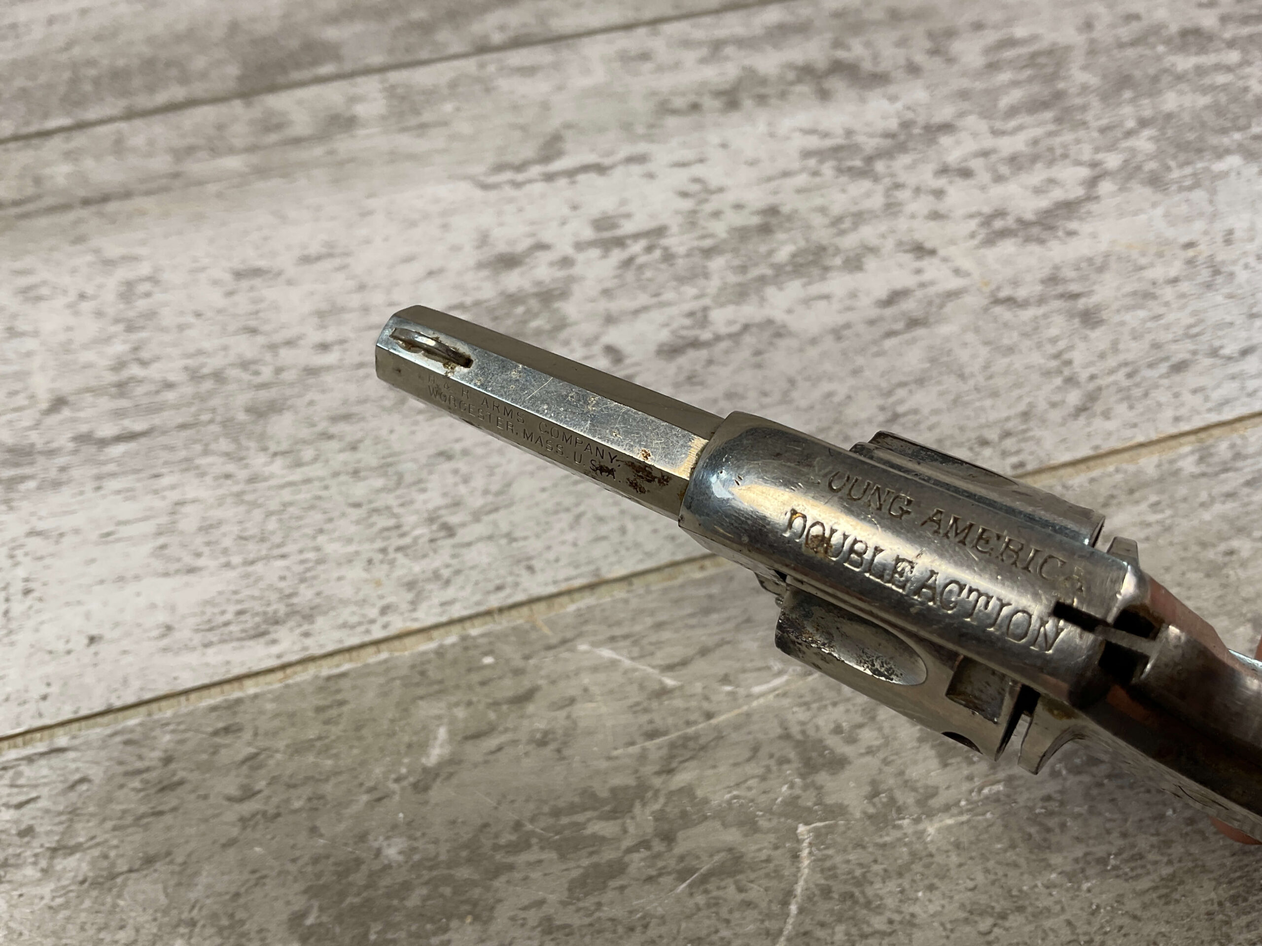 H&R ARMS YOUNG AMERICAN DOUBLE ACTION 22 SHORT REVOLVER, C&R FFL #NSN, 2″ OCTAGON BARREL, 70% NICKEL FINISH, VG-EXC BLACK PLASTIC GRIPS, 7 SHOT CYLINDER, GOOD BLUED TRIGGER GUARD, C&R FFL OK, CONDITION AS SHOWN IN PICTURES, CONDITION AS SHOWN IN PHOTOS