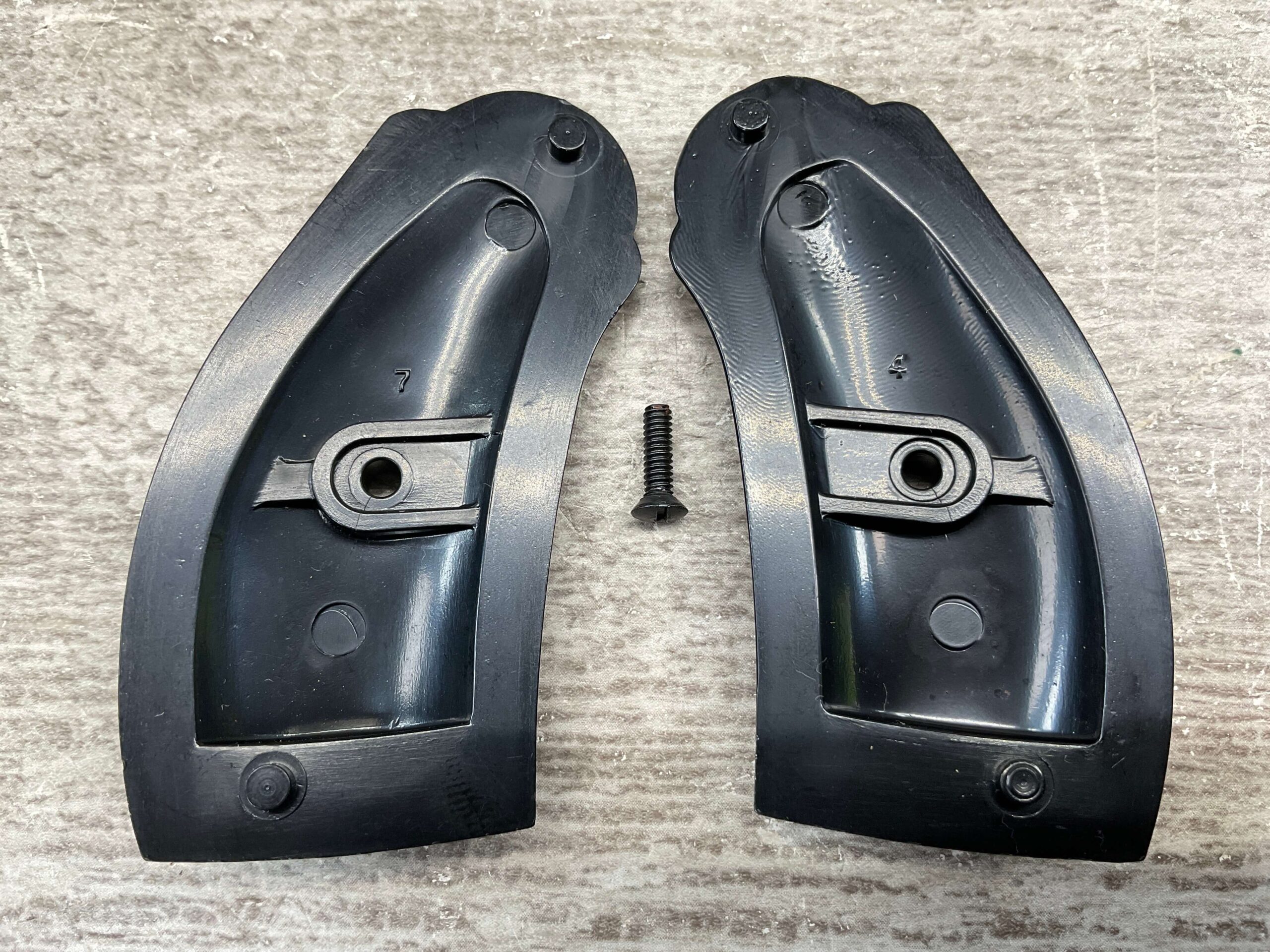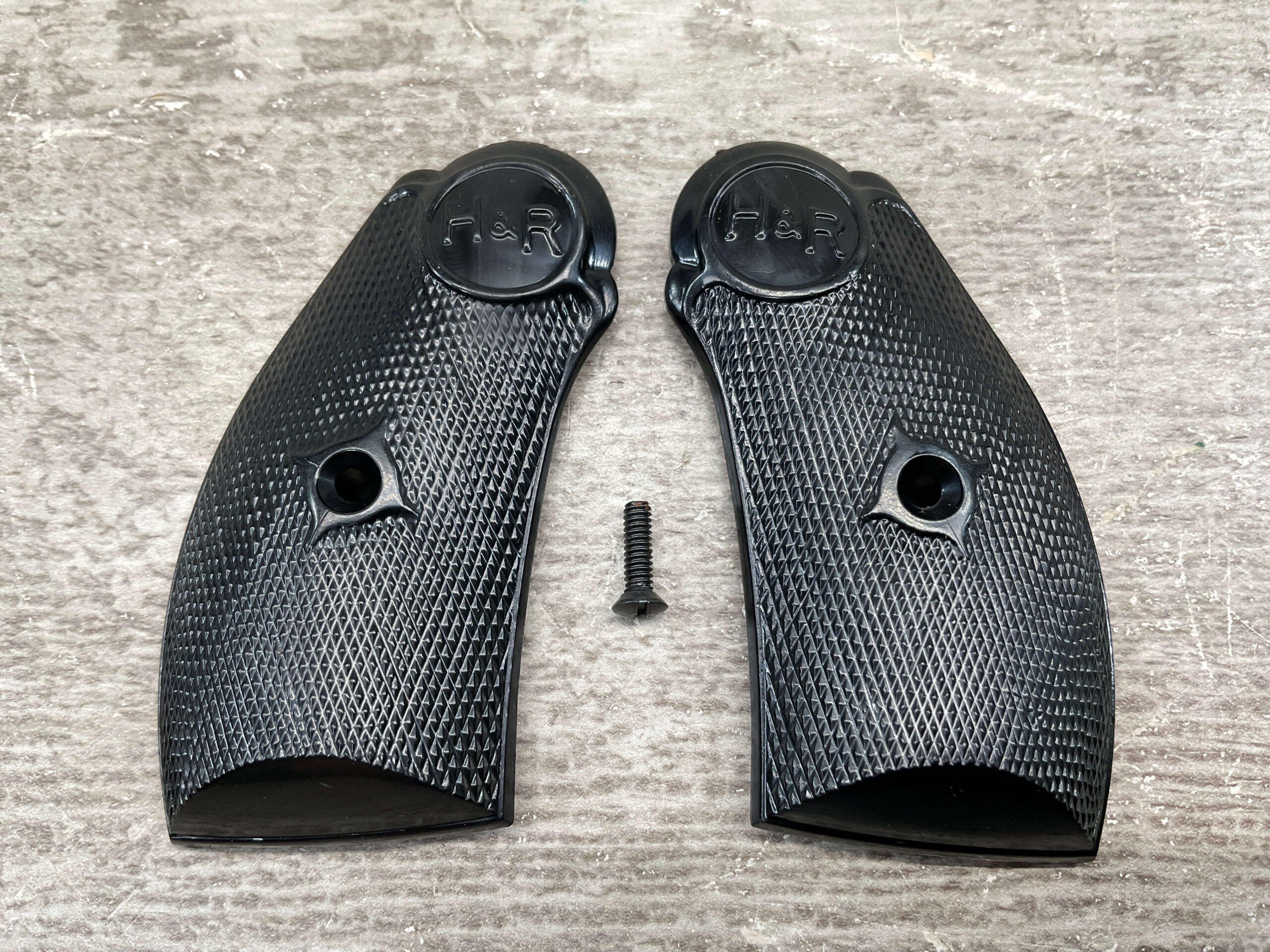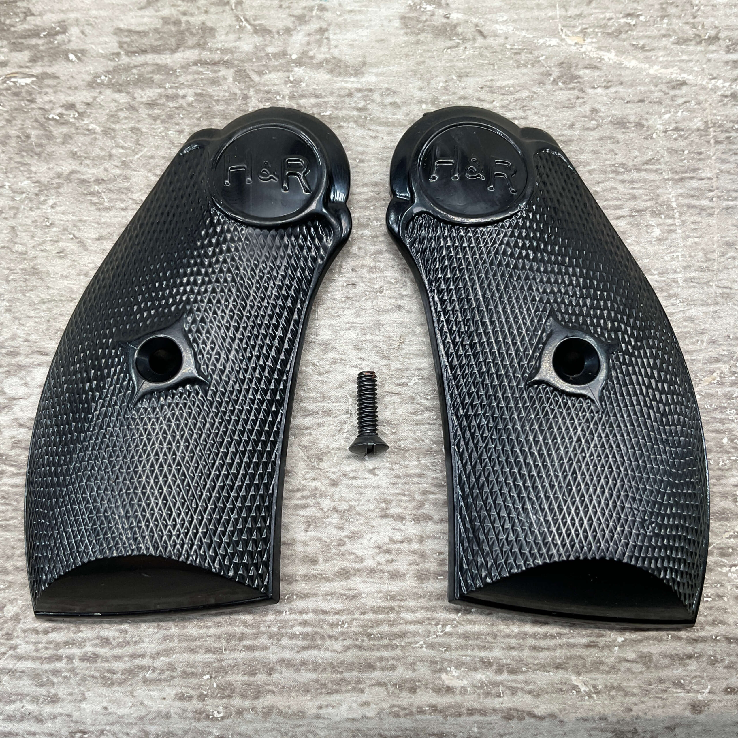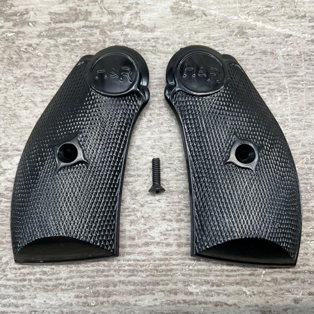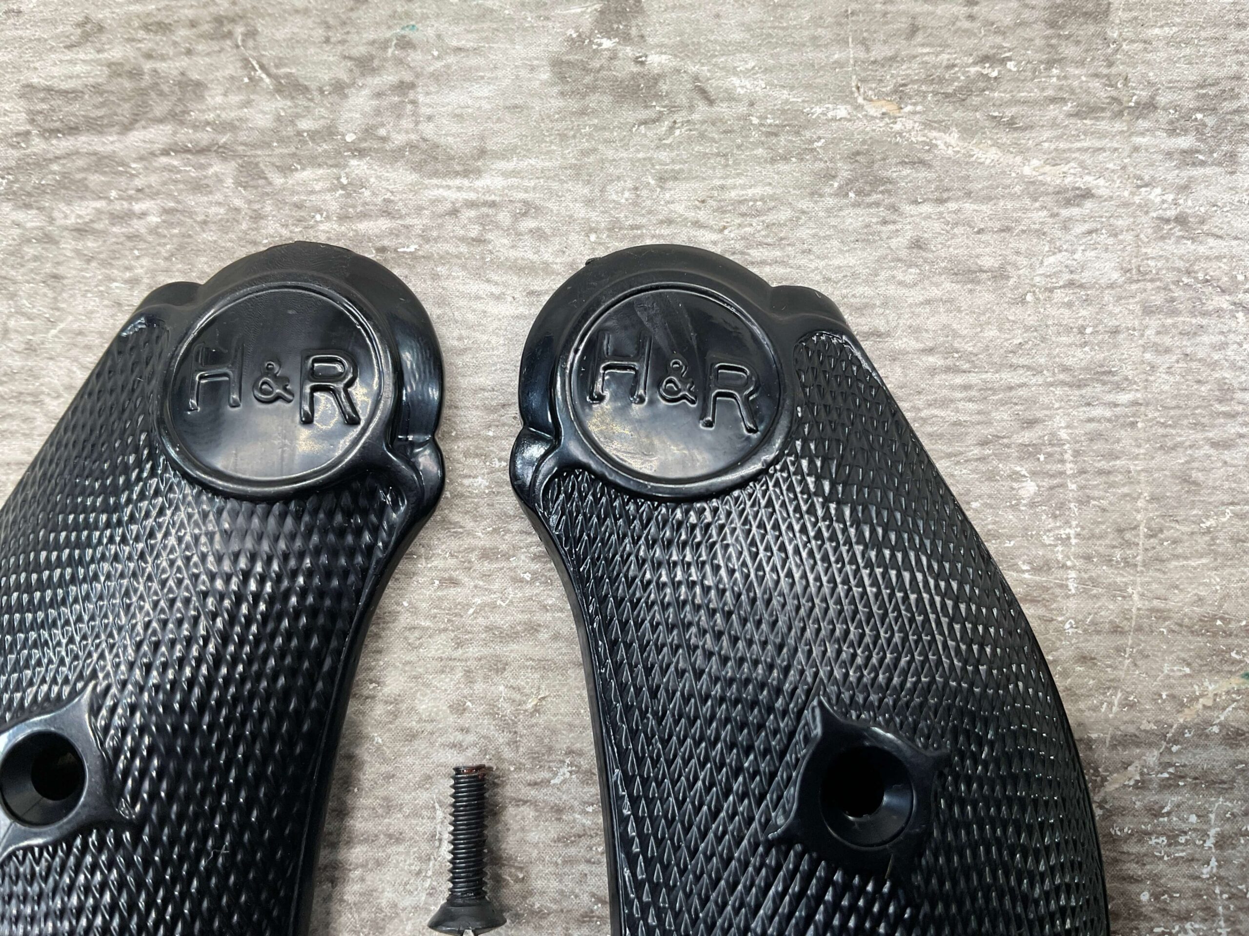 H&R PISTOL GRIPS, BLACK PLASTIC, WITH SCREWS, IN EXCELLENT/NEW CONDITION.