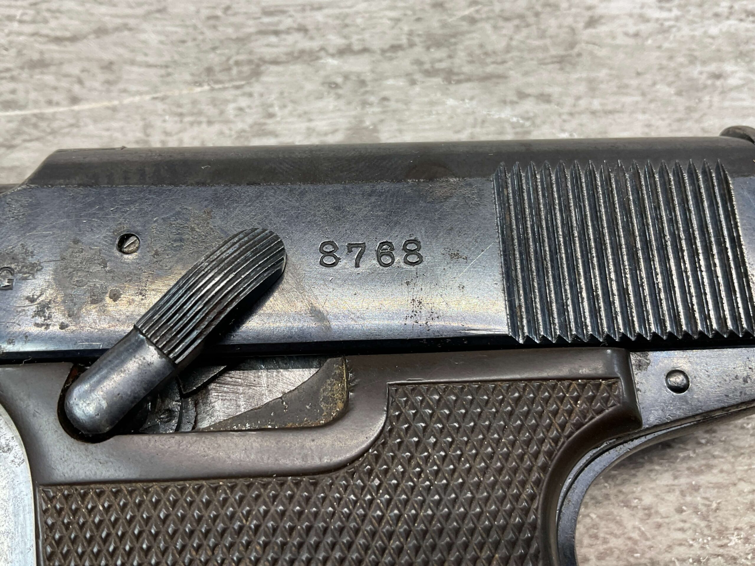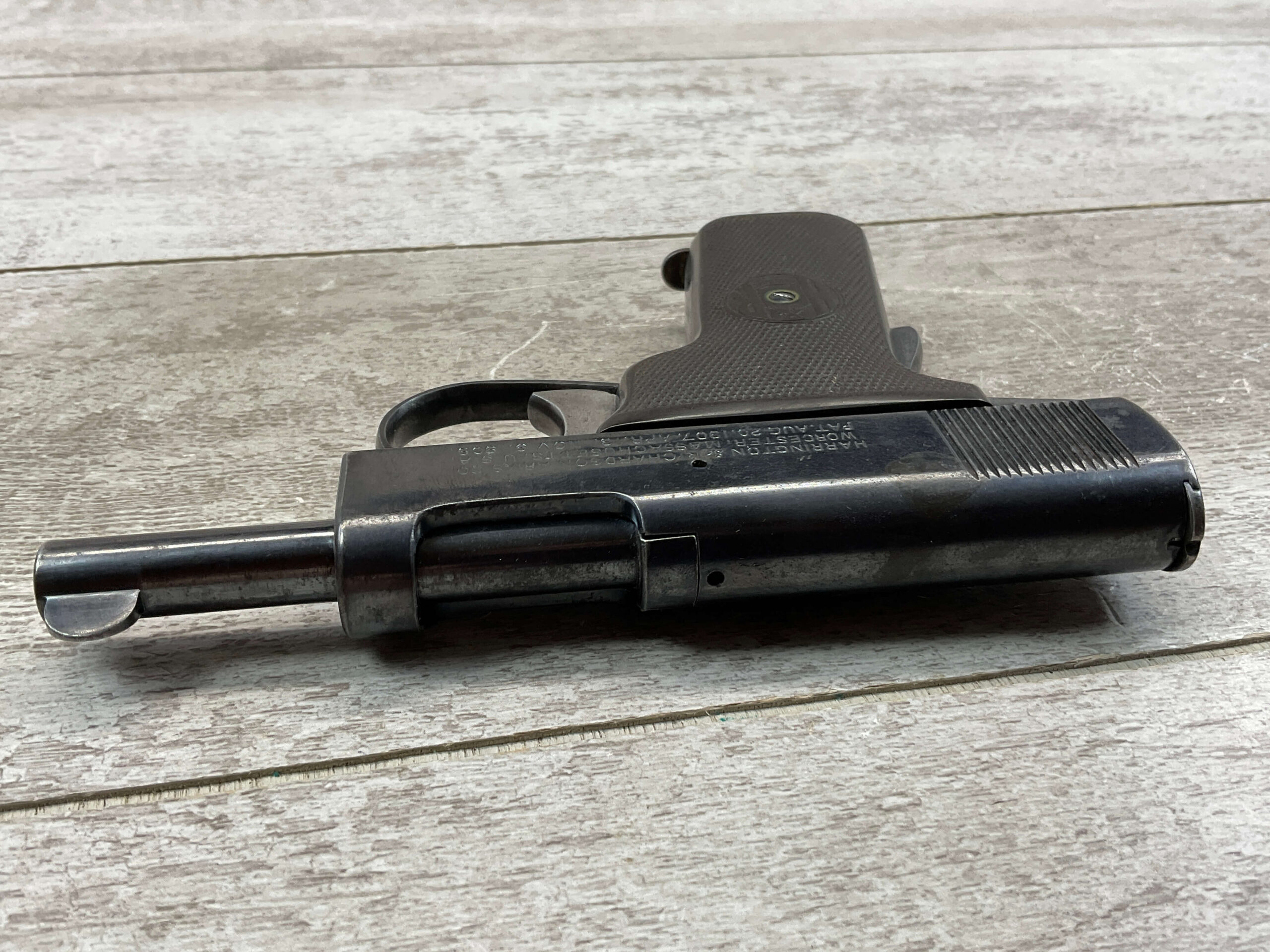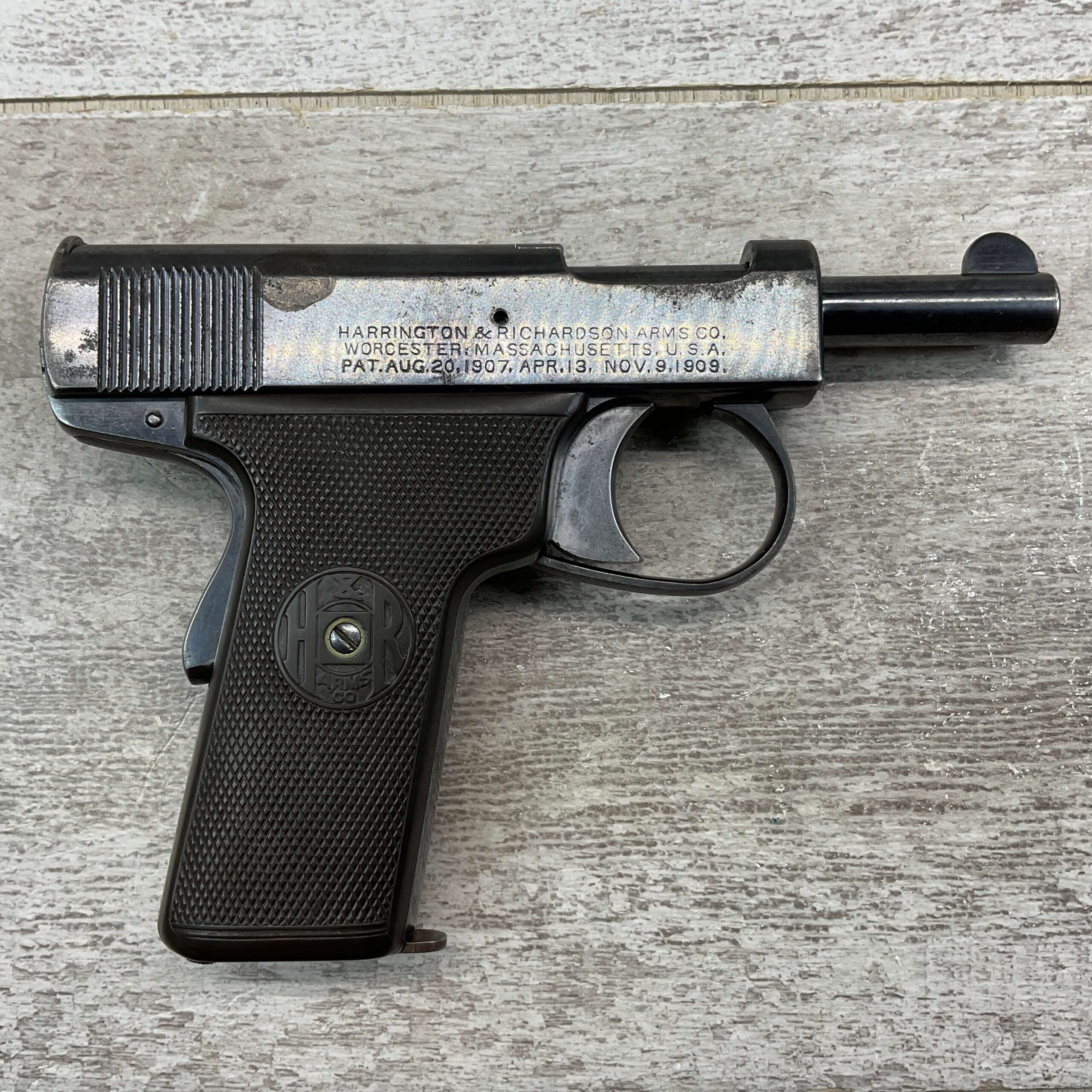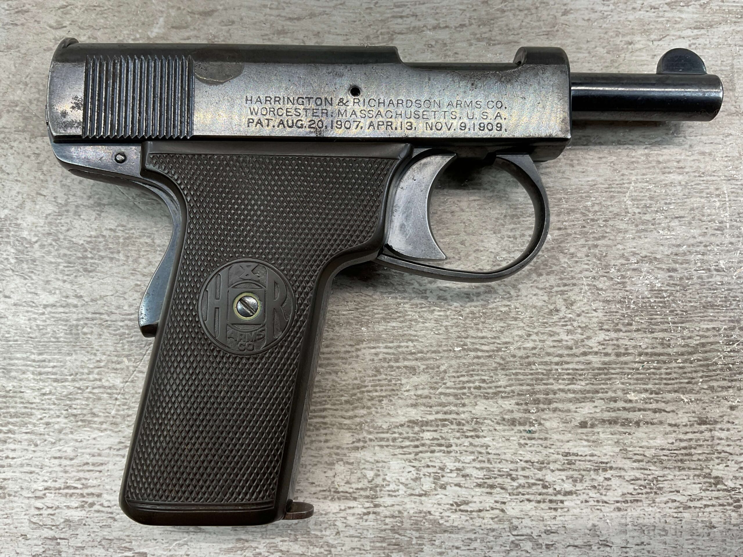 H&R SELF-LOADING 32ACP PISTOL #8768 THE 8 SHOT HARRINGTON & RICHARDSON WAS MFR. FROM 1914 – 1924, 3.5″ BBL, BLUE FINISH IS 85+% W/ LIGHT FRECKLING ON THE LEFT SIDE OF THE SLIDE, BORE IS DARK W/HEAVY FROSTING & FAIR RIFLING, BROWN PLASTIC GRIPS ARE IN VG CONDITION W/NO CRACKS, RIGHT SIDE OF SLIDE IS MARKED “H&R SELF-LOADING CALIBER 32.” LEFT SIDE IS MARKED “HARRINGTON & RICHARDSON ARMS CO. /WORCESTER, MASS. U.S.A./PAT. AUG.20.’07. APRIL 13, NOV.9, 1909., GREAT LITTLE PIECE @ OVER 100YRS OLD!!
