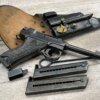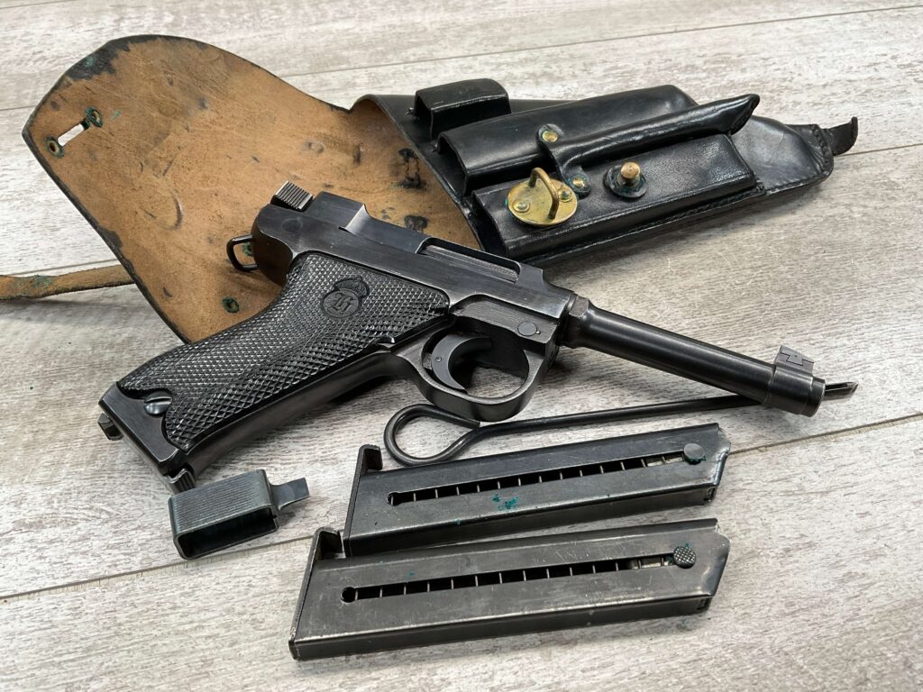 HUSQVARNA LAHTI M40 9MM SEMI AUTO PISTOL RIG #D11556, 9MM, ALL MATCHING W/ORIGINAL BLUE FINISH W/HIGH EDGE WEAR, EXC CHECKERED GRIPS W/NO CRACKS, VG BORE W/LIGHT FROSTING, EXC MECHANICALLY, “HV CROWN” ON REAR RECEIVER, ORIGINAL TRIPLE CROWN MARKED HOLSTER, TWO SPARE CROWN MARKED MAGAZINES & 1 NON MARKED, LOADING TAKEDOWN TOOL & CLEANING ROD, IMPORT MARKED, ROUGHLY 1944 MFR, EXC OVERALL