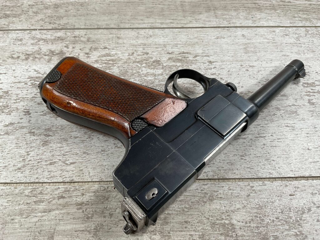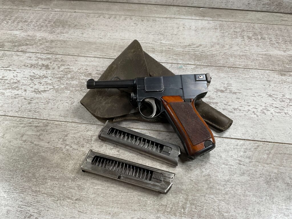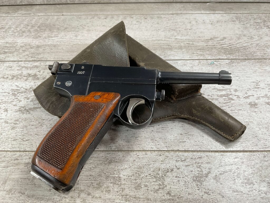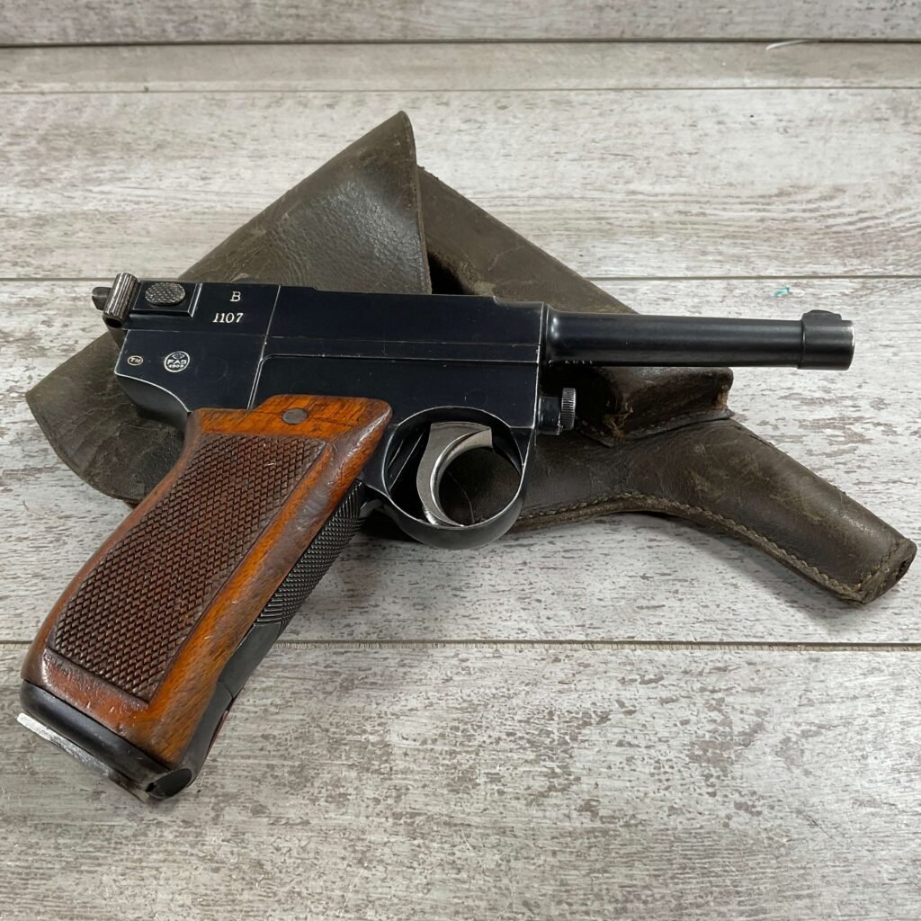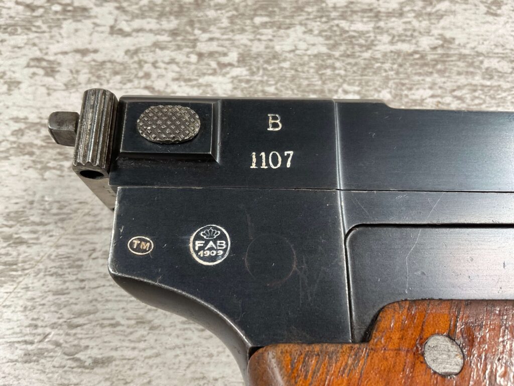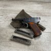 ITALIAN GLISENTI M1910 PISTOL RIG 1909 MFR #1107B, 9MM GLISENTI, ALL NUMBERED PARTS MATCH, 3.75″ BARREL, EXC CHECKERED WOOD GRIPS, 99% ORIGINAL RUST BLUE, SMALL DISASSEMBLY TOOL PRESENT UNDER LEFT GRIP, 2 ORIGINAL MAGAZINES, GRIP SAFETY, EXC GREENISH HOLSTER W/SPARE MAG POUCH, VERY INTERESTING PRE WWI DESIGN!! 95+%