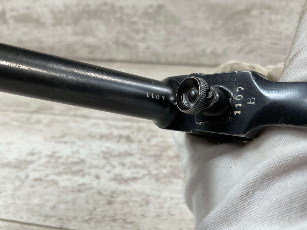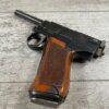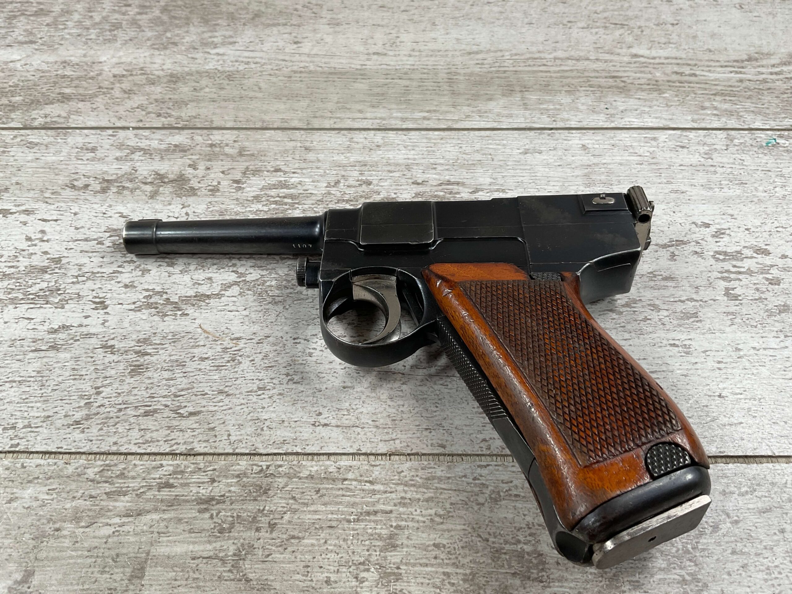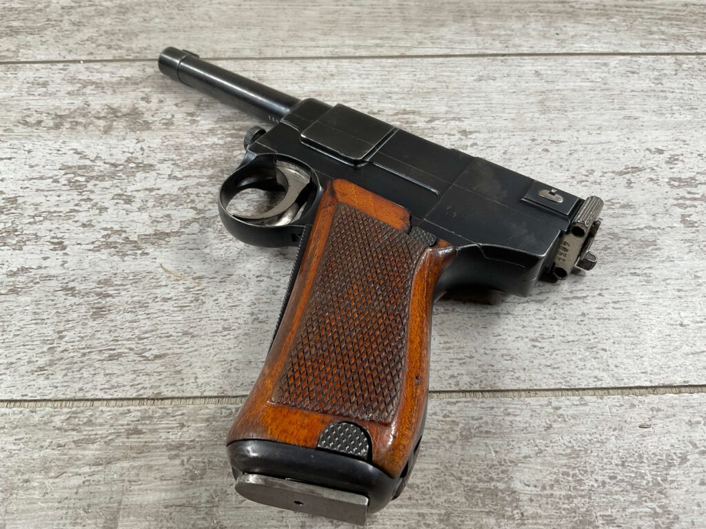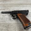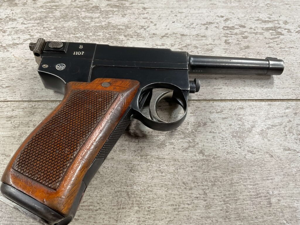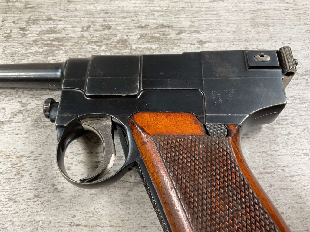 ITALIAN GLISENTI M1910 PISTOL RIG 1909 MFR #1107B, 9MM GLISENTI, ALL NUMBERED PARTS MATCH, 3.75″ BARREL, EXC CHECKERED WOOD GRIPS, 99% ORIGINAL RUST BLUE, SMALL DISASSEMBLY TOOL PRESENT UNDER LEFT GRIP, 2 ORIGINAL MAGAZINES, GRIP SAFETY, EXC GREENISH HOLSTER W/SPARE MAG POUCH, VERY INTERESTING PRE WWI DESIGN!! 95+%