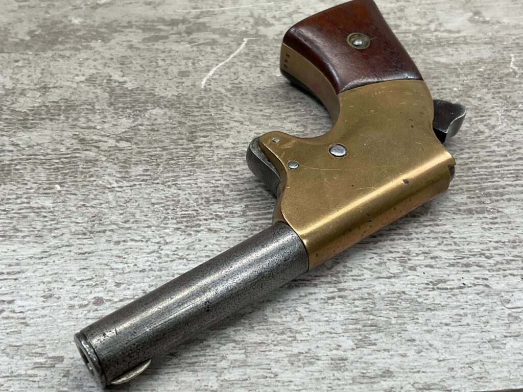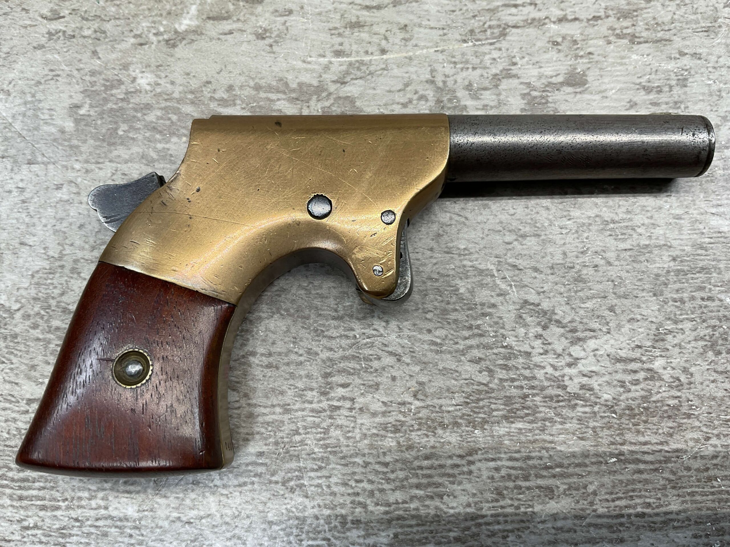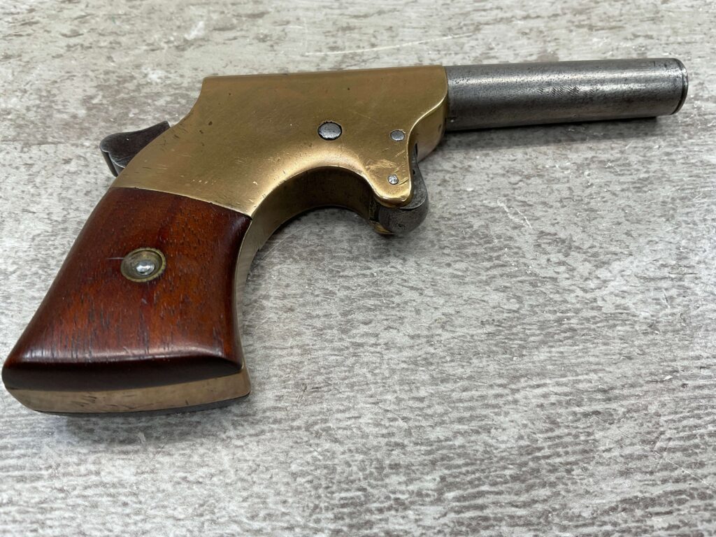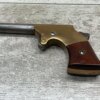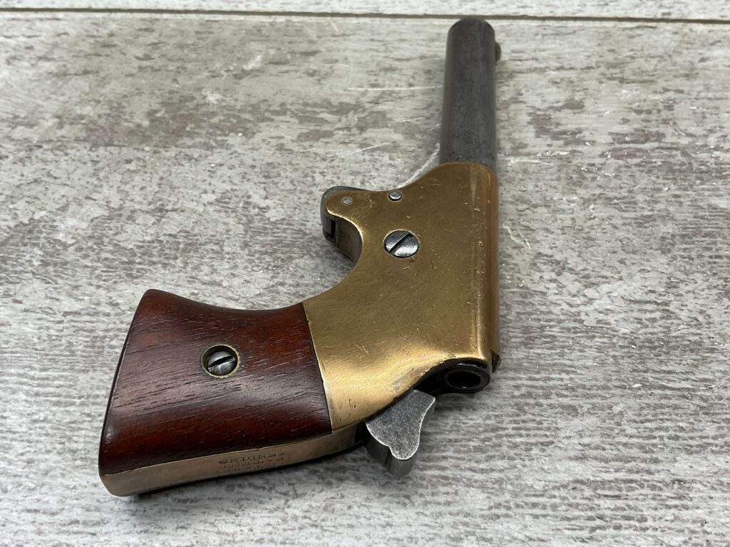 J.C. TERRY DERRINGER SINGLE SHOT POCKET PISTOL, .22 RIMFIRE, #243, 3 3/4″ ROUND BARREL WHICH IS WORN W/ LIGHT PITTING & GOOD RIFLING, “J.C. TERRY / PATENT / PENDING” STAMPED ON BACKSTRAP, EXC BRASS FRAME, EXC MATCHING SMOOTH ROSEWOOD GRIPS, “243” SERIAL ON FROM OF GRIP FRAME, BARREL UNSCREWS FROM THE FRAME, VERY COOL DESIGN, NOT A REPRODUCTION, OVERALL CONDITION AS SEEN IN PHOTOS