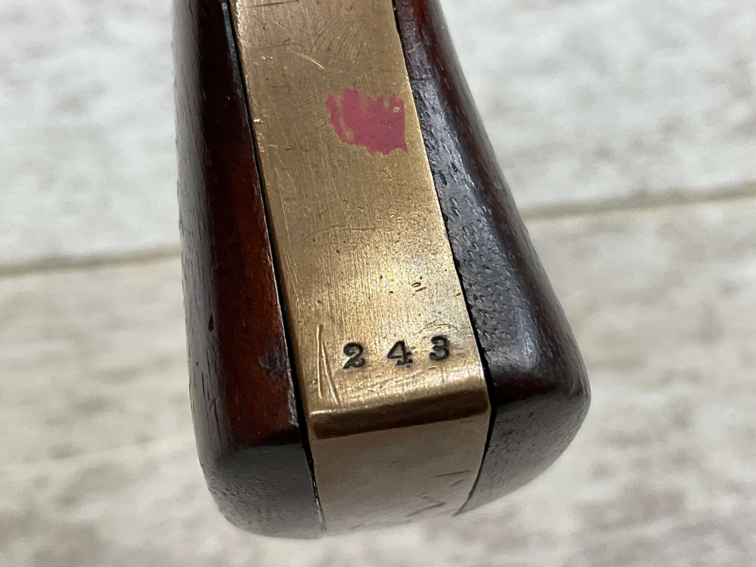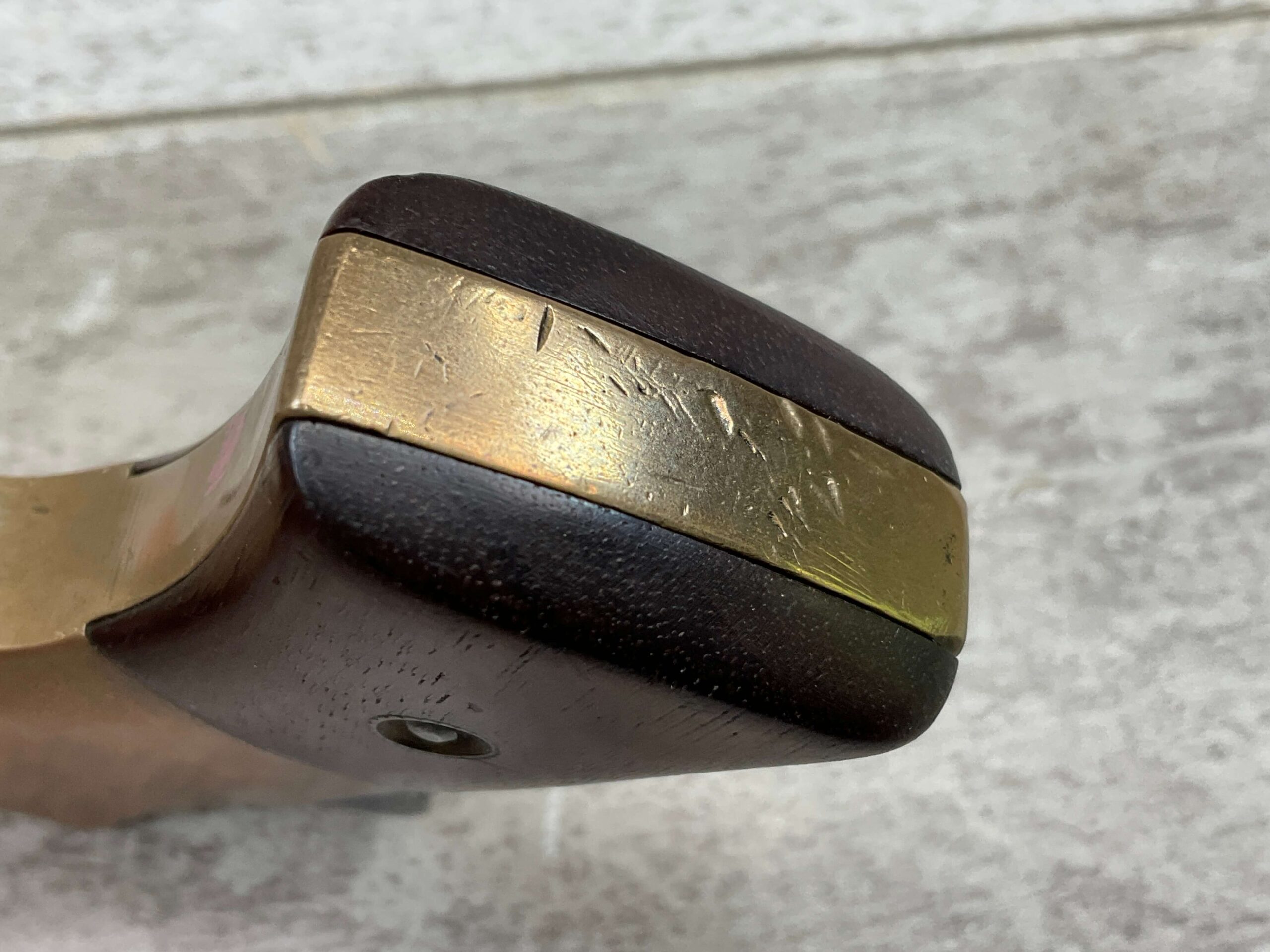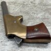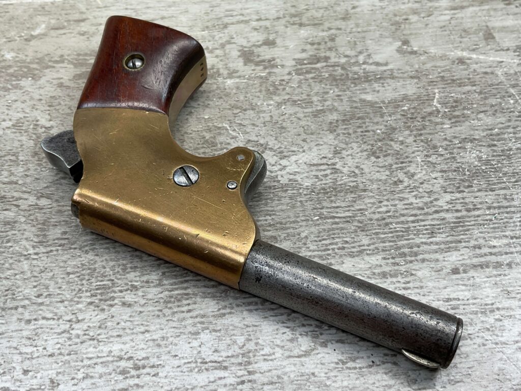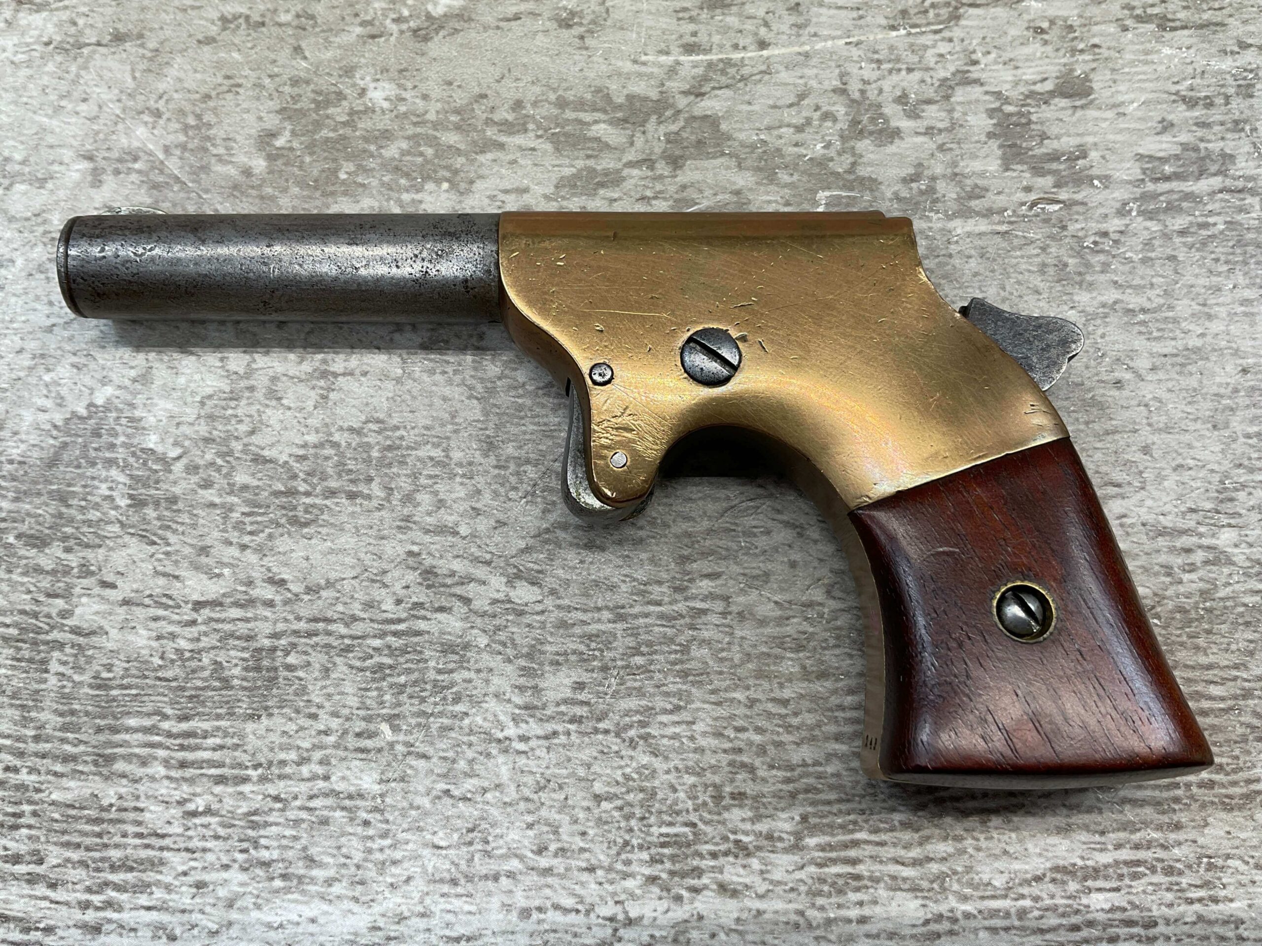 J.C. TERRY DERRINGER SINGLE SHOT POCKET PISTOL, .22 RIMFIRE, #243, 3 3/4″ ROUND BARREL WHICH IS WORN W/ LIGHT PITTING & GOOD RIFLING, “J.C. TERRY / PATENT / PENDING” STAMPED ON BACKSTRAP, EXC BRASS FRAME, EXC MATCHING SMOOTH ROSEWOOD GRIPS, “243” SERIAL ON FROM OF GRIP FRAME, BARREL UNSCREWS FROM THE FRAME, VERY COOL DESIGN, NOT A REPRODUCTION, OVERALL CONDITION AS SEEN IN PHOTOS