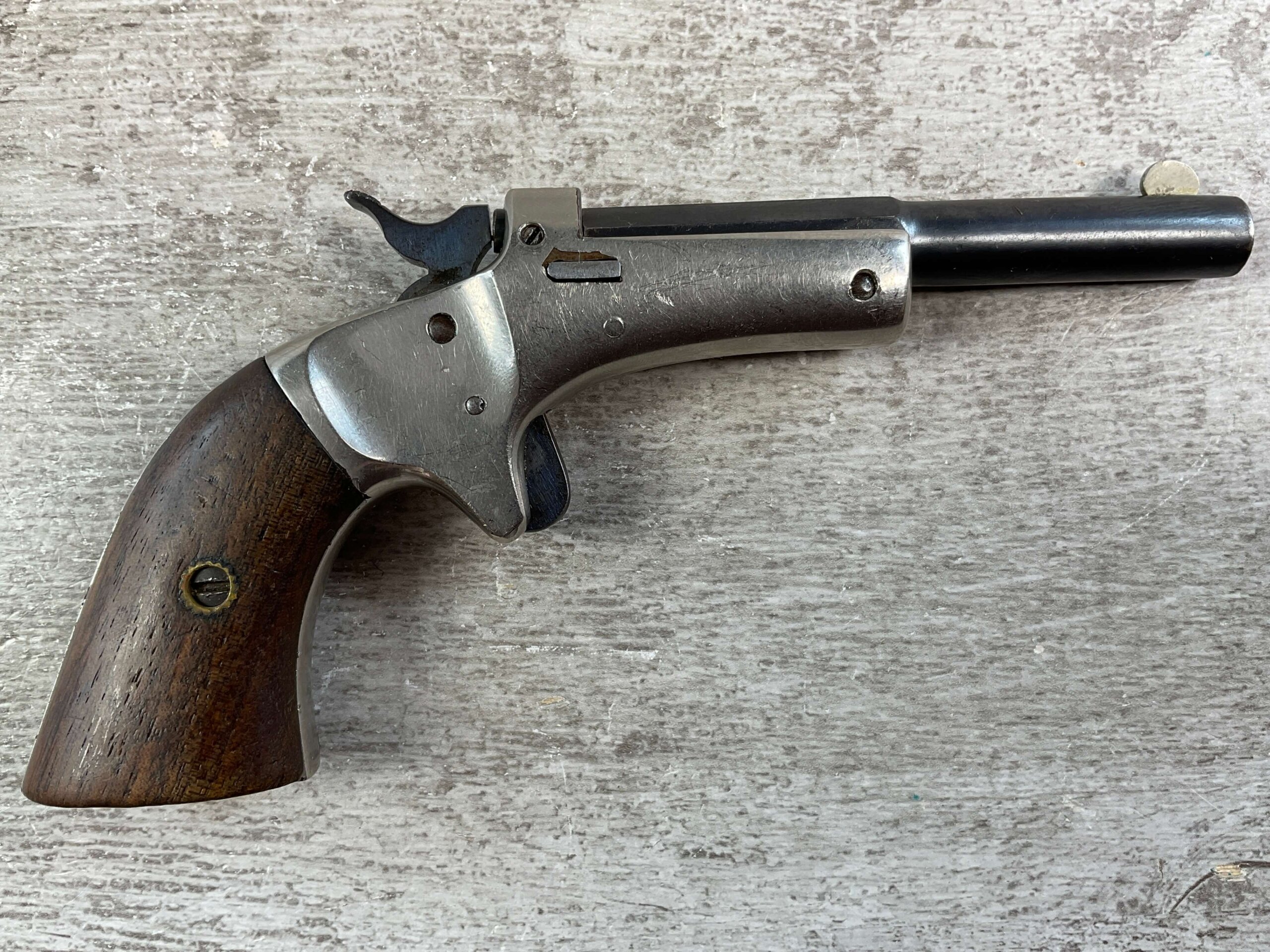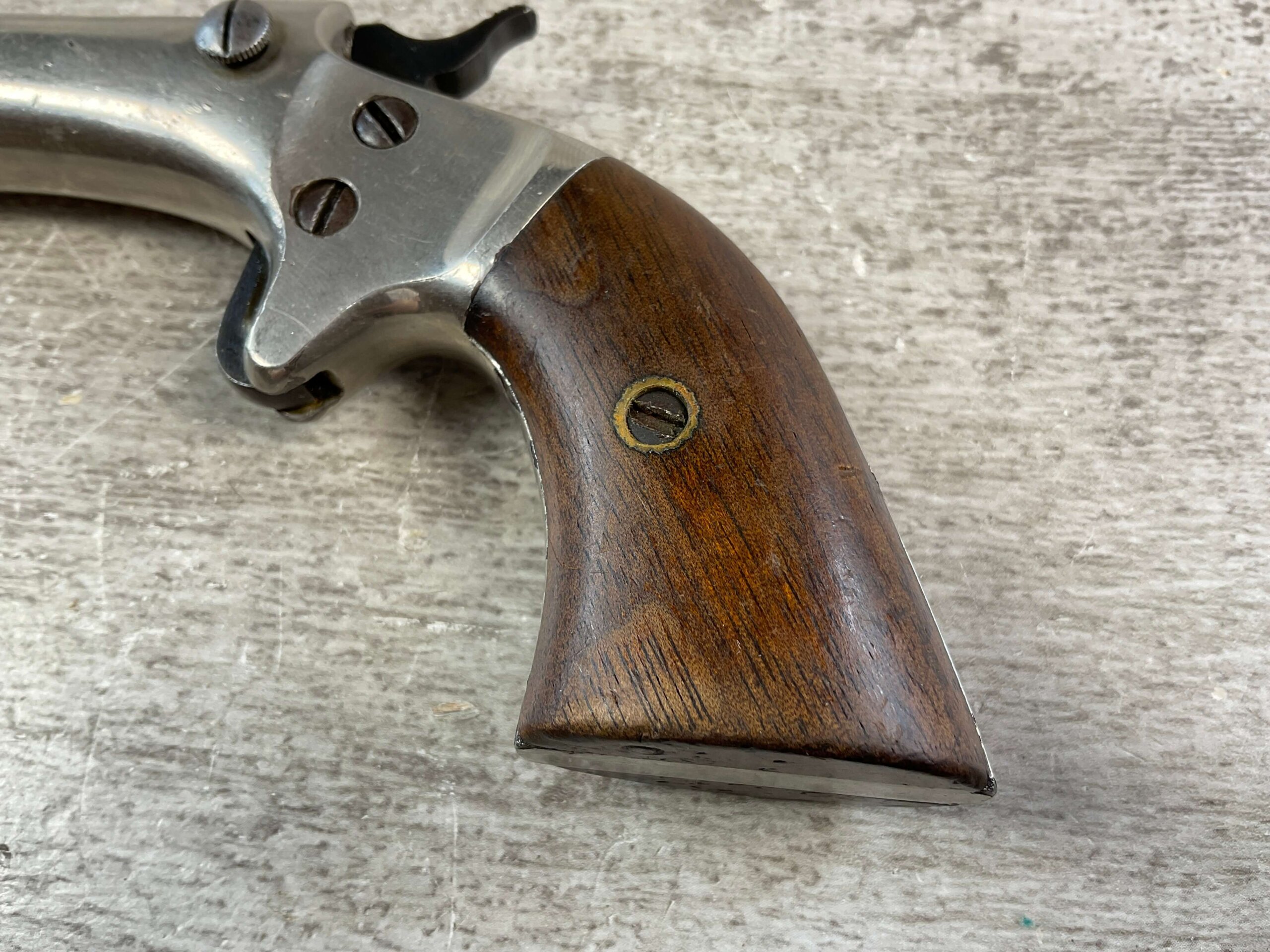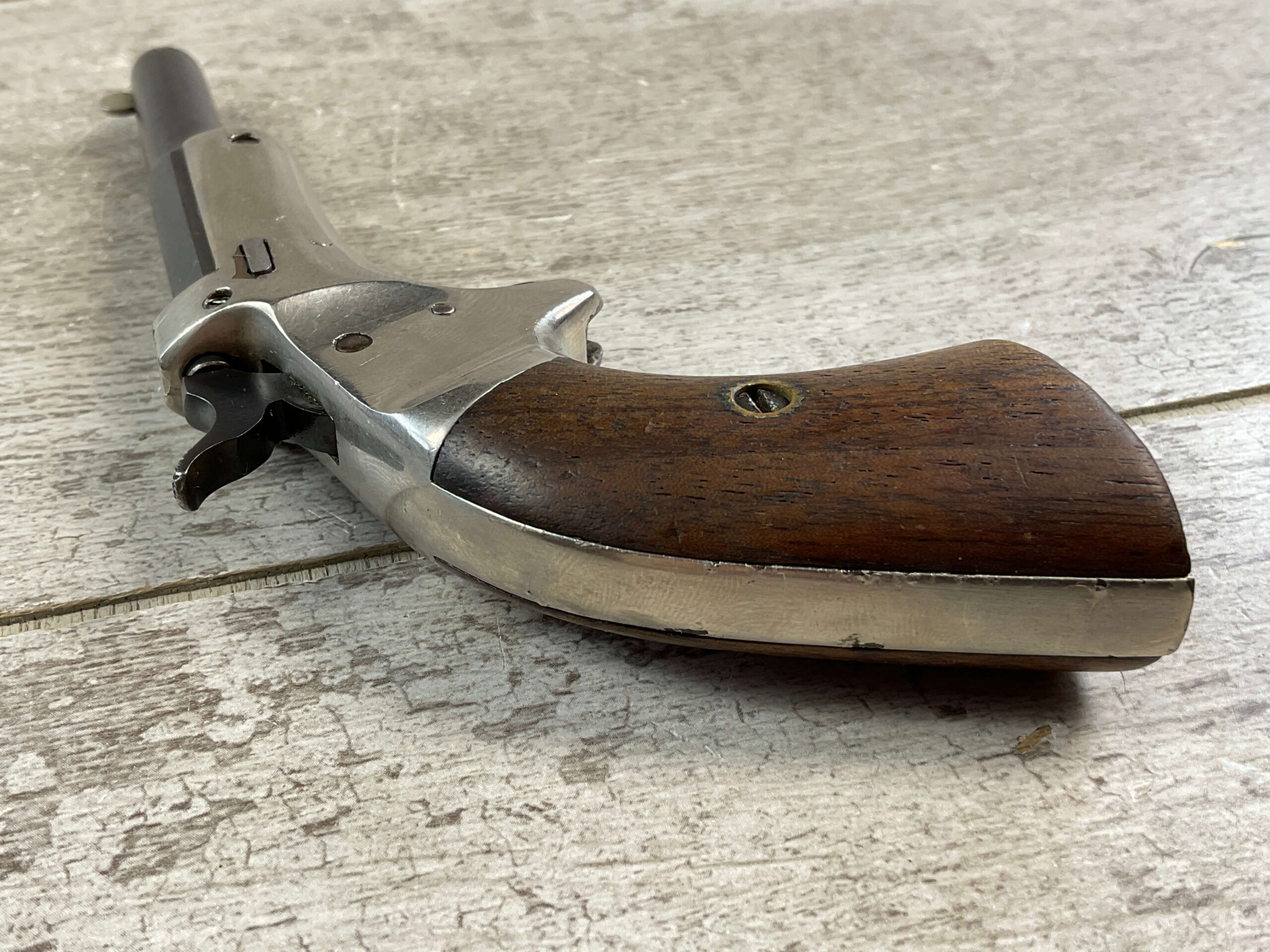 J. STEVENS MODEL 41 TIP UP .22LR SINGLE SHOT PISTOL, JAMES EARL JONES COLLECTION #77290, 3.5″ BARREL, EXC MIRROR BORE & RIFLING, VG-EXC ORIGINAL NICKEL FINISH W/ EXC MATCHING SMOOTH WALNUT GRIPS, EXTRACTOR, BLUED TRIGGER & HAMMER, MECHANICALLY EXCELLENT, CONDITION AS SHOWN IN PICTURES, FROM THE JAMES EARL JONES “FAVORITES” COLLECTION W/ CERTIFICATE OF AUTHENTICITY.