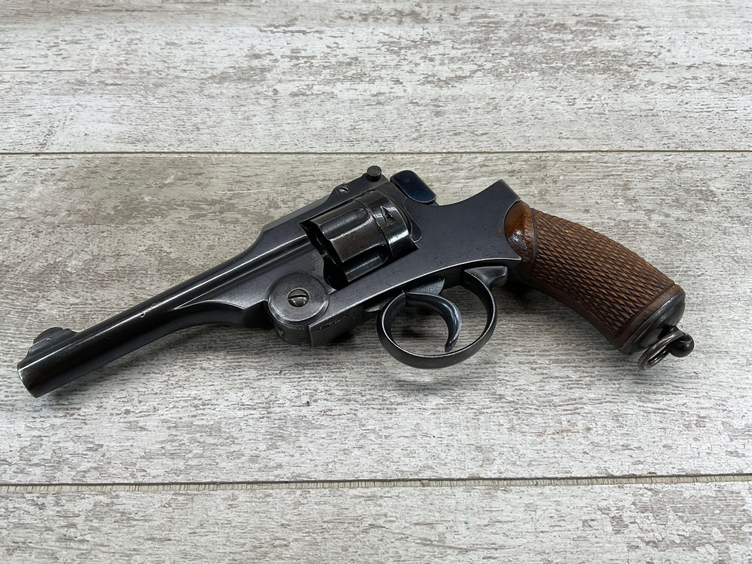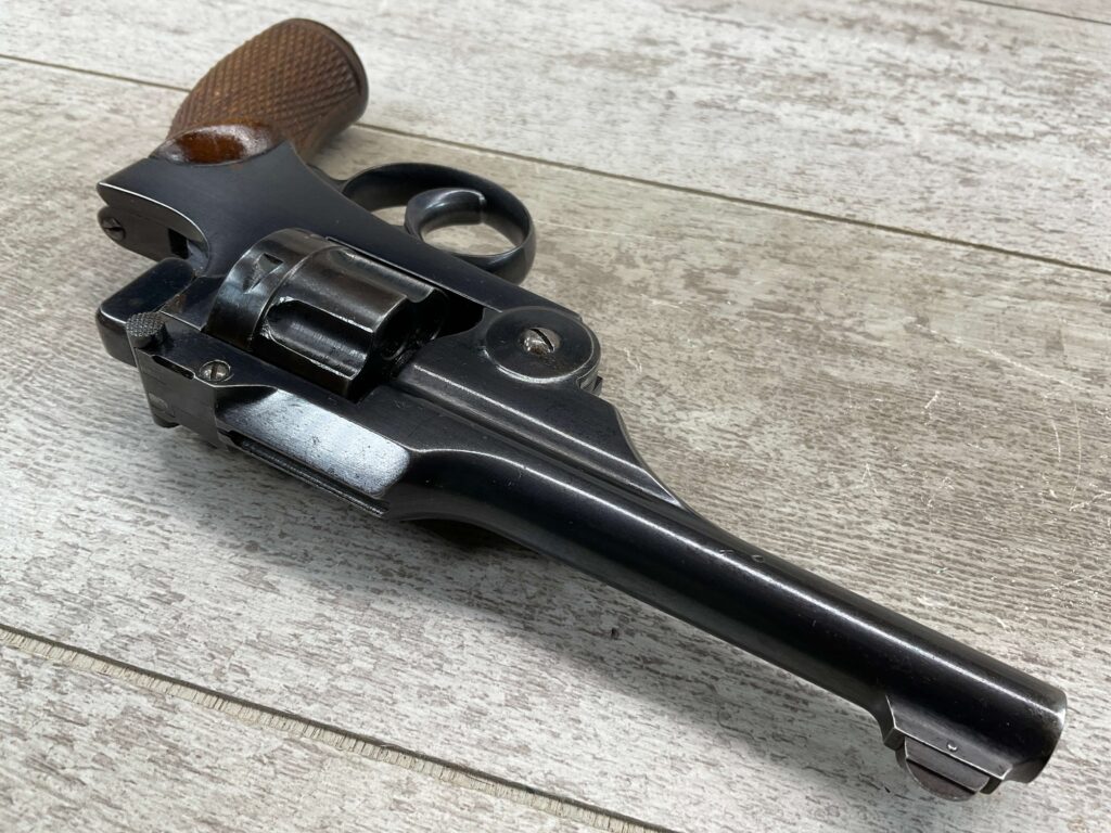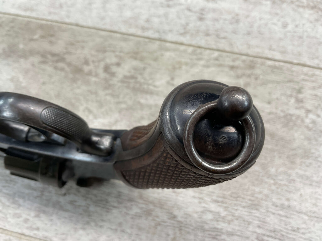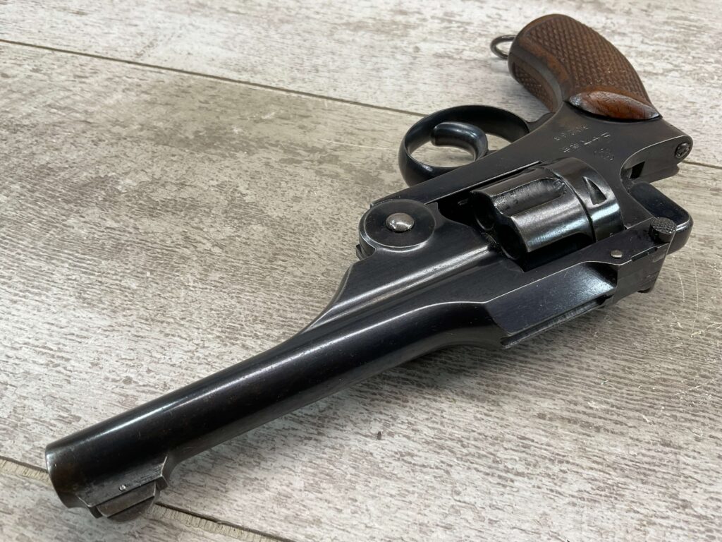 JAPANESE TYPE 26 9X22mmR REVOLVER #56265, 4 3/4″ BBL, EXC BRIGHT BORE & RIFLING, 9X22mmR, TOKYO ARTILLERY ARSENAL, PRE 1935, HAMMERLESS DESIGN, ORIGINAL BLUE FINISH W/SOME FINISH LOSS ON CYLINDER, EXC CHECKERED WOOD GRIPS, CYLINDER DOES NOT MATCH, DA DOUBLE ACTION ONLY TOP BREAK DESIGN, LANYARD LOOP, EXC OVERALL CONDITION