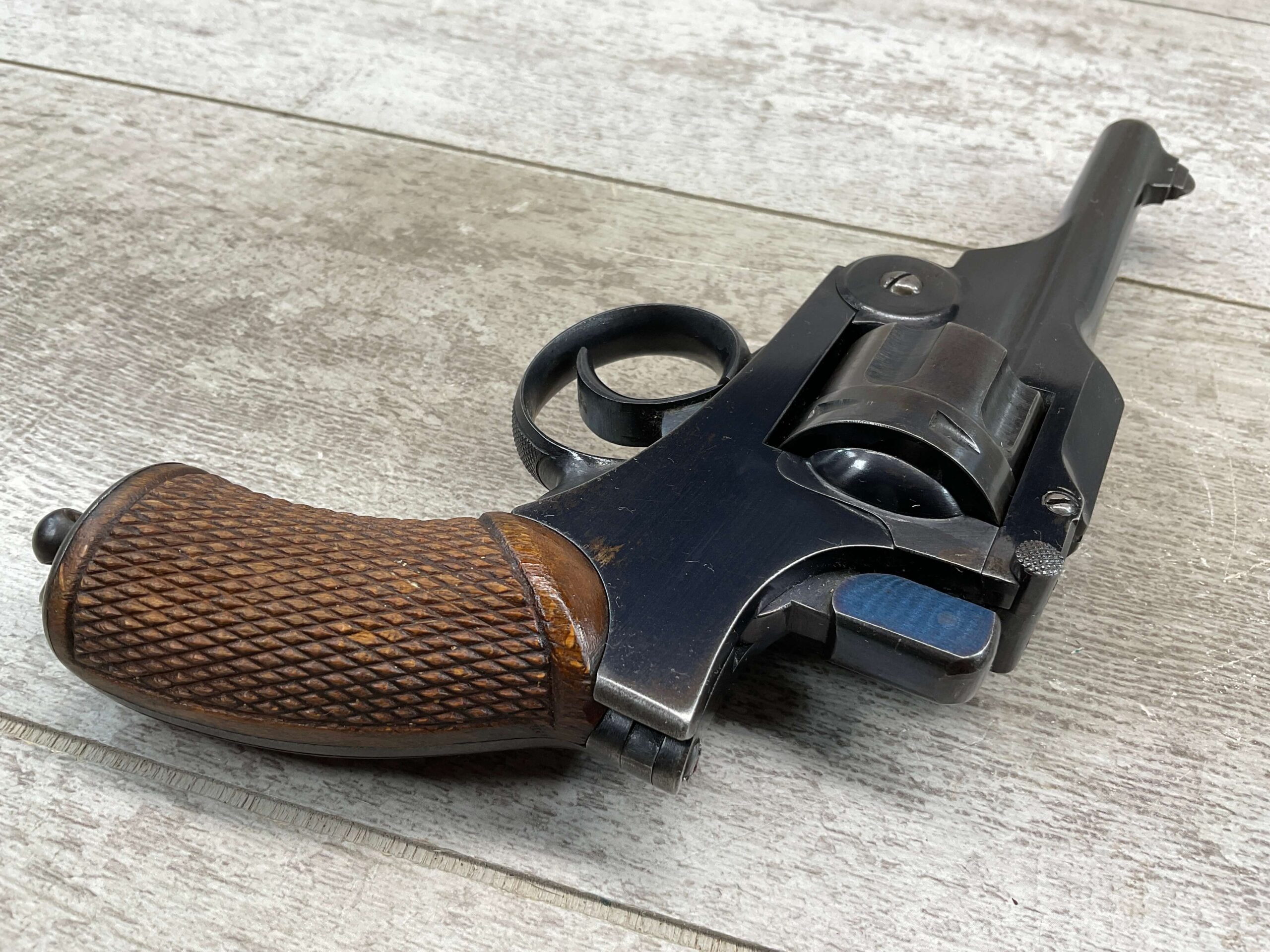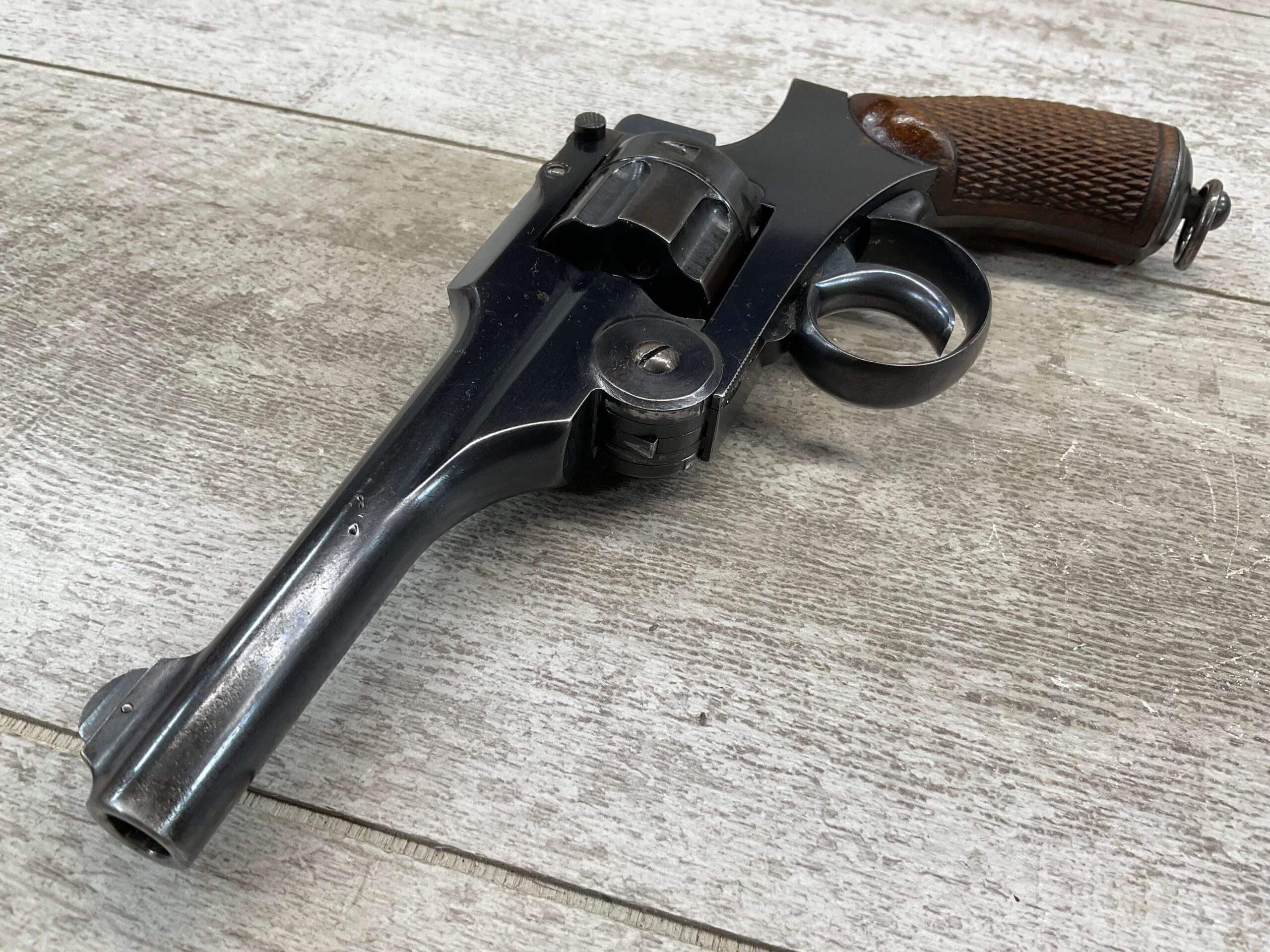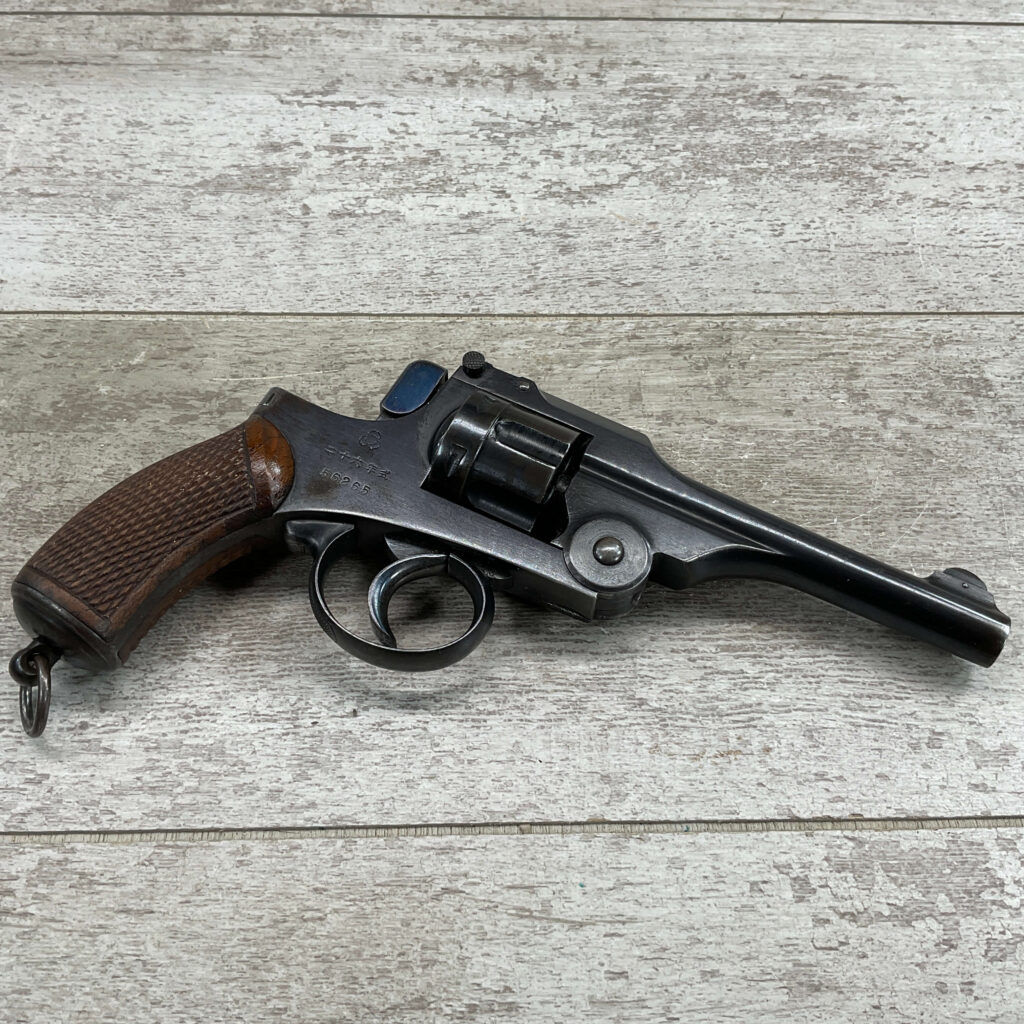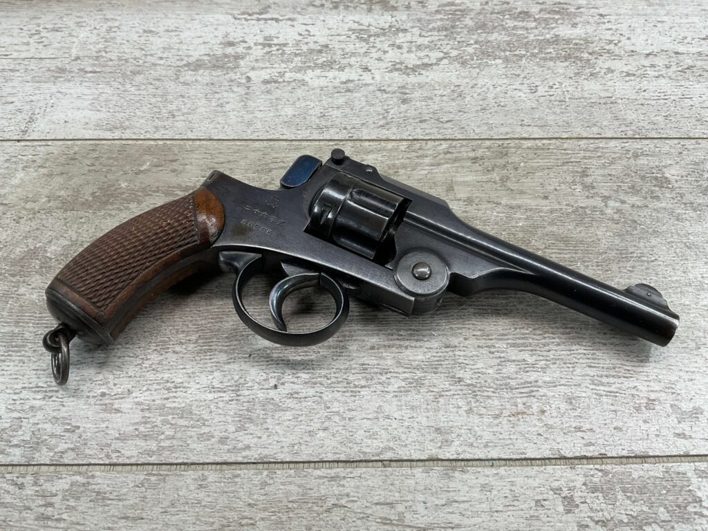 JAPANESE TYPE 26 9X22mmR REVOLVER #56265, 4 3/4″ BBL, EXC BRIGHT BORE & RIFLING, 9X22mmR, TOKYO ARTILLERY ARSENAL, PRE 1935, HAMMERLESS DESIGN, ORIGINAL BLUE FINISH W/SOME FINISH LOSS ON CYLINDER, EXC CHECKERED WOOD GRIPS, CYLINDER DOES NOT MATCH, DA DOUBLE ACTION ONLY TOP BREAK DESIGN, LANYARD LOOP, EXC OVERALL CONDITION