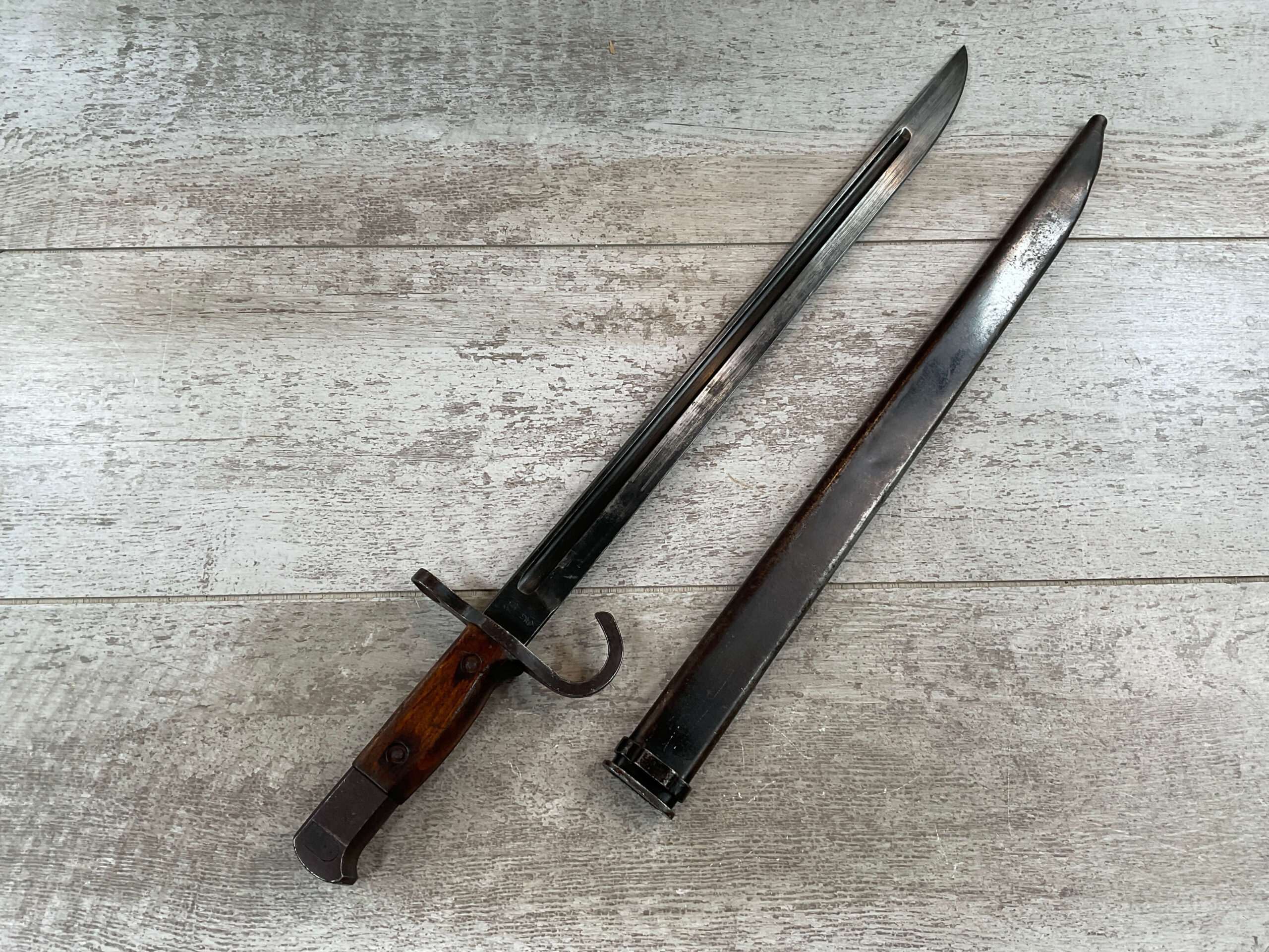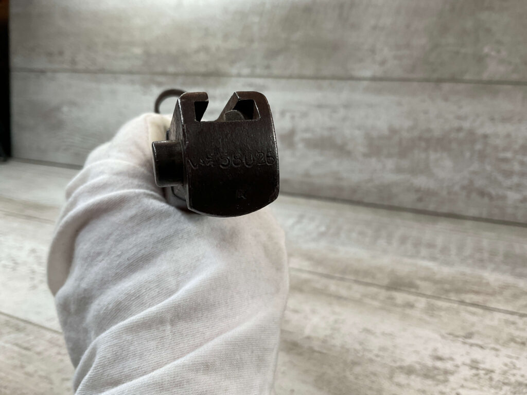 JAPANESE TYPE 30 BAYONET & METAL SCABBARD FOR ARASAKA RIFLE, VARIATION C, BACK OF PAMMEL STAMPED “58026” RICASSO STAMP INDICATES MFR BY KK MATSUSHITA KINZOKU (APPROX. MATSUSHITA METAL WORKING CORP.), BLADE LENGTH 15 5/8″, OVERALL LENGTH 20 1/8″, SIDES OF PAMMAL ARE FLAT, 2-PIECE WOOD GRIP, BLADE AND GRIPS IN GOOD CONDITION WITH WEAR MARKS FROM THE SCABBARD WOOD GRIPS SHOW WEAR FROM USE, SCABBARD IS IN GOOD CONDITION WITH NO DENTS, HIGH EDGE WEAR AND DISCOLORATION DARK BRONZE COLORATION, OVERALL THE SET IS IN GOOD/VERY GOOD CONDITION.