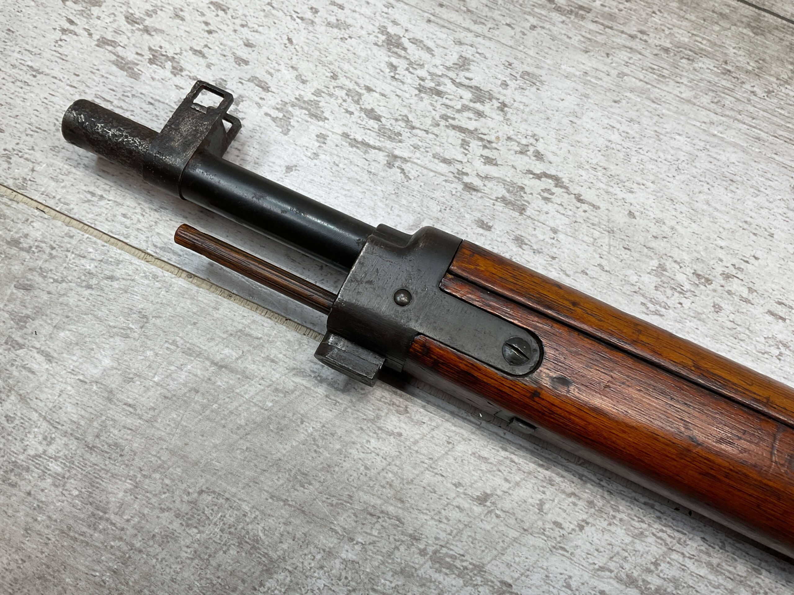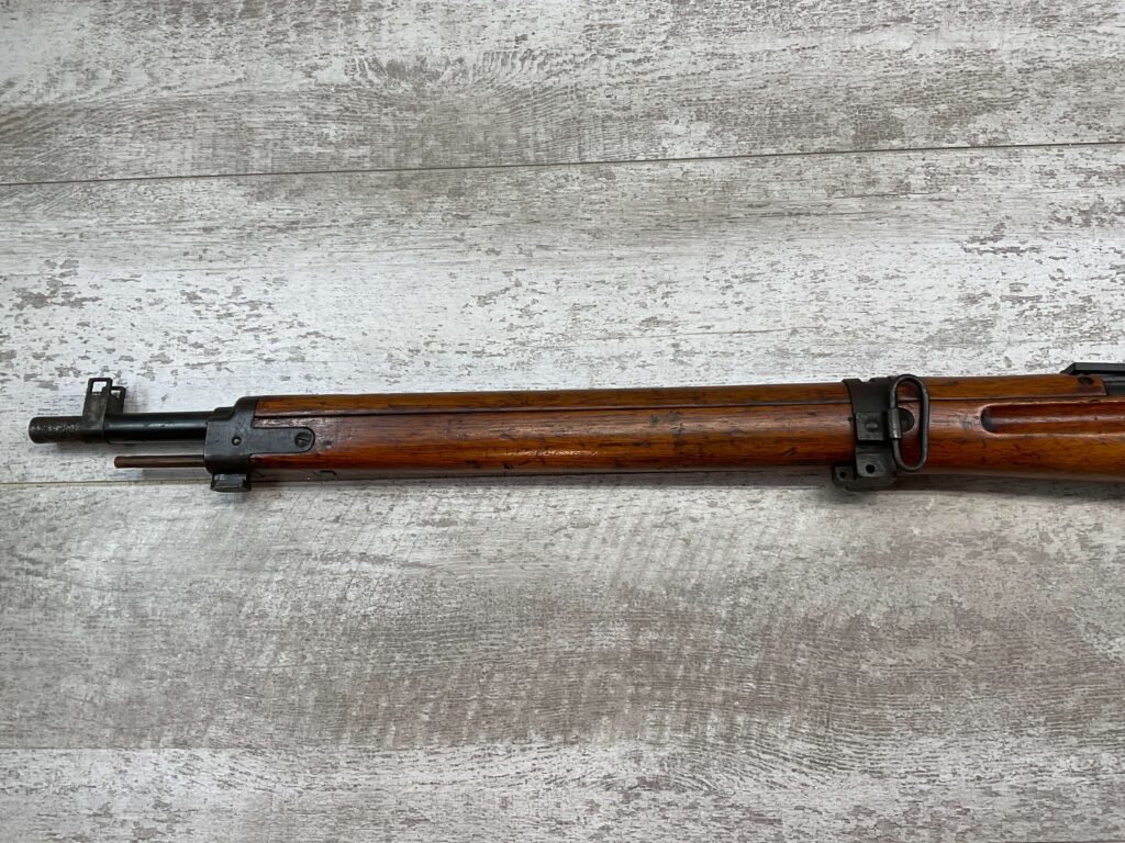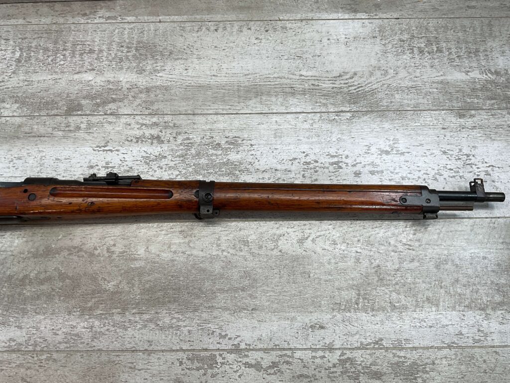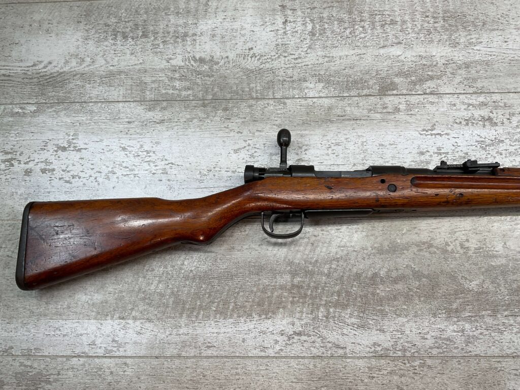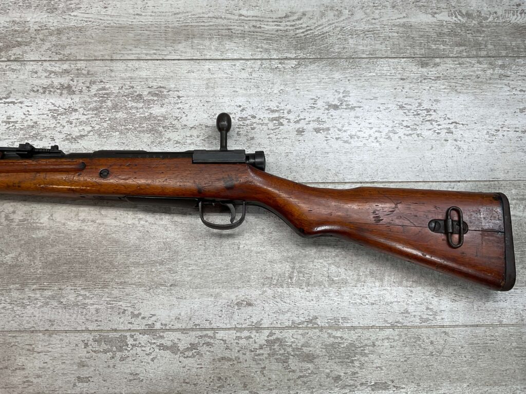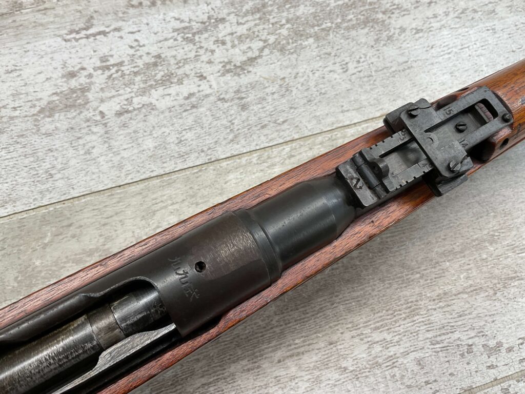 JAPANESE TYPE 99 7.7MM BOLT ACTION RIFLE #85121, 25.9″ BBL, LACKING AIRCRAFT WING CALIPERS ON REAR SIGHT, KOKURA ARSENAL SERIES 21, 90% BLUE, GOOD STOCK W/TYPICAL NICKS & DINGS, GROUND MUM, MATCHING BOLT, NO CLEANING ROD (WOODEN ROD INSERTED), NO DUST COVER, DEEP PITTING AROUND END OF MUZZLE, 85%+ OVERALL