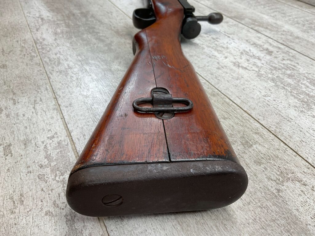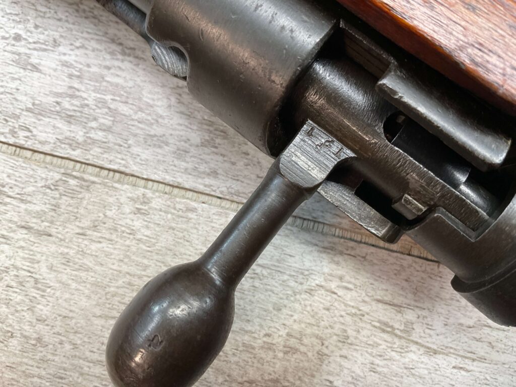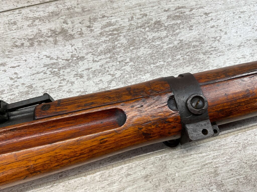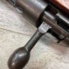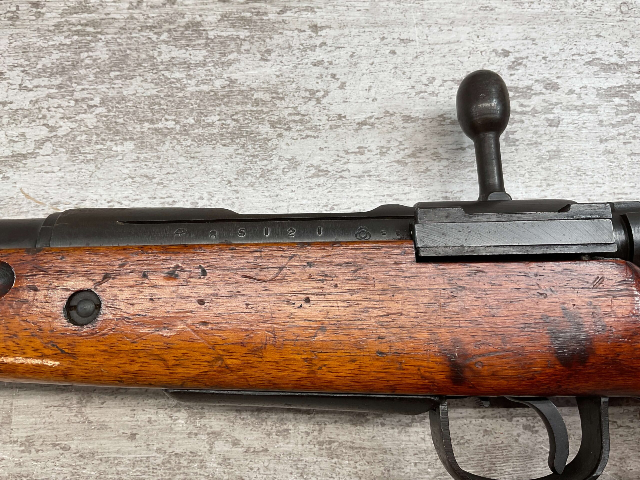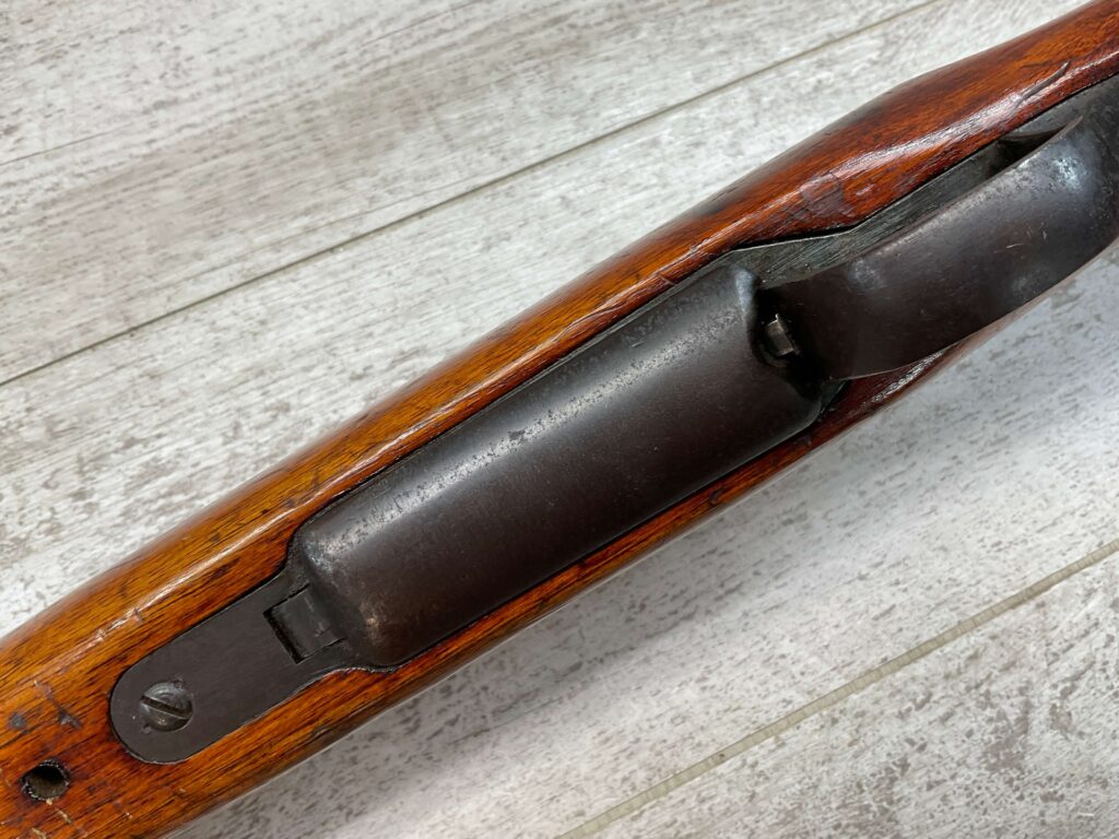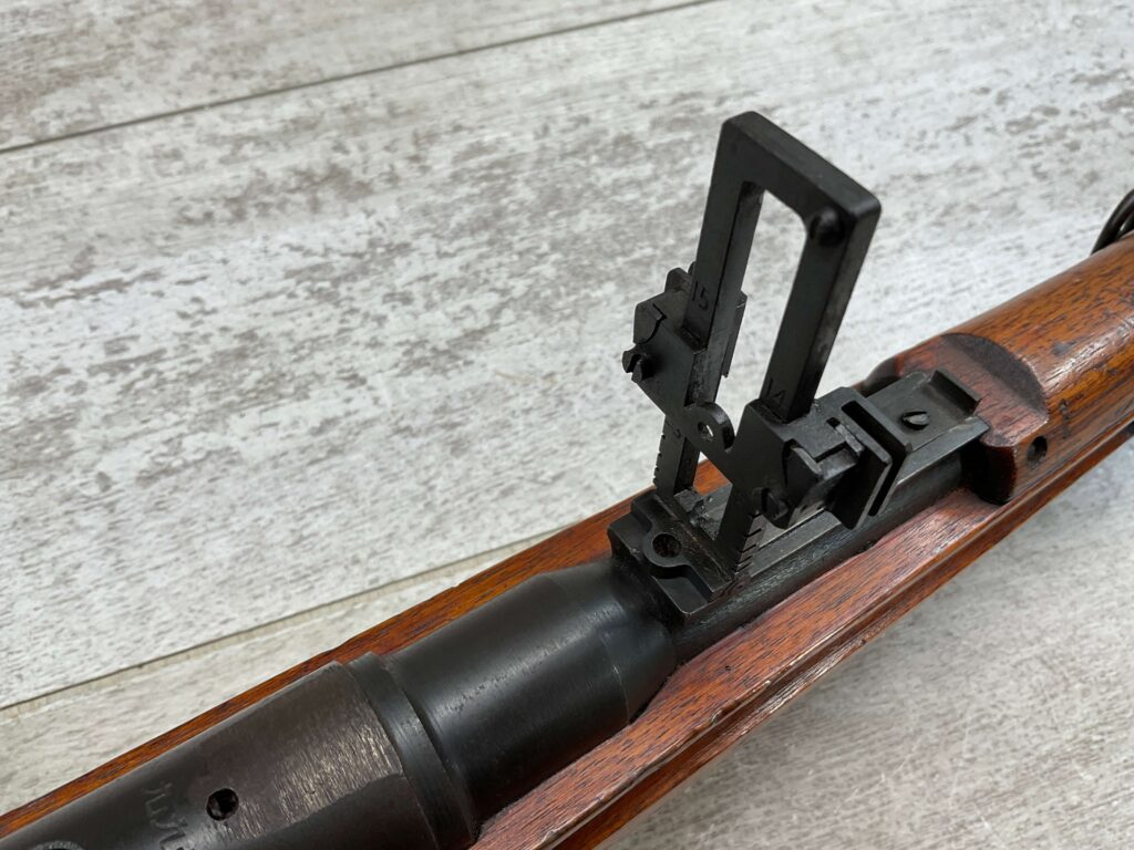 JAPANESE TYPE 99 7.7MM BOLT ACTION RIFLE #85121, 25.9″ BBL, LACKING AIRCRAFT WING CALIPERS ON REAR SIGHT, KOKURA ARSENAL SERIES 21, 90% BLUE, GOOD STOCK W/TYPICAL NICKS & DINGS, GROUND MUM, MATCHING BOLT, NO CLEANING ROD (WOODEN ROD INSERTED), NO DUST COVER, DEEP PITTING AROUND END OF MUZZLE, 85%+ OVERALL