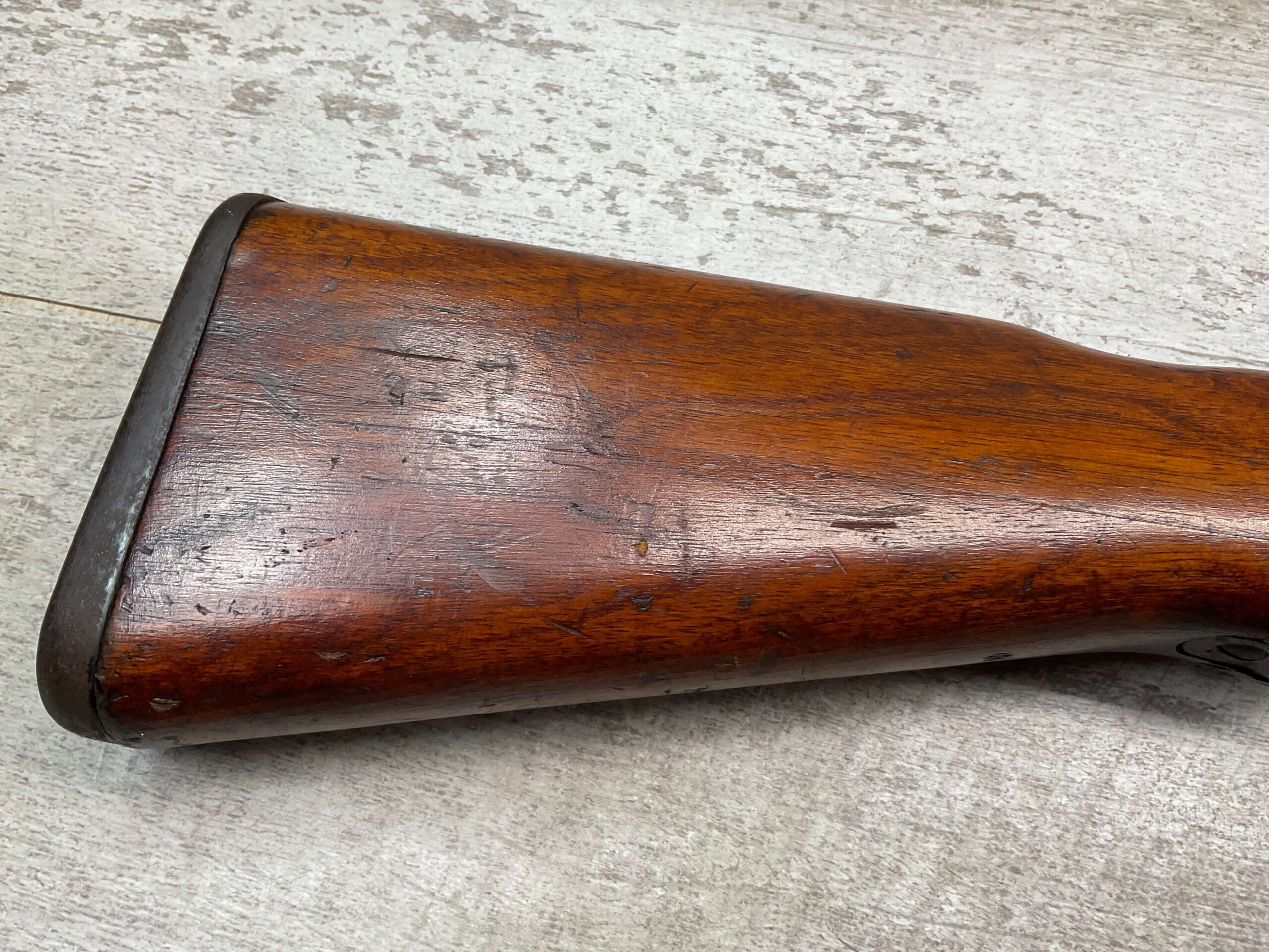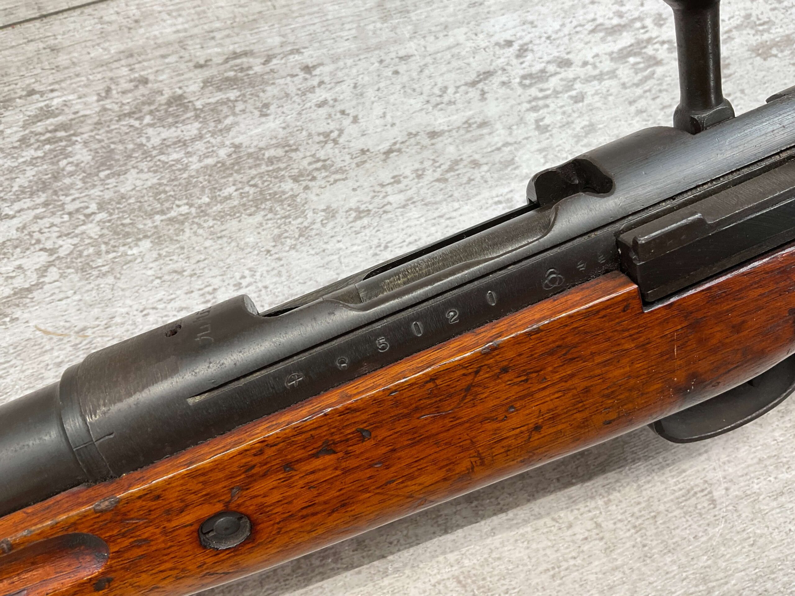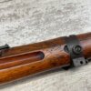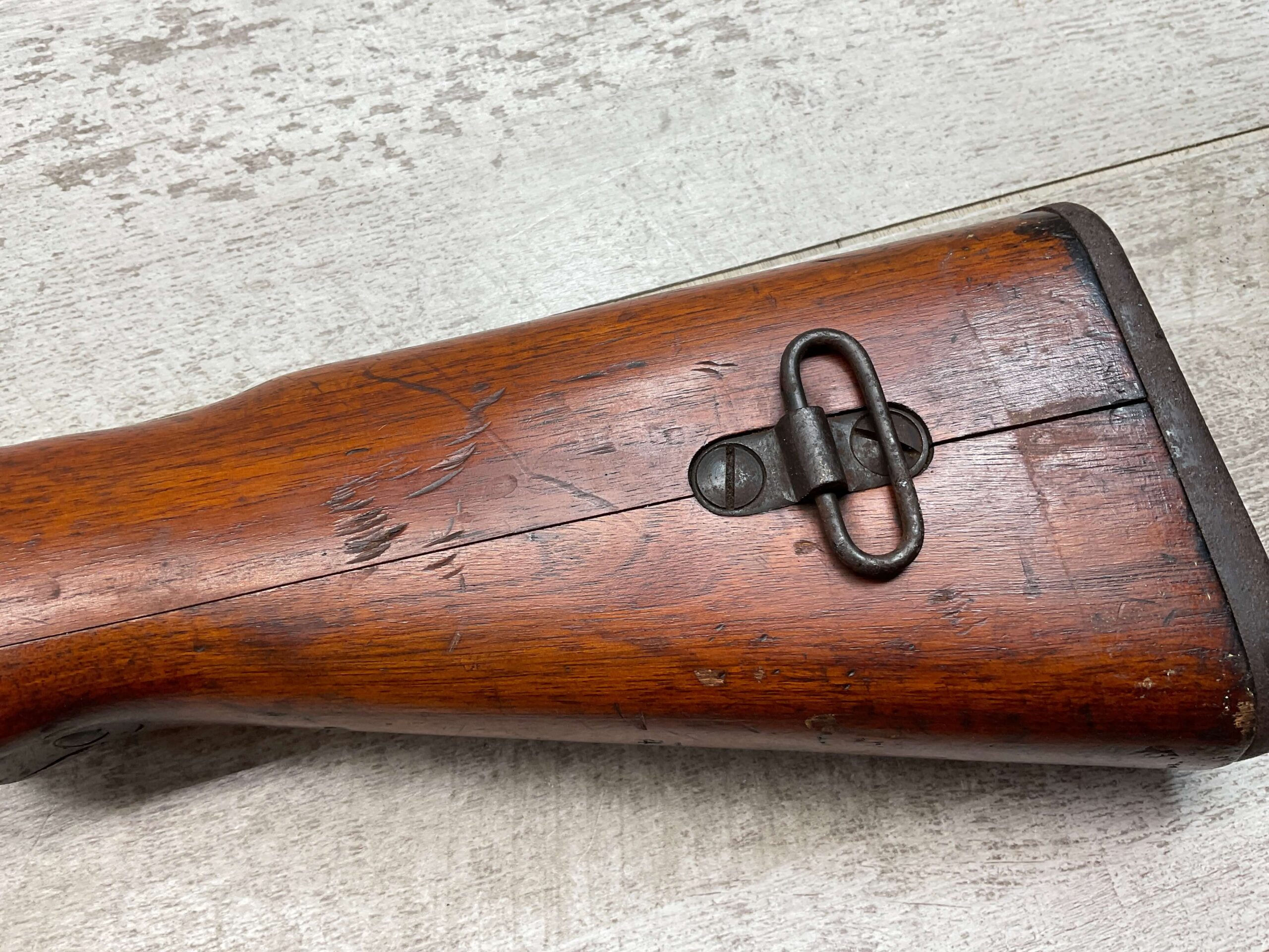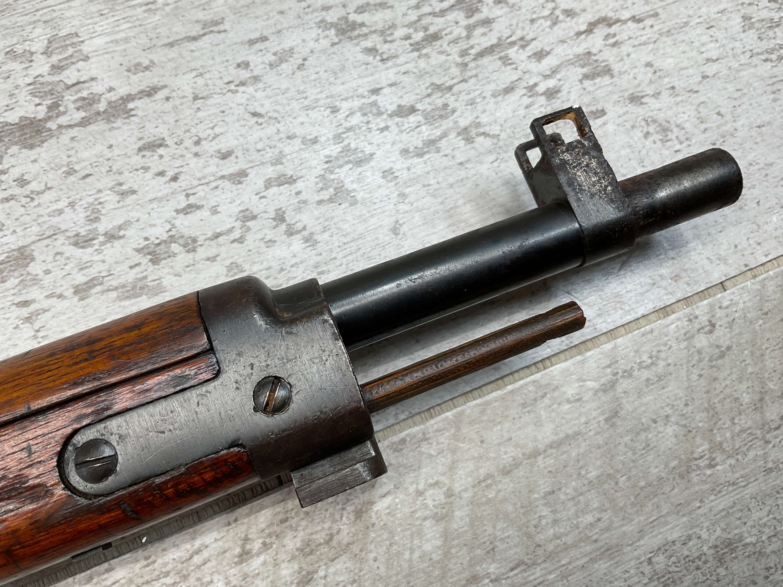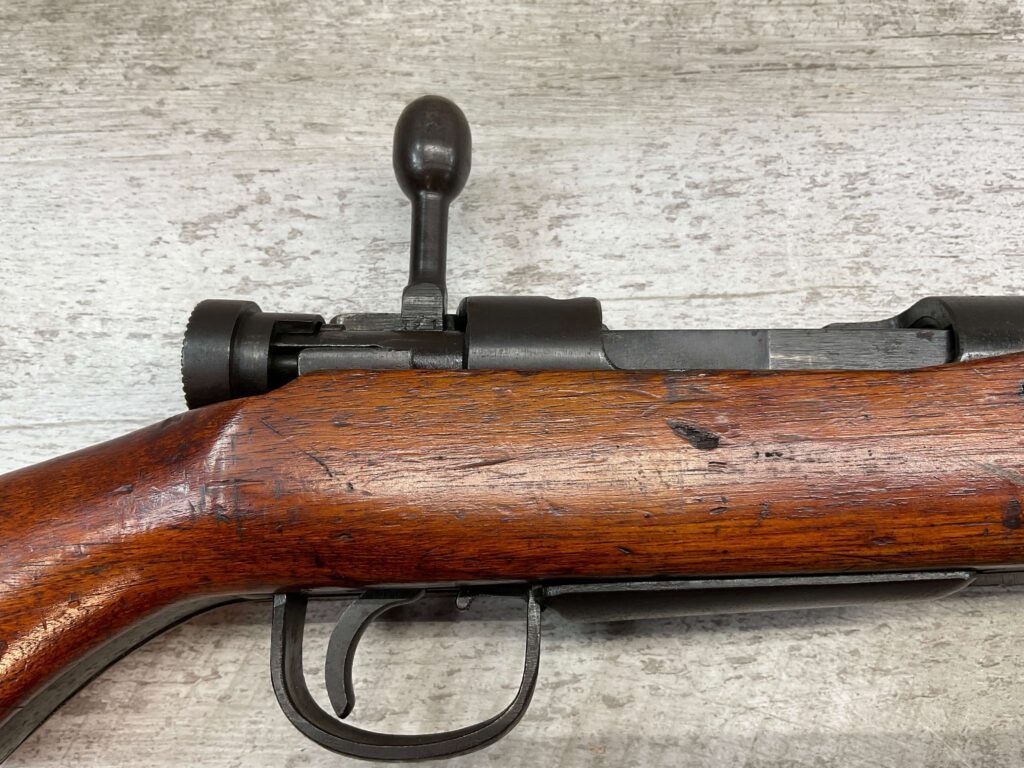 JAPANESE TYPE 99 7.7MM BOLT ACTION RIFLE #85121, 25.9″ BBL, LACKING AIRCRAFT WING CALIPERS ON REAR SIGHT, KOKURA ARSENAL SERIES 21, 90% BLUE, GOOD STOCK W/TYPICAL NICKS & DINGS, GROUND MUM, MATCHING BOLT, NO CLEANING ROD (WOODEN ROD INSERTED), NO DUST COVER, DEEP PITTING AROUND END OF MUZZLE, 85%+ OVERALL