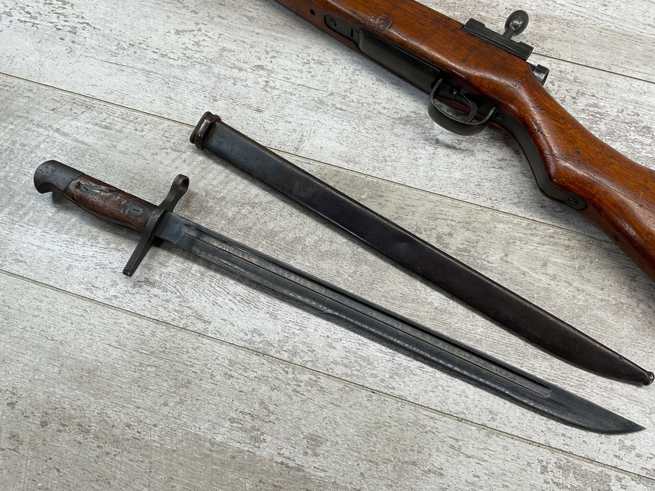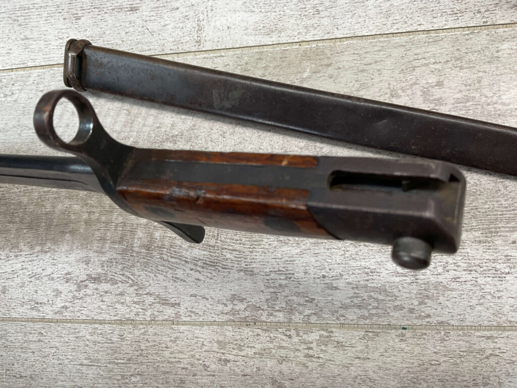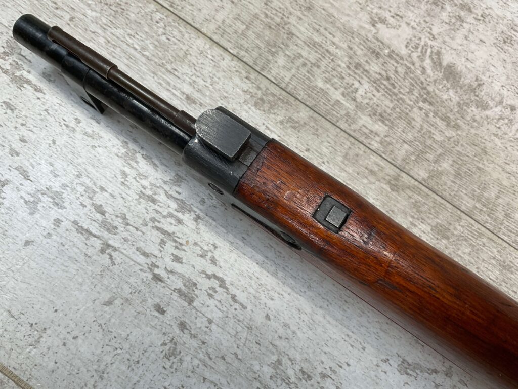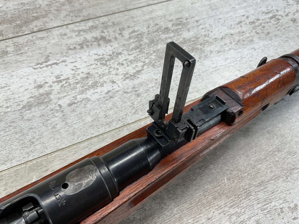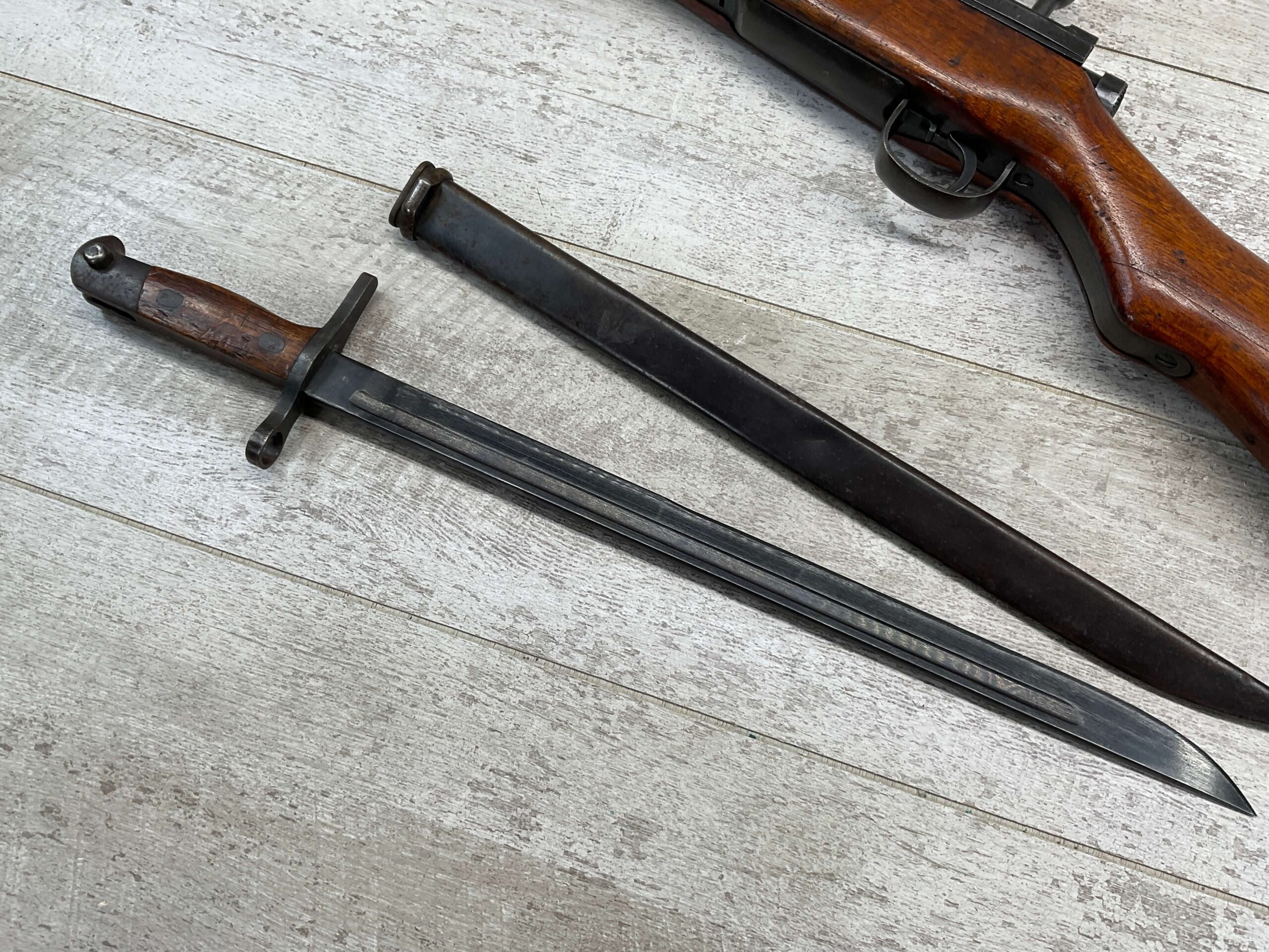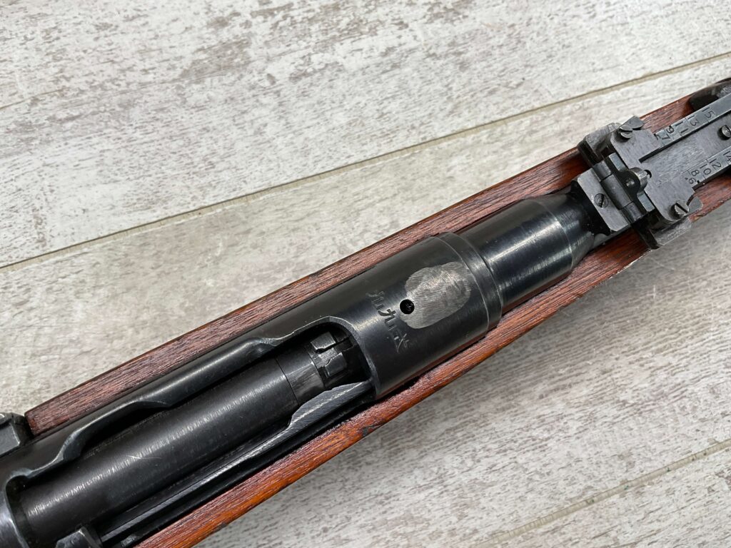JAPANESE TYPE 99 7.7MM BOLT ACTION RIFLE #83725, 25.9″ BBL, LACKING AIRCRAFT WING CALIPERS ON REAR SIGHT, KOKURA ARSENAL SERIES 21, 90% BLUE, GOOD STOCK W/TYPICAL NICKS & DINGS, GROUND MUM, MATCHING BOLT, CLEANING ROD, NO DUST COVER, ORIGINAL BAYONET & SCABBARD, MIRROR BORE W/EXC RIFLING, 85%+ OVERALL