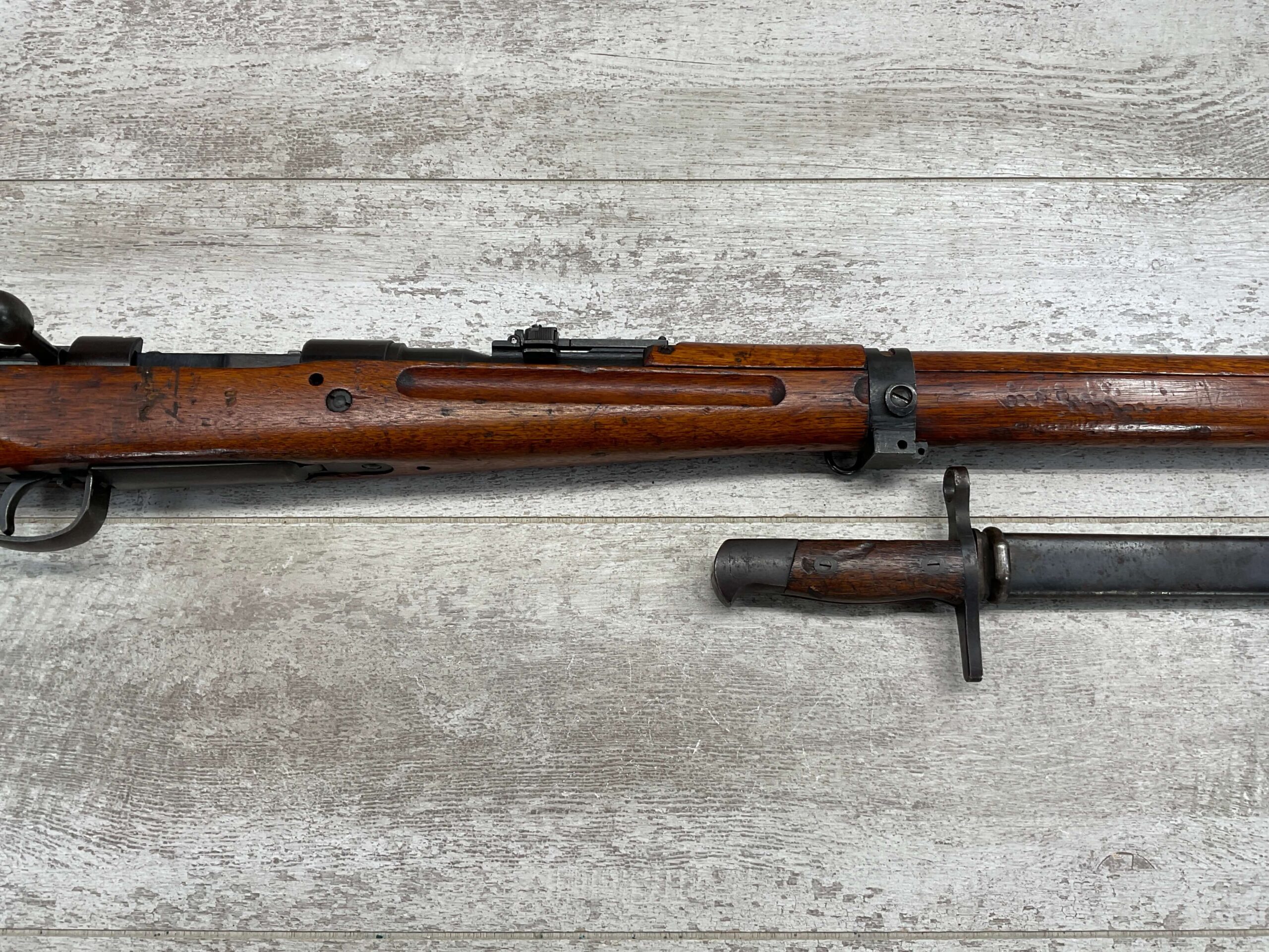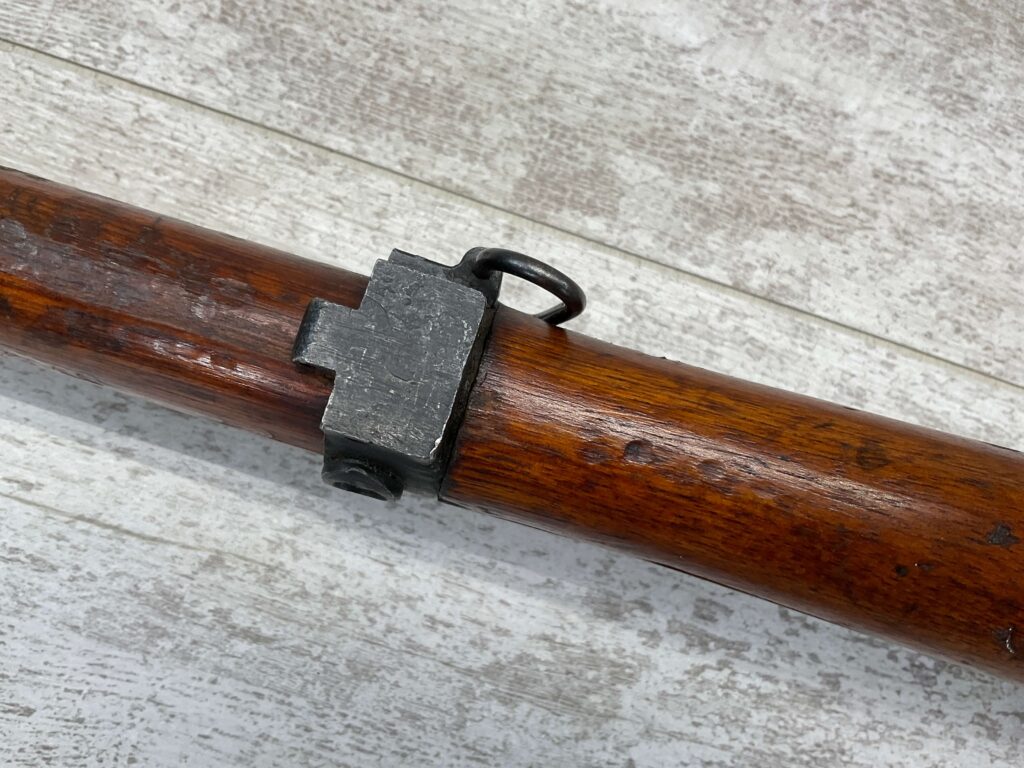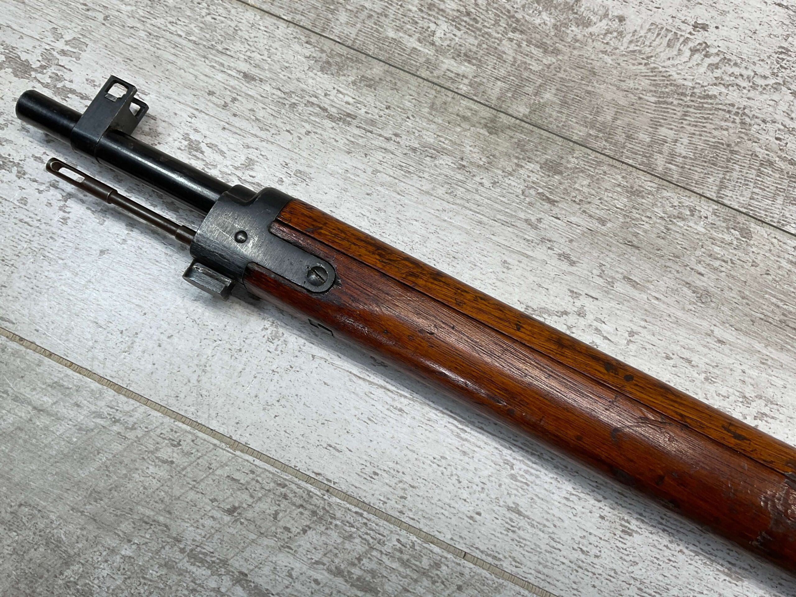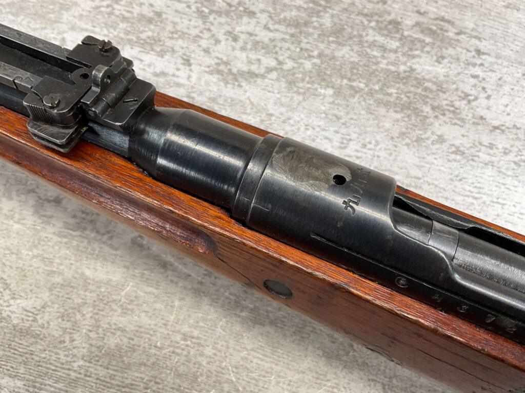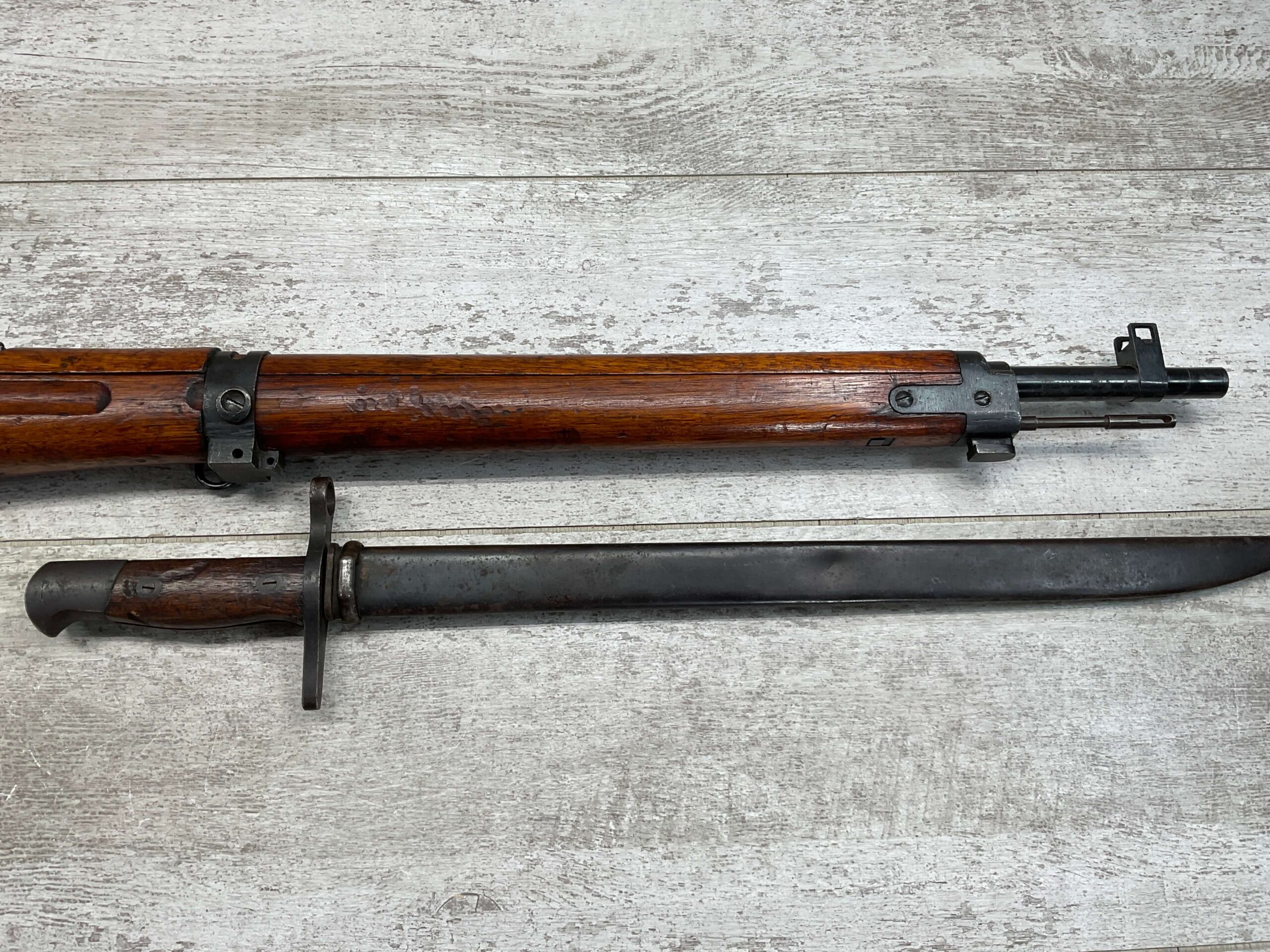 JAPANESE TYPE 99 7.7MM BOLT ACTION RIFLE #83725, 25.9″ BBL, LACKING AIRCRAFT WING CALIPERS ON REAR SIGHT, KOKURA ARSENAL SERIES 21, 90% BLUE, GOOD STOCK W/TYPICAL NICKS & DINGS, GROUND MUM, MATCHING BOLT, CLEANING ROD, NO DUST COVER, ORIGINAL BAYONET & SCABBARD, MIRROR BORE W/EXC RIFLING, 85%+ OVERALL