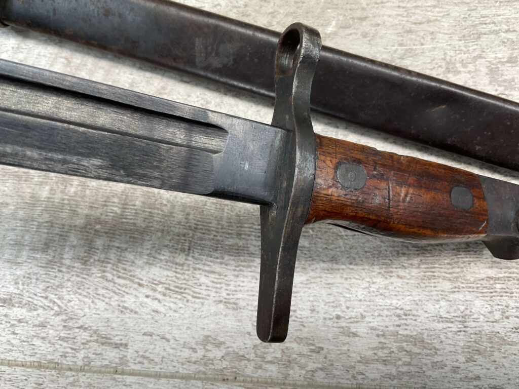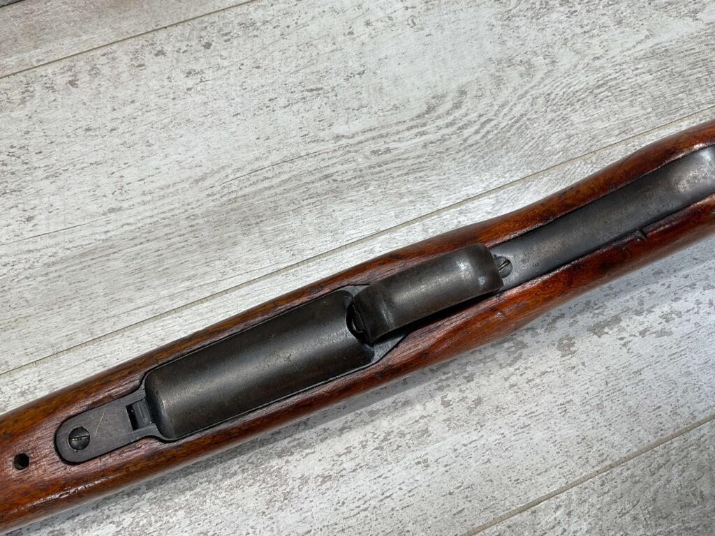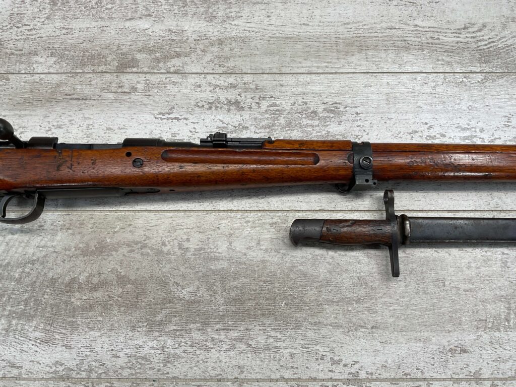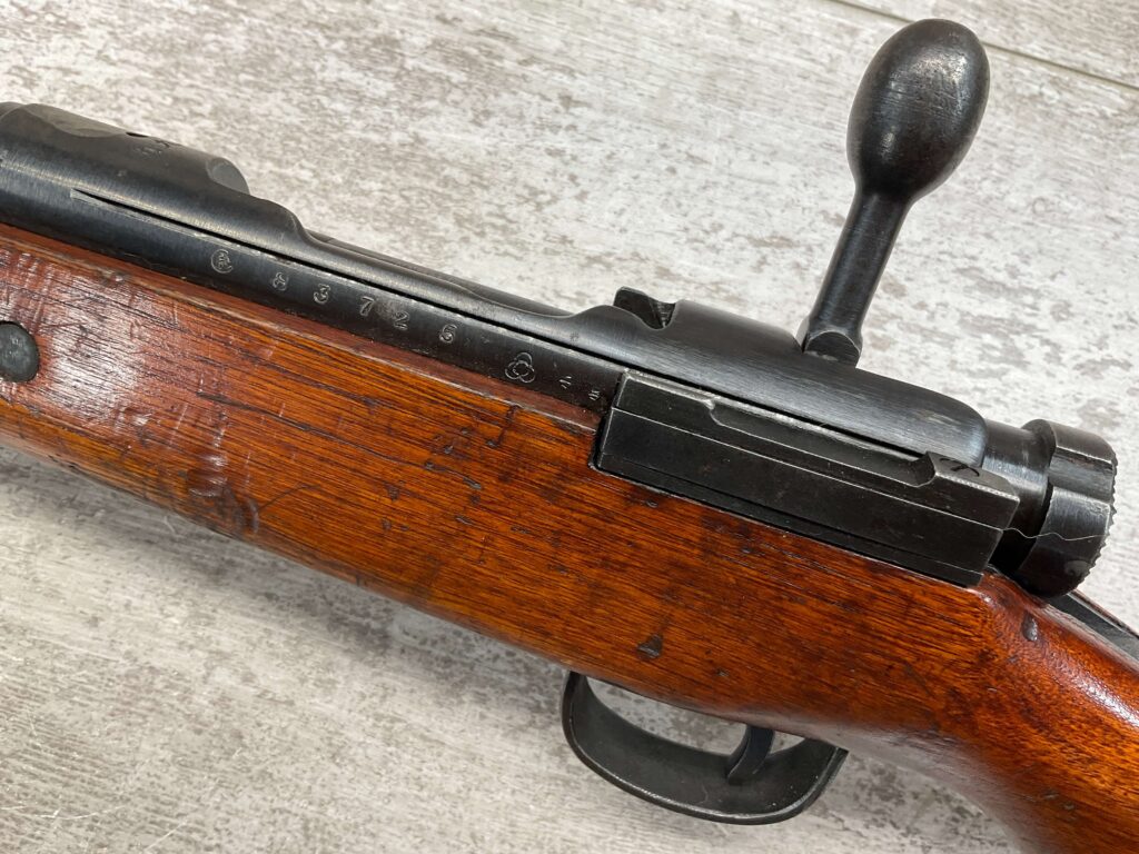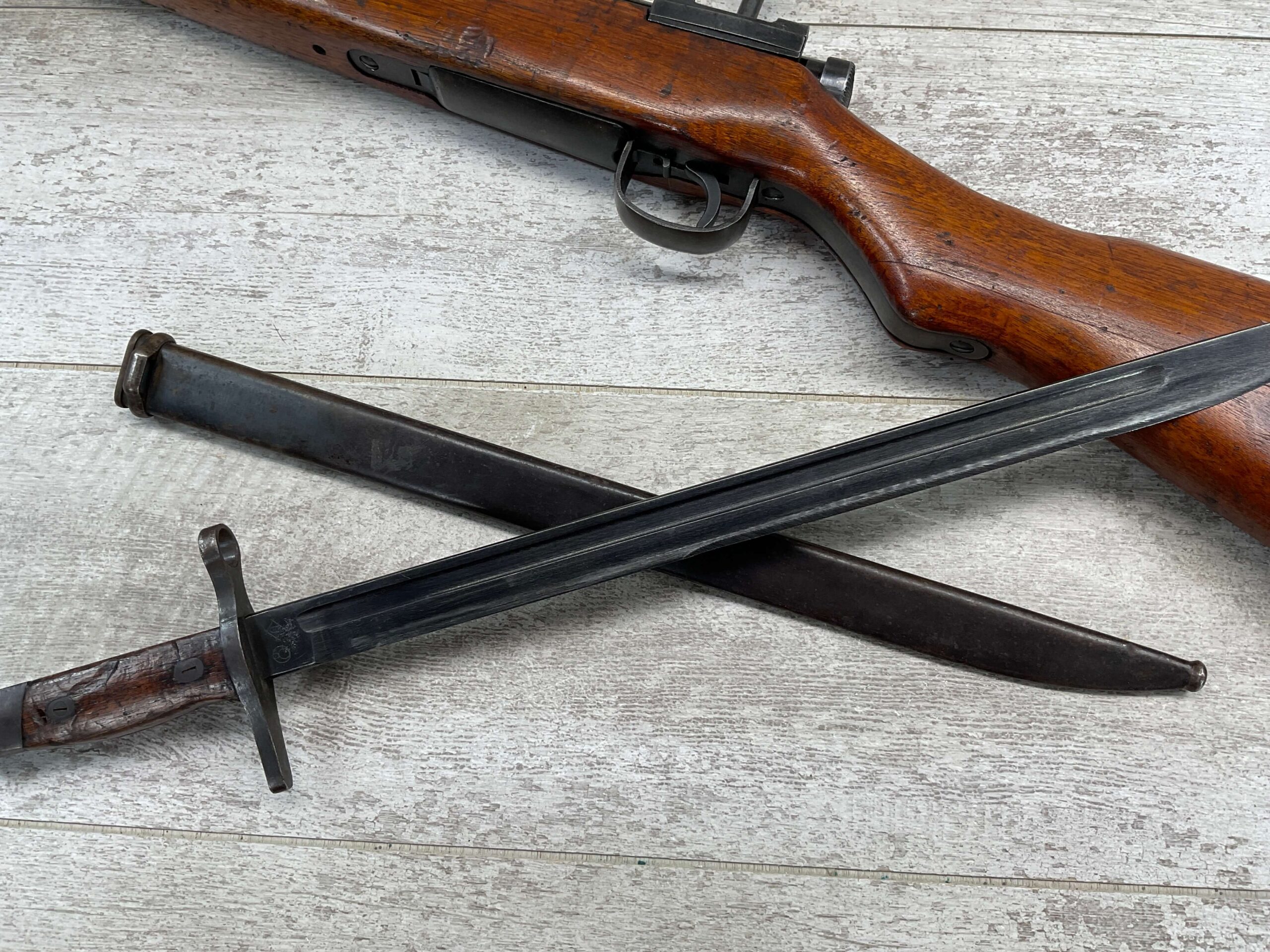 JAPANESE TYPE 99 7.7MM BOLT ACTION RIFLE #83725, 25.9″ BBL, LACKING AIRCRAFT WING CALIPERS ON REAR SIGHT, KOKURA ARSENAL SERIES 21, 90% BLUE, GOOD STOCK W/TYPICAL NICKS & DINGS, GROUND MUM, MATCHING BOLT, CLEANING ROD, NO DUST COVER, ORIGINAL BAYONET & SCABBARD, MIRROR BORE W/EXC RIFLING, 85%+ OVERALL
