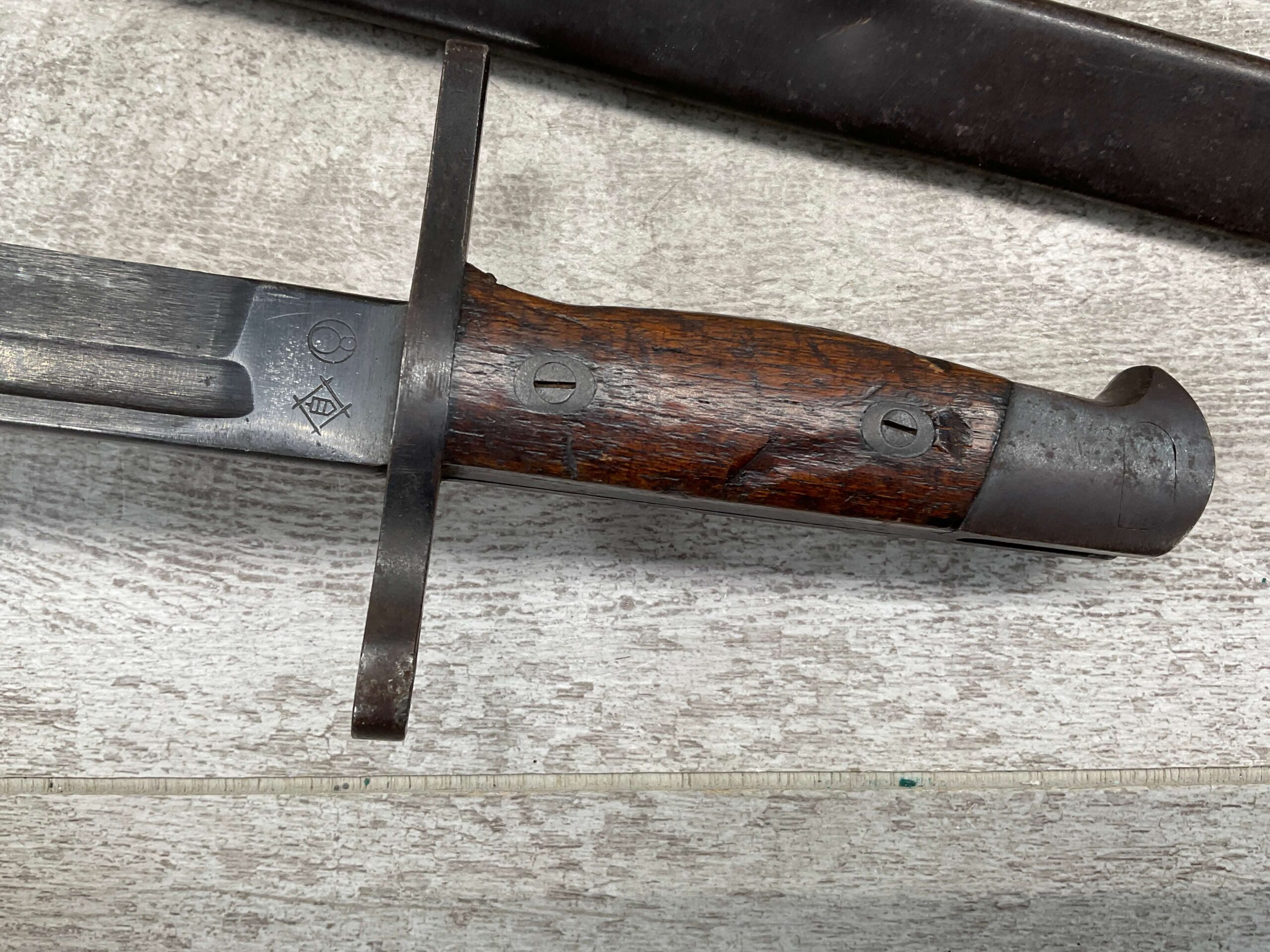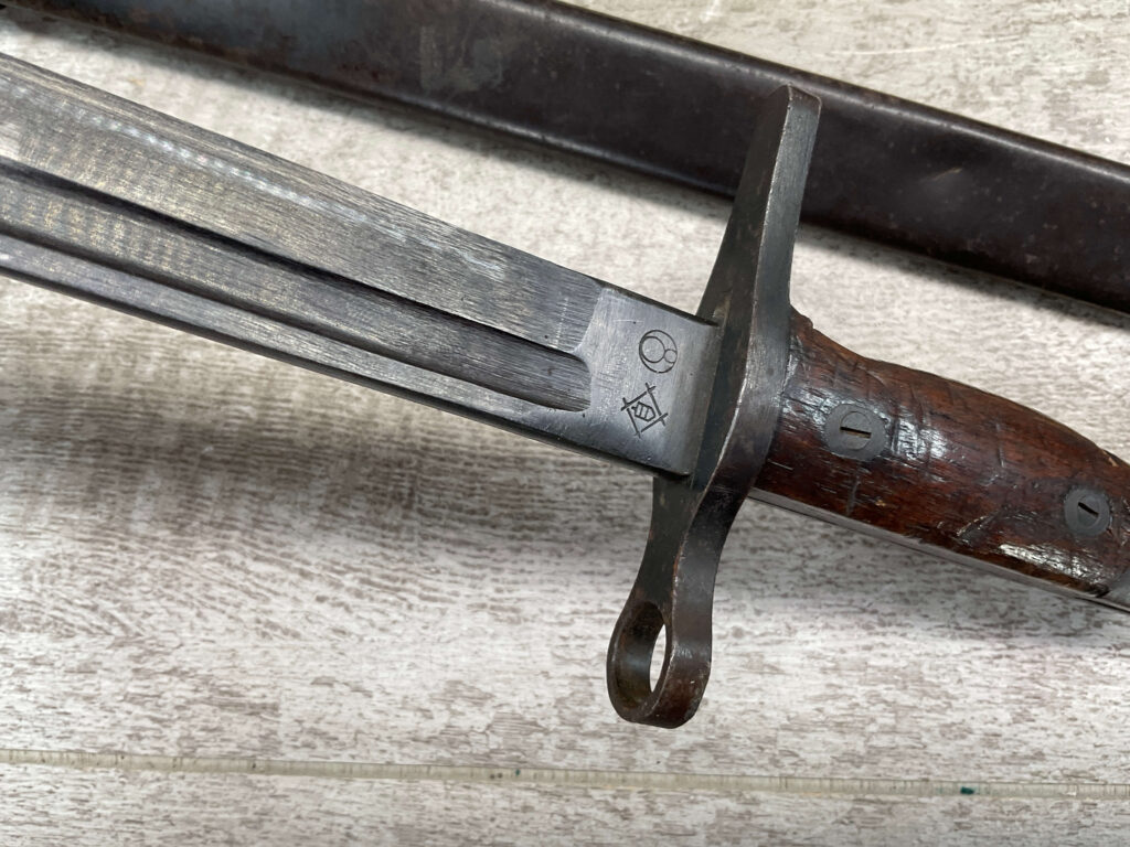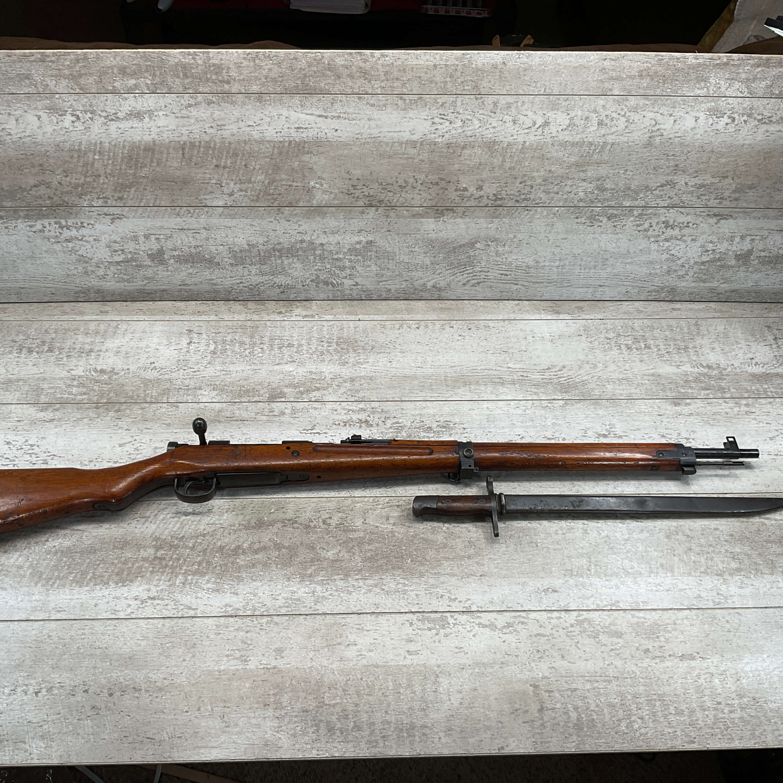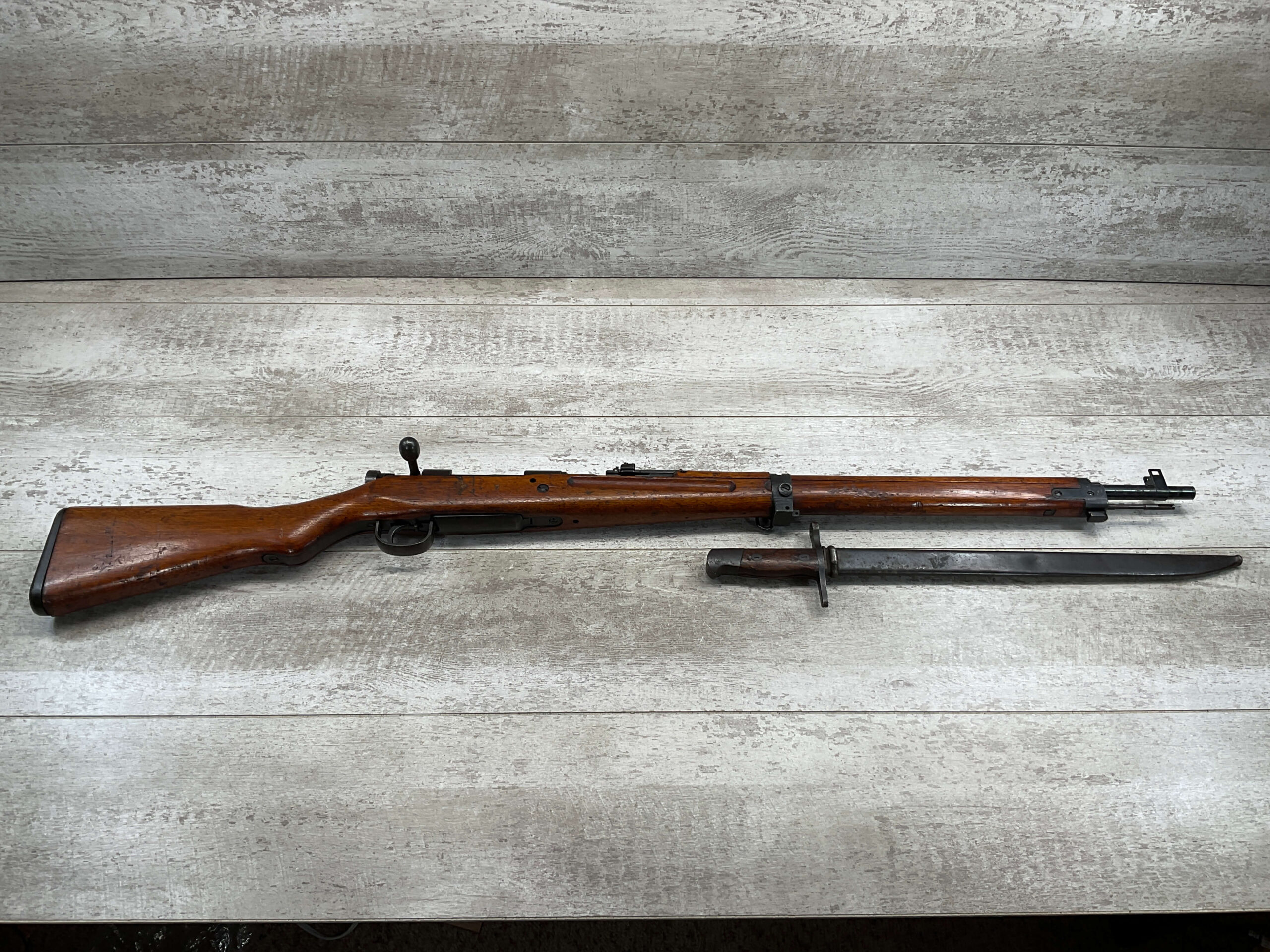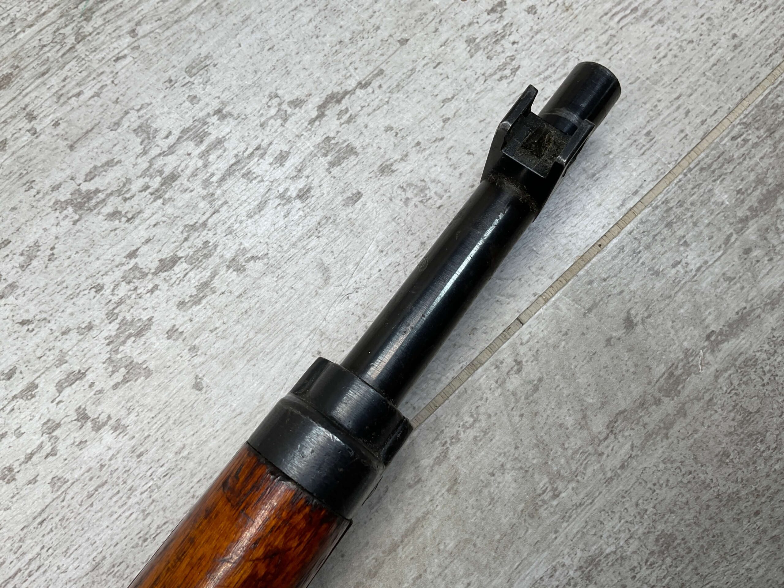 JAPANESE TYPE 99 7.7MM BOLT ACTION RIFLE #83725, 25.9″ BBL, LACKING AIRCRAFT WING CALIPERS ON REAR SIGHT, KOKURA ARSENAL SERIES 21, 90% BLUE, GOOD STOCK W/TYPICAL NICKS & DINGS, GROUND MUM, MATCHING BOLT, CLEANING ROD, NO DUST COVER, ORIGINAL BAYONET & SCABBARD, MIRROR BORE W/EXC RIFLING, 85%+ OVERALL