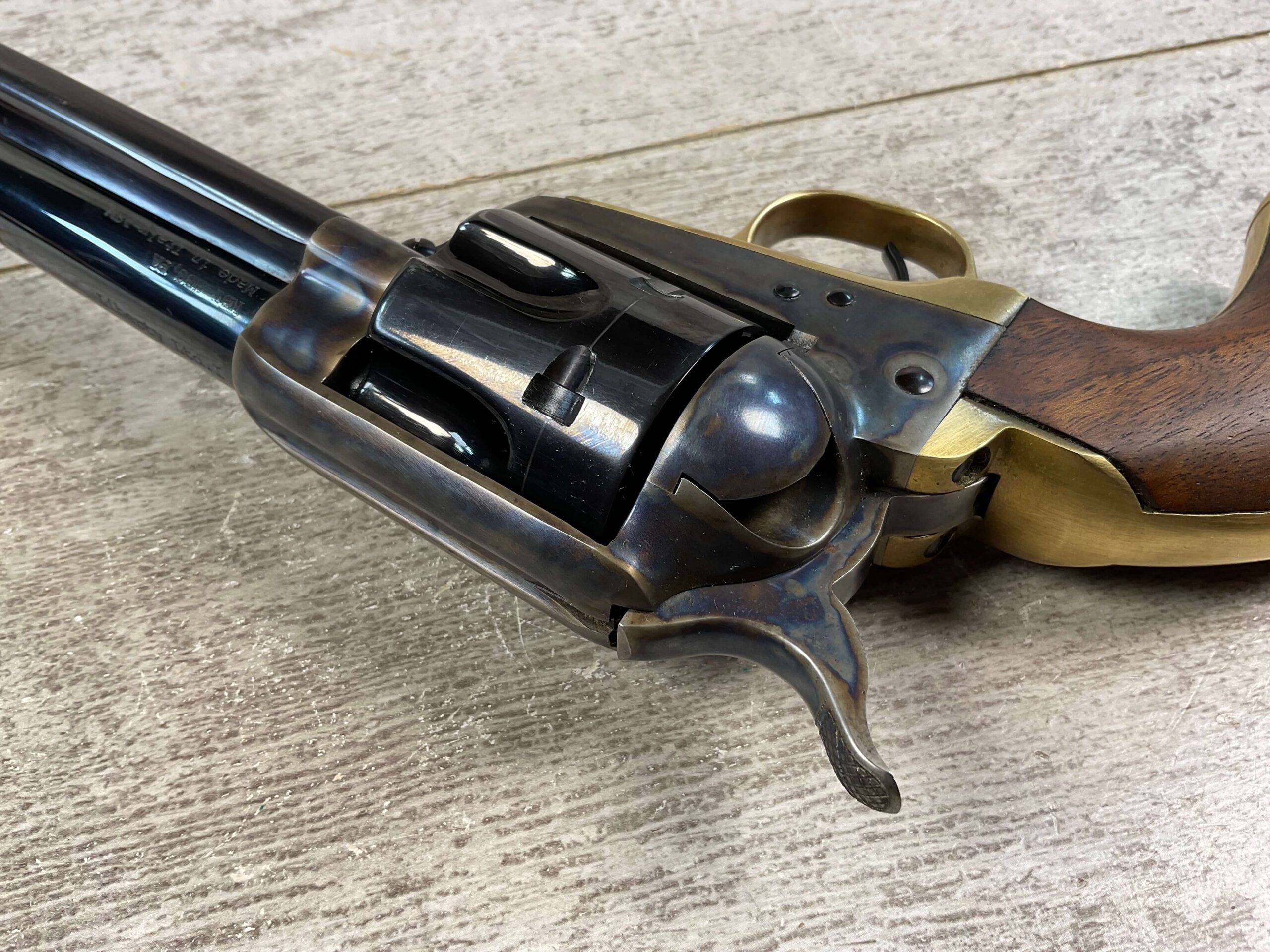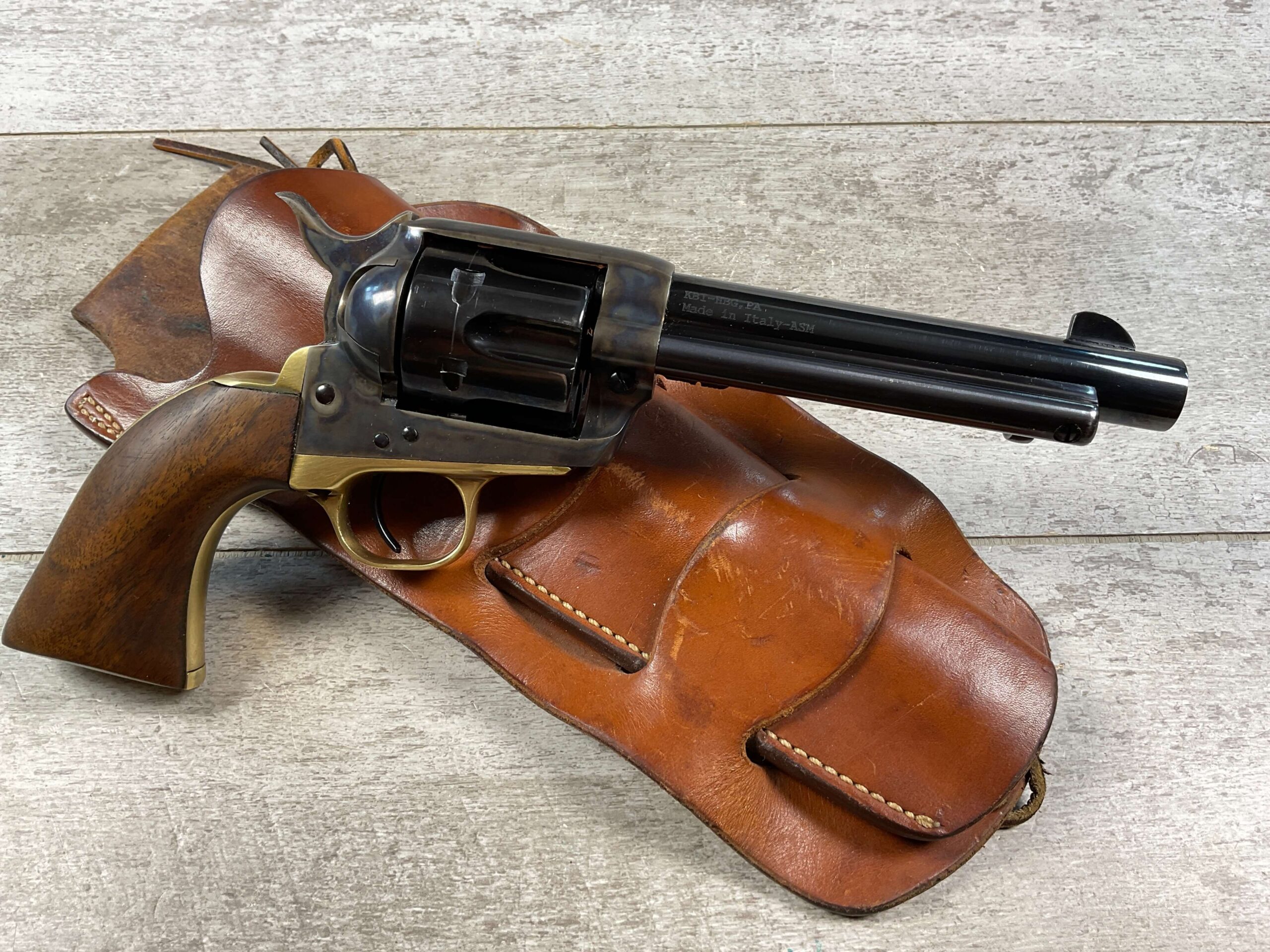KBI LIBERTY I .45 LONG COLT SINGLE ACTION REVOLVER #32011, 5.5″ BARREL, EXC BORE & RIFLING, EXC BLUE FINISH ON BARREL & CYLINDER, LIGHT LINE ON CYLINDER, 6 ROUND CYLINDER, CASE COLOR HARDENED RECEIVER, BRASS TRIGGER GUARD, VG-EXC SMOOTH WOORD GRIPS, BROWN LEATHER HIP HOLSTER W/ LEG TIE, BIANCHI #1873 LARGE SA, CONDITION AS SHOWN IN PHOTOS