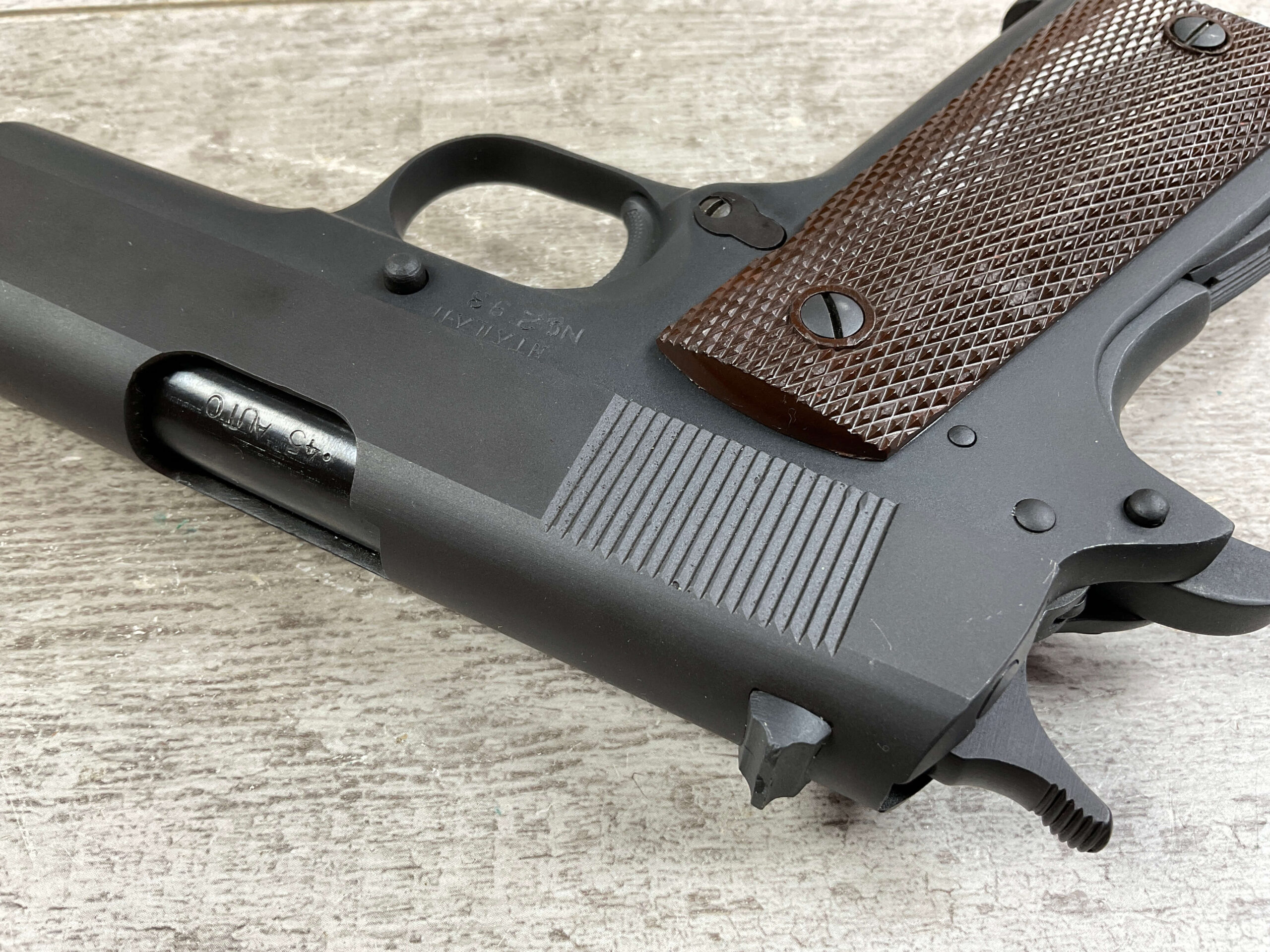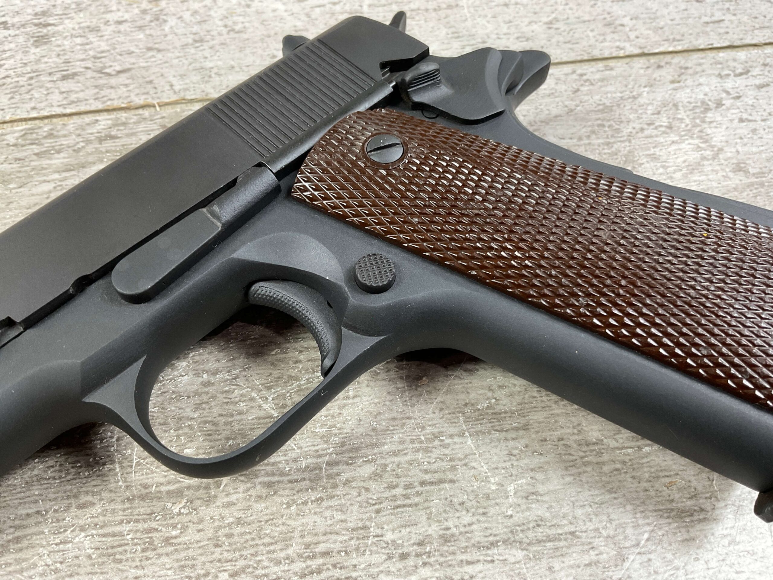 KOREAN / PUSAN JIN IRON WORKS .45ACP SEMI AUTO PISTOL, PROFESSIONALLY REFINISHED, JAMES EARL JONES COLLECTION #NC296, PROFESSIONALLY REWORKED, NO BARREL MARKINGS, DARKER BORE W/FROSTING IN THE GROOVES BUT VG RIFLING, EXC FINISH, EXC PLASTIC CHECKERED GRIPS, CONDITION AS SHOWN IN PICTURES, FROM THE JAMES EARL JONES “FAVORITES” COLLECTION W/ CERTIFICATE OF AUTHENTICITY.