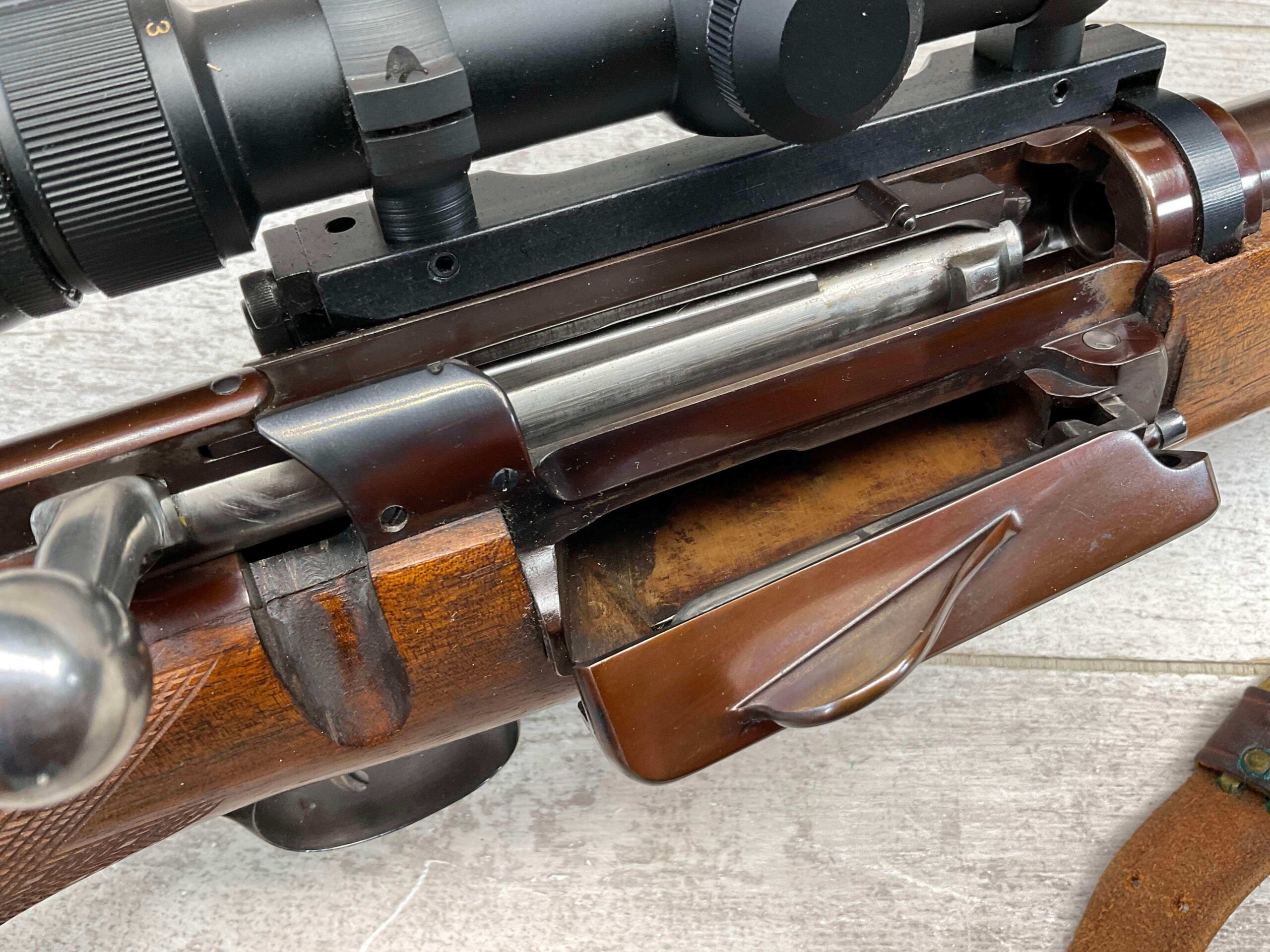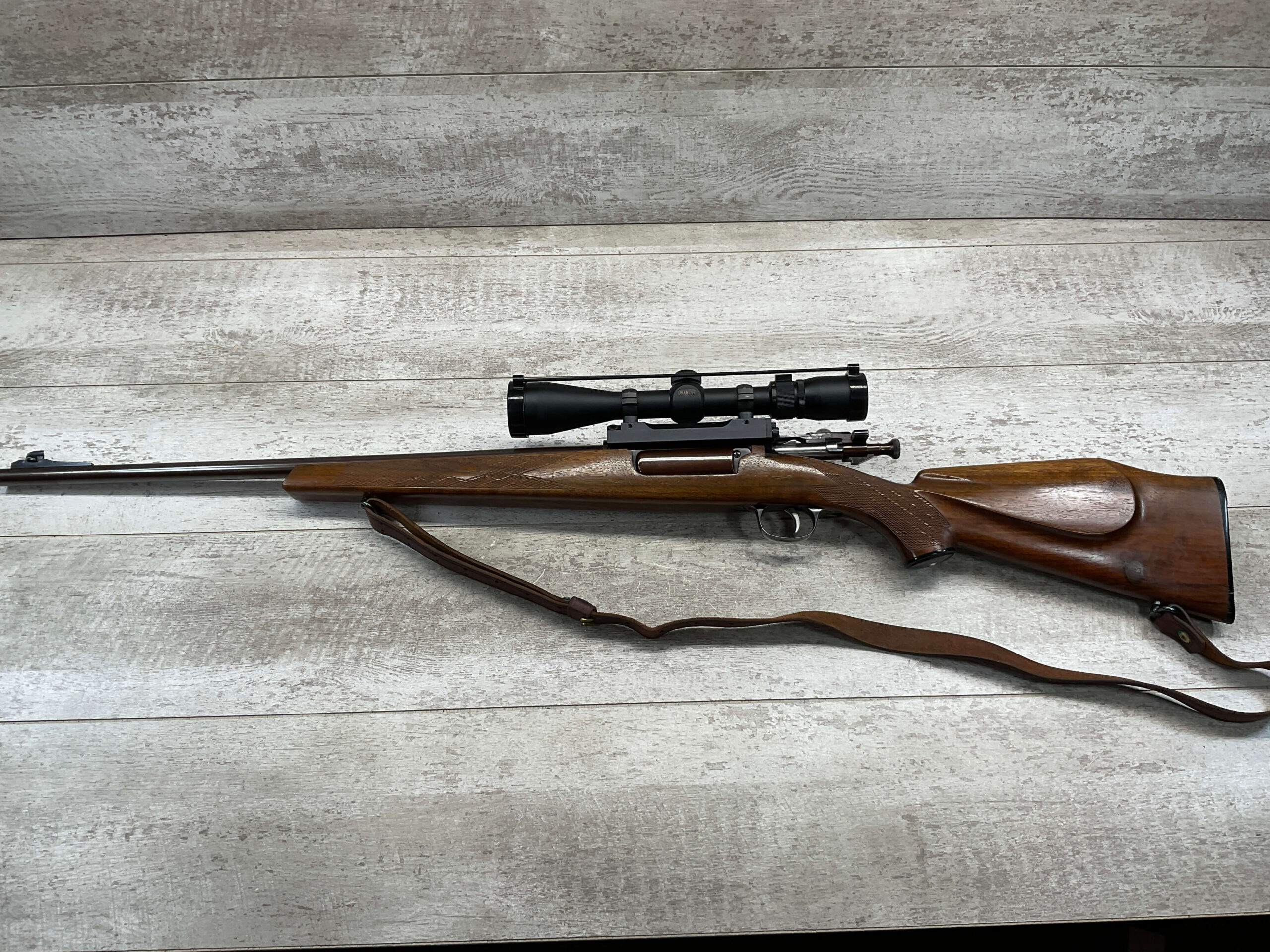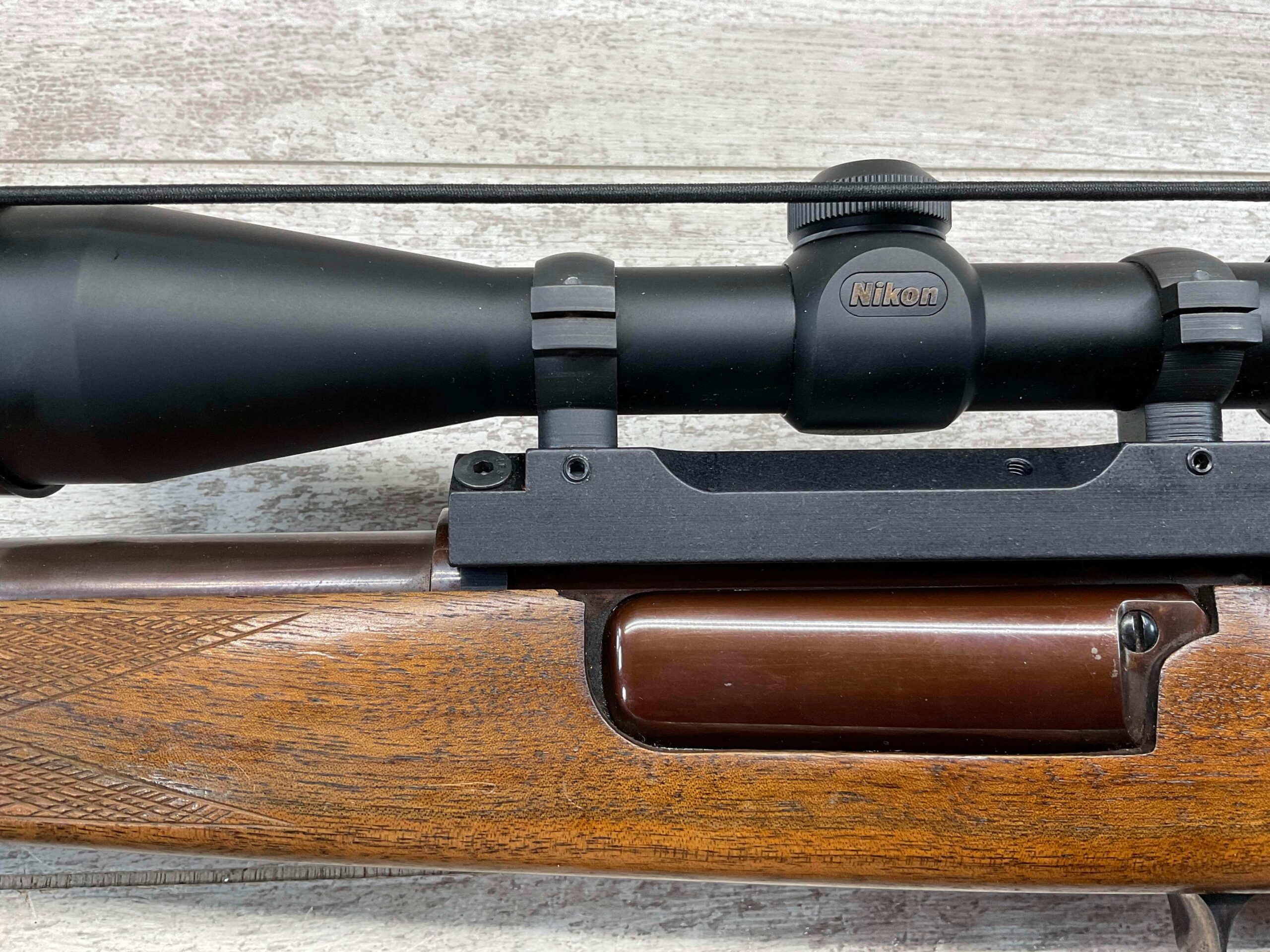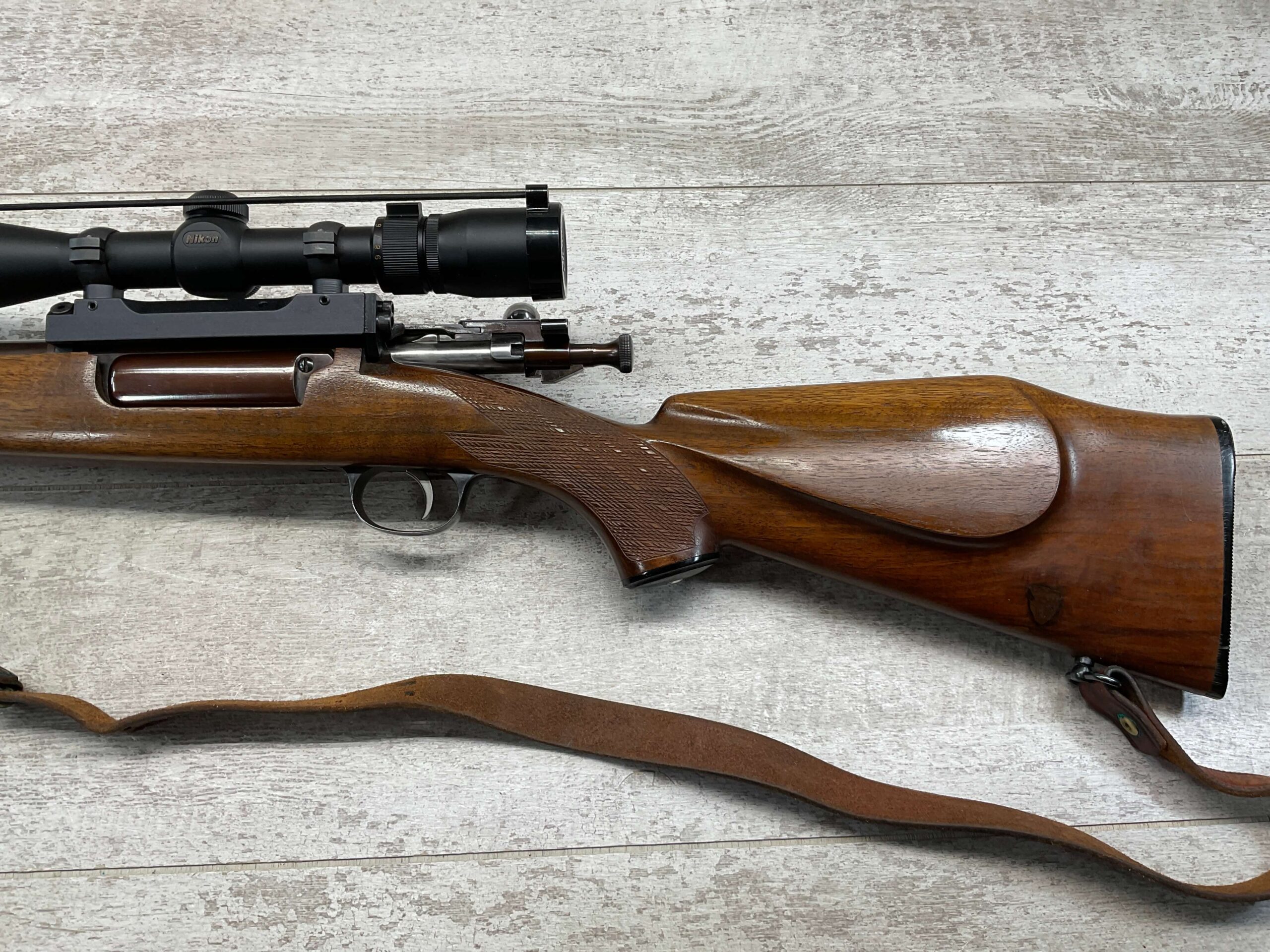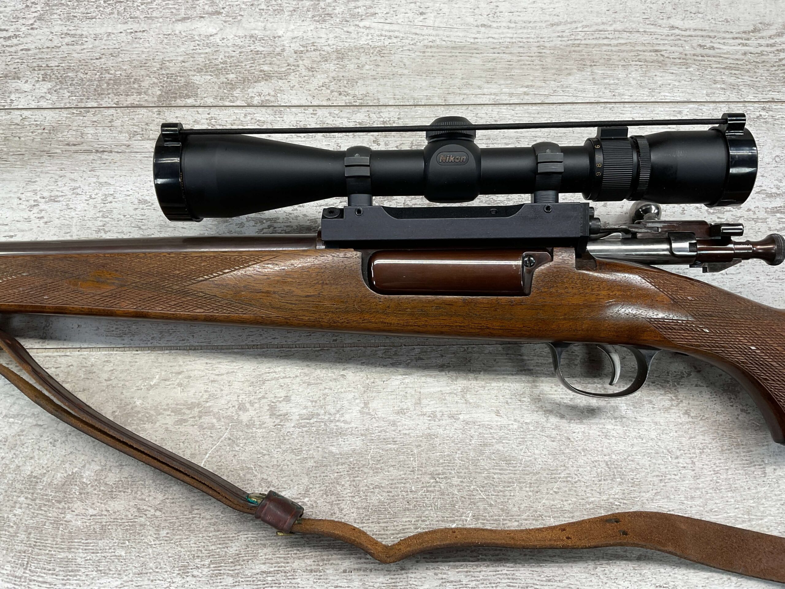 KRAG 30-40 SPORTERIZED BOLT ACTION RIFLE #NSN, 22 1/4″ BARREL, NIKON PROSTAFF 3-9X32, SPORTERIZED, RUST BLUED, FROSTED BORE, GOOD RIFLING, CHECKERED STOCK W/LIGHT WEAR FROM USE, EXC LEATHER SLING, SMOOTH ACTION