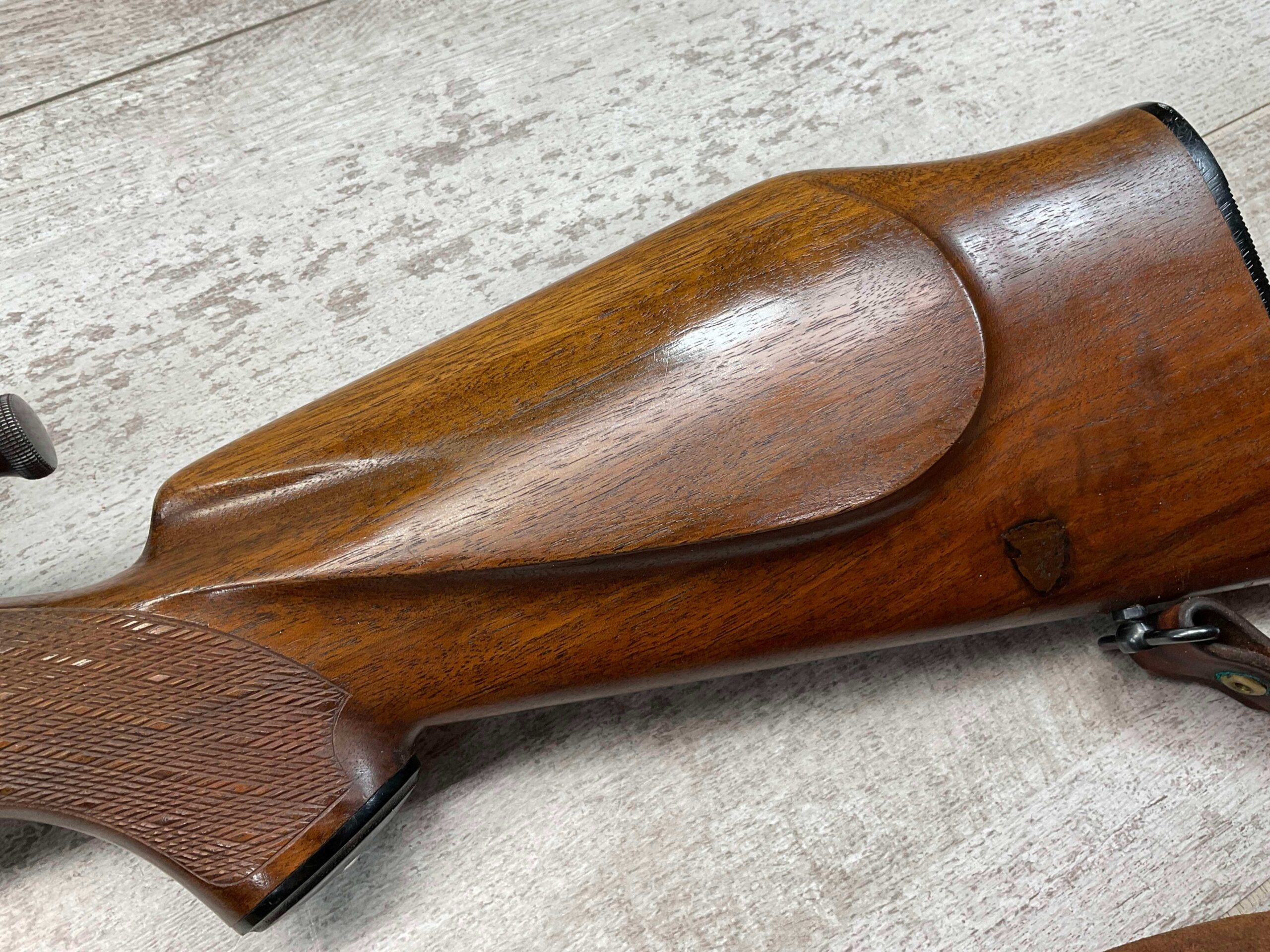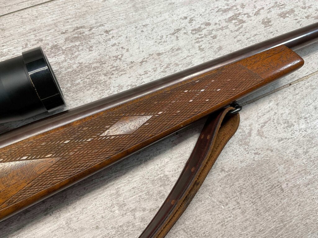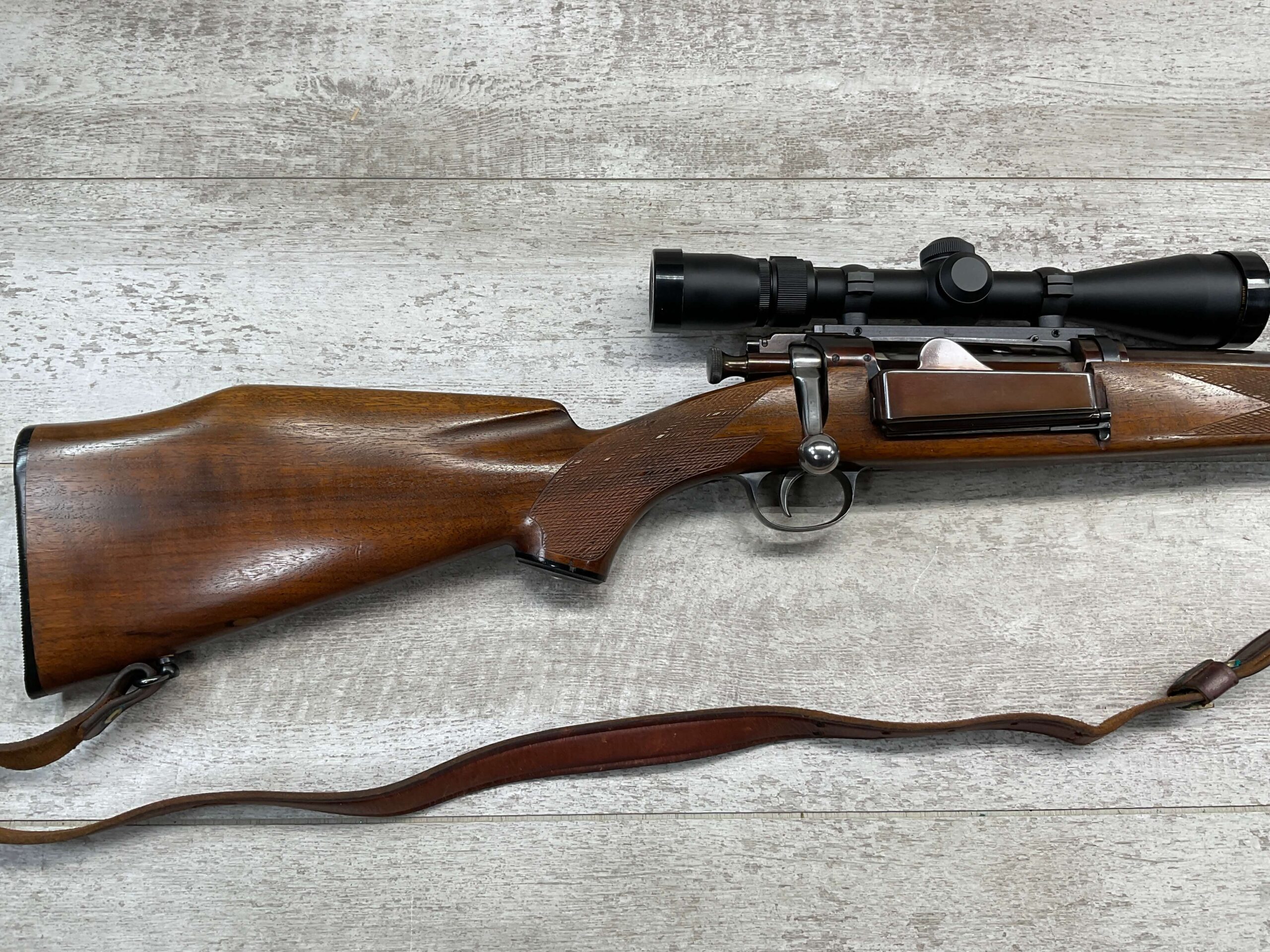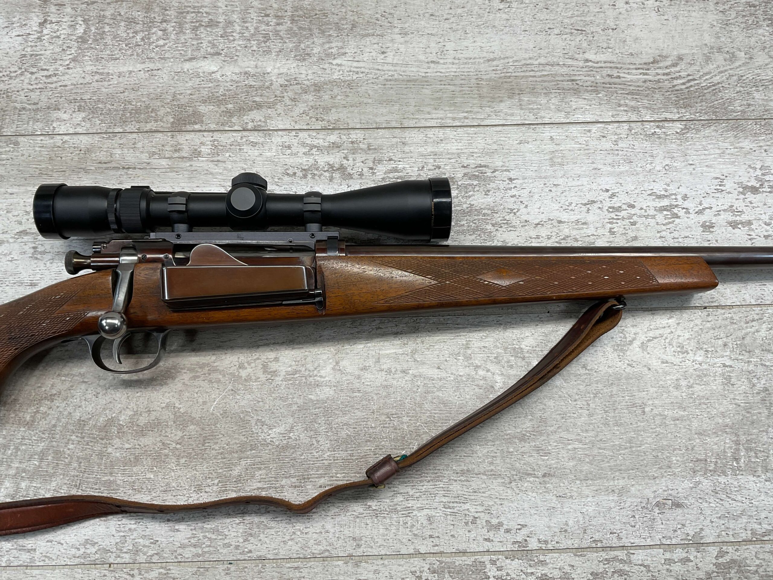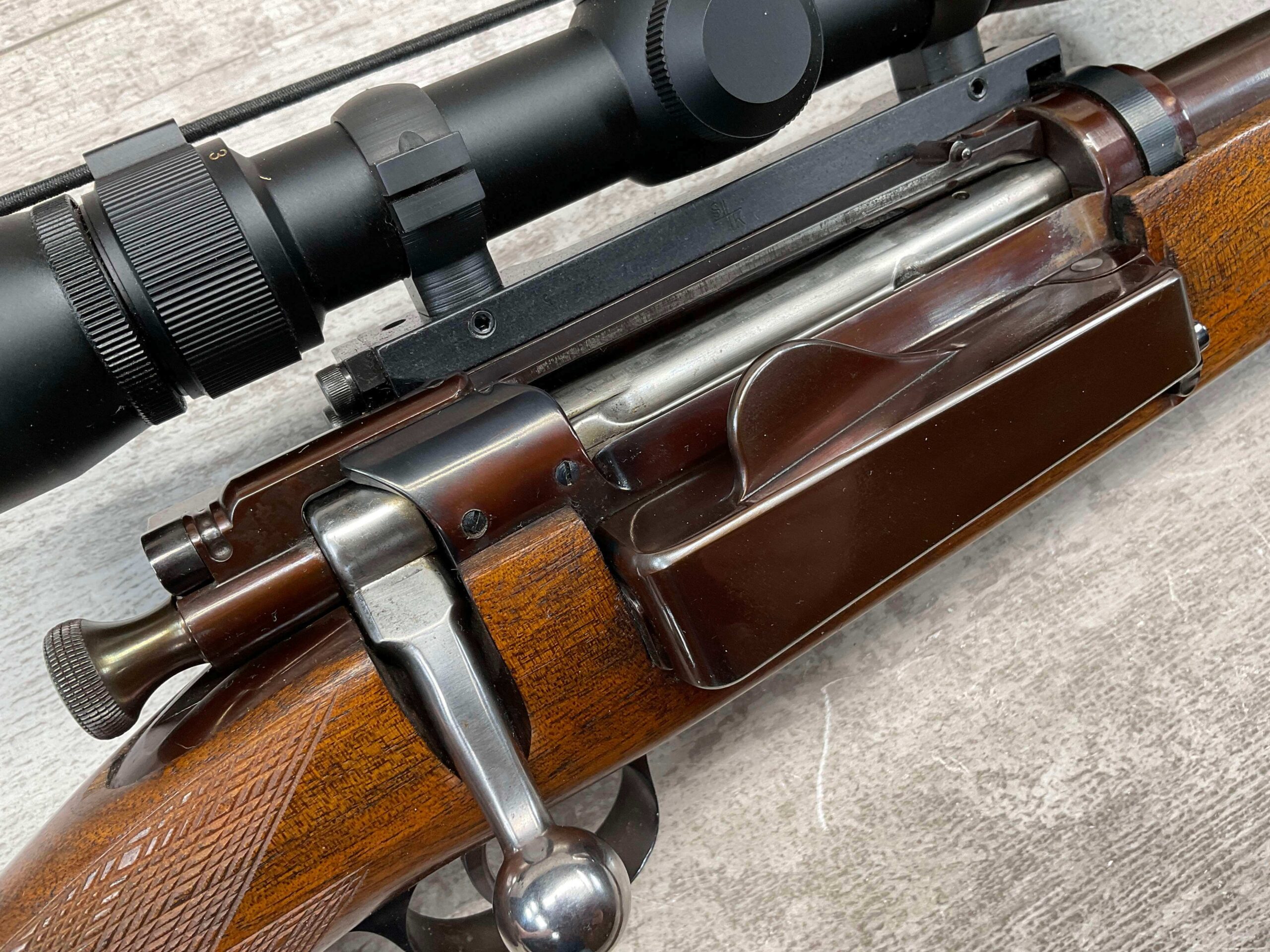 KRAG 30-40 SPORTERIZED BOLT ACTION RIFLE #NSN, 22 1/4″ BARREL, NIKON PROSTAFF 3-9X32, SPORTERIZED, RUST BLUED, FROSTED BORE, GOOD RIFLING, CHECKERED STOCK W/LIGHT WEAR FROM USE, EXC LEATHER SLING, SMOOTH ACTION