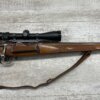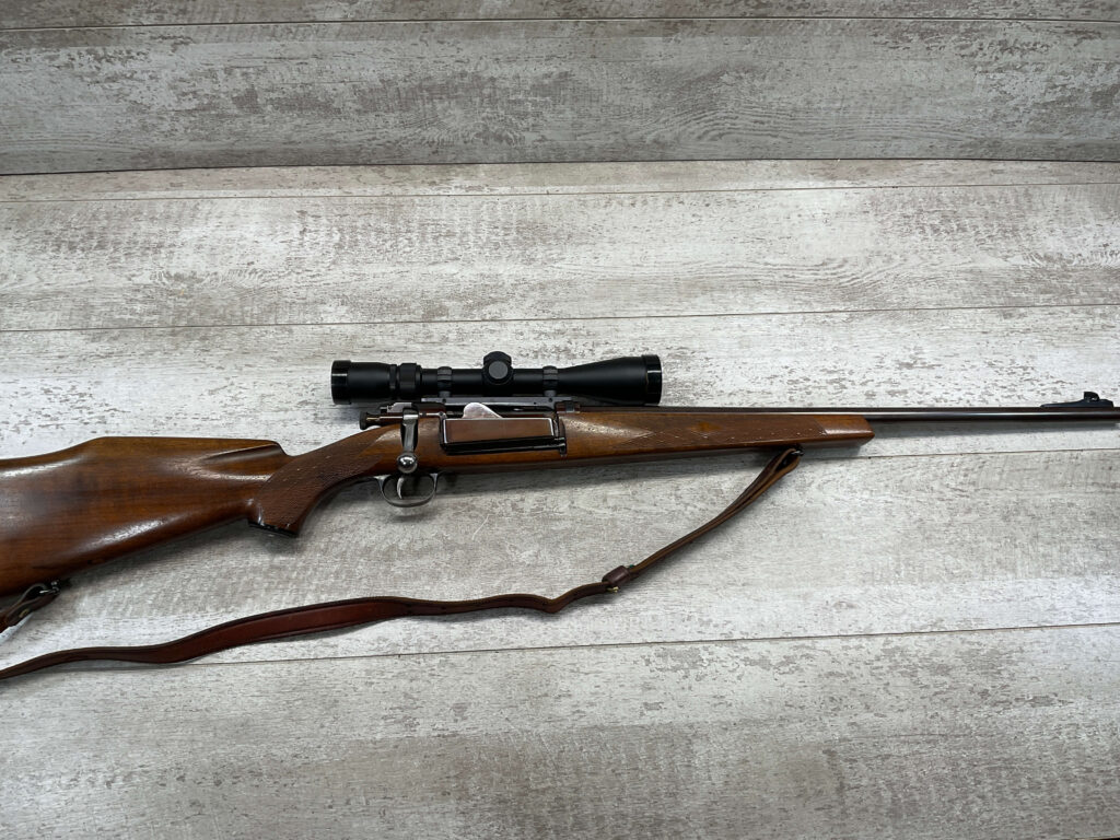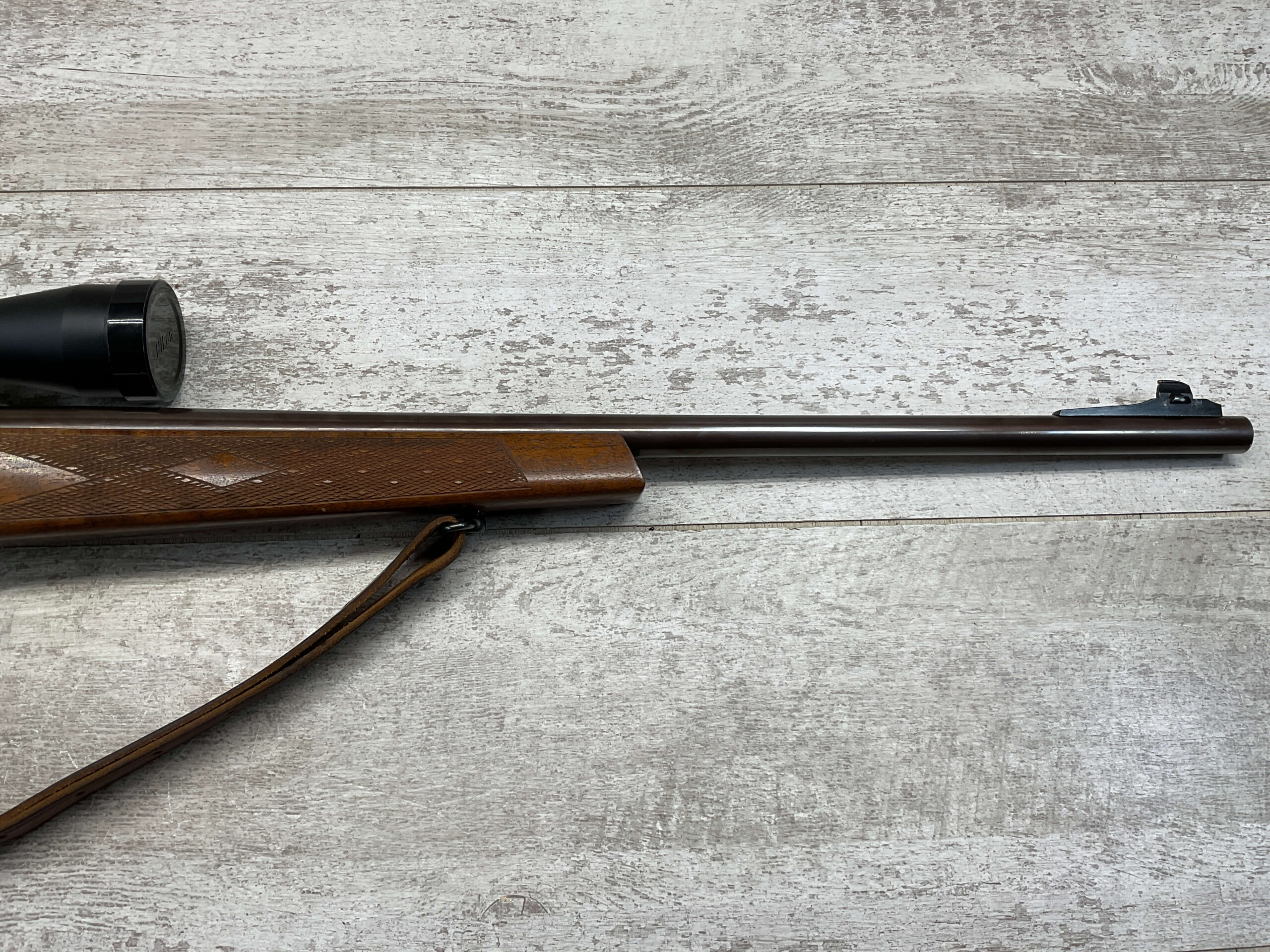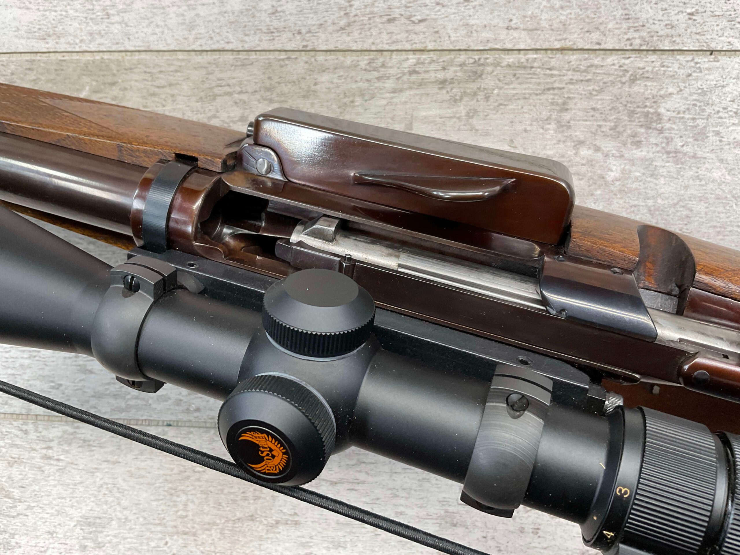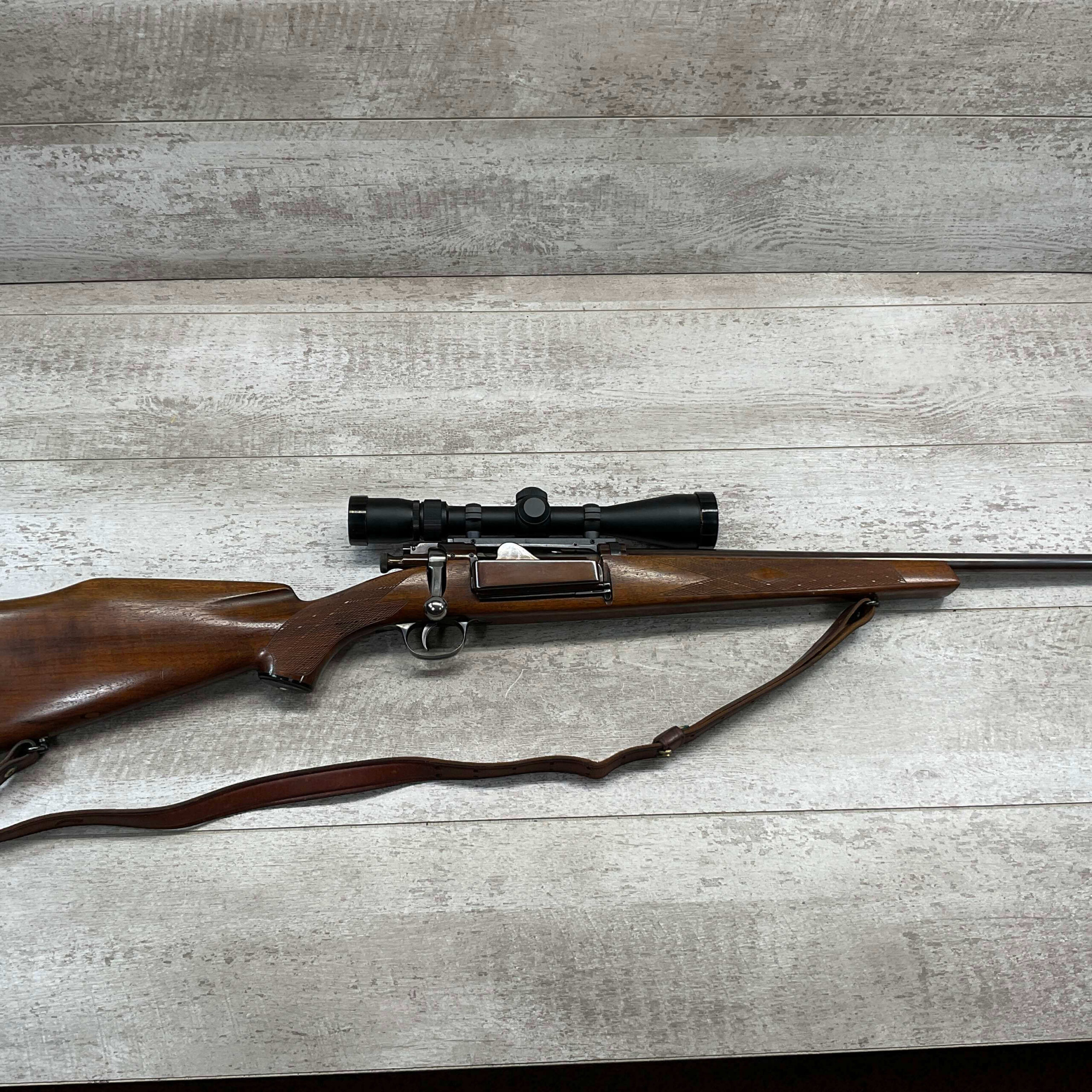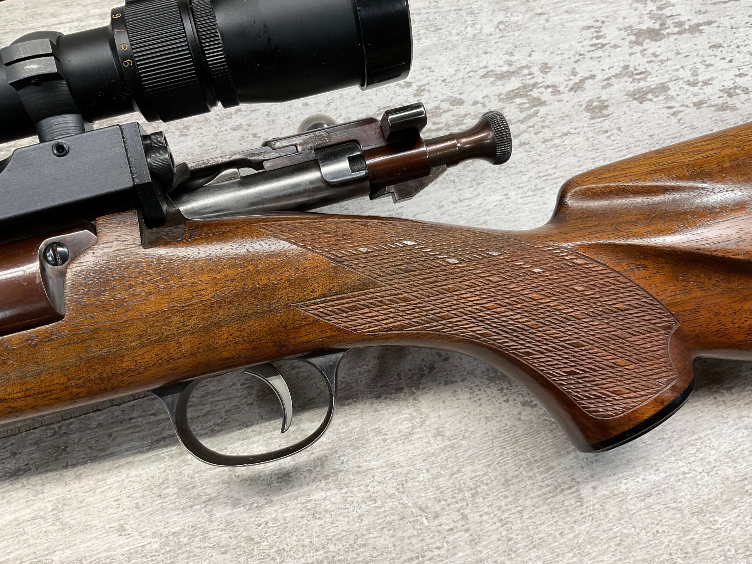 KRAG 30-40 SPORTERIZED BOLT ACTION RIFLE #NSN, 22 1/4″ BARREL, NIKON PROSTAFF 3-9X32, SPORTERIZED, RUST BLUED, FROSTED BORE, GOOD RIFLING, CHECKERED STOCK W/LIGHT WEAR FROM USE, EXC LEATHER SLING, SMOOTH ACTION