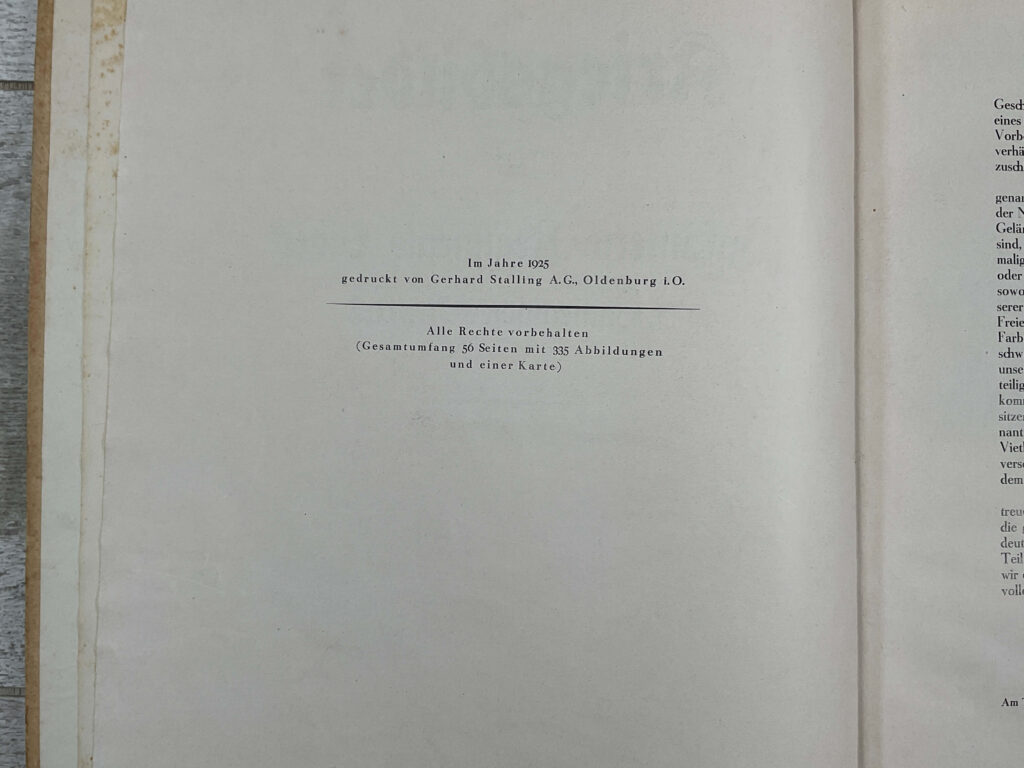 56 pages, 9 ll. (card inserts), illustrated OHLnbd., 28 x 22.5 cm. Contains 335 mostly photographic illustrations and 23 overview maps of positions and battles as a supplement (attack on Meesen: structure of the regiment after the capture of the 1st enemy main resistance line, orders for the attack on Meesen, attack of I.R. 162 on Meesen on April 10, 1918, Right turn of the IR 162 and attack on Wytschaete, position of the regiment after the mass offensive at Cuvilly-Lataule, position at Geluvelt-Polderhoek, position at Houthem, combat zone plan of the divisions of the Lille Group for the attack in April 1918, position at St. Julien in Flanders, approach of the regiment for the 1st and 2nd operations on the Somme, position at the Bois du Vert and at Bis en Artois, position at the La Bassée canal at Auchy, position of the I./162 at the point where the Siegfried position at Riencourt-Bullecourt, position of the regiment at St. Aurin, overview map from Loos to Thelus, position of the 1st and 2nd /162 before Dreslincourt, overview map of Noyon and the surrounding area, funnel roads llung on the Vimy Heights, Kohlen-Halden position near Loos, position near Givenchy and on the Vimy Heights, relief map of northern France, overview map of the German western front: Battles of the Infantry Regiment No. 162, overview map of the German western front: Battles of the 162nd Infantry Regiment. Large map). The views partly show battle scenes, partly the soldiers’ leisure activities (soldiers’ circus, excursions), captured weapons, ruins, the effect of their own guns and enemy guns, latrines, telephone shelters, captive balloons, war painters with field easels (Hans am Ende, Worpswede), prisoners, soldiers when recovering fallen soldiers, bivouacs, mining work, signaling stations, captured guns, a railway gun when firing, etc.). – The cover illustration shows the Lübeck double-headed eagle. – Cover slightly rubbed and stained, slightly stained inside. Otherwise a good copy on good paper.