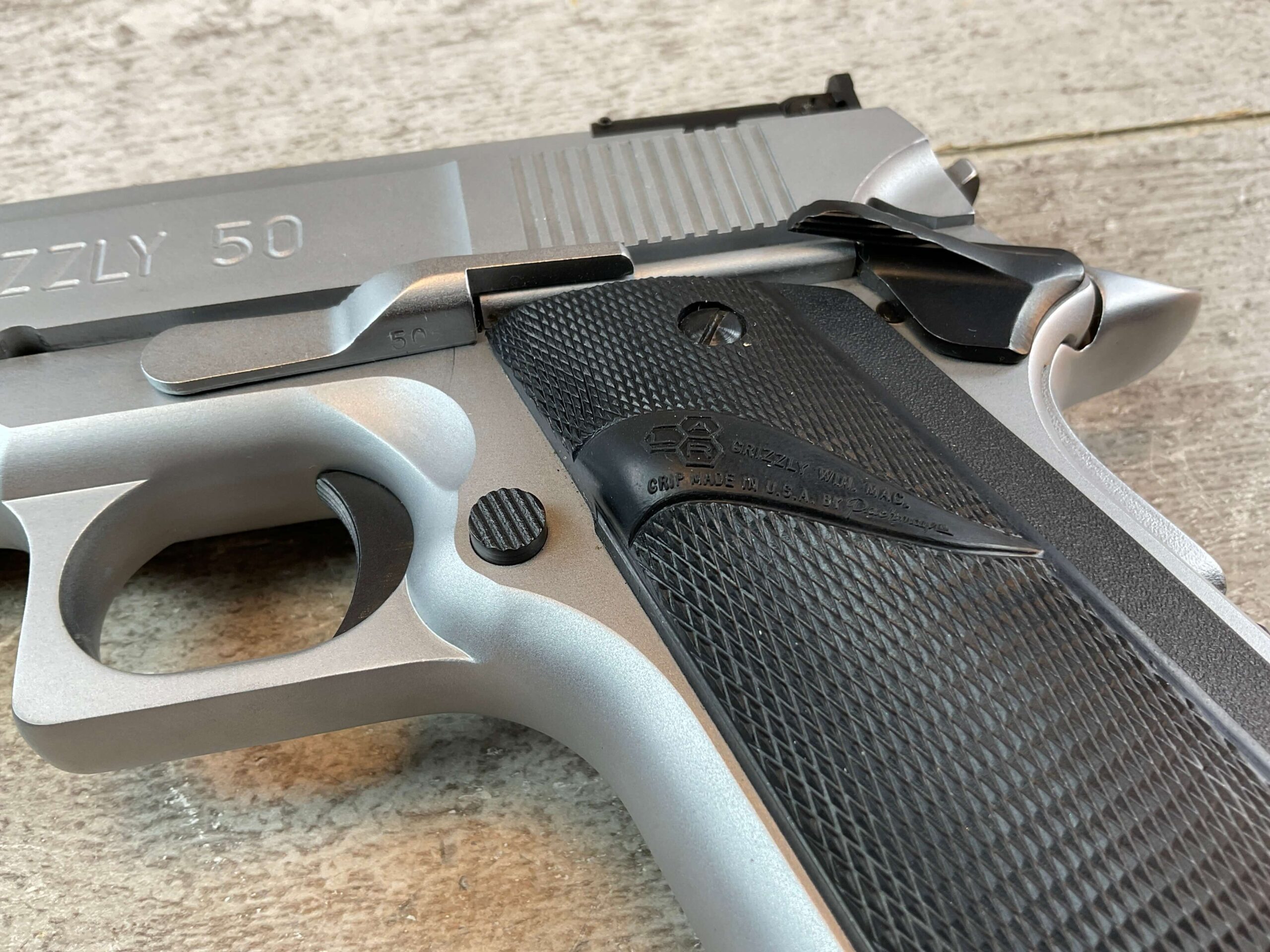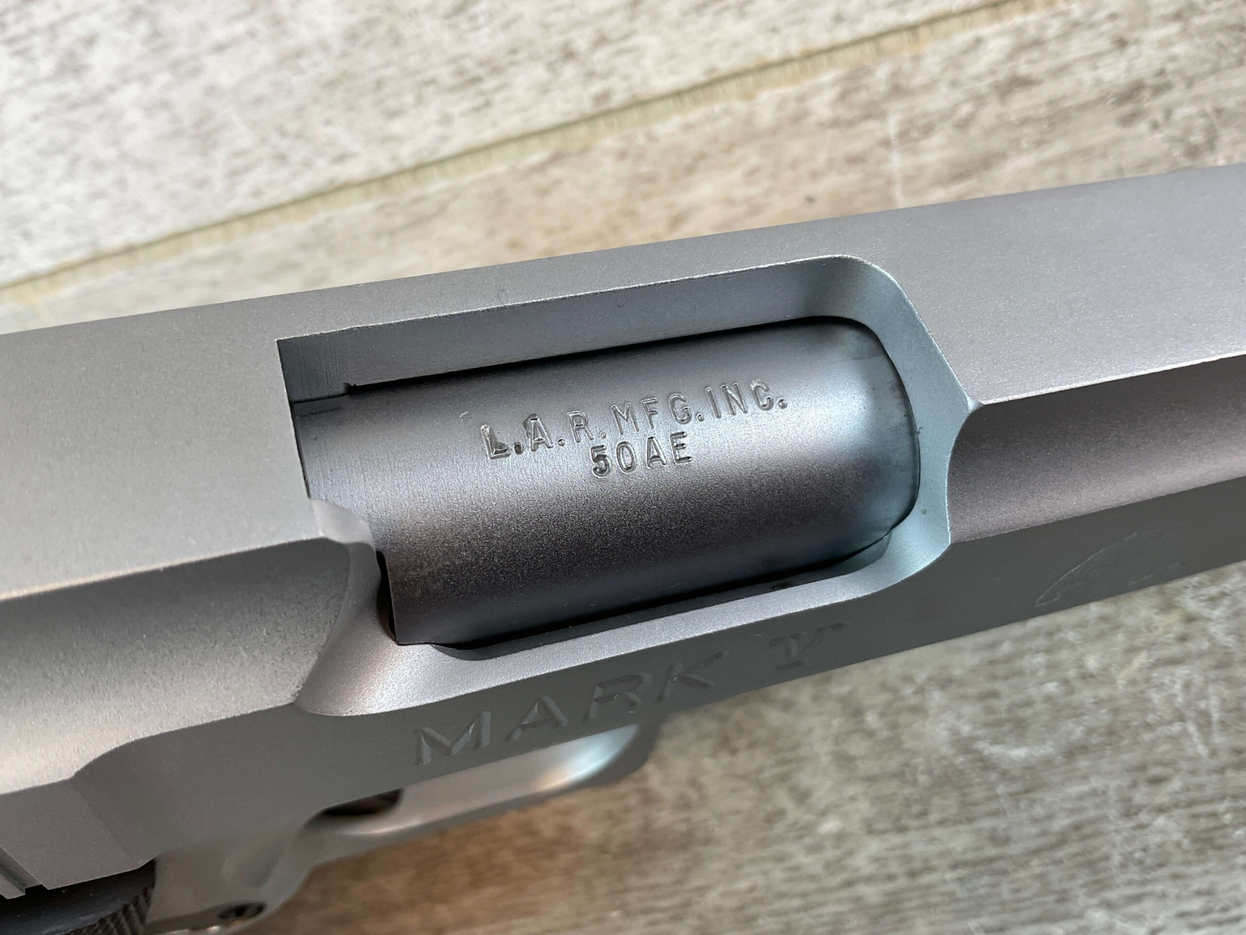 L.A.R. MANUFACTURING GRIZZLY .50 ACTION EXPRESS MARK V SEMI AUTO PISTOL, JAMES EARL JONES COLLECTION, RARE #V000537, 6.5″ BARREL, EXC MIRROR BORE & RIFLING, 99%+ STAINLESS FINISH, EXC L.A.R. GRIZZLY RUBBER GRIPS, BO-MAR STYLE ADJ REAR SIGHT, 1 – 6 ROUND MAGAZINE, 1993-1999 MFR, OVERSIZED 1911, CONDITION AS SHOWN IN PICTURES, FROM THE JAMES EARL JONES “FAVORITES” COLLECTION W/ CERTIFICATE OF AUTHENTICITY.