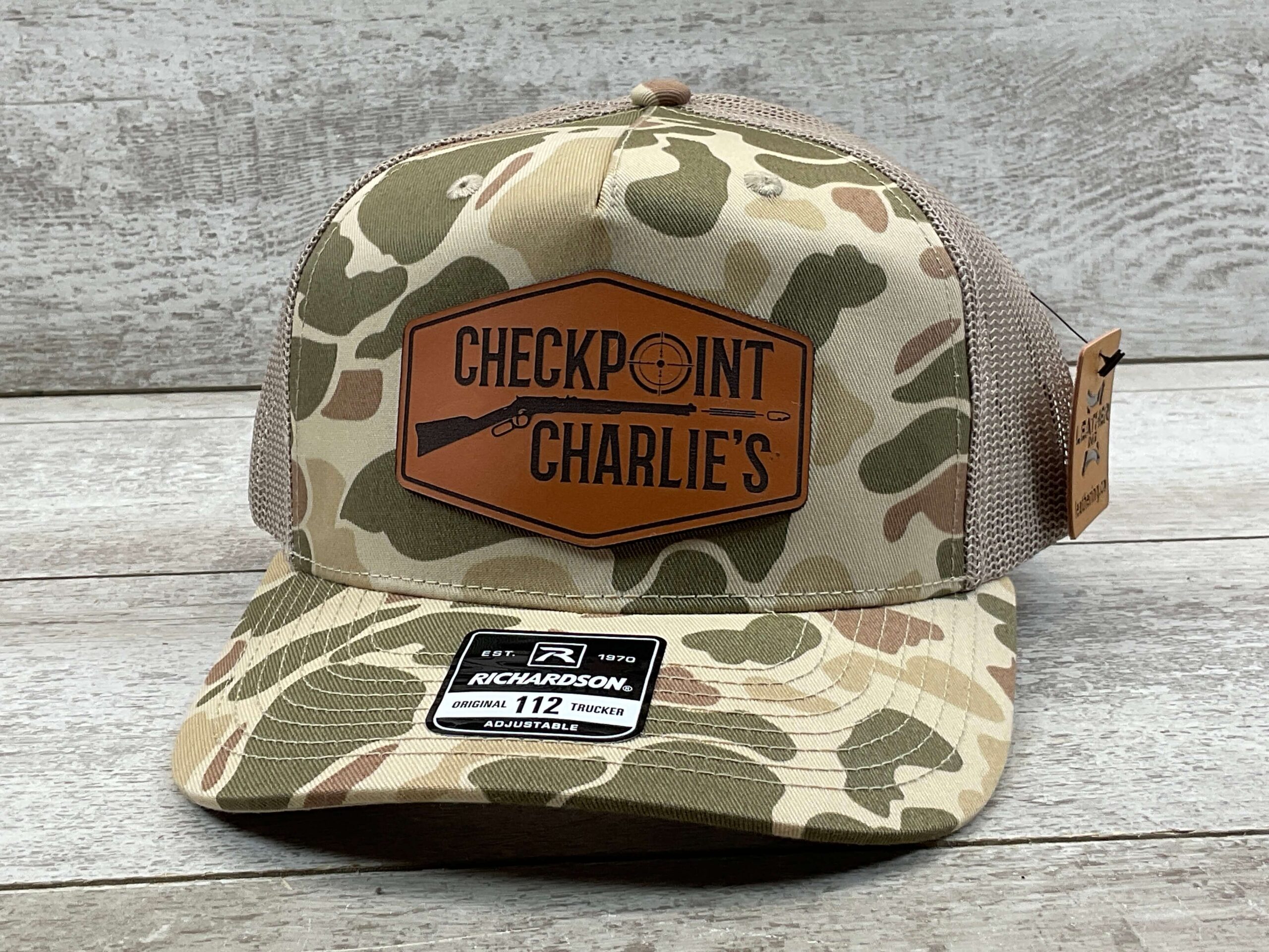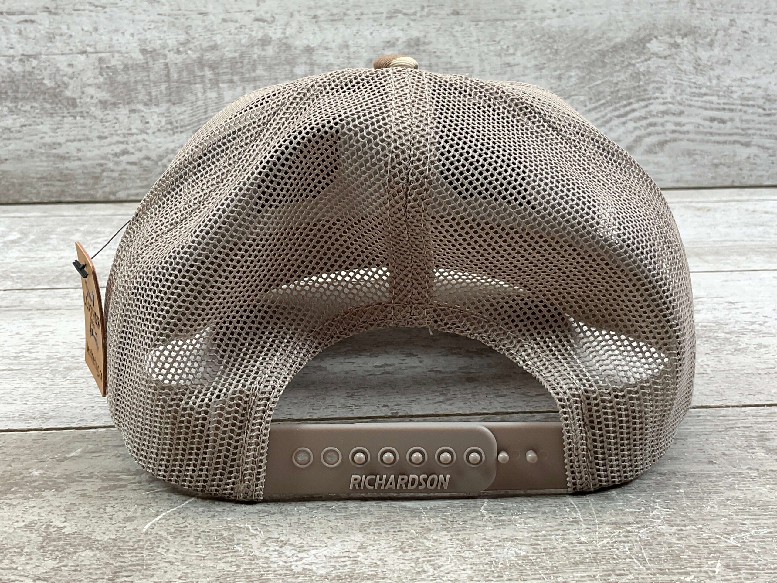 LEATHERING CO. RICHARDSON CUSTOM CHECKPOINT CHARLIE’S HARVEST DUCK CAMO/LIGHT TAN TRUCKER HAT, NEW #THAT-CAMO1
