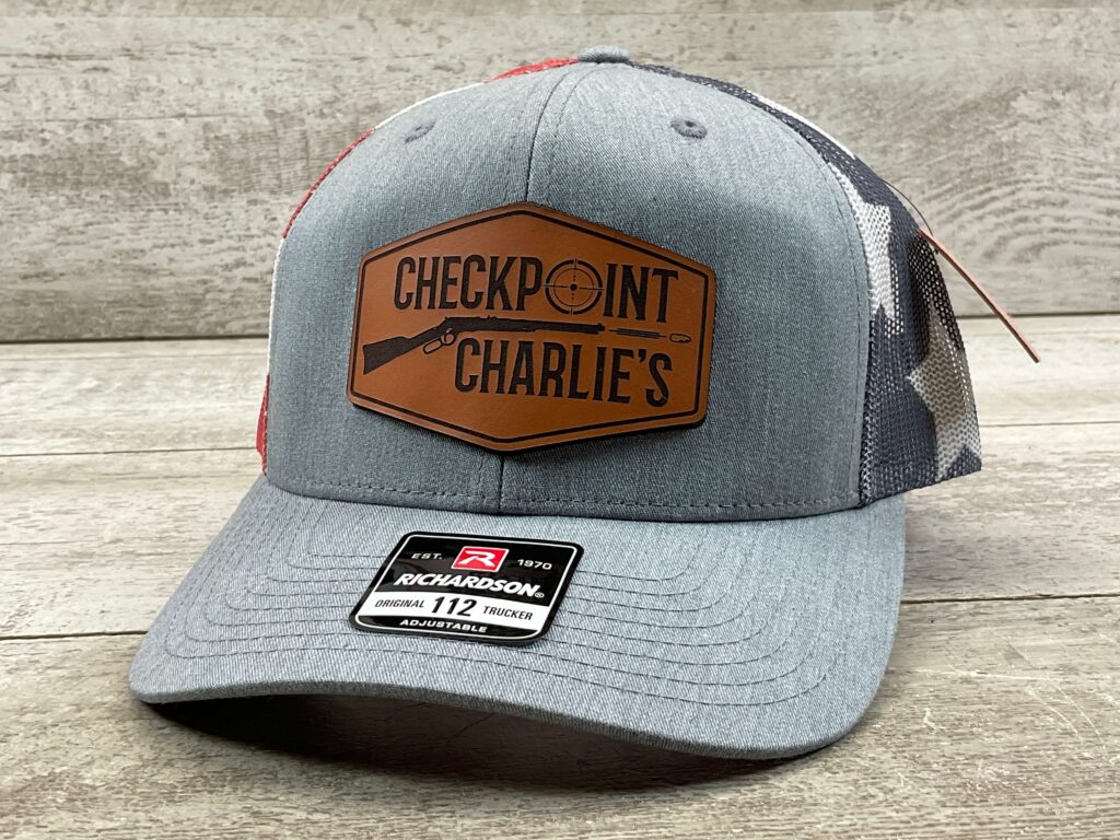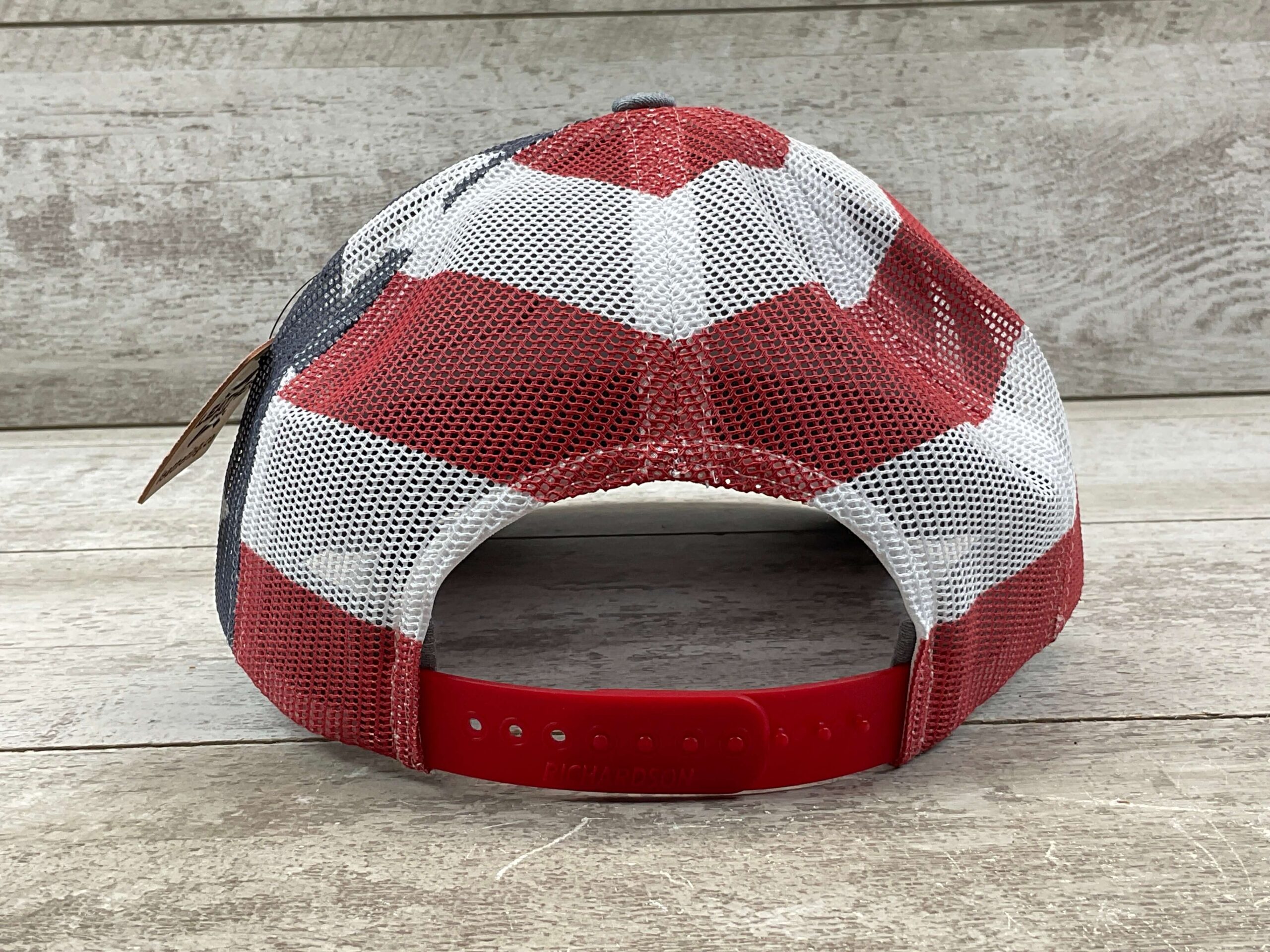 LEATHERING CO. RICHARDSON CUSTOM CHECKPOINT CHARLIE’S HEATHER GRAY/STARS & STRIPES TRUCKER HAT, NEW