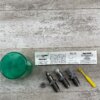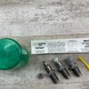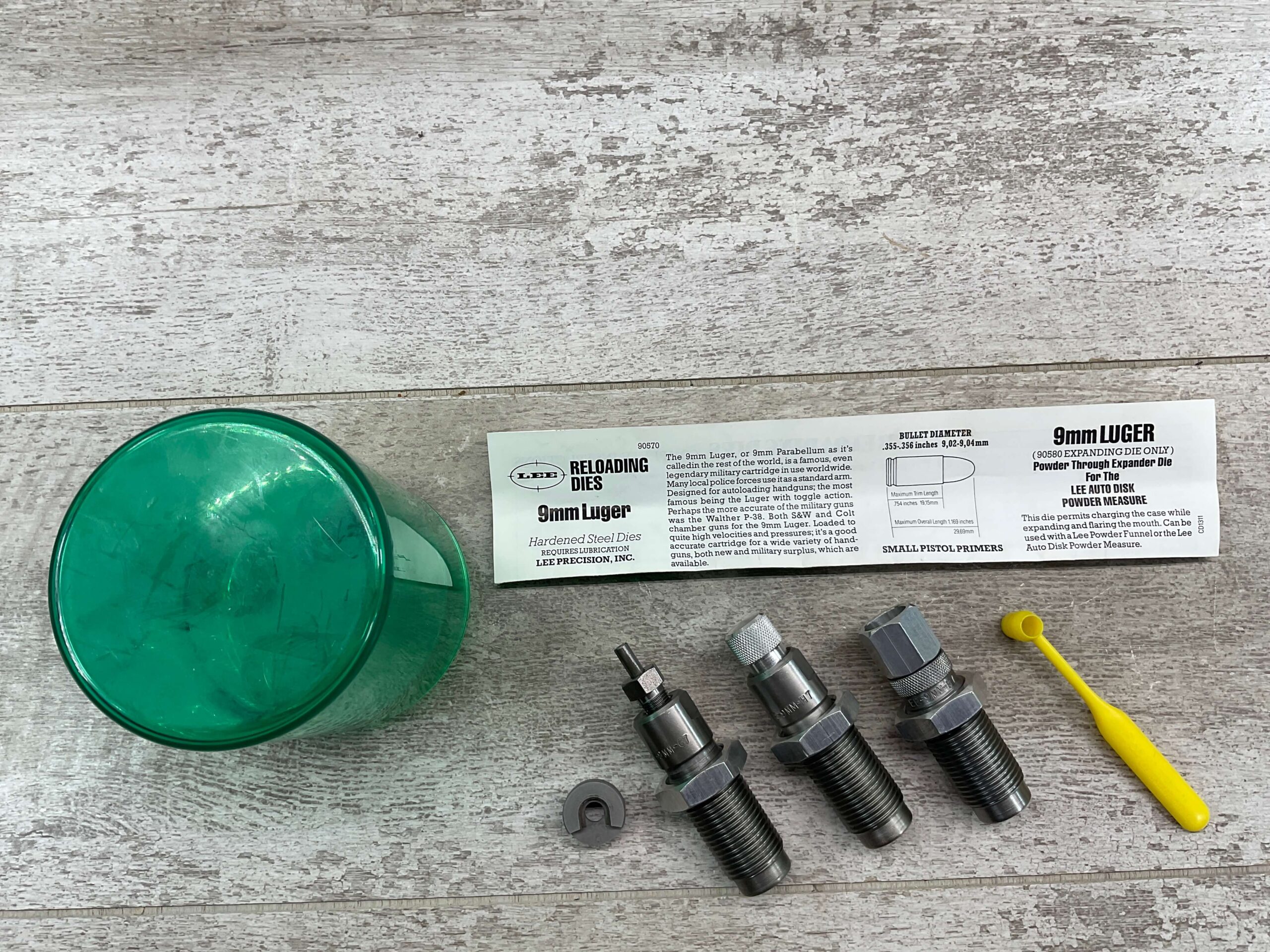LEE RELOADING 3 DIE SET, 9MM LUGER OR PARABELLUM, HARDENED STEEL DIES, INCLUDES DIPPER, SHELL HOLDER #6, INSTRUCTIONS AND GREEN PLASTIC STORAGE ALL IN VG USED CONDITION
