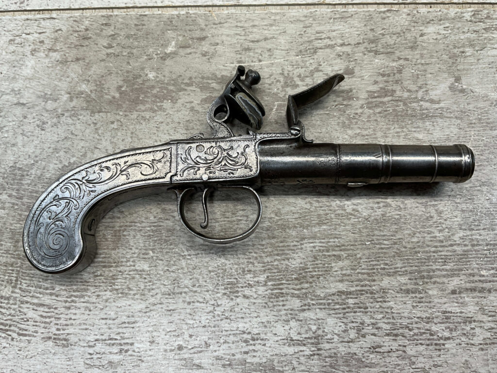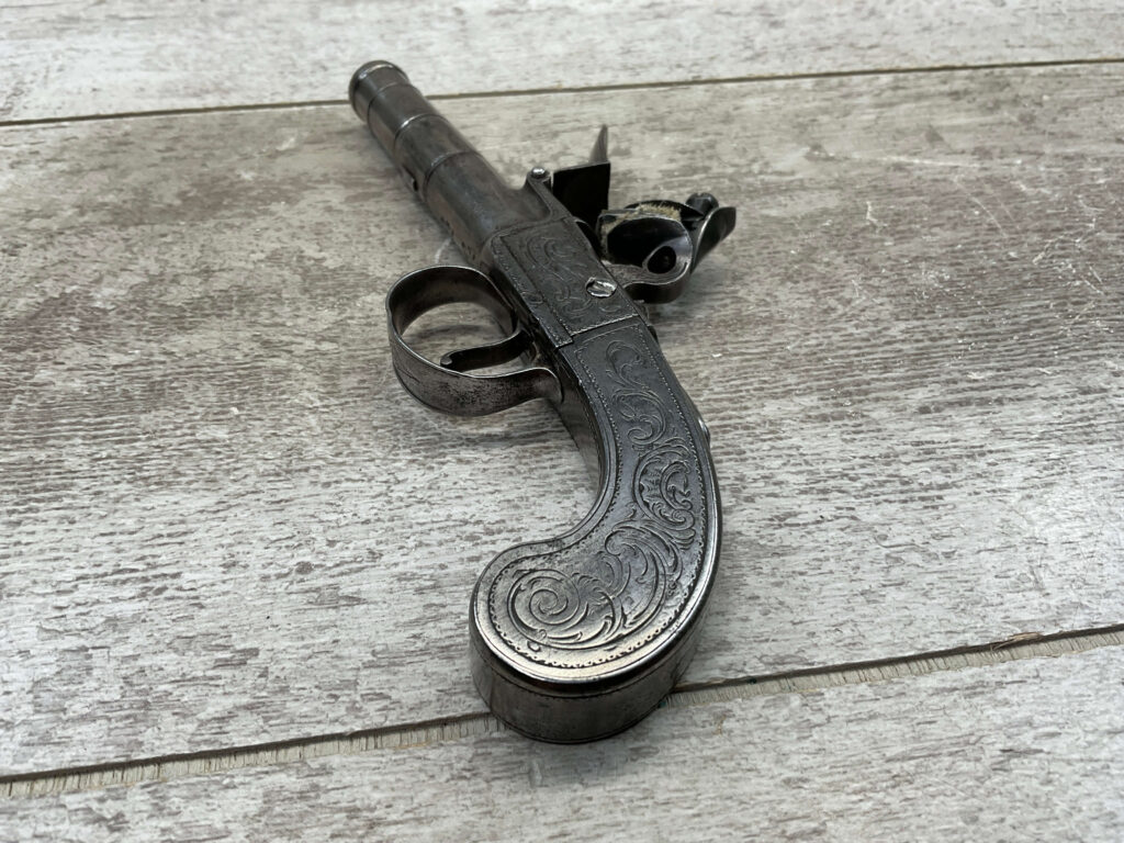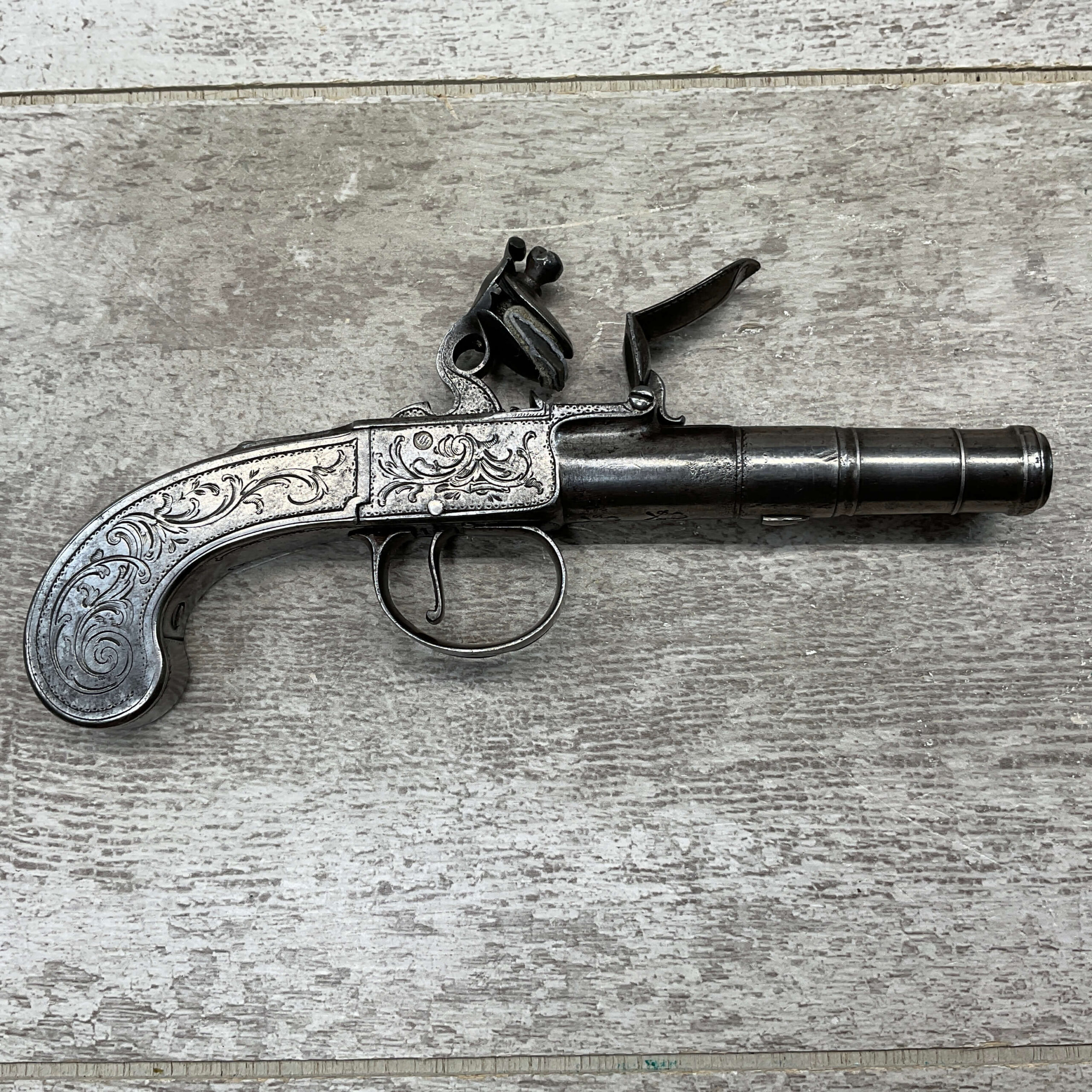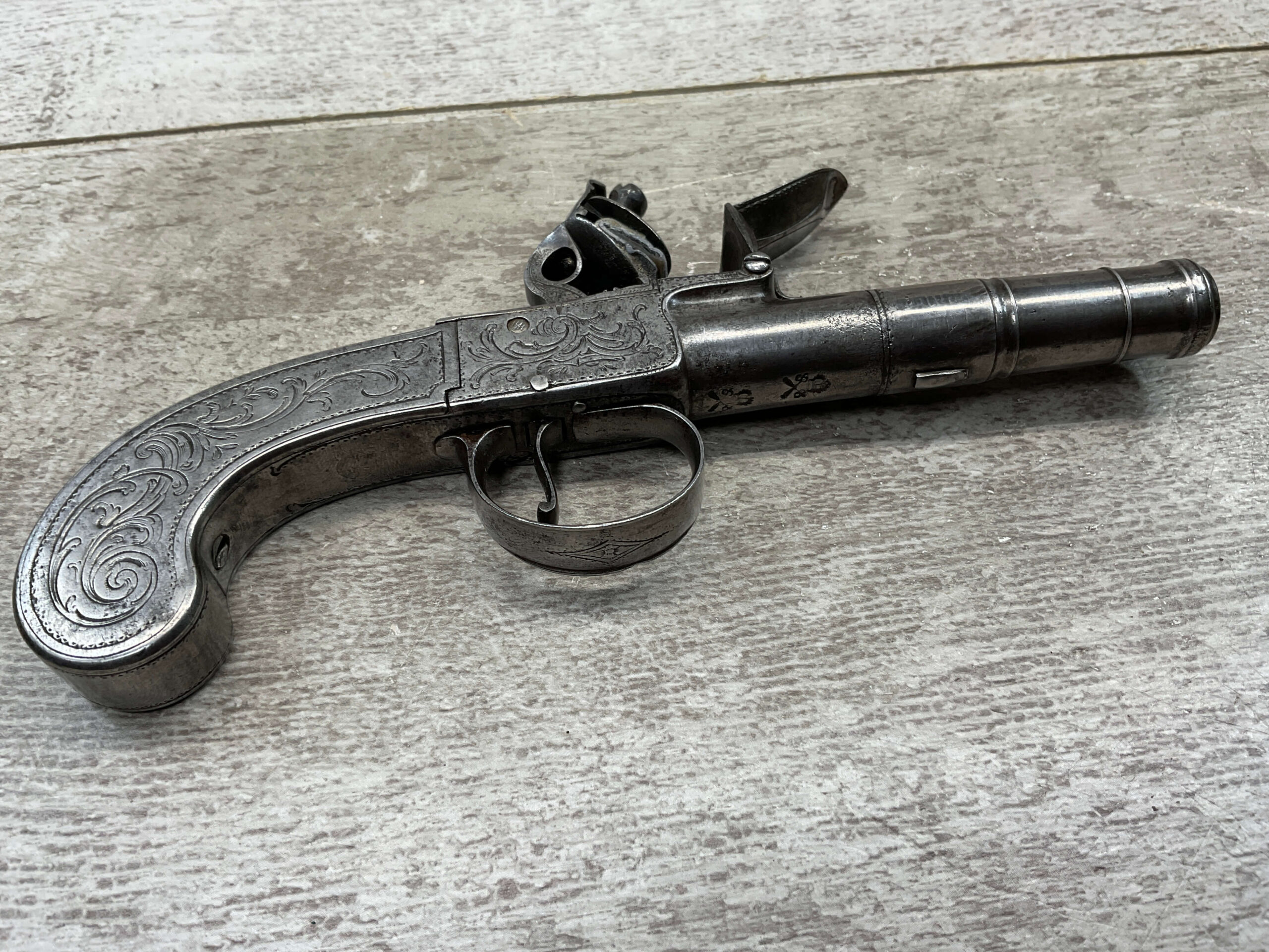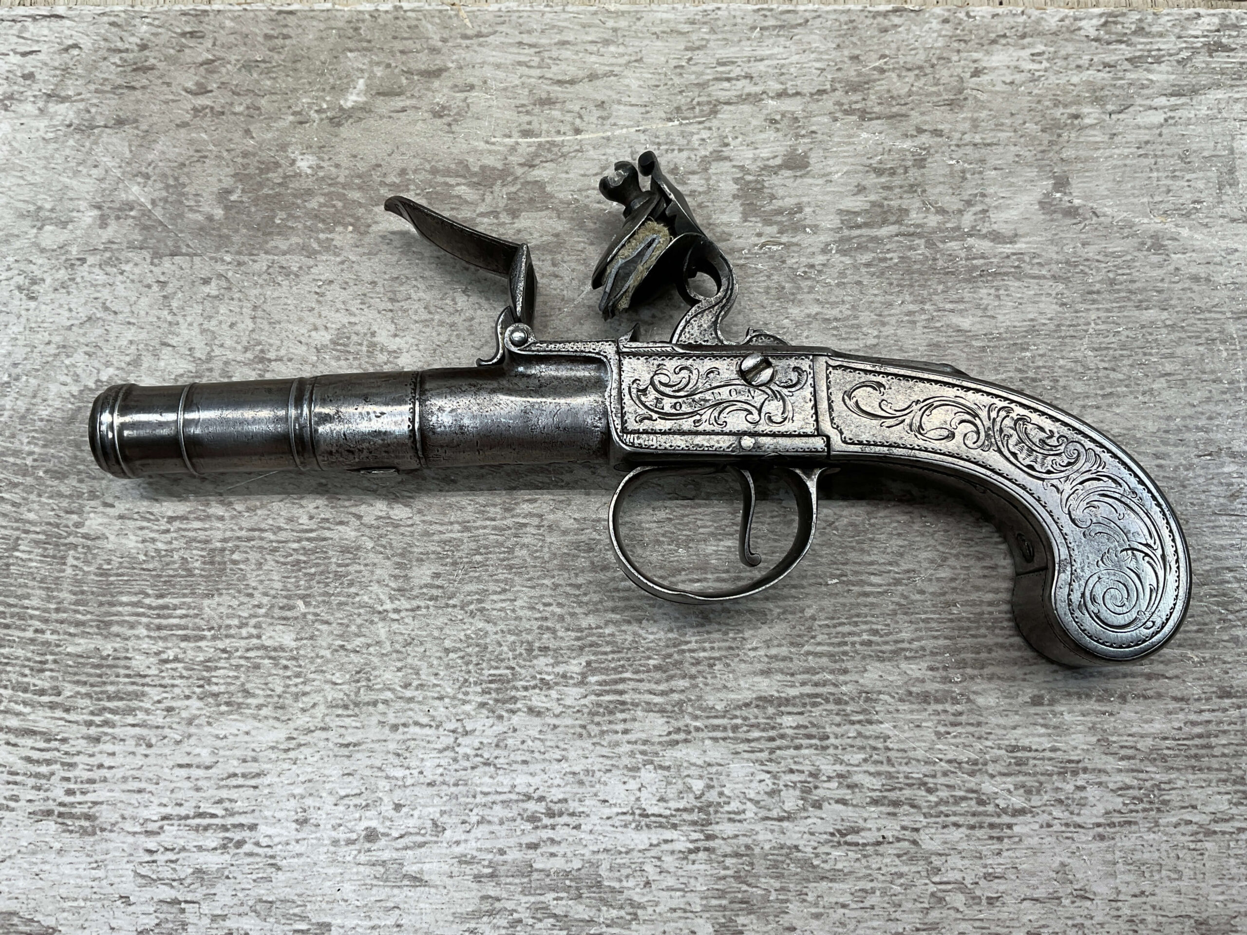 LIEGE 18THC ALL STEEL BOX-LOCK FLINTLOCK PISTOL, ANTIQUE #NSN, .44 CAL FLINTLOCK, ENGRAVED ALL STEEL GRIPS / FRAME / BARREL, FULLY FUNCTIONING, “LONDON” PROOF MARKED ON LEFT SIDE OF FRAME, NOT A REPRODUCTION, OVERALL CONDITION AS SEEN IN PHOTOS!!