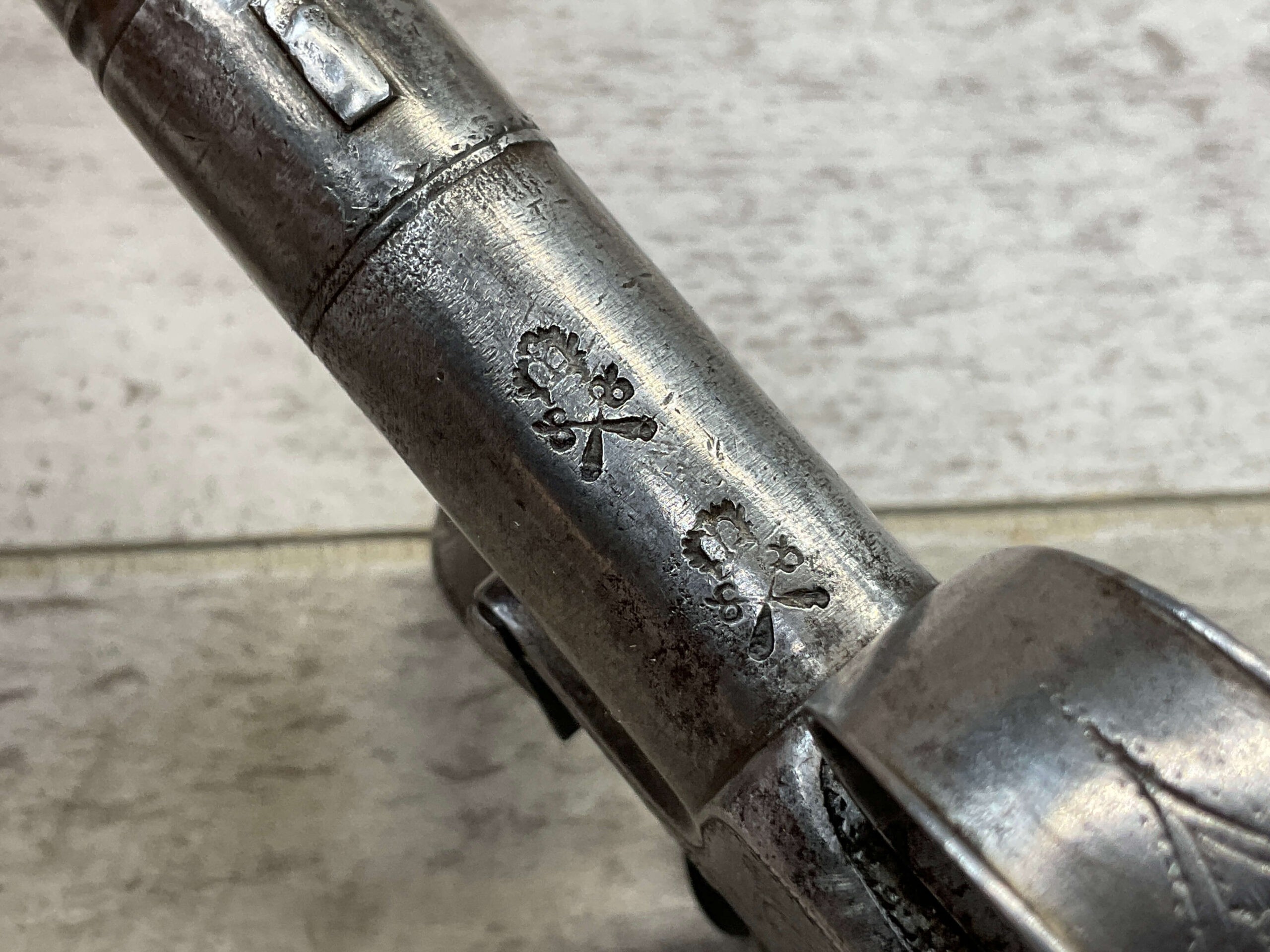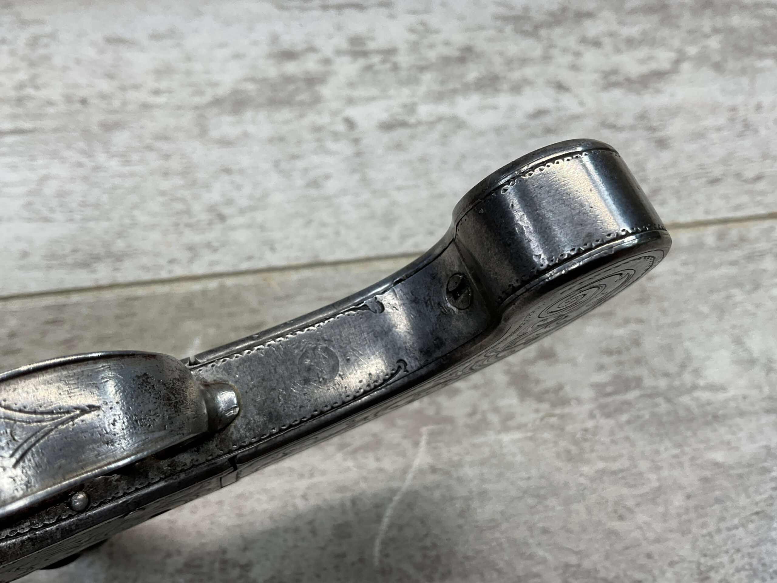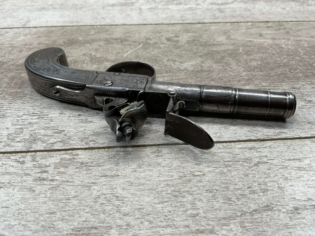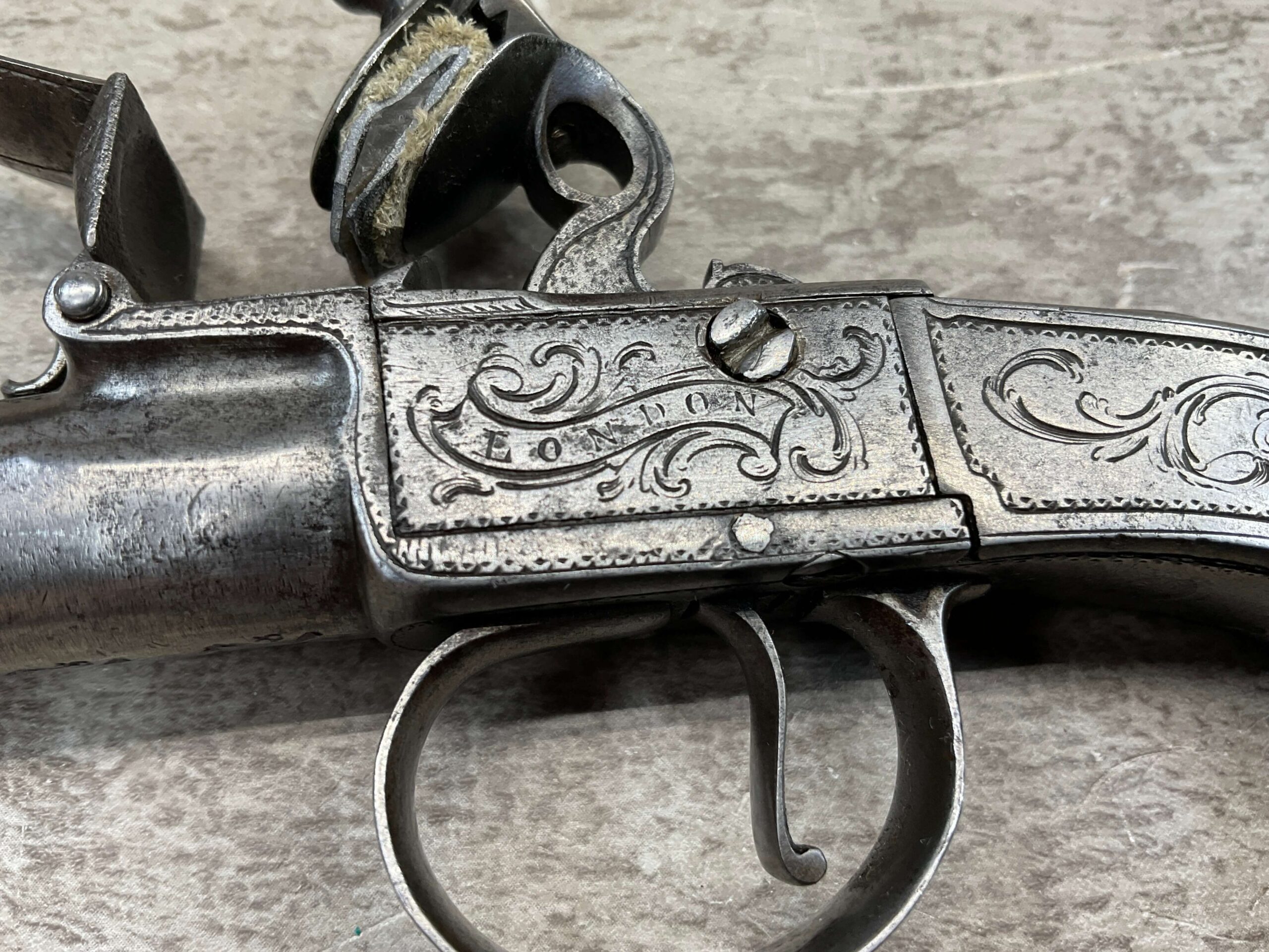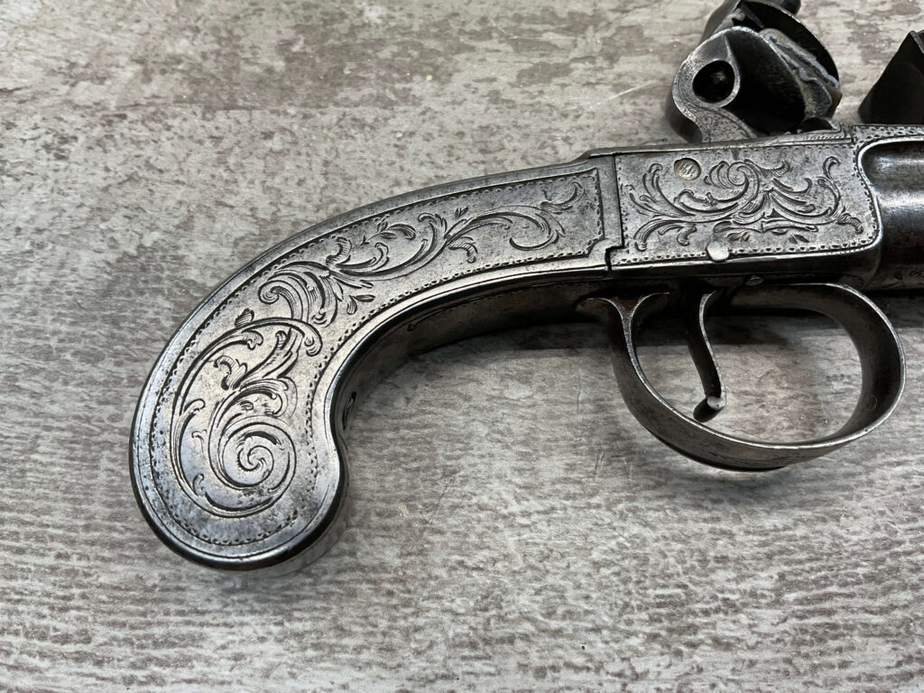 LIEGE 18THC ALL STEEL BOX-LOCK FLINTLOCK PISTOL, ANTIQUE #NSN, .44 CAL FLINTLOCK, ENGRAVED ALL STEEL GRIPS / FRAME / BARREL, FULLY FUNCTIONING, “LONDON” PROOF MARKED ON LEFT SIDE OF FRAME, NOT A REPRODUCTION, OVERALL CONDITION AS SEEN IN PHOTOS!!