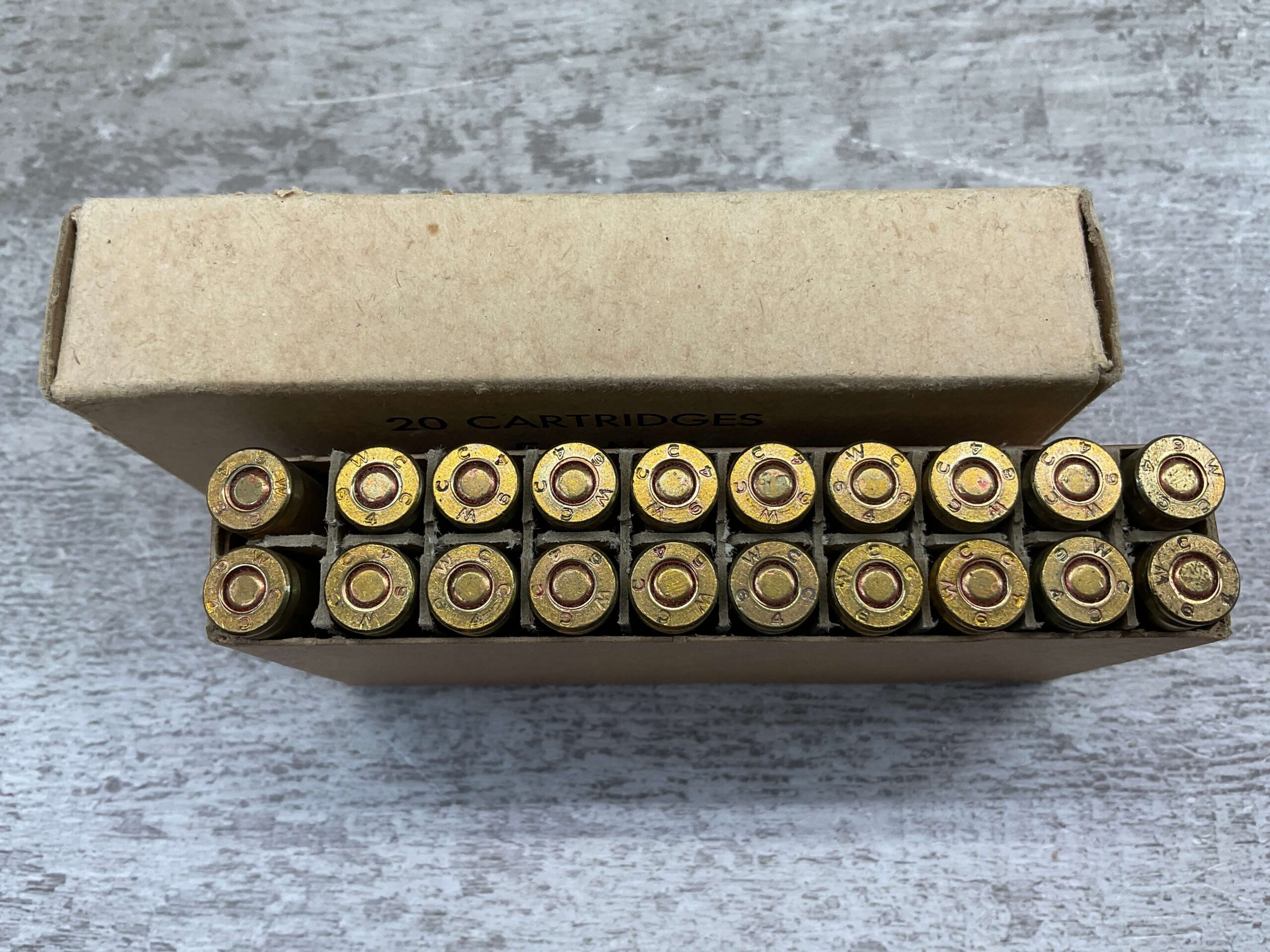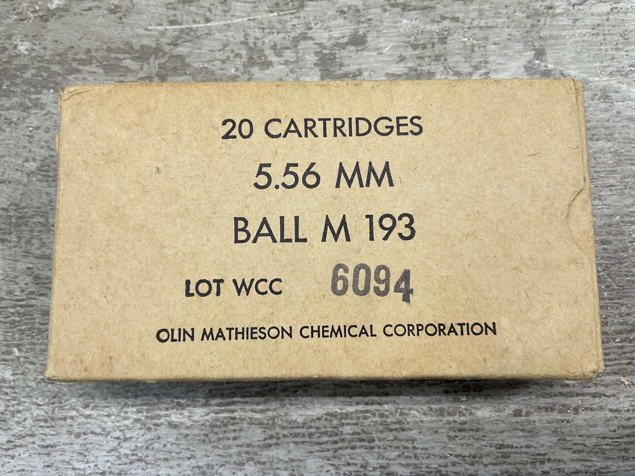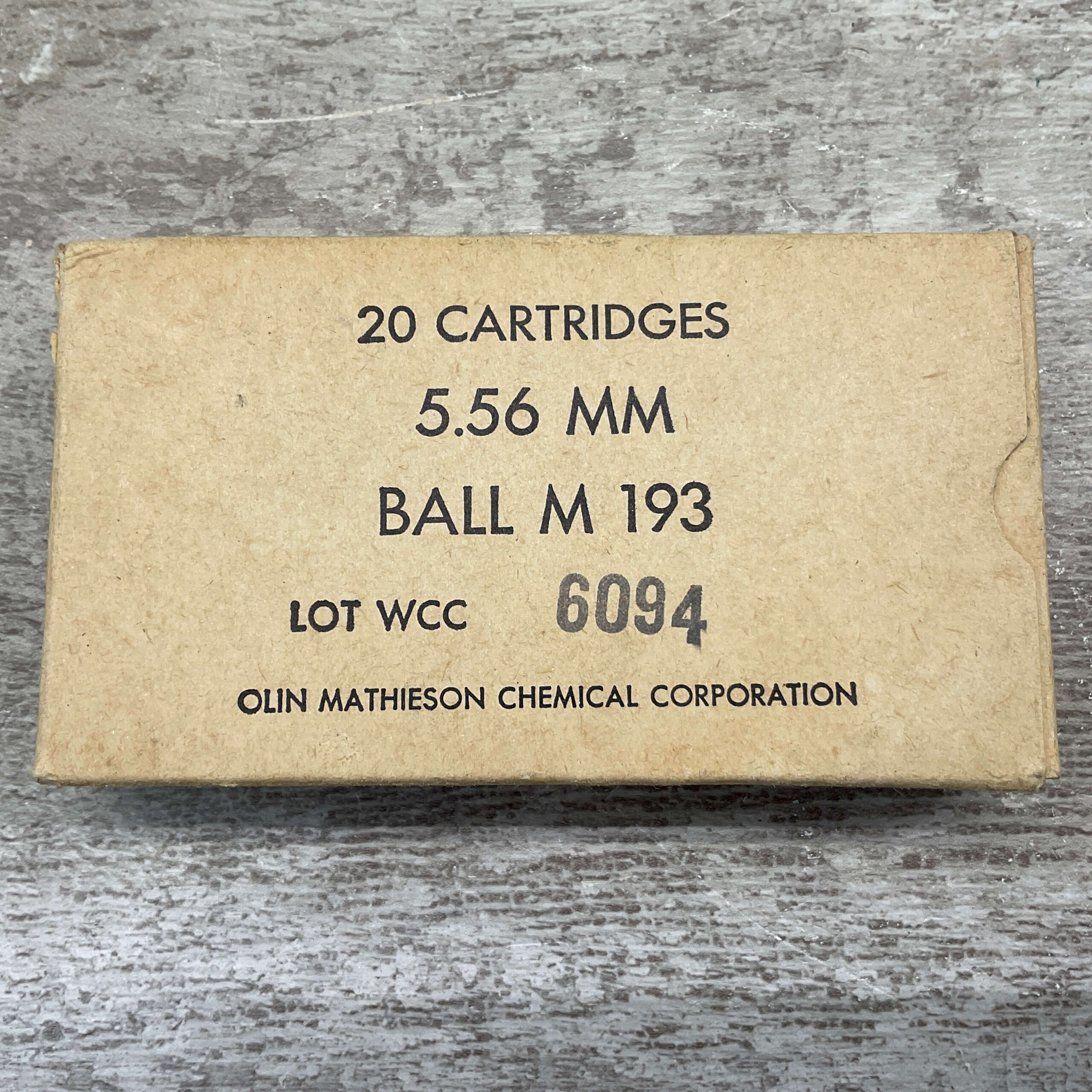 M193 5.56 MM BALL AMMUNITION, FULL BOX OR 20 ROUNDS, LOT WCC 6094, OLIN MATHIESON CHEMICAL CORPORATION. EARLY VIETNAM.