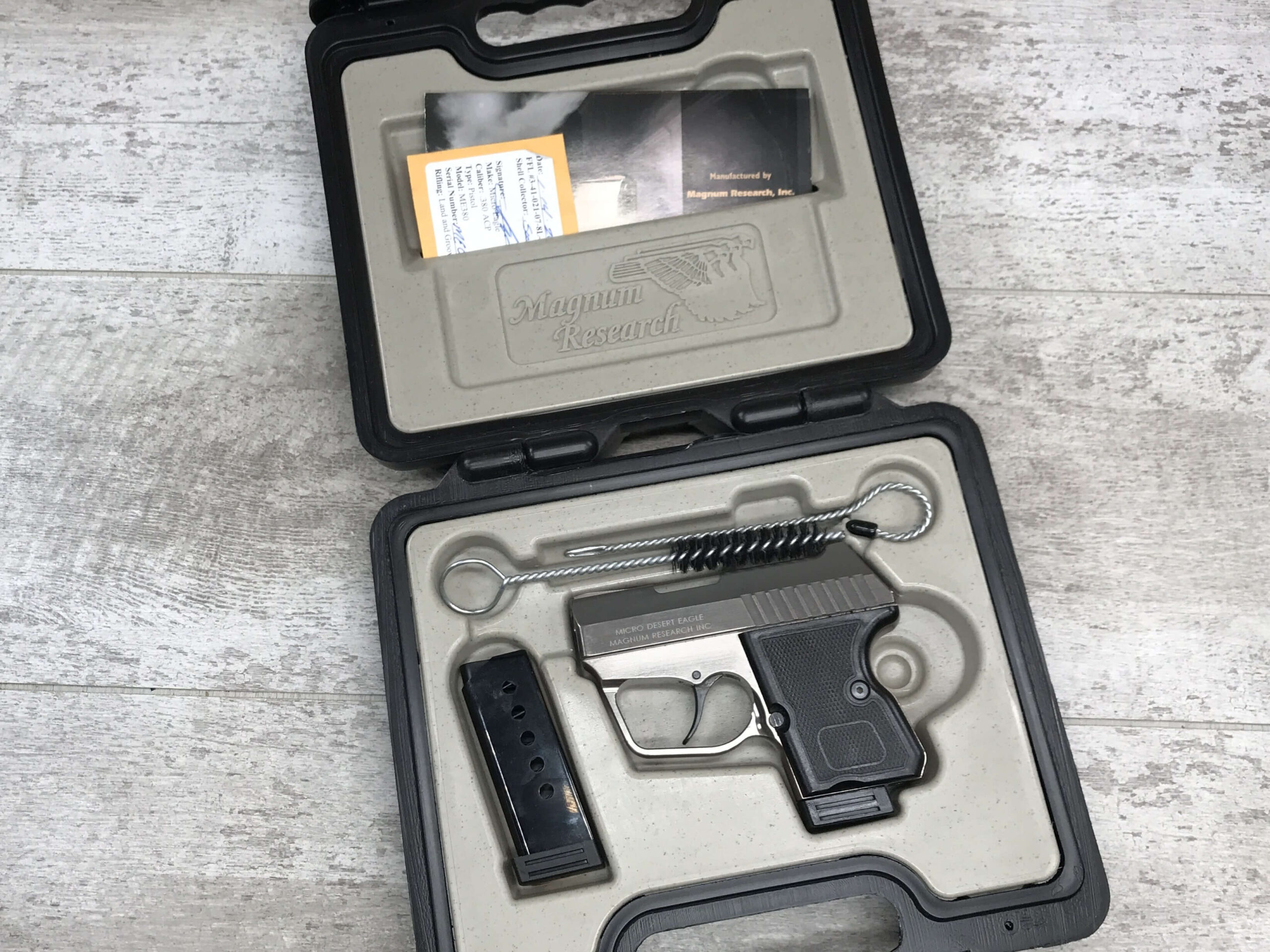 MAGNUM RESEARCH MICRO DESERT EAGLE .380 AUTO PISTOL #ME01206, 2-6ROUND MAGS, 2.2″ BBL, WEIGHS ONLY 14 OUNCES EMPTY, 2 SPRING GUIDE RODS, NICKEL TEFLON FINISH, FIXED SIGHTS, DOUBLE ACTION ONLY, HARD CASE AND PAPERWORK, EXC CONDITION, UNFIRED? 99+%