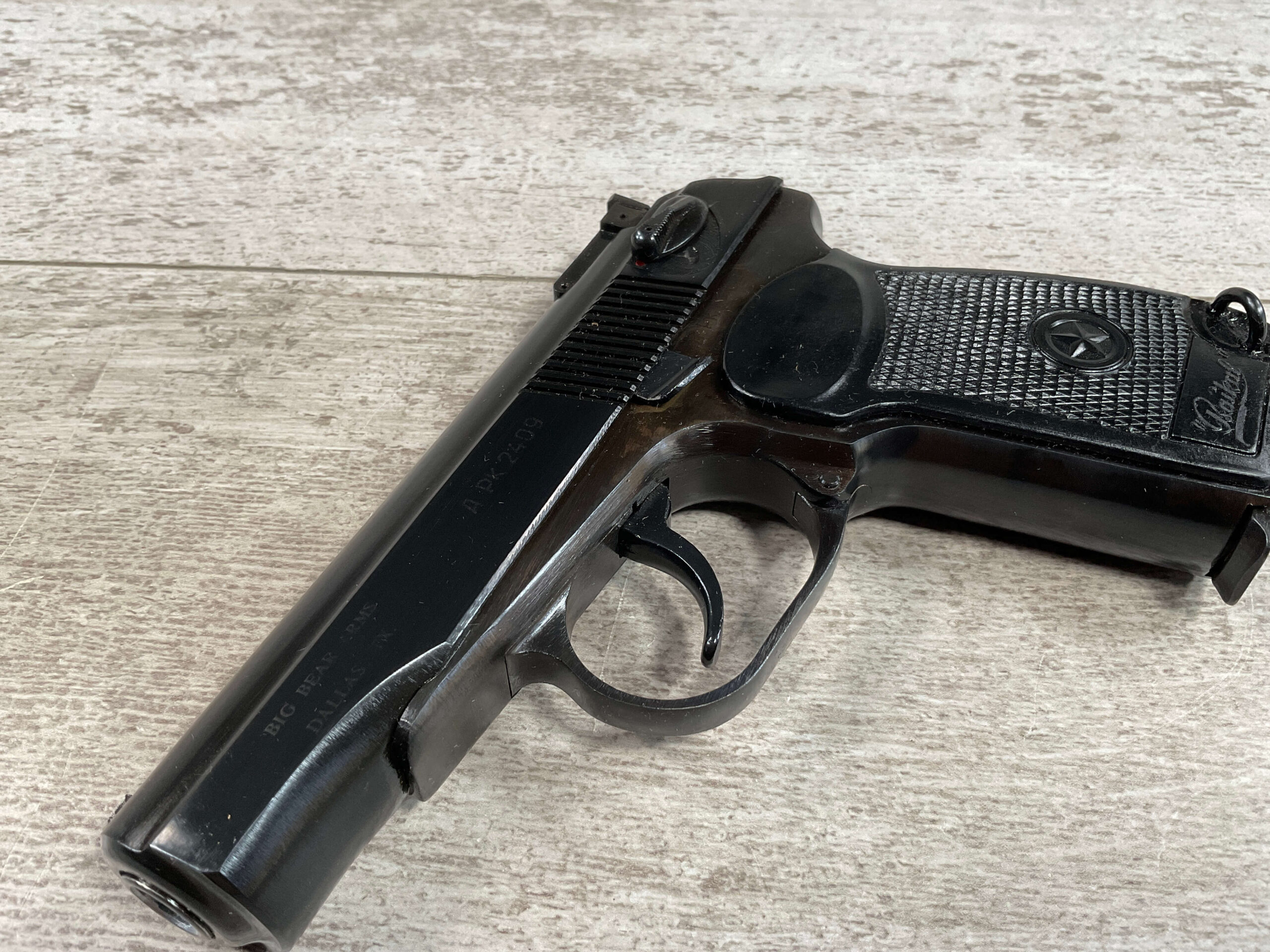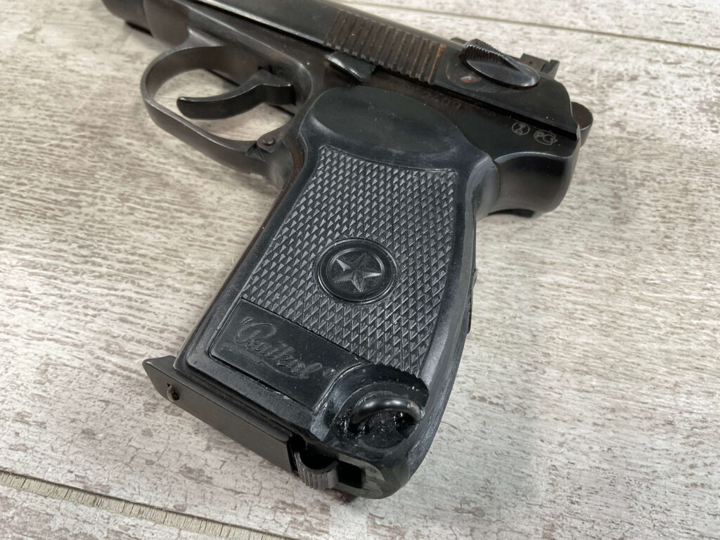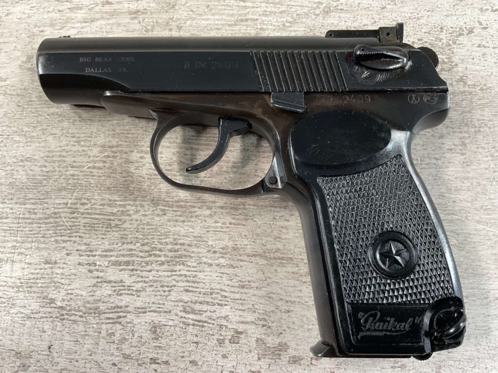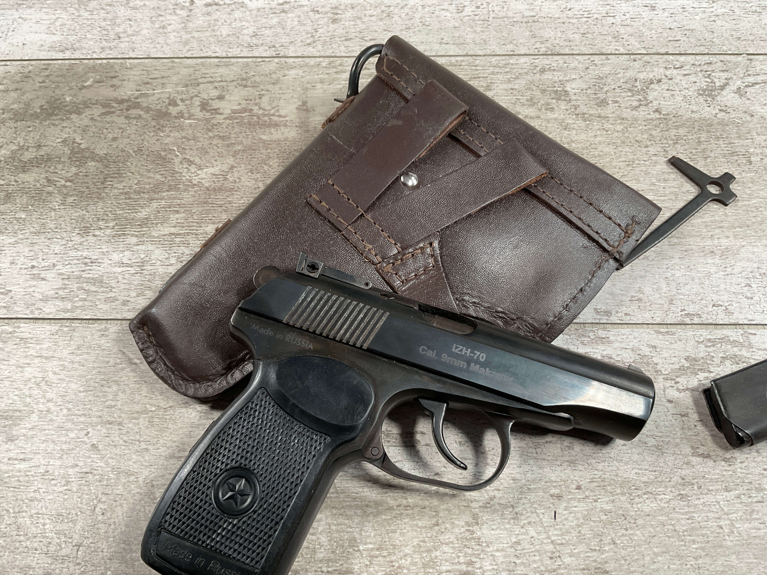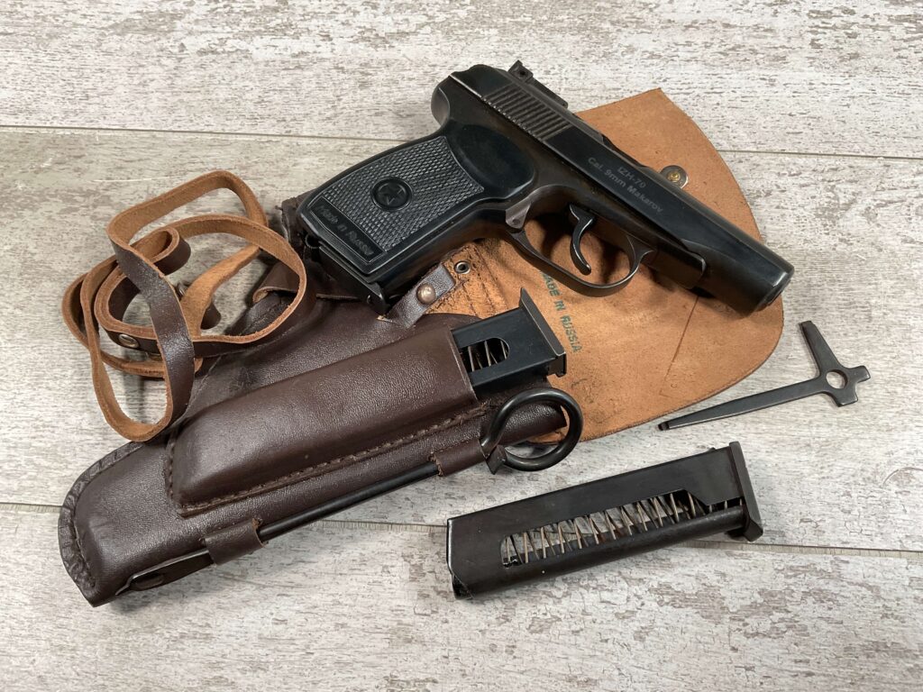 MAKAROV IZH-70 9×18 MAKAROV PISTOL RIG IN BOX #APK 2409 BIG BEAR ARMS DALLAS TX IMPORT, 99% BLUE, EXC BLACK PLASTIC GRIPS, EXC BRIGHT BORE, 3.7″ BBL, EXC BROWN LEATHER HOLSTER/2 SPARE MAGS (3 TOTAL)/CLEANING ROD & TAKEDOWN TOOL ALL INCLUDED IN THE ORIGINAL BOX, 99+% OVERALL