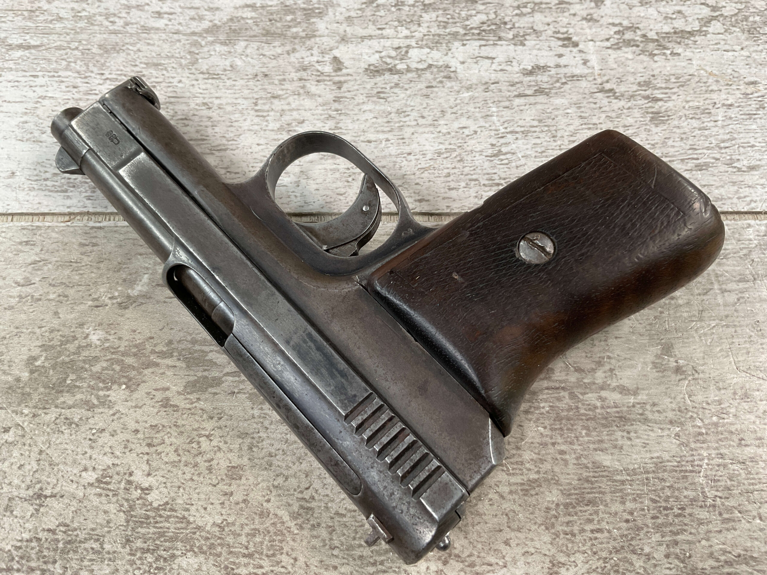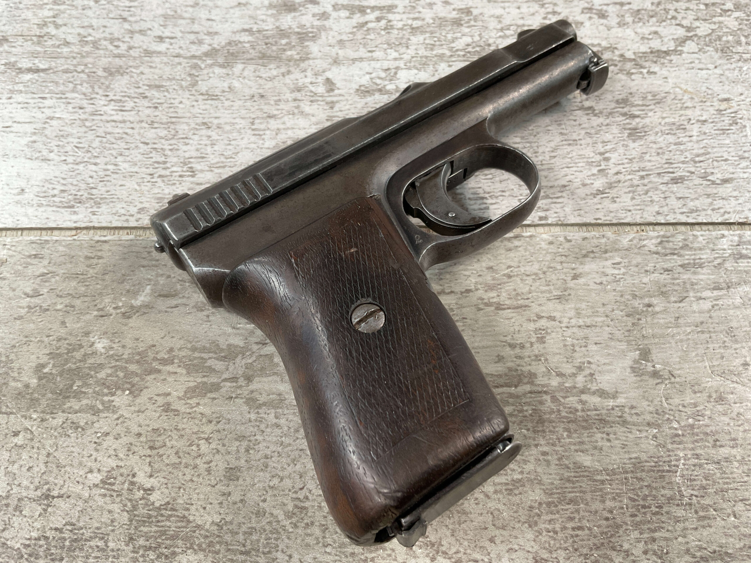 The Mauser 1910 6.35mm pistol is equipped with fixed iron sights for accurate aiming and may feature a manual safety mechanism for added security. Its ergonomic grip and intuitive controls make it comfortable to handle and easy to operate.