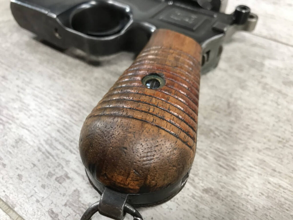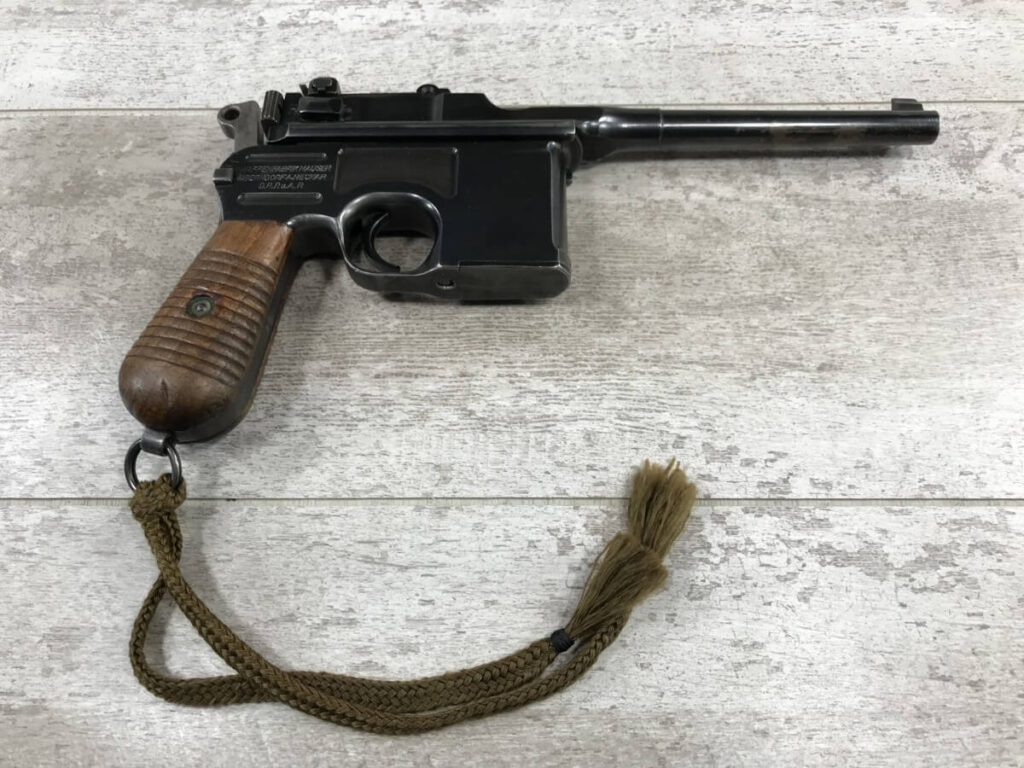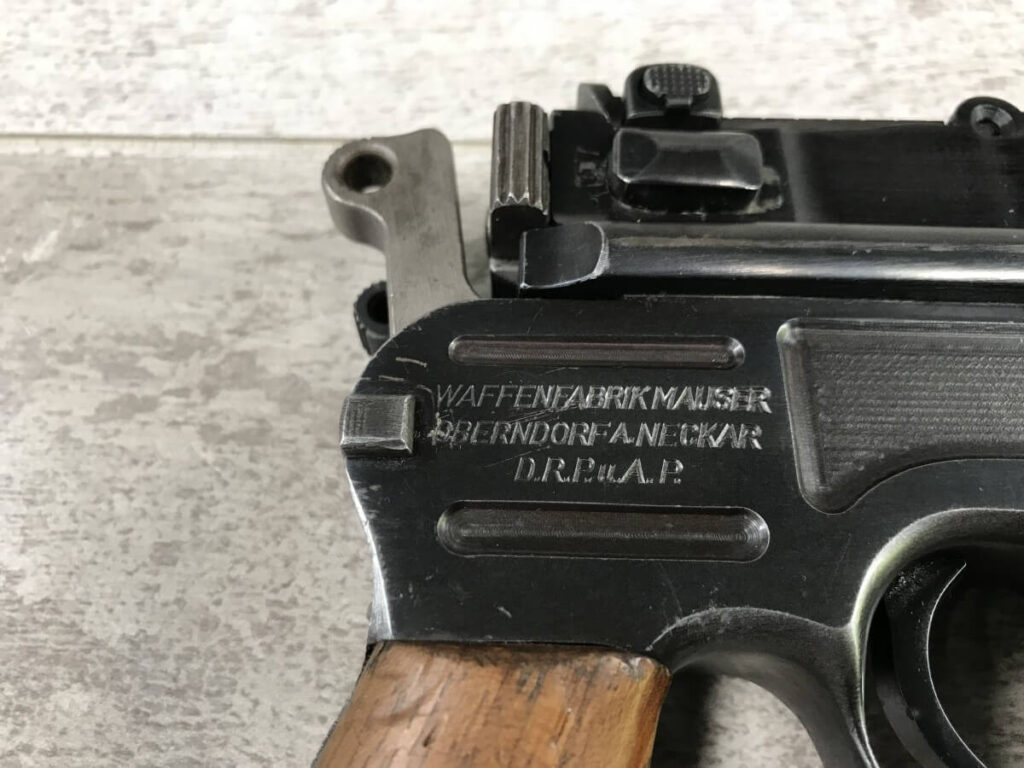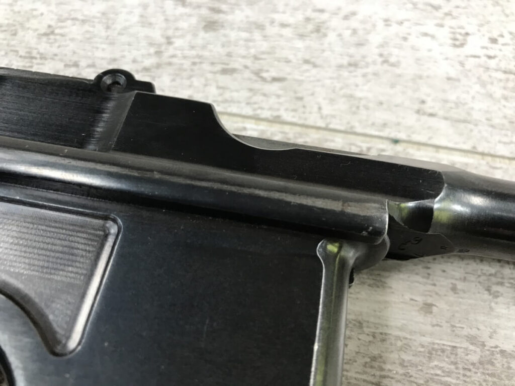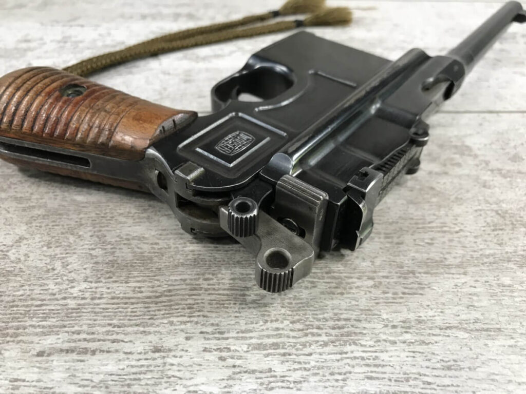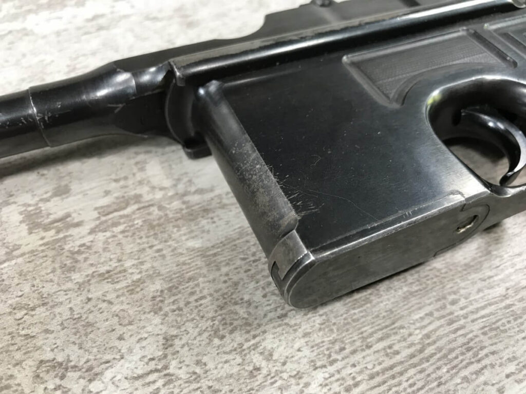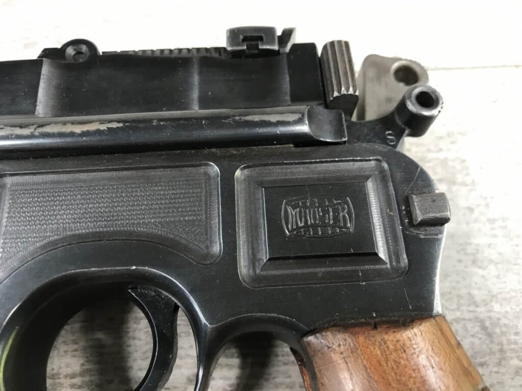 SKU#160 MAUSER 1930 COMMERCIAL C96 BROOMHANDLE #914325, 7.63MM, 90+% FIRE BLUE, 5.5″ STEPPED BARREL, 1000 METER TANGENT REAR SIGHT, MAGAZINE FLOORPLATE SCRATCHED, LIGHT HANDLING AND HOLSTER WEAR, 92-95% ORIGINAL CONDITION, EXC BRIGHT BORE W/MINOR FROSTING, EXC UN-NUMBERED CORRECT 12 GROOVE GRIPS, EXCELLENT OVER CONDITION!!