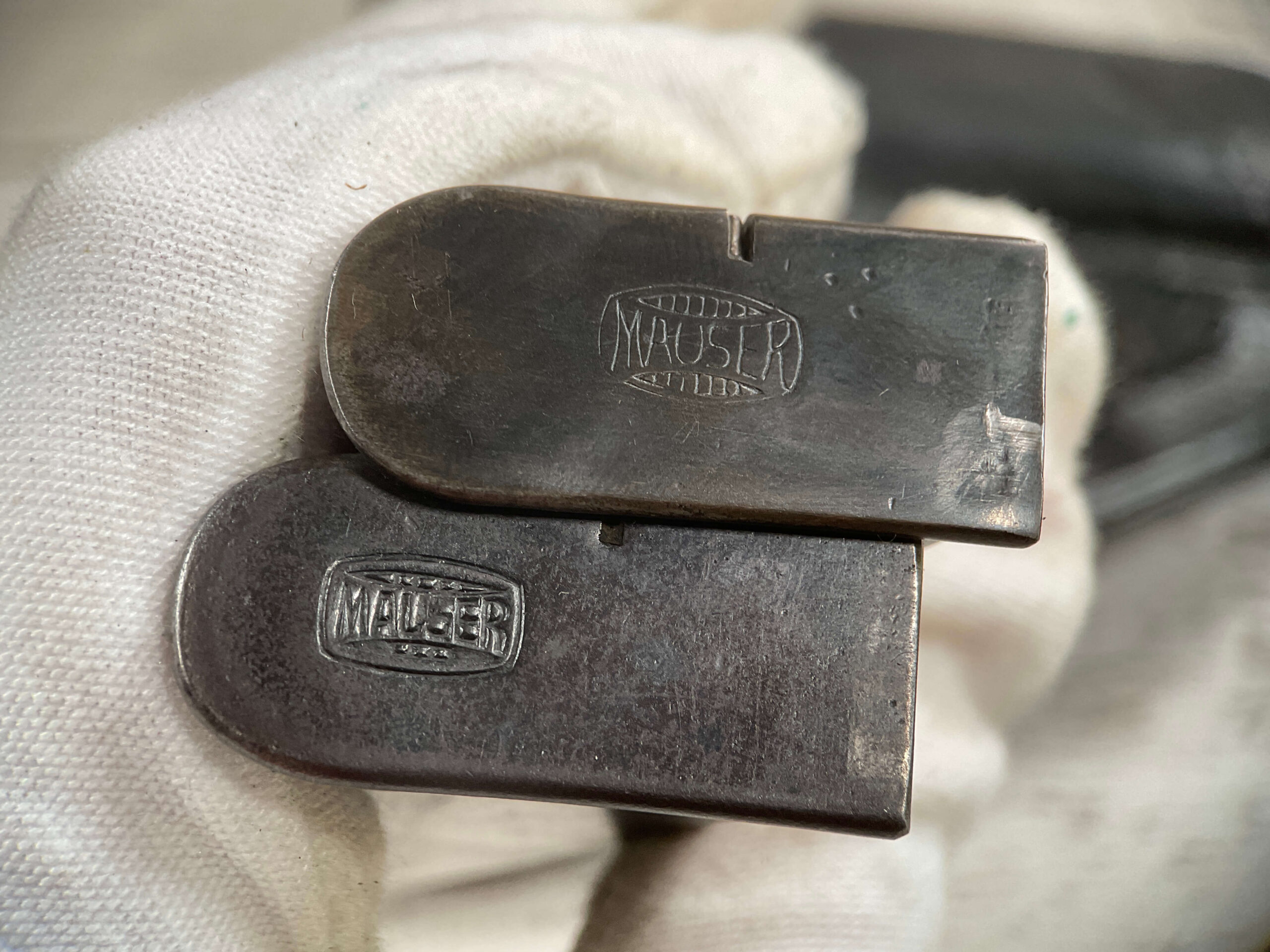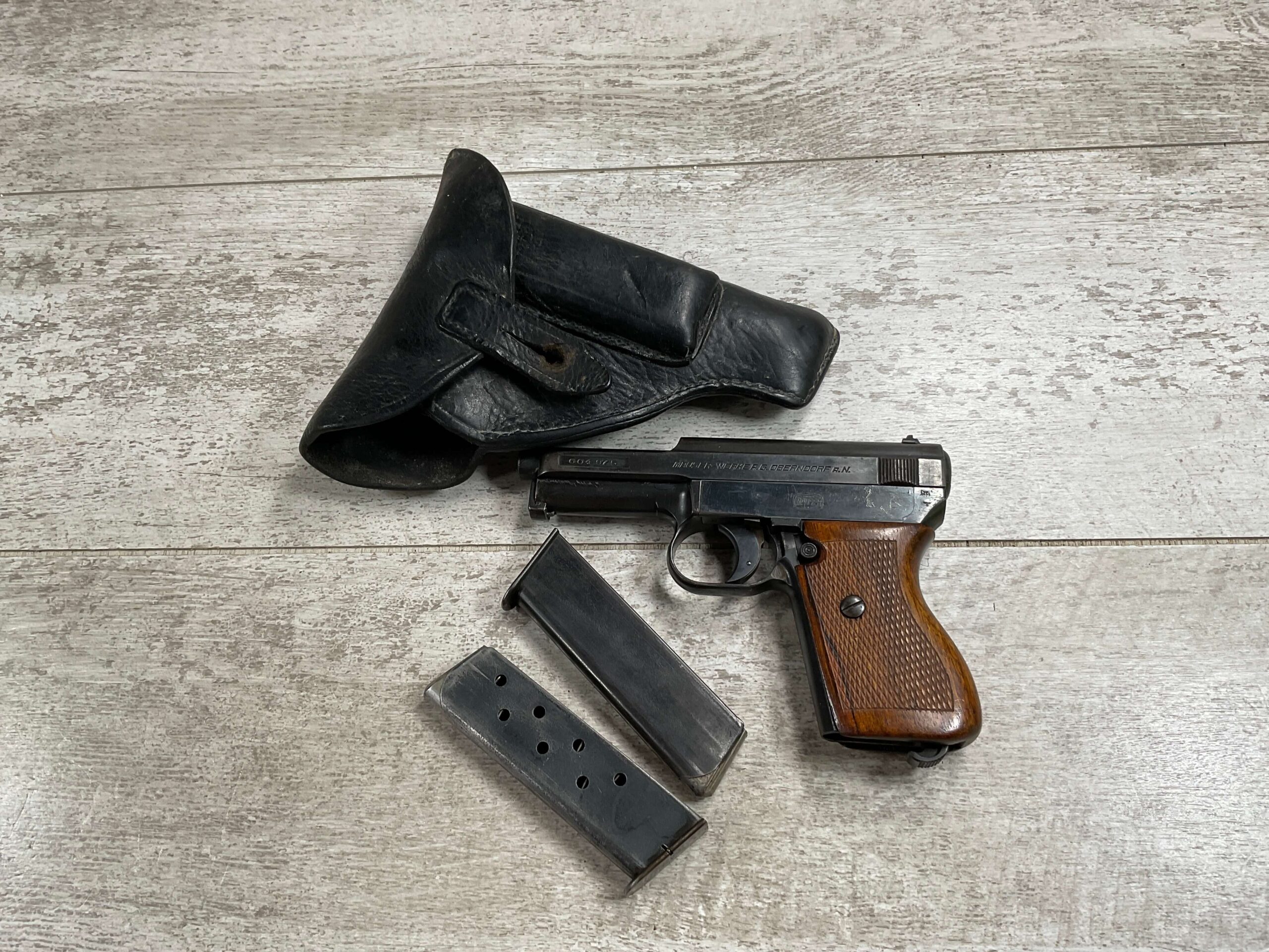 MAUSER 1934 7,65mm E/655 MARKED PISTOL RIG #604975, ALL MATCHING, “E/655” STAMPED ON LEFT REAR FRAME, “E/GLOBE” (ARMY TEST PROOF) LEFT REAR BELOW THE MILITARY ACCEPTANCE STAMP, “EAGLE/N” BEHIND REAR SIGHT, 2 EXC MAGAZINES “MAUSER” BANNER BASE, 85+% ORIGINAL HIGH POLISH SALT BLUE FINISH W/HIGH EDGE WEAR AS WELL AS HOLSTER/USE WEAR, VG BRIGHT BORE & RIFLING W/LIGHT FROSTING THROUGHOUT, EXC ORIGINAL CHECKERED WALNUT GRIPS W/CURVED BACK, VG BLACK LEATHER HOLSTER W/EXC STITCHING, 90+% OVERALL
