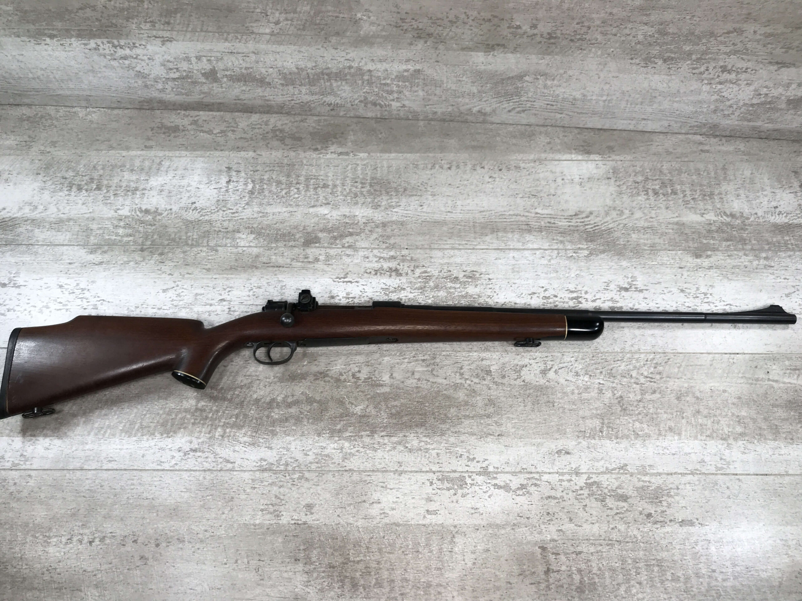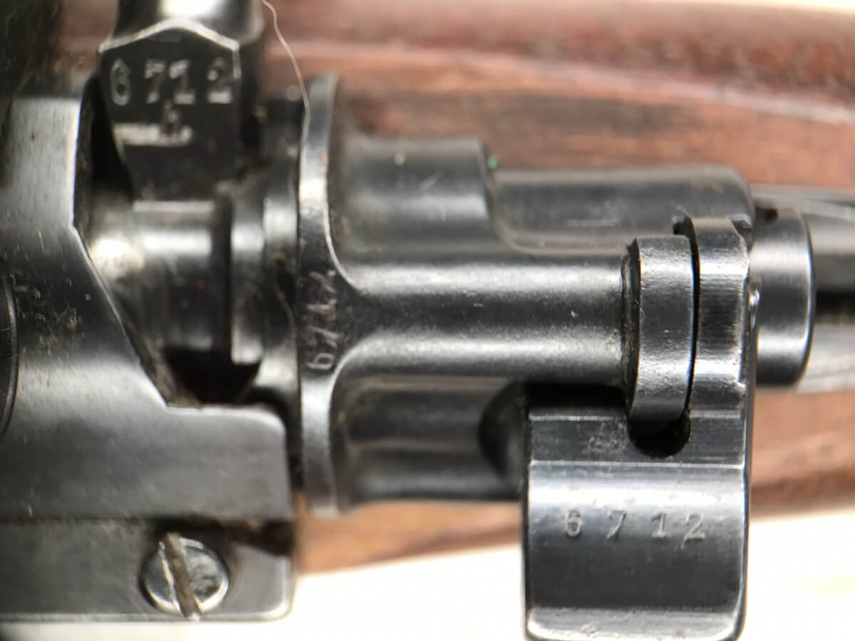 SKU#425 MAUSER “42” CODE 1940 DATE 98K BOLT ACTION RIFLE #6712h, ALL MATCHING SERIAL NUMBERS, SPORTERIZED MONTE CARLO STOCK W/REDFIELD PEEP SIGHT, BLADE FRONT SIGHT, “E/655” INSPECTION MARKS THROUGHOUT, “NAZI EAGLE/GLOBE” ON RECEIVER, 90% BLUE FINISH W/SOME SPOTTING, EXC WOOD W/LIGHT HANDLING MARKS, PROFESSIONALLY SPORTERIZED IN THE 1950’S (PER OWNER), 90% OVERALL, GREAT SHOOTER!!