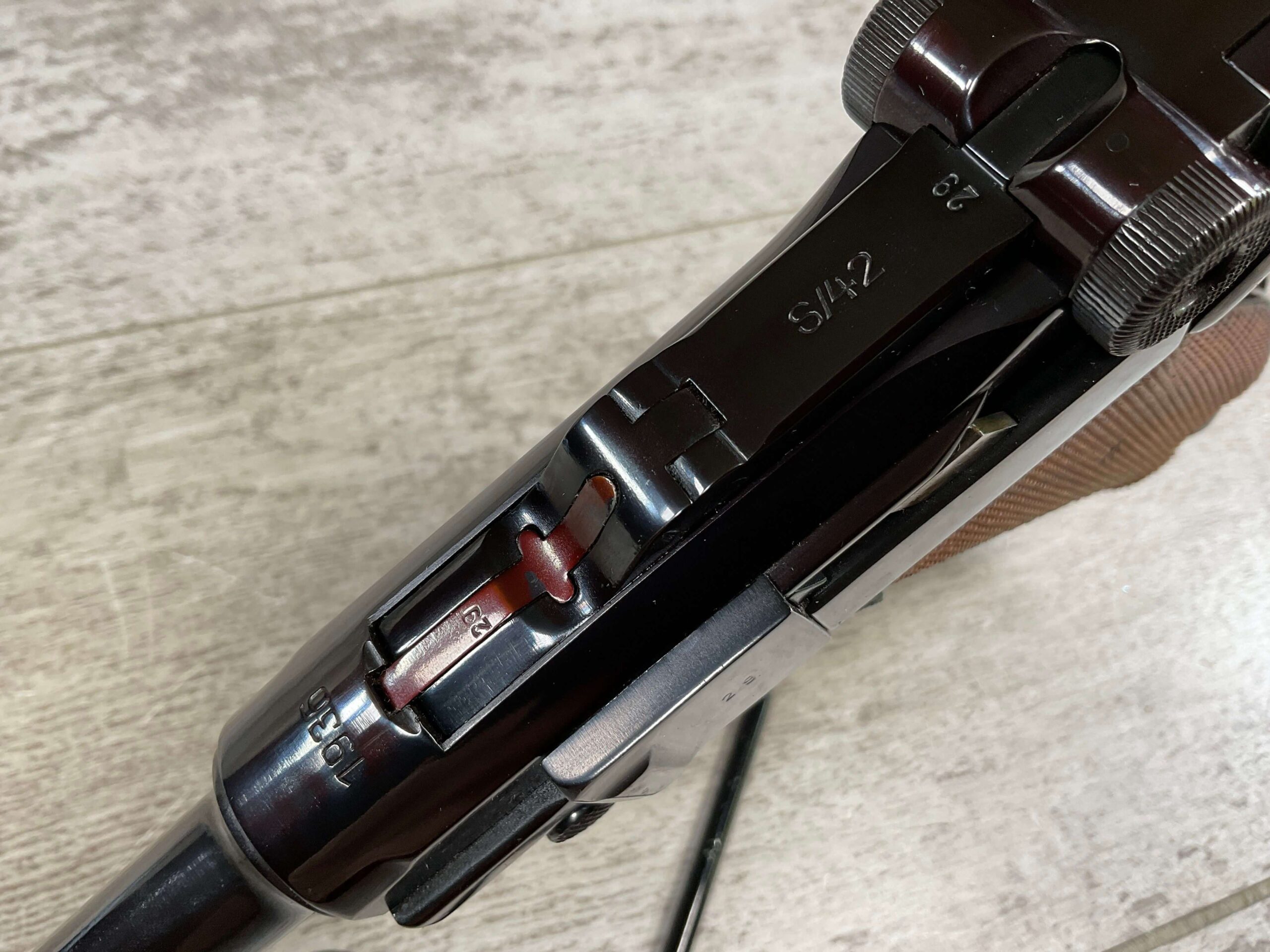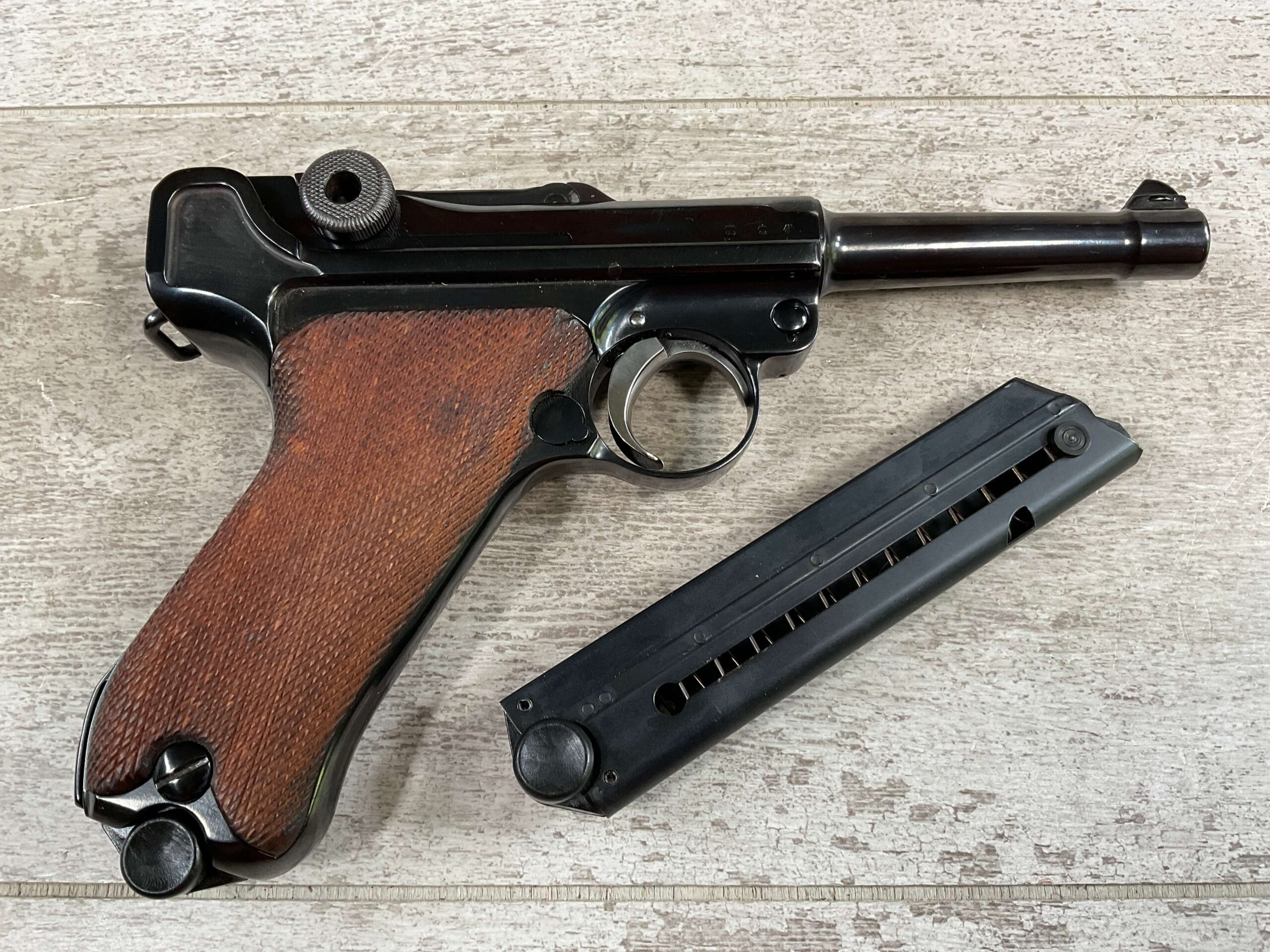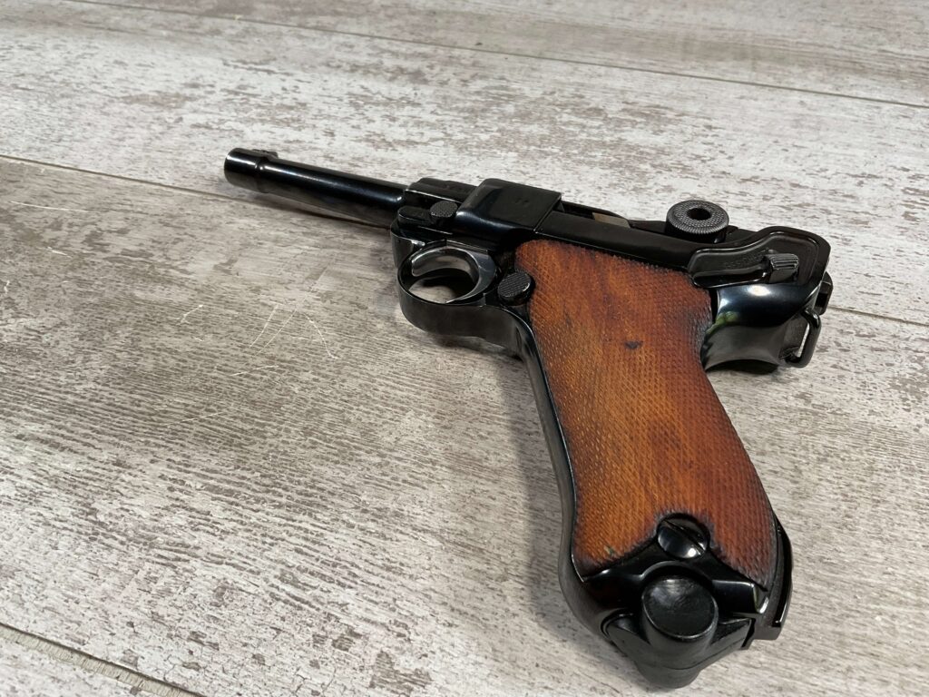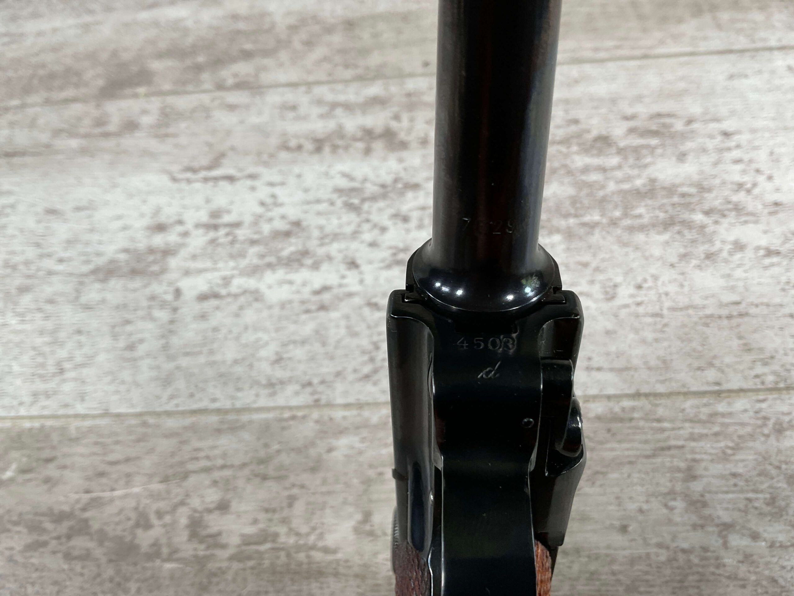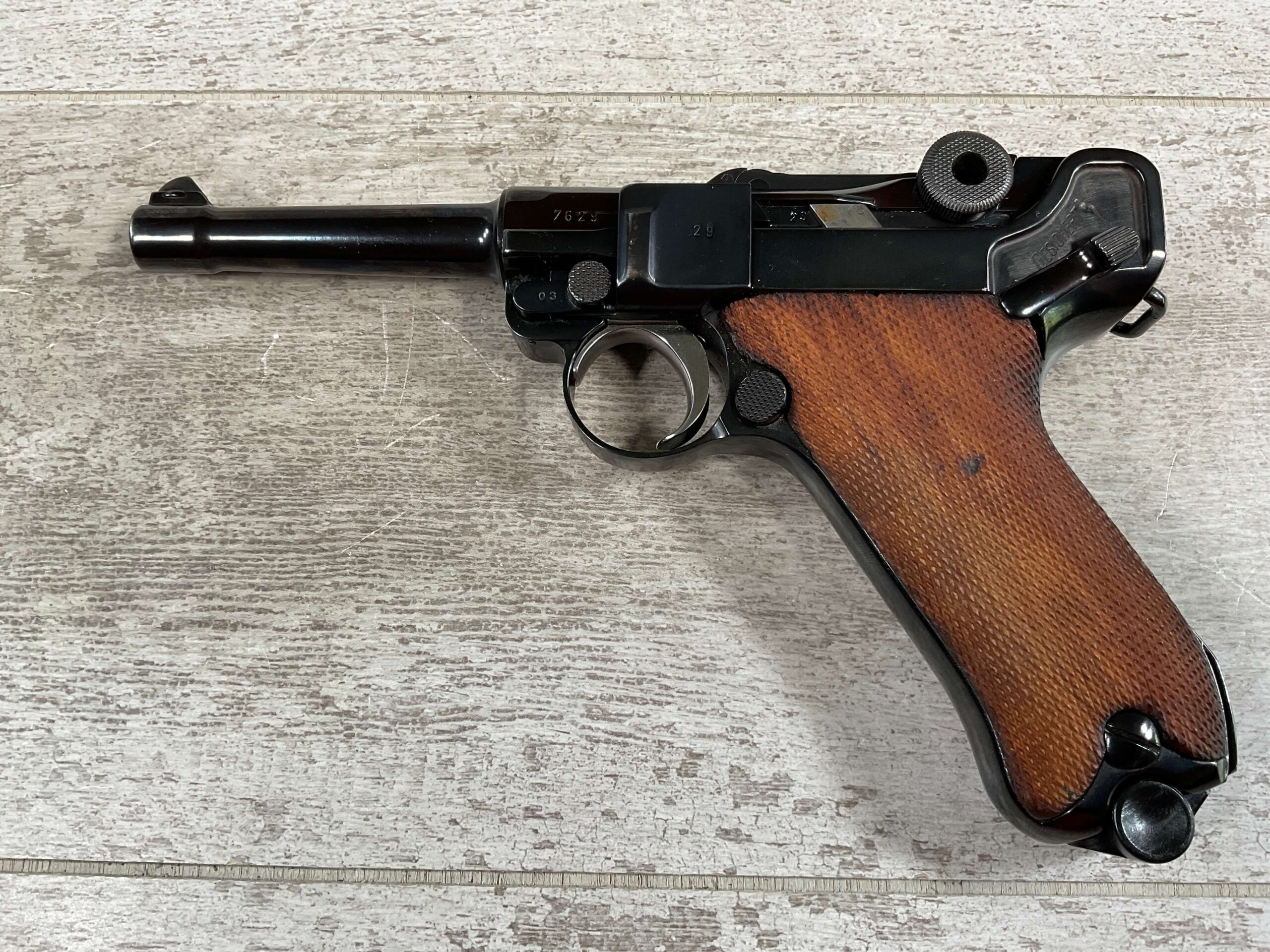 MAUSER S/42 1936 DATE 9MM LUGER P08 PISTOL #4503d, 9MM, 4″ BARREL, MISMATCHED BBL (7629), FRAME/LOCKING BOLT/SAFETY/SAFETY BAR “03”, EVERYTHING ELSE IS STAMPED “29”, TRIGGER NICKEL PLATED OR POLISHED, FROSTED BORE W/GOOD RIFLING, EXC CHECKERED GRIPS (NOT NUMBERED), 2 REPRO BLACK BASE MAGAZINES, EXCELLENT SHOOTER LUGER!!
