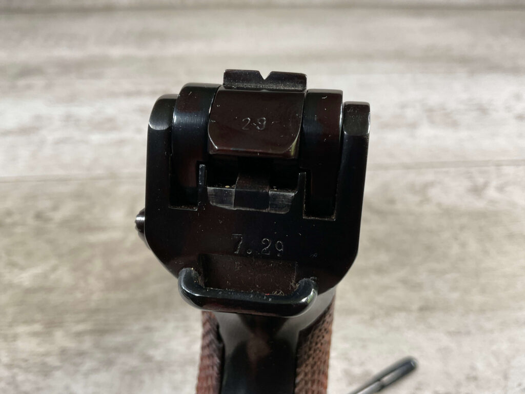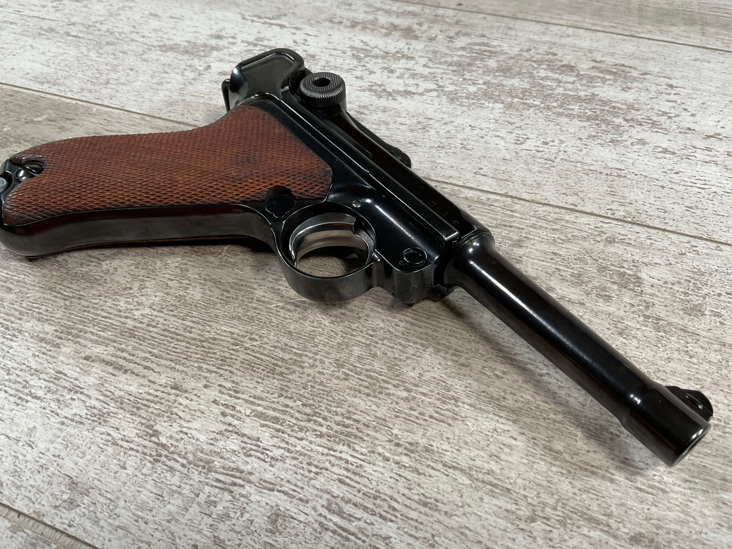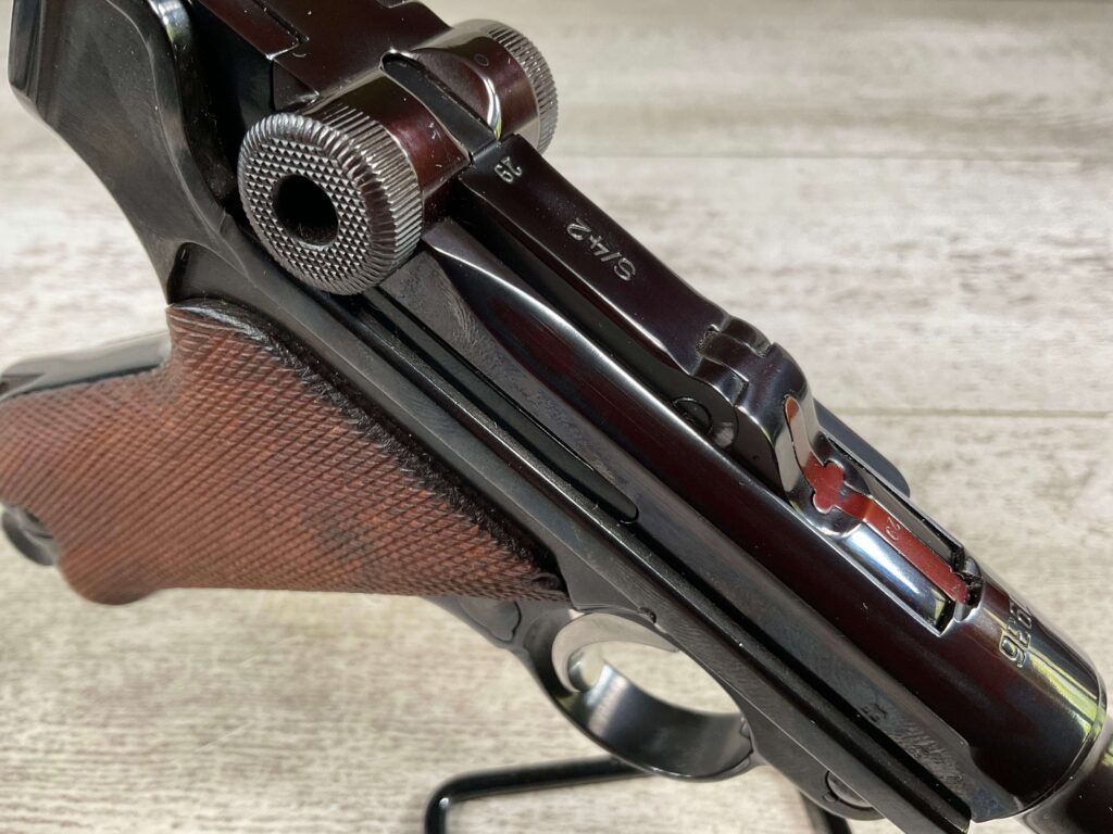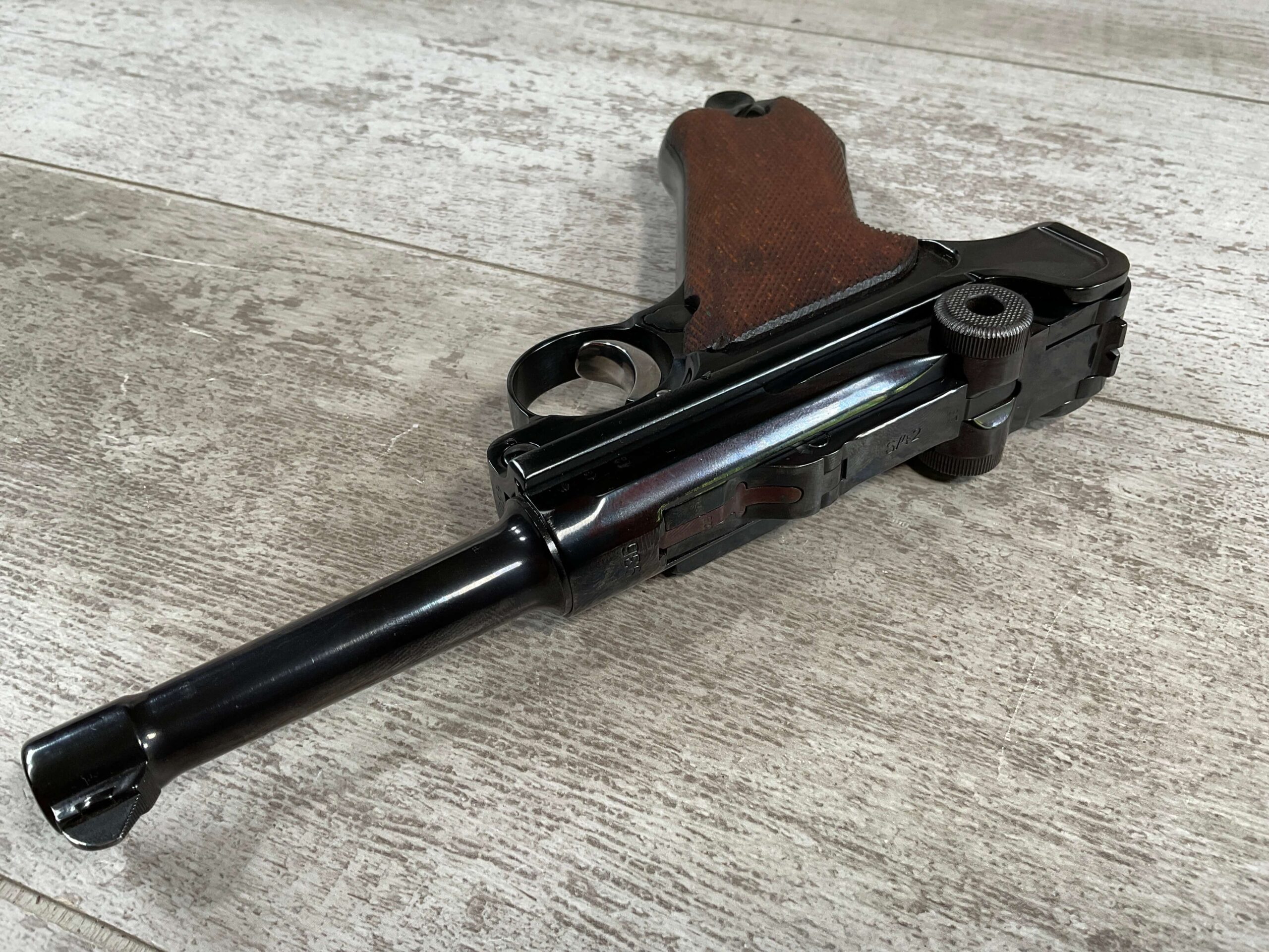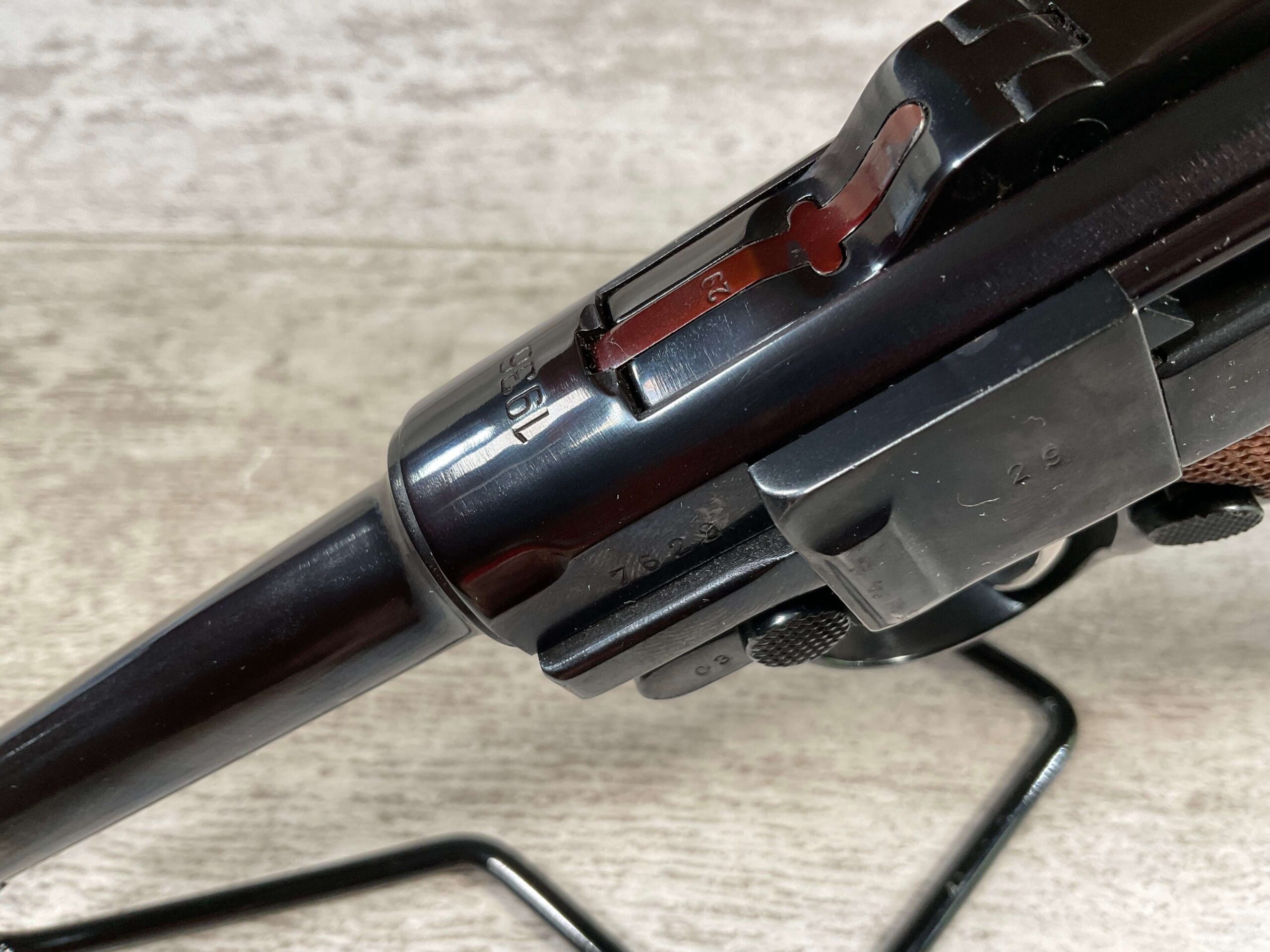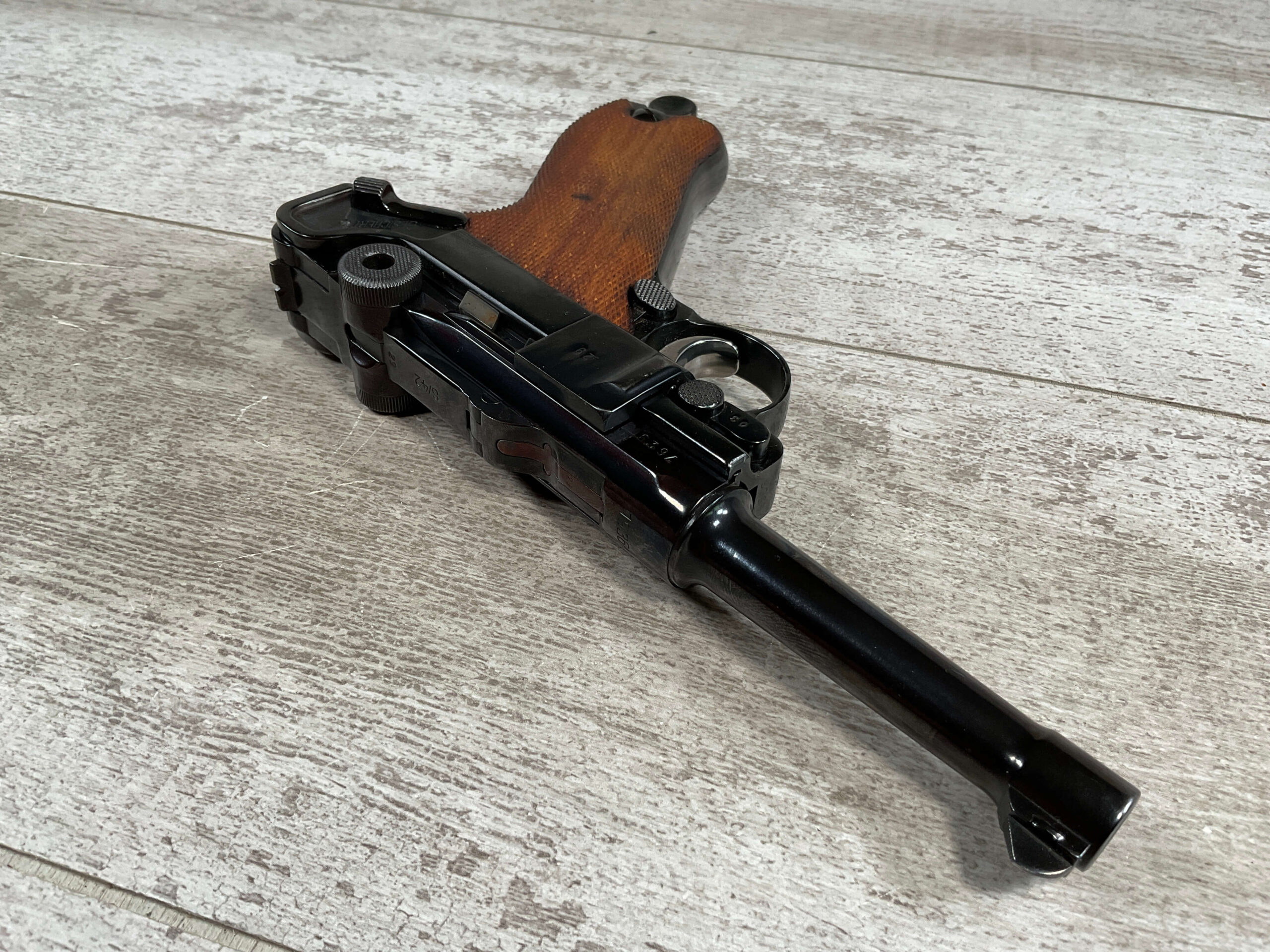 MAUSER S/42 1936 DATE 9MM LUGER P08 PISTOL #4503d, 9MM, 4″ BARREL, MISMATCHED BBL (7629), FRAME/LOCKING BOLT/SAFETY/SAFETY BAR “03”, EVERYTHING ELSE IS STAMPED “29”, TRIGGER NICKEL PLATED OR POLISHED, FROSTED BORE W/GOOD RIFLING, EXC CHECKERED GRIPS (NOT NUMBERED), 2 REPRO BLACK BASE MAGAZINES, EXCELLENT SHOOTER LUGER!!