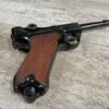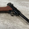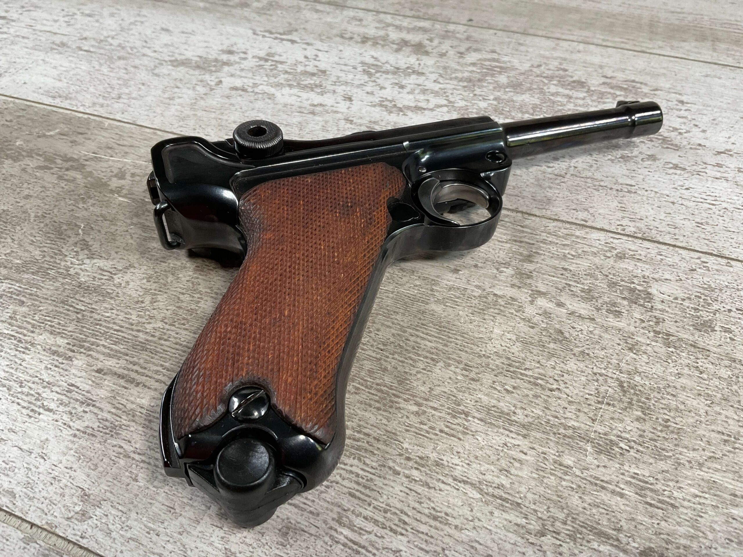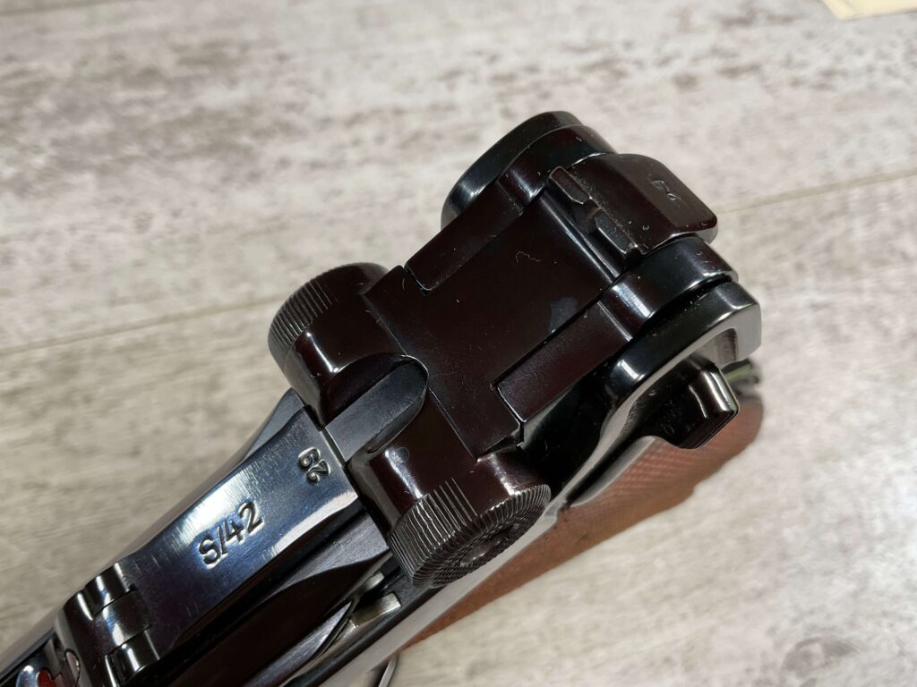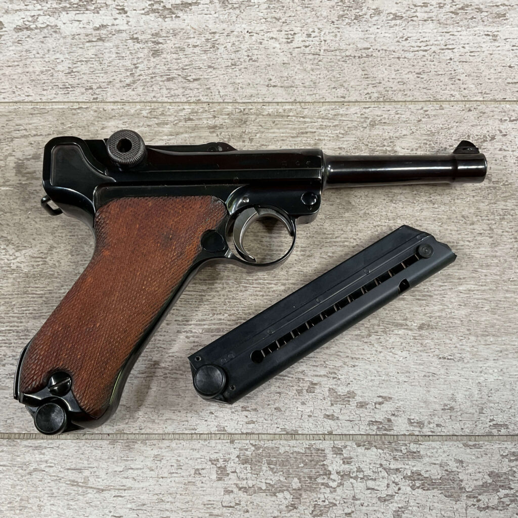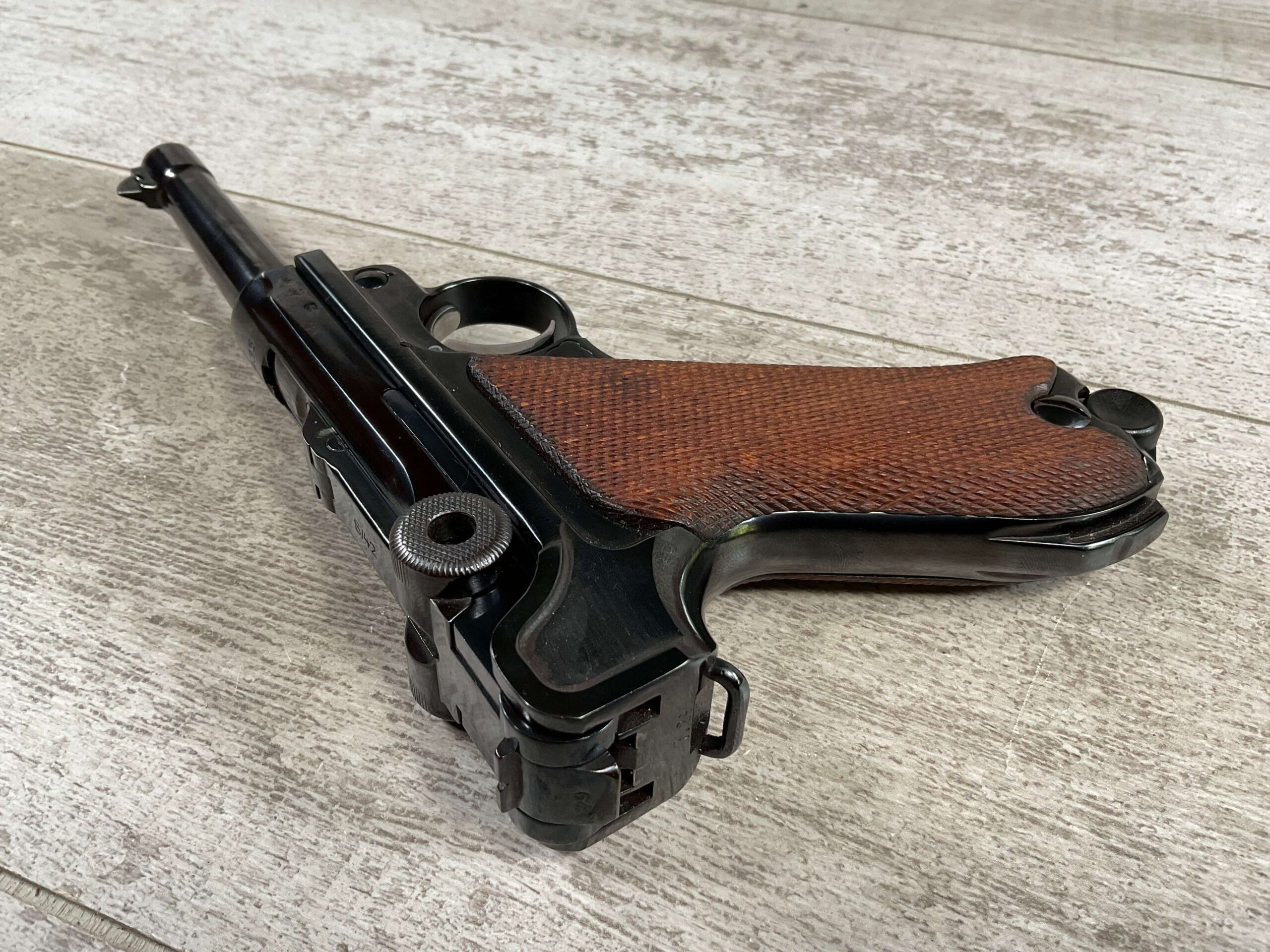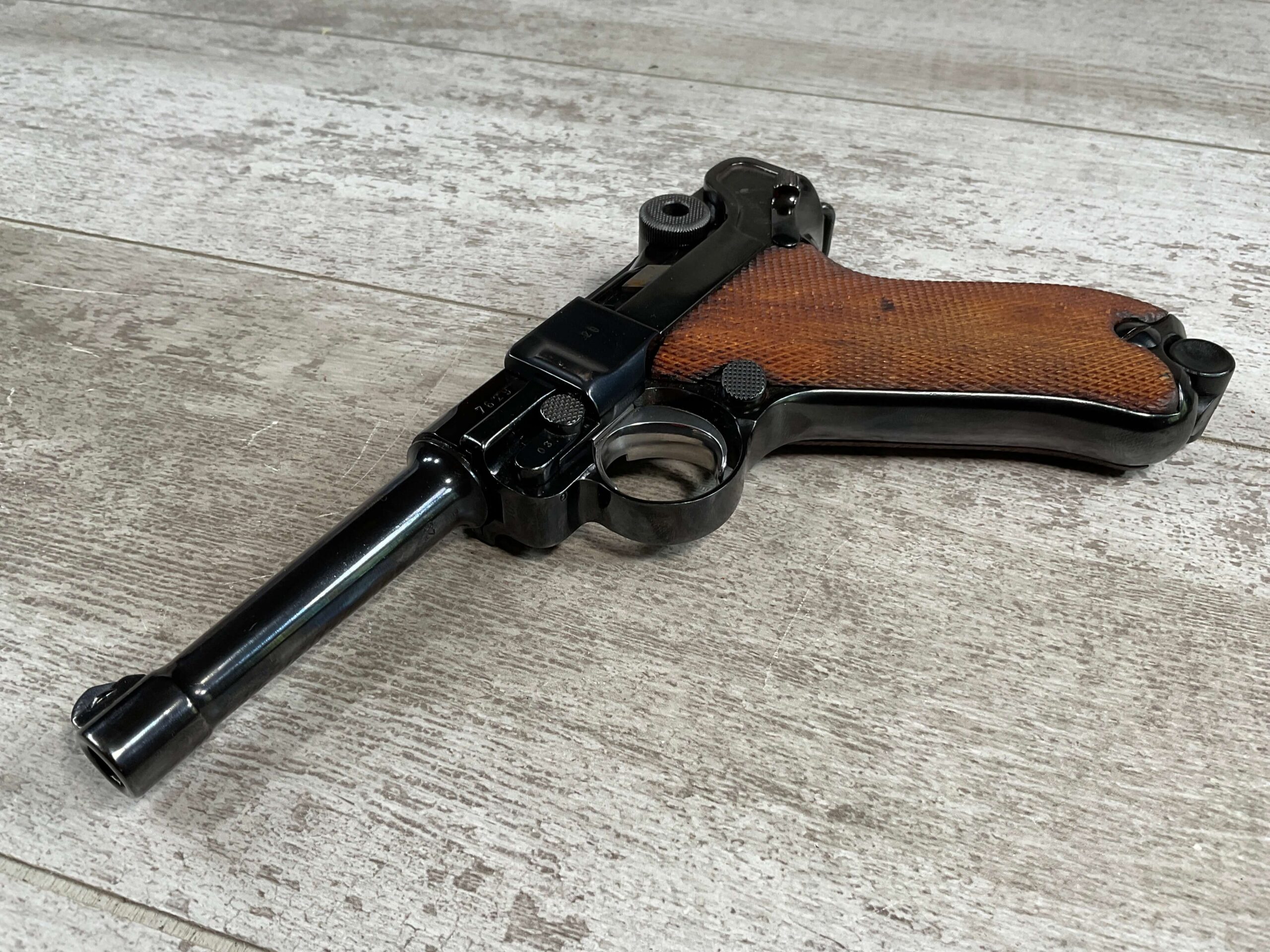 MAUSER S/42 1936 DATE 9MM LUGER P08 PISTOL #4503d, 9MM, 4″ BARREL, MISMATCHED BBL (7629), FRAME/LOCKING BOLT/SAFETY/SAFETY BAR “03”, EVERYTHING ELSE IS STAMPED “29”, TRIGGER NICKEL PLATED OR POLISHED, FROSTED BORE W/GOOD RIFLING, EXC CHECKERED GRIPS (NOT NUMBERED), 2 REPRO BLACK BASE MAGAZINES, EXCELLENT SHOOTER LUGER!!