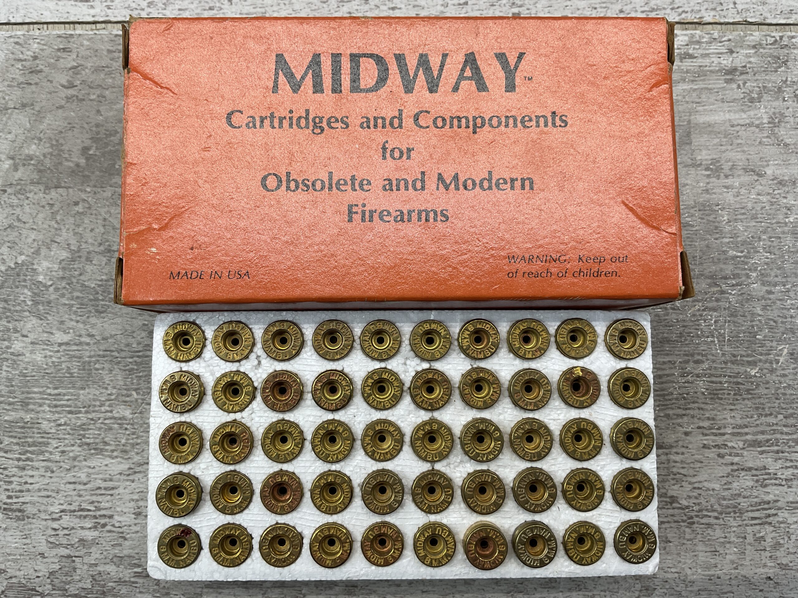 MIDWAY ARMS 8MM NAMBU AMMO SHELLS, FULL BOX, VINTAGE #5-08586-BDH